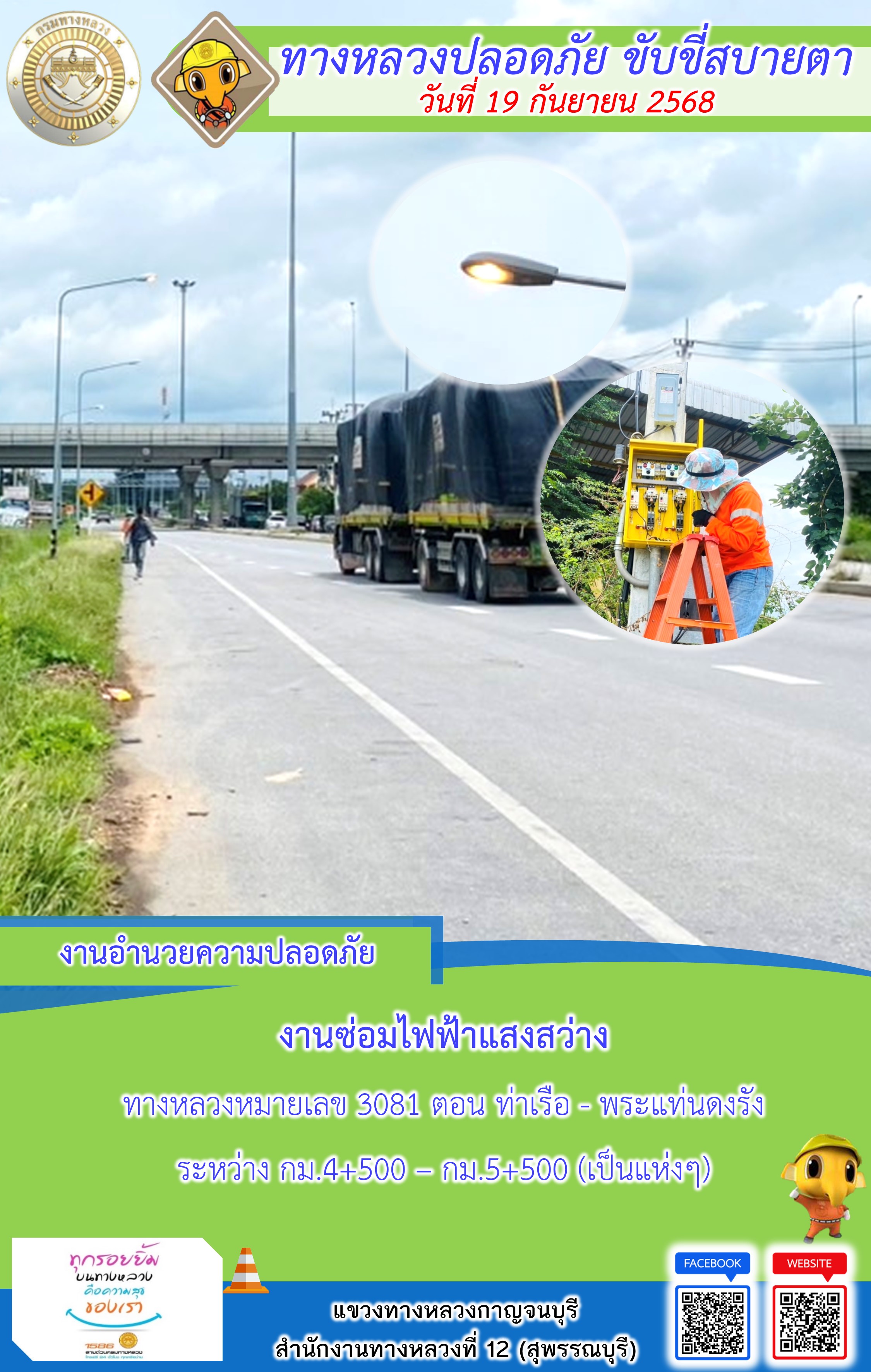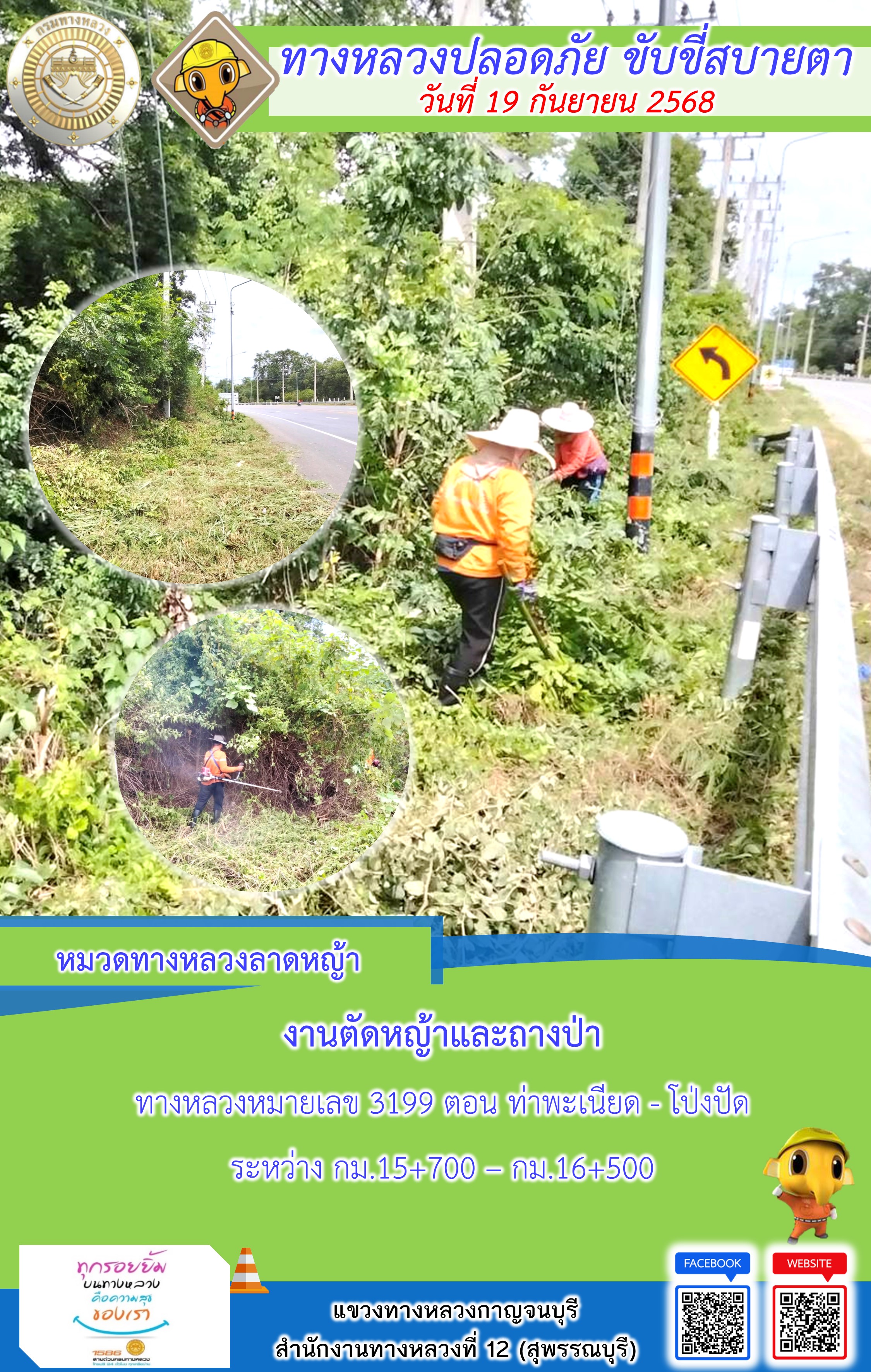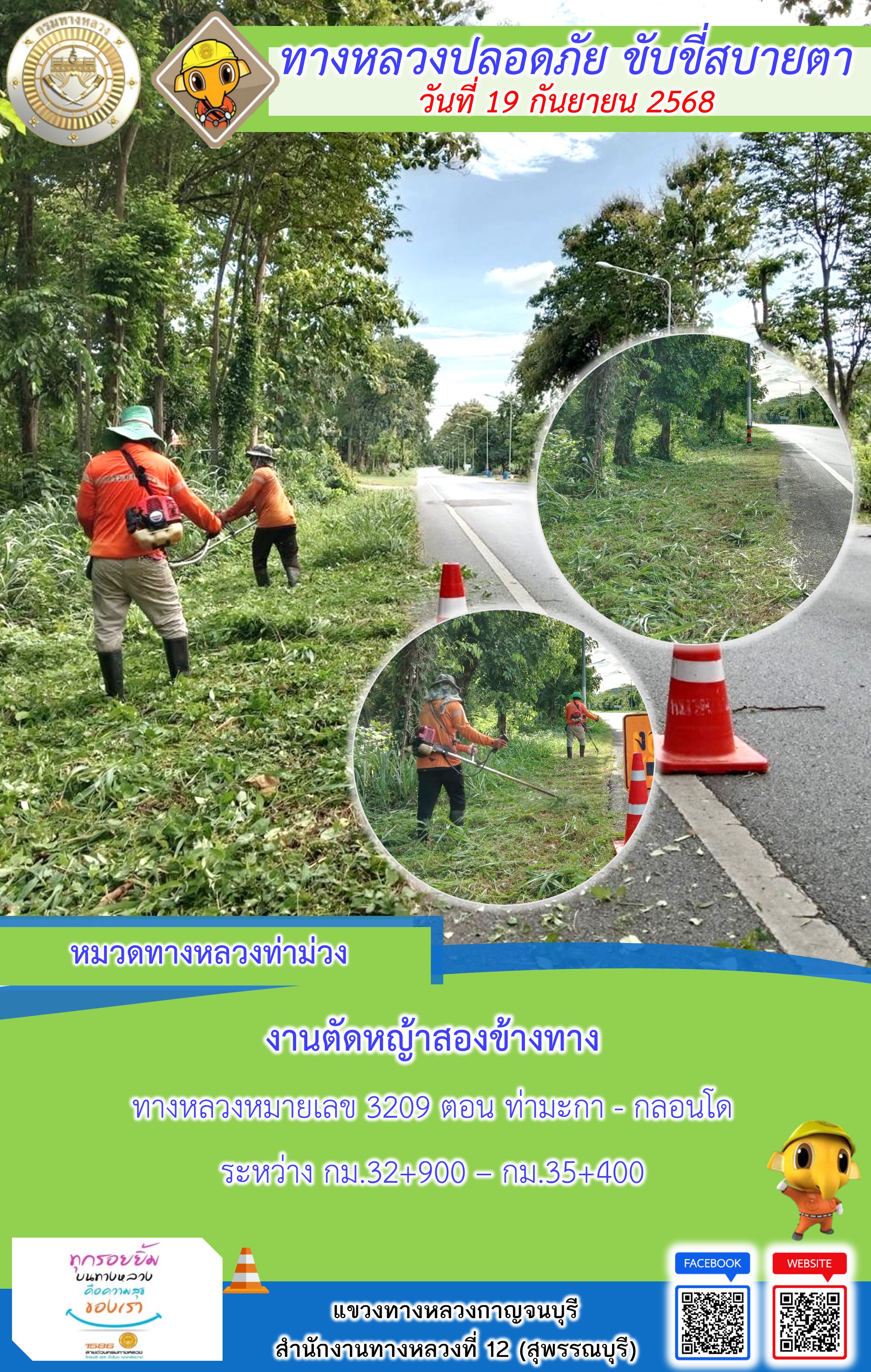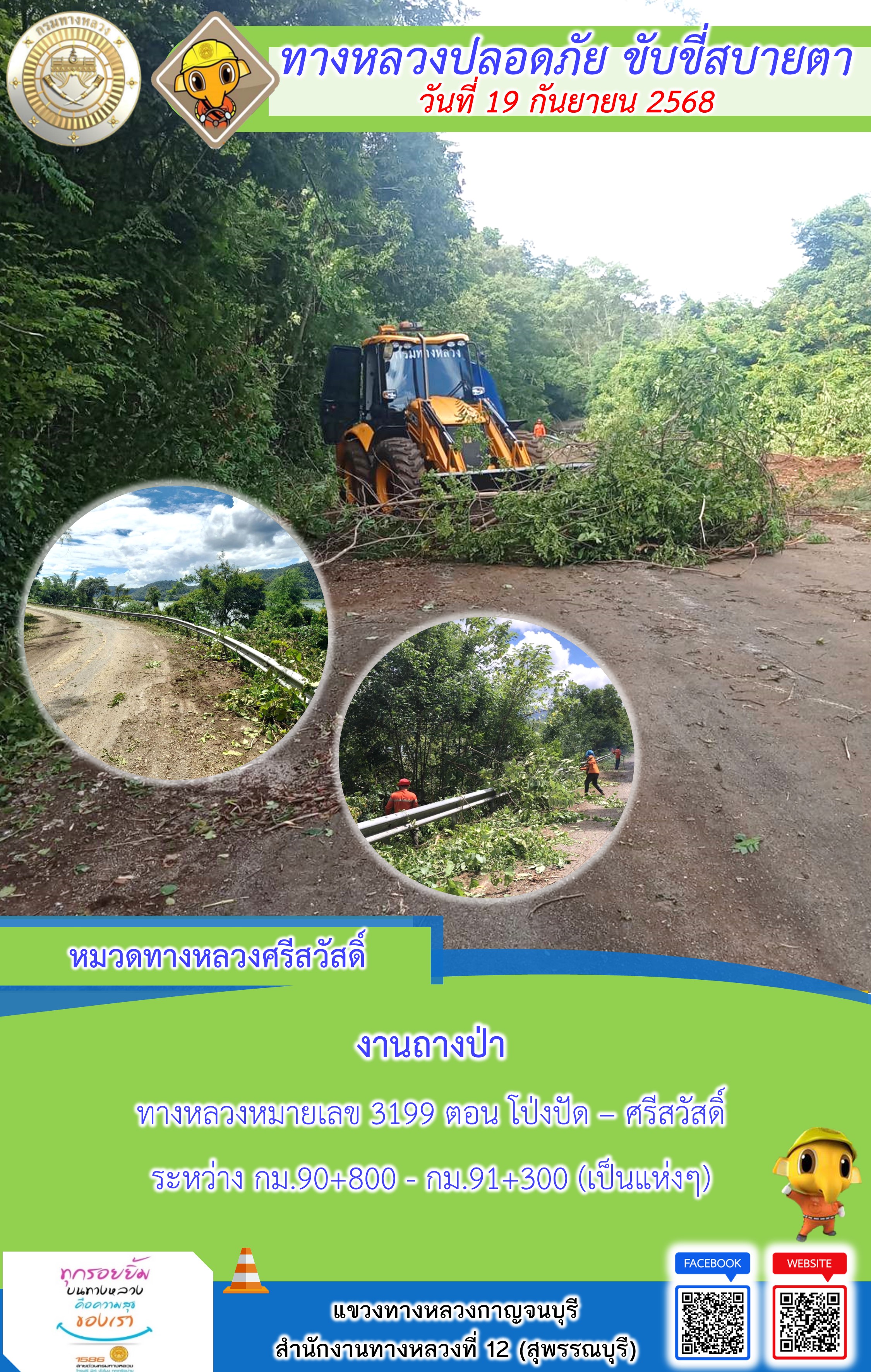 แขวงทางหลวงกาญจนบุรี โดยหมวดทางหลวงในสังกัด และงานอำนวยความปลอดภัยปฏิบัติงาน ประจำวันที่ 19 ก.ย. 68