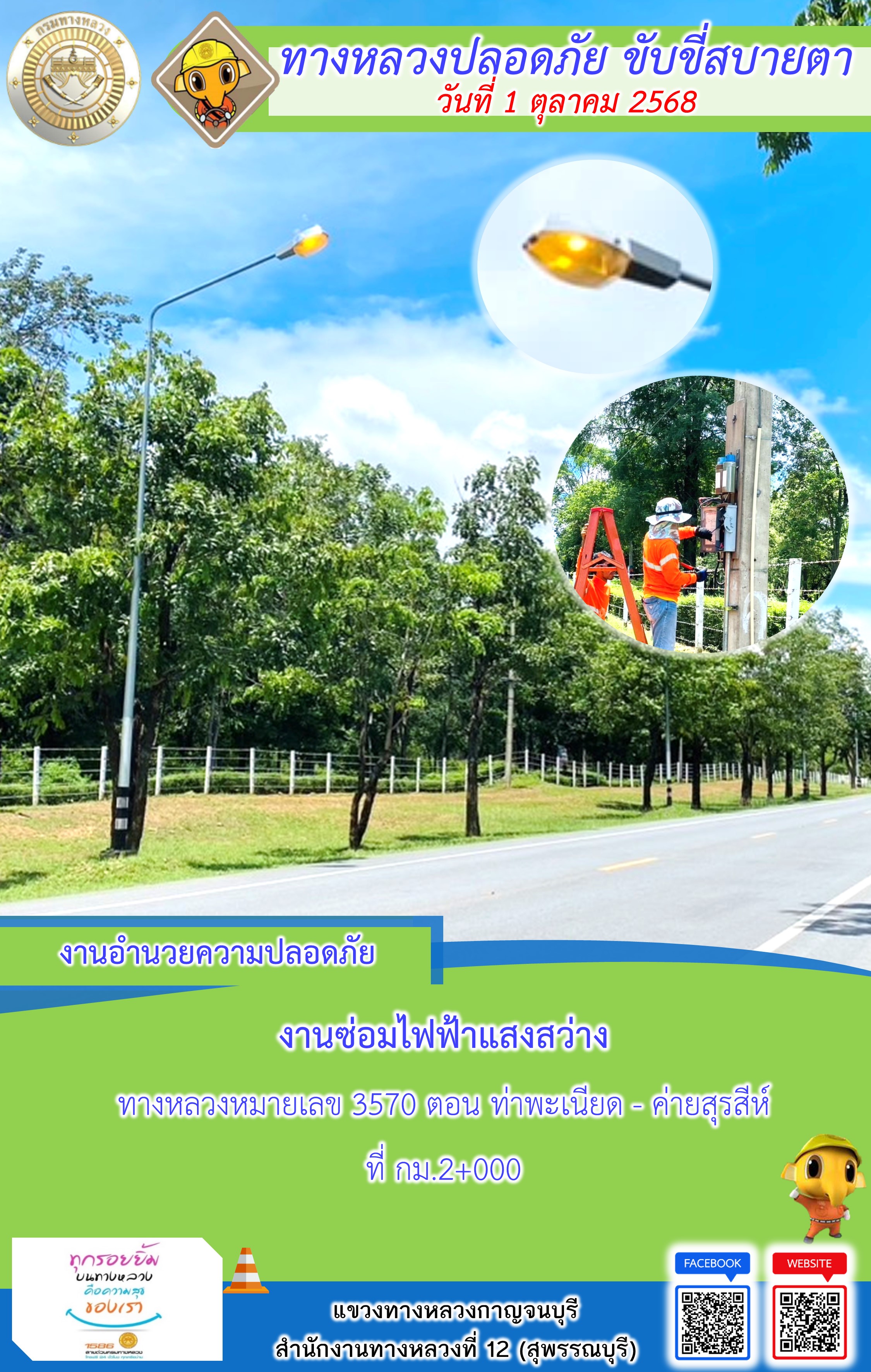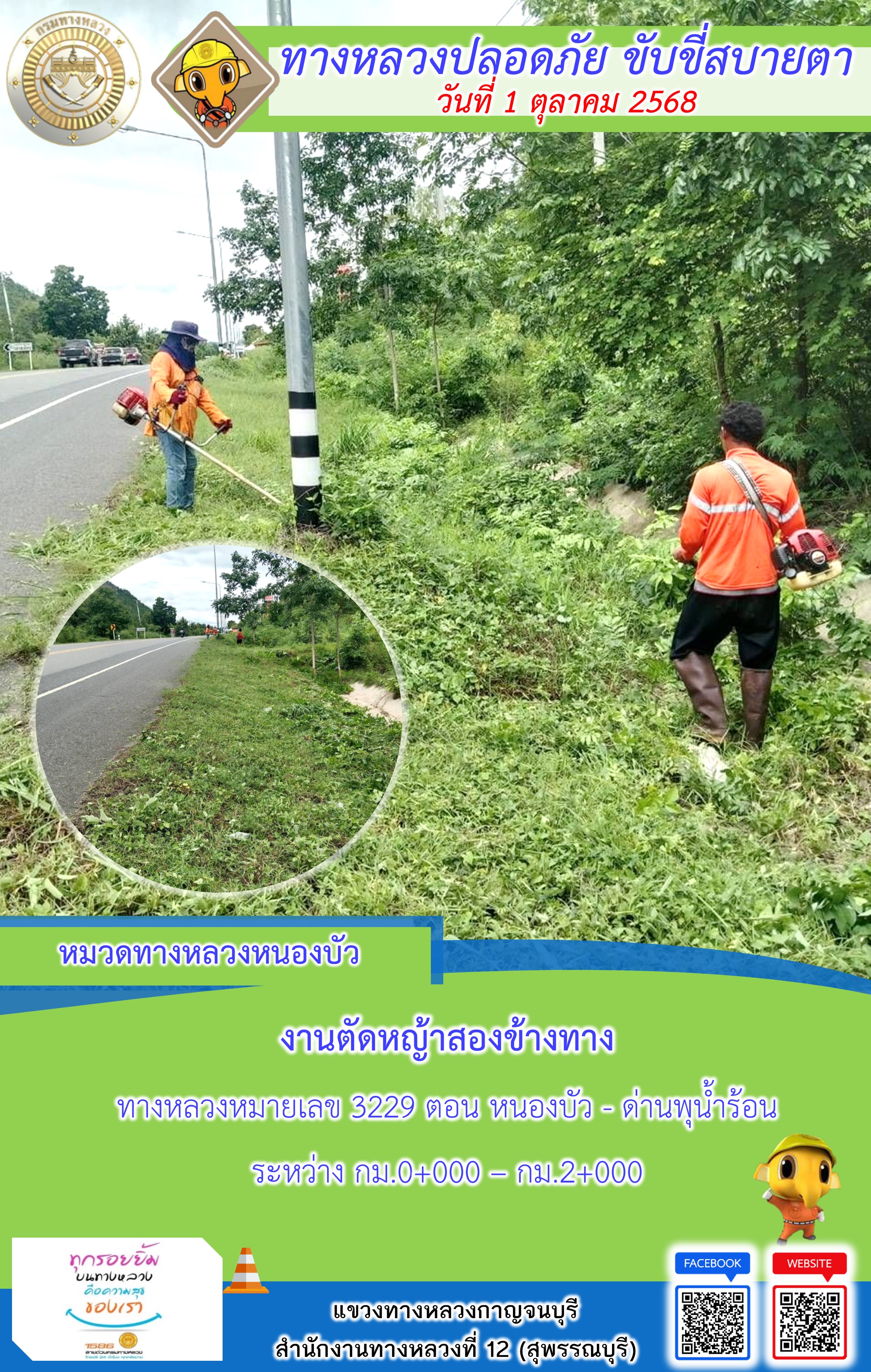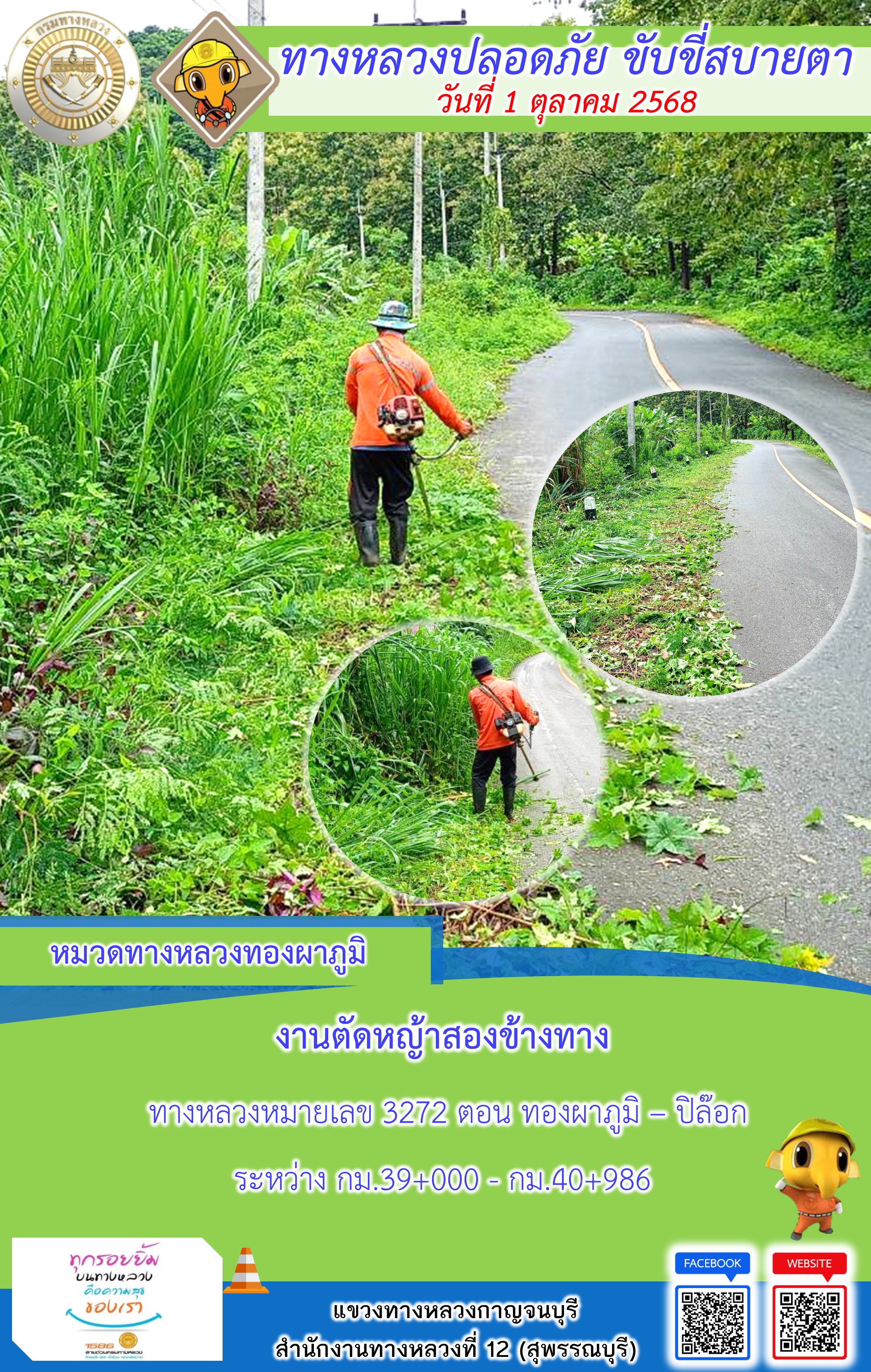 ข้อมูลภาพกิจกรรม : แขวงทางหลวงกาญจนบุรี โดยหมวดทางหลวงในสังกัด และงานอำนวยความปลอดภัยปฏิบัติงาน ประจำวันที่ 1 ต.ต. 68