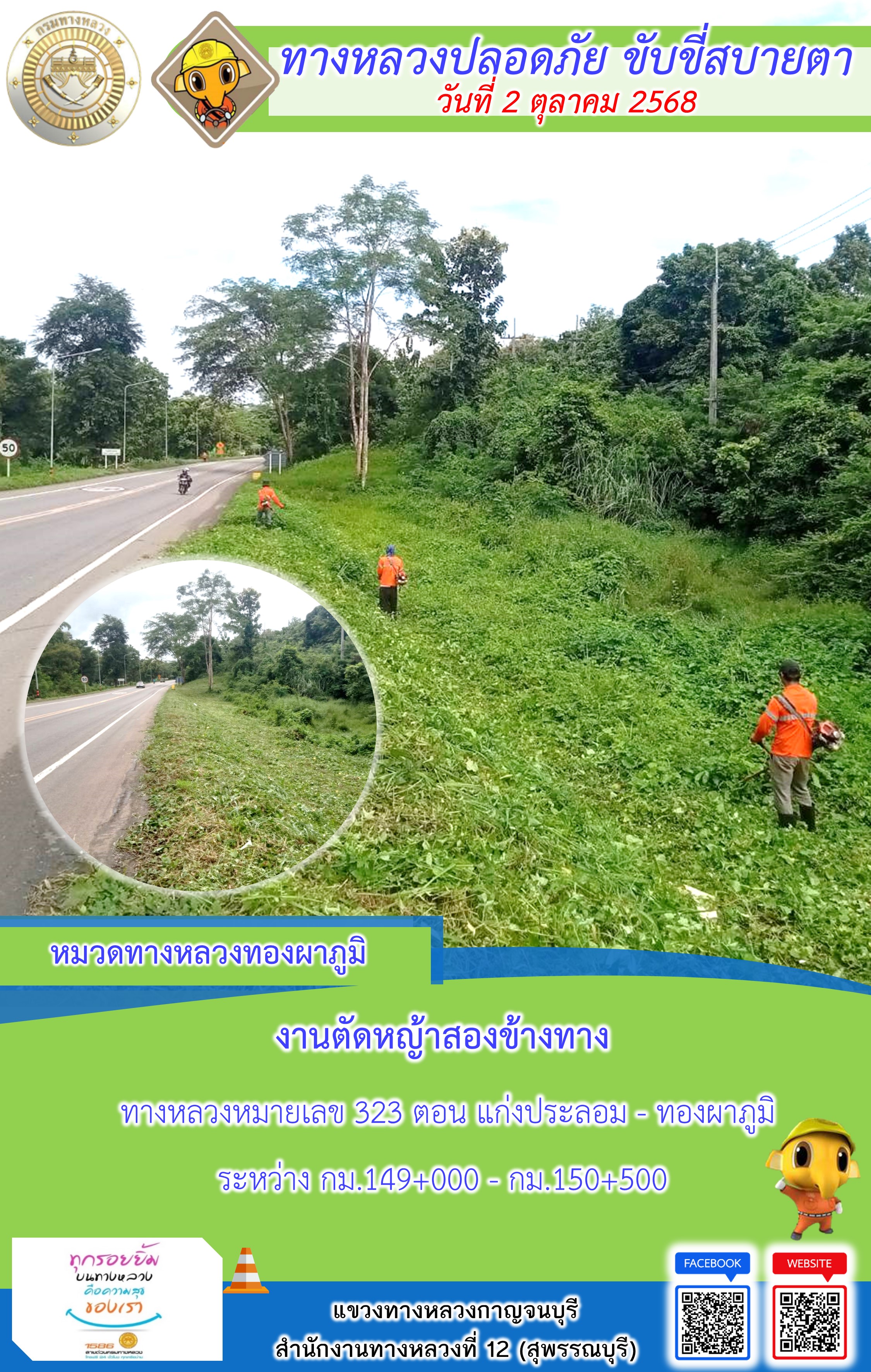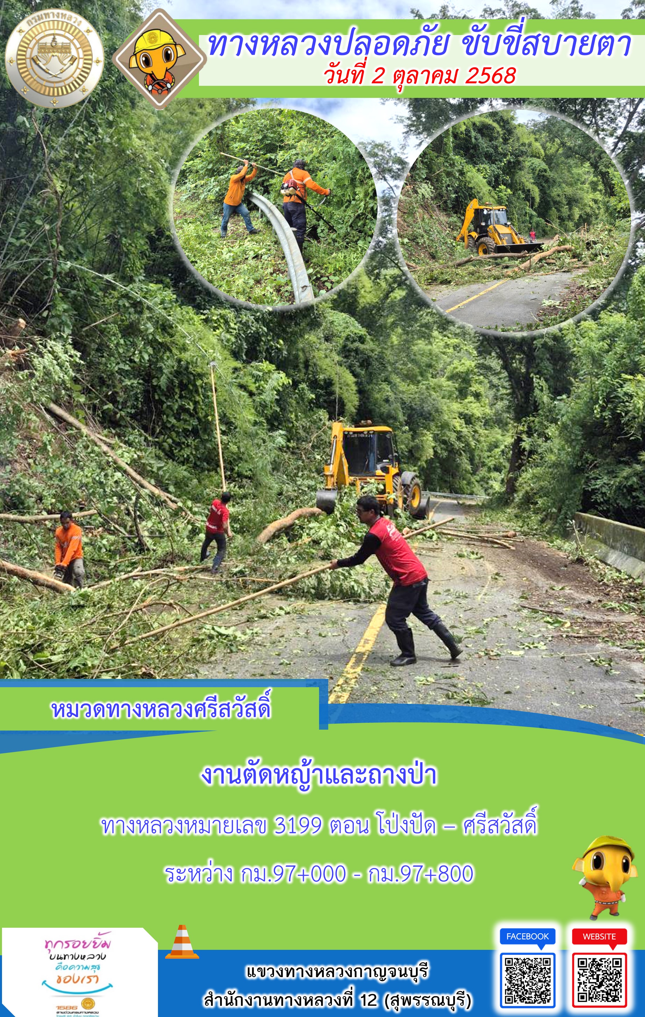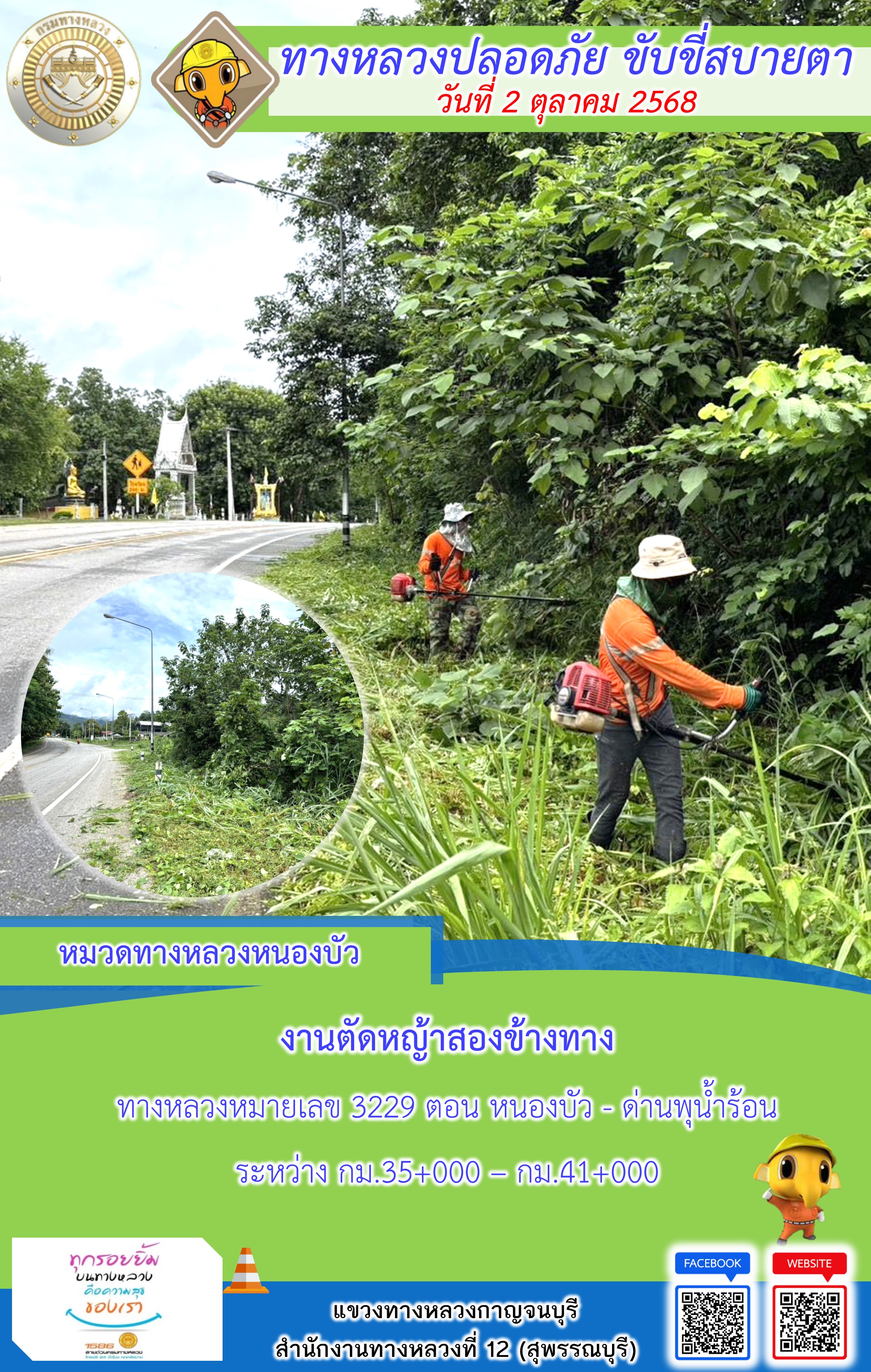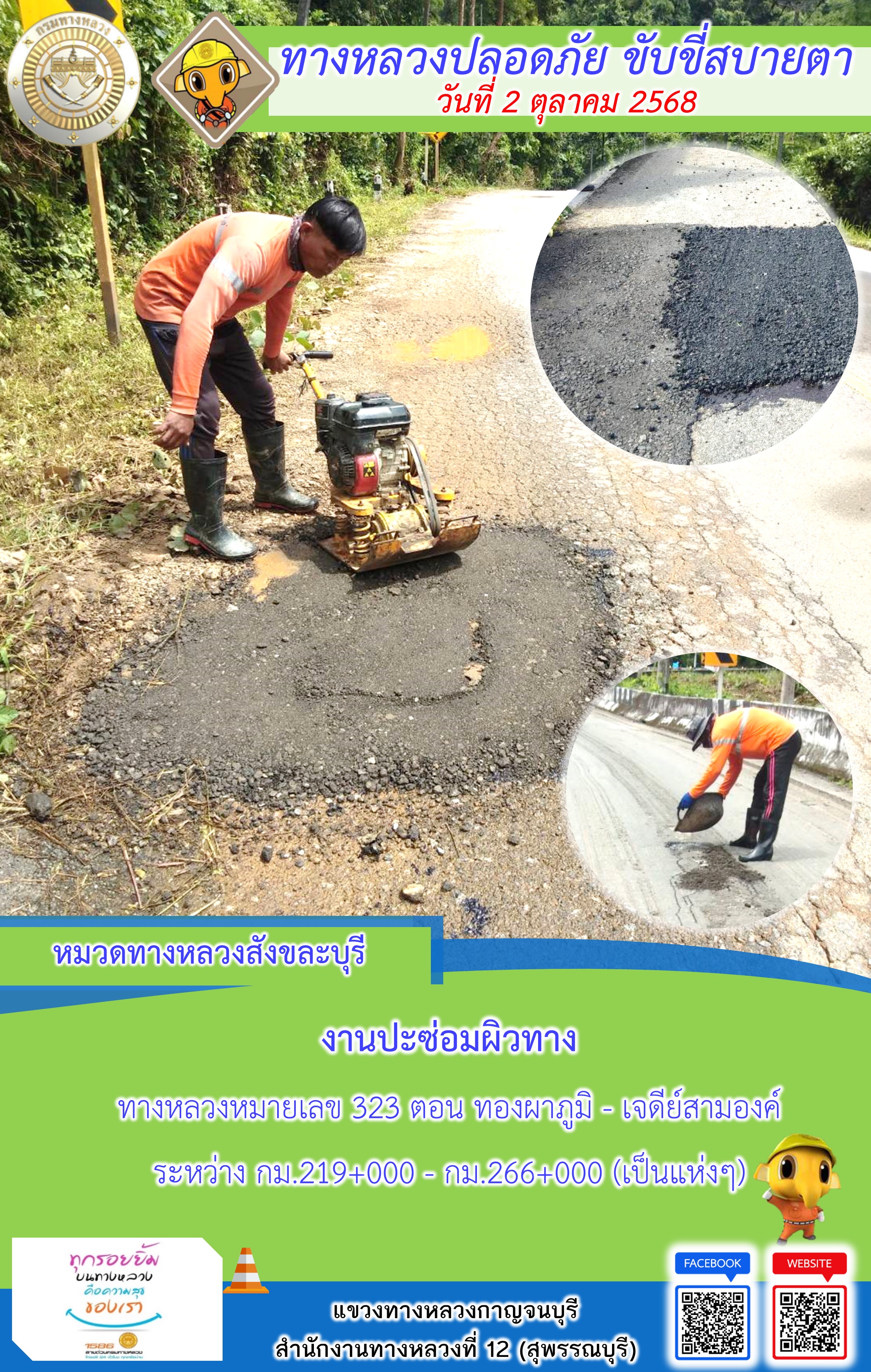 ข้อมูลภาพกิจกรรม : แขวงทางหลวงกาญจนบุรี โดยหมวดทางหลวงในสังกัด และงานอำนวยความปลอดภัยปฏิบัติงาน ประจำวันที่ 2 ต.ต. 68
