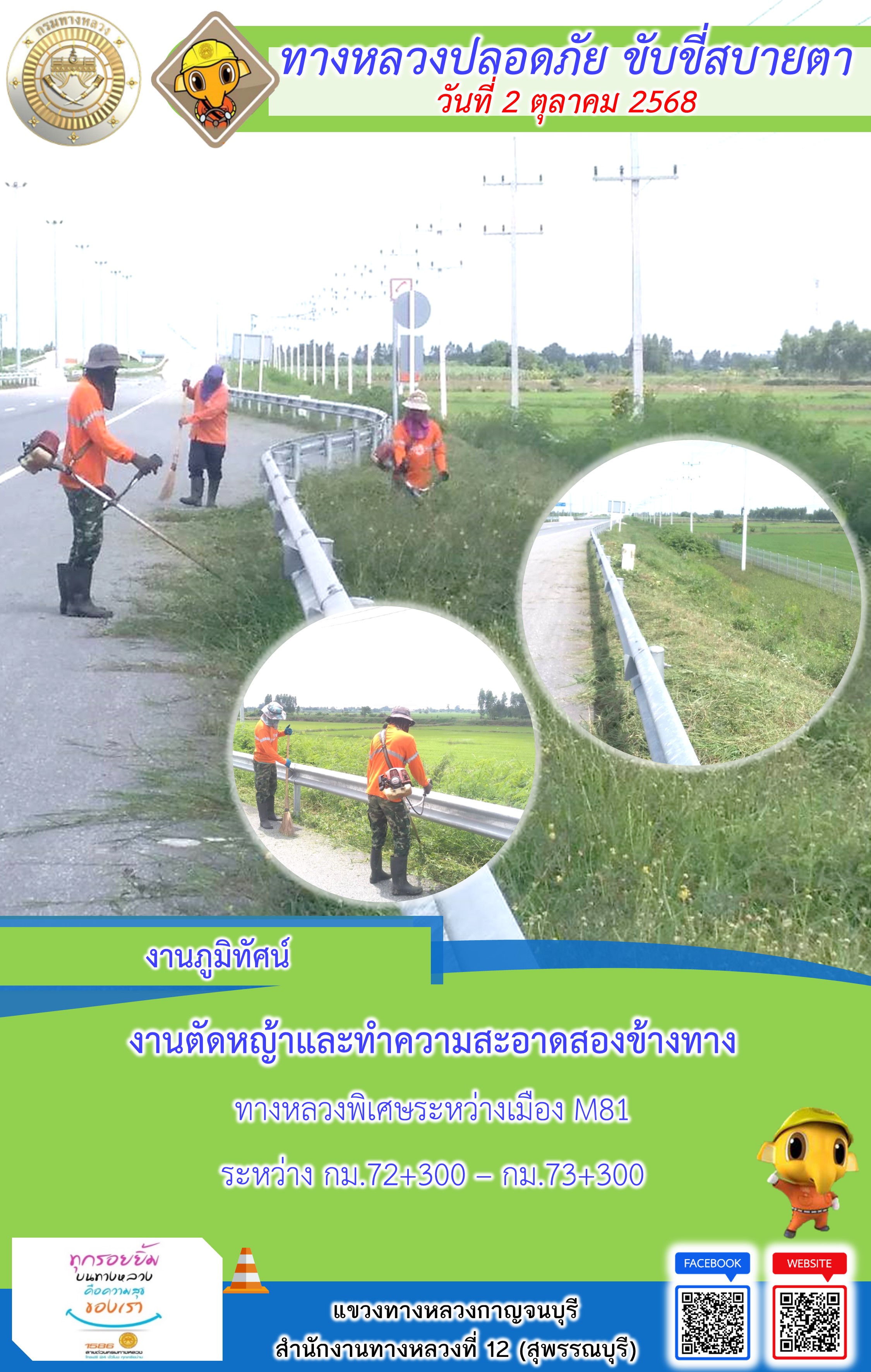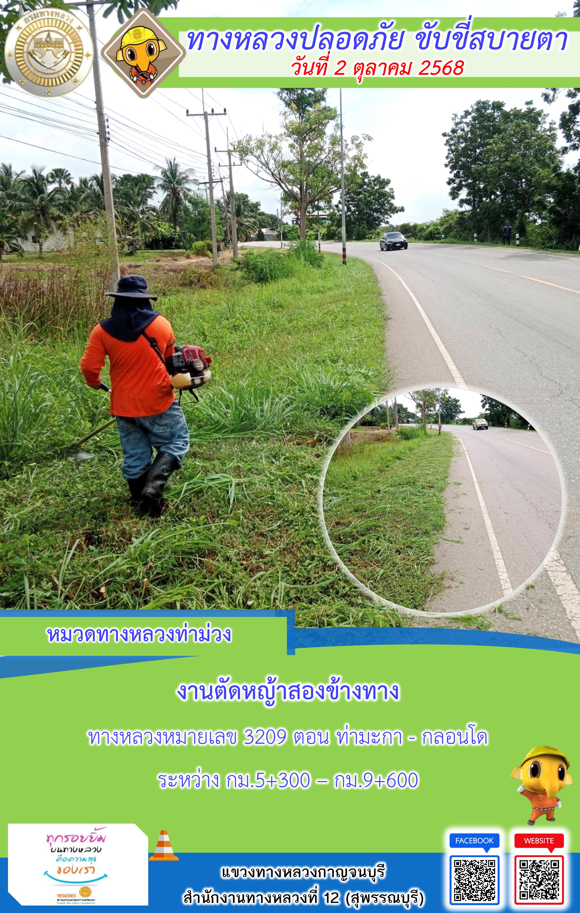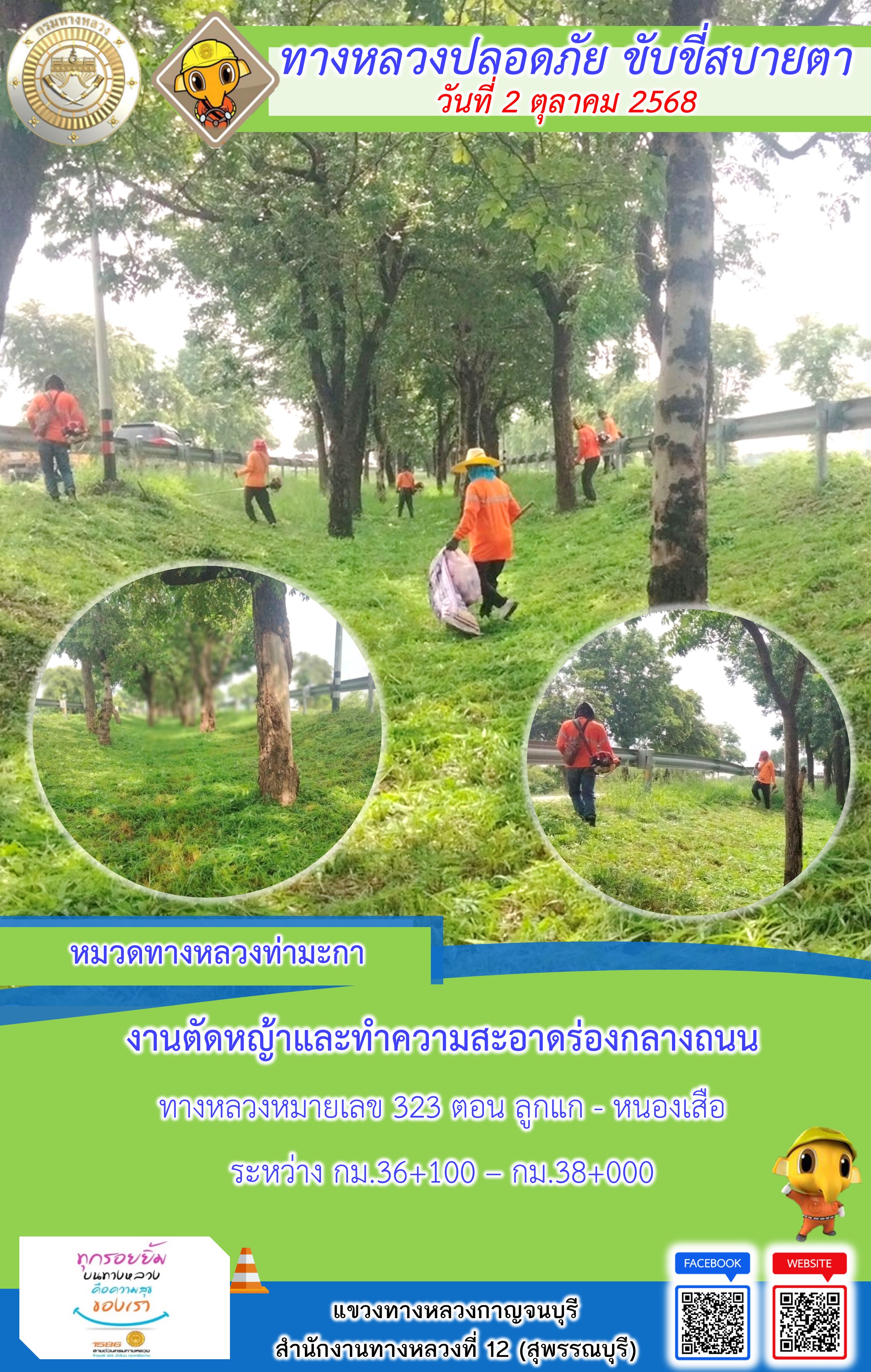ข้อมูลภาพกิจกรรม : แขวงทางหลวงกาญจนบุรี โดยหมวดทางหลวงในสังกัด และงานอำนวยความปลอดภัยปฏิบัติงาน ประจำวันที่ 2 ต.ต. 68