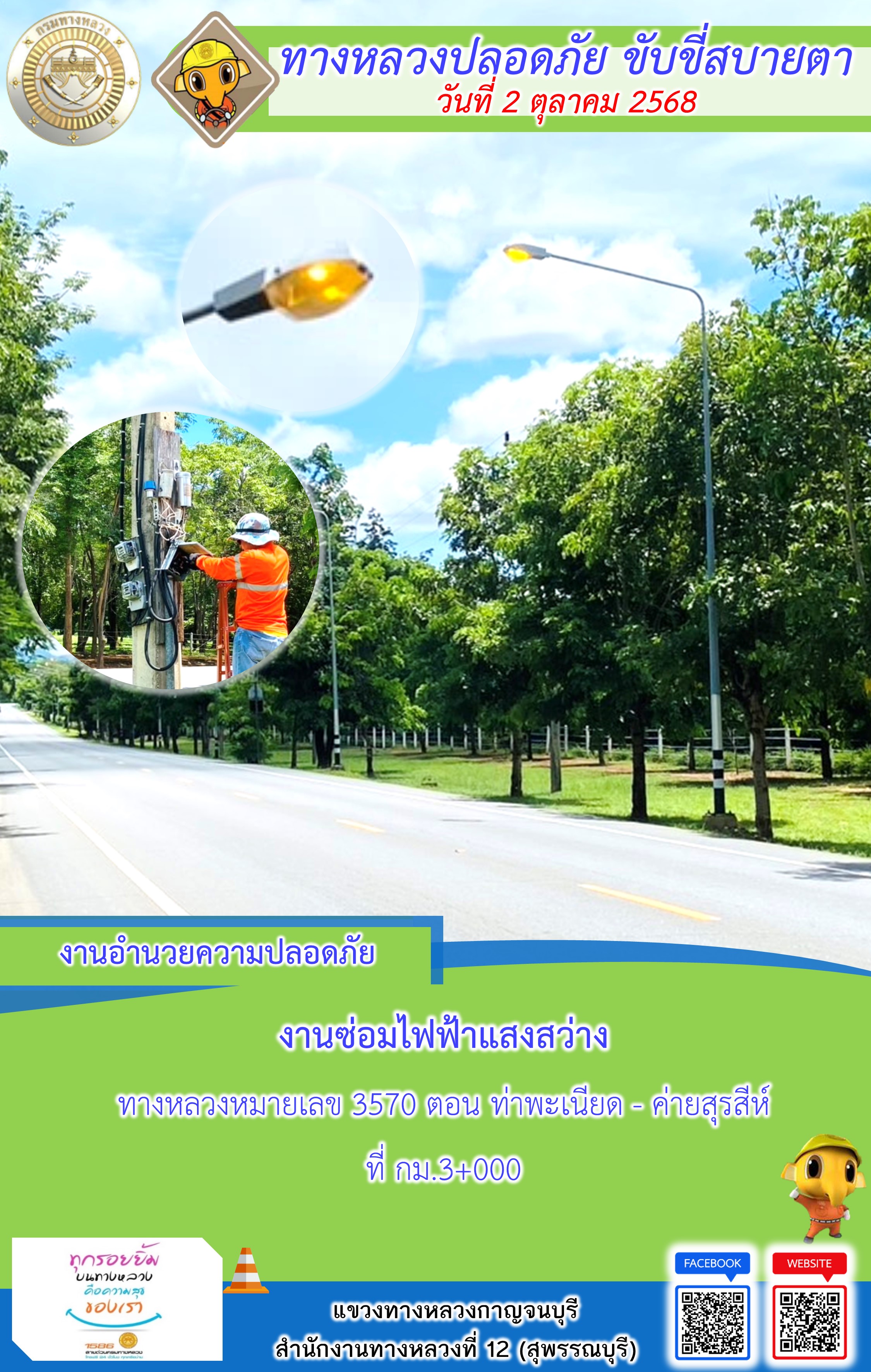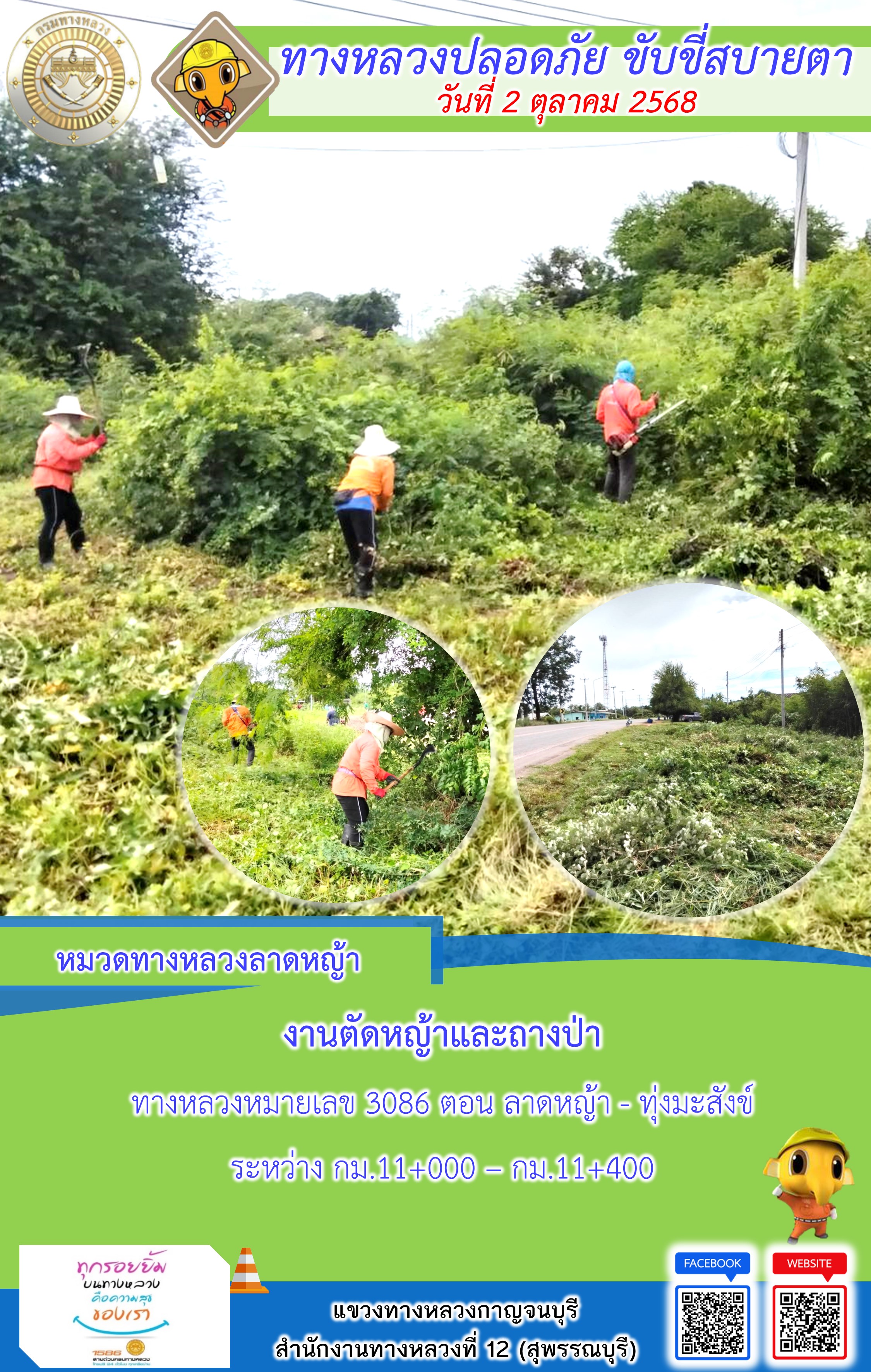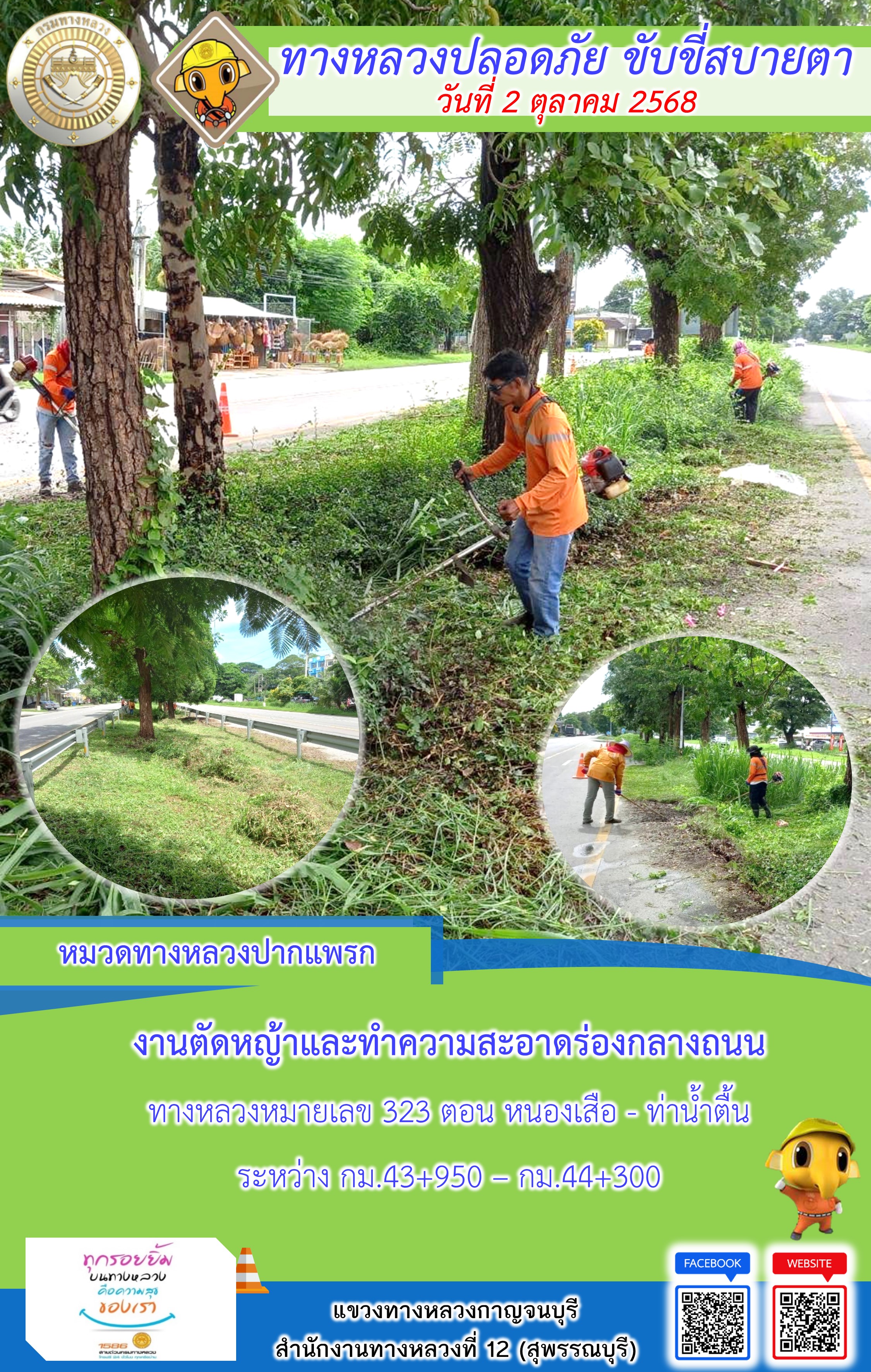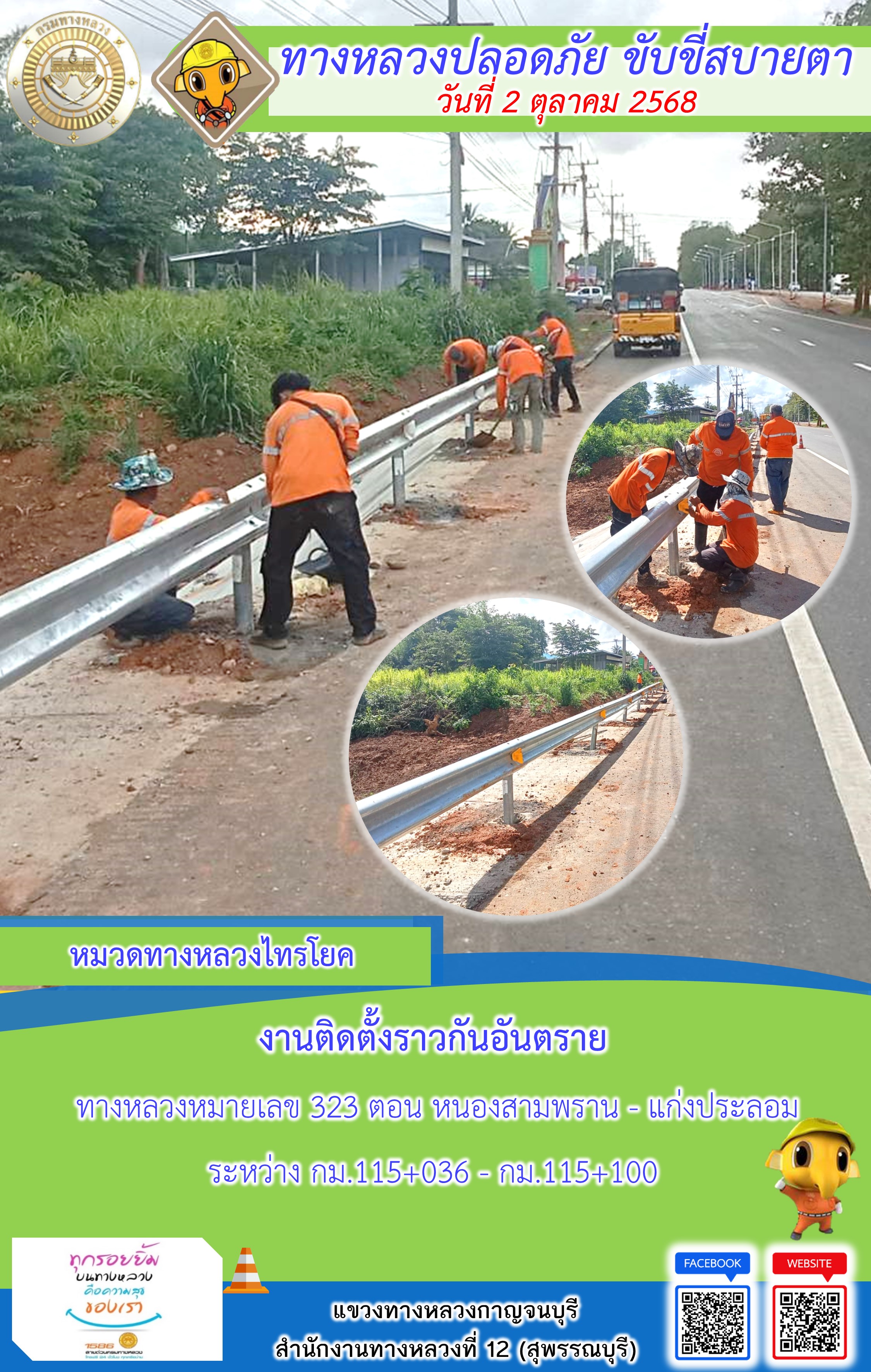 ข้อมูลภาพกิจกรรม : แขวงทางหลวงกาญจนบุรี โดยหมวดทางหลวงในสังกัด และงานอำนวยความปลอดภัยปฏิบัติงาน ประจำวันที่ 2 ต.ต. 68