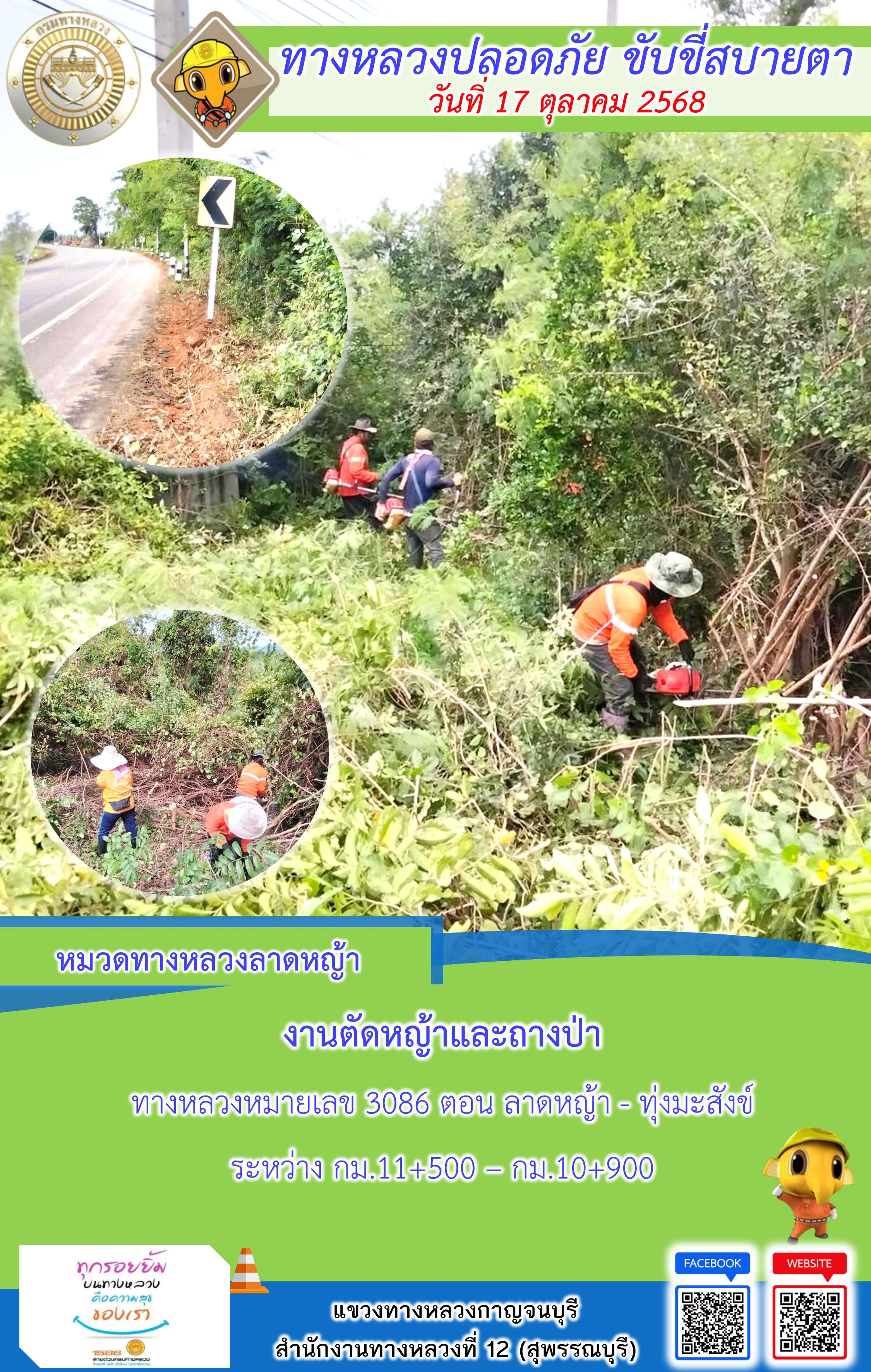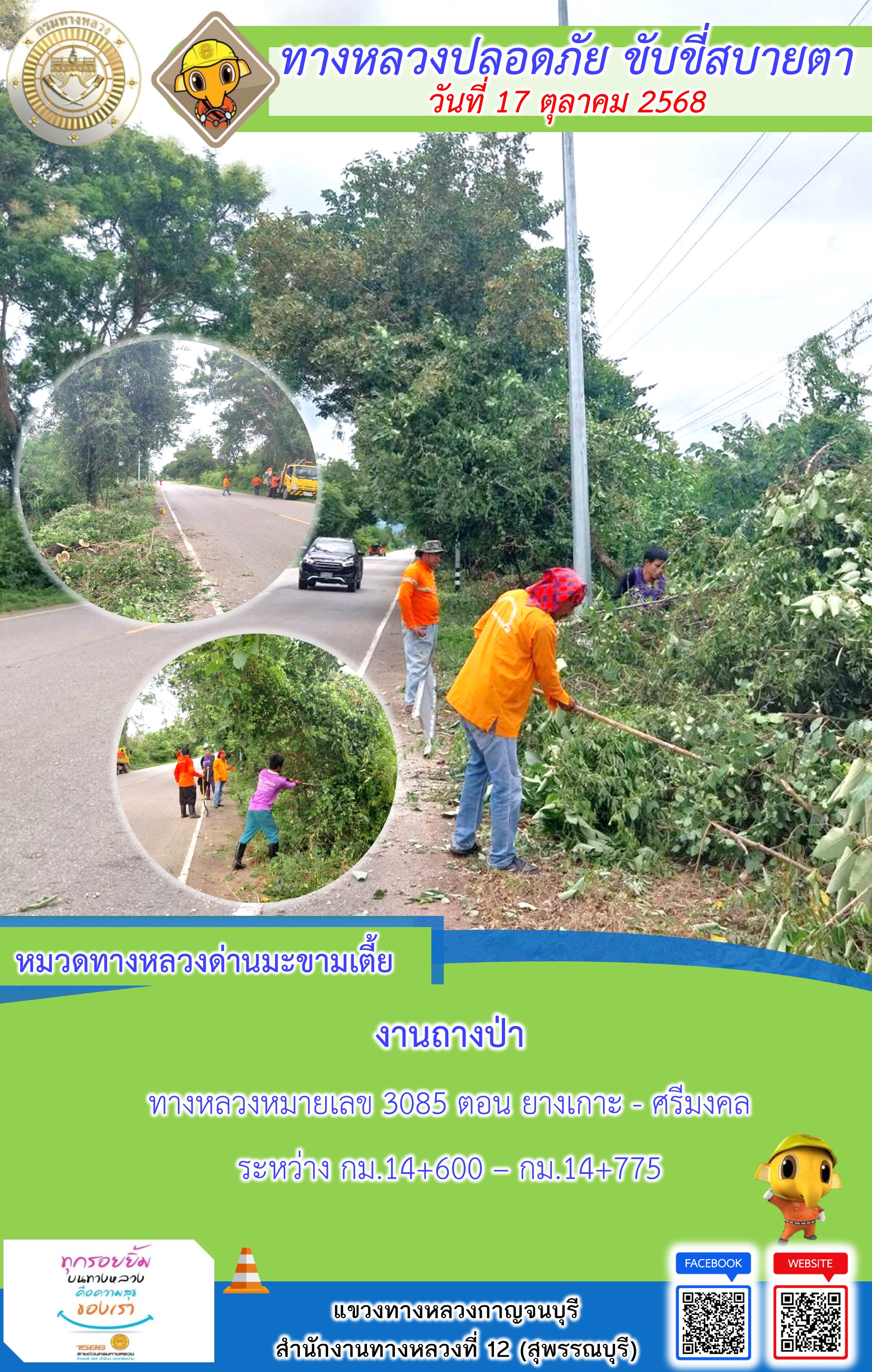 แขวงทางหลวงกาญจนบุรี โดยหมวดทางหลวงในสังกัด และงานอำนวยความปลอดภัยปฏิบัติงาน ประจำวันที่ 17 ต.ต. 68