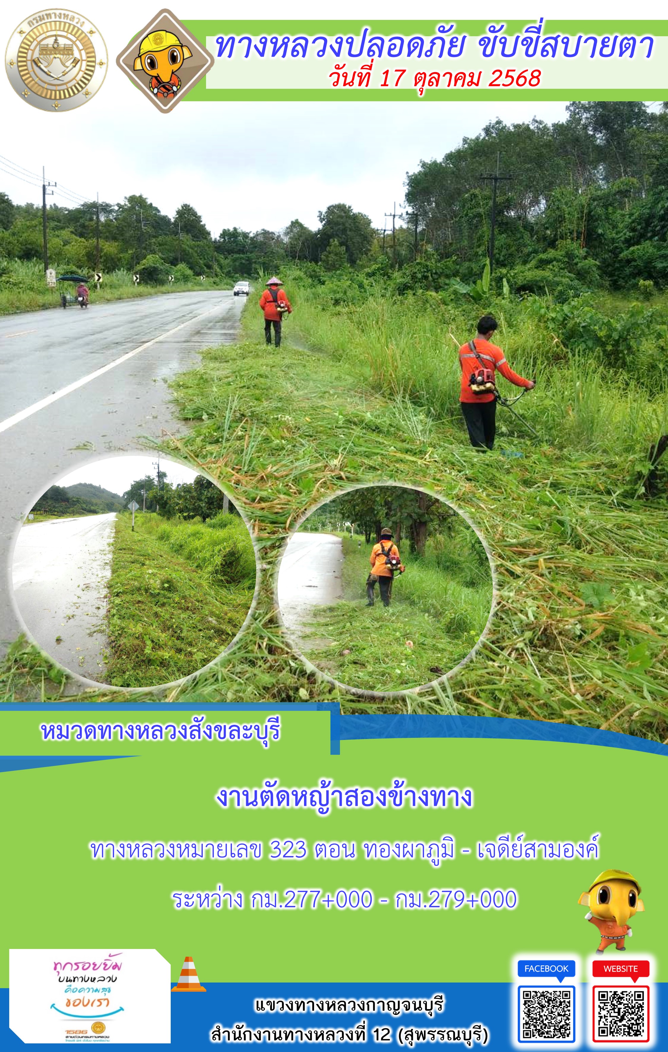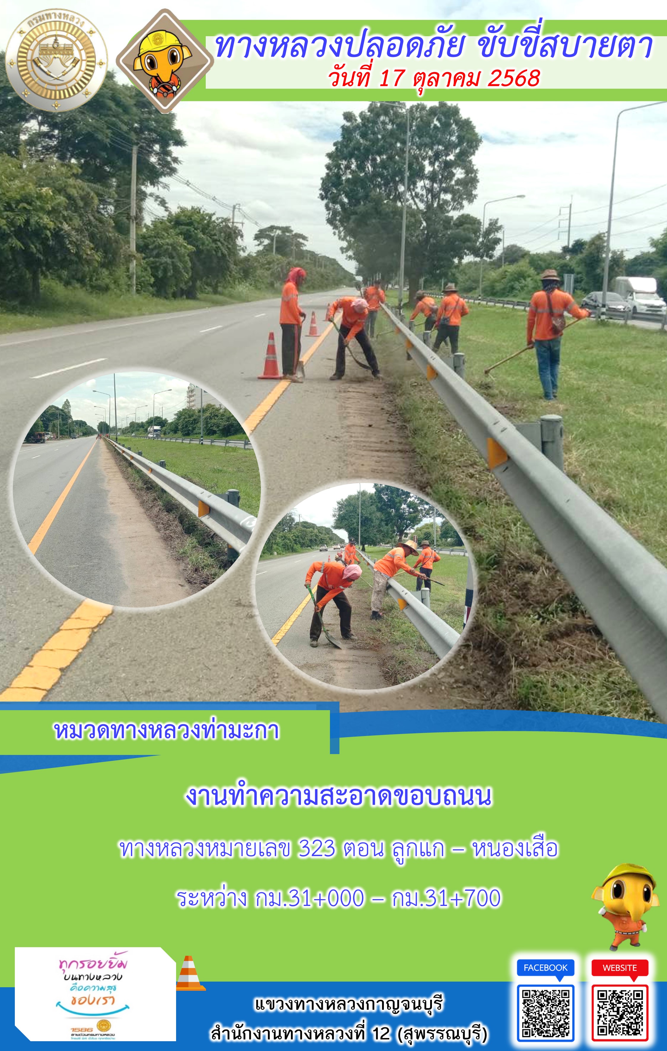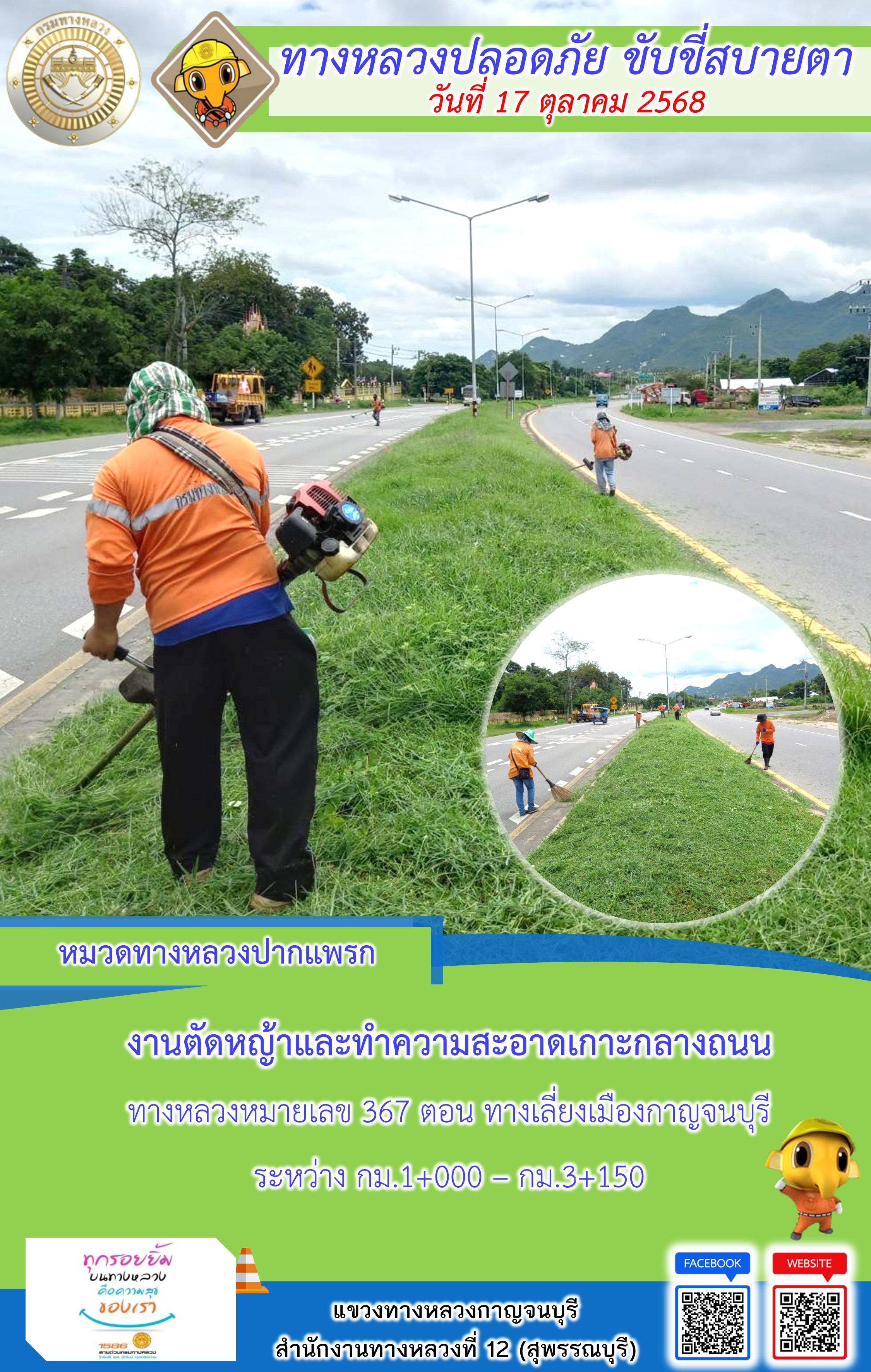 ข้อมูลภาพกิจกรรม : แขวงทางหลวงกาญจนบุรี โดยหมวดทางหลวงในสังกัด และงานอำนวยความปลอดภัยปฏิบัติงาน ประจำวันที่ 17 ต.ต. 68