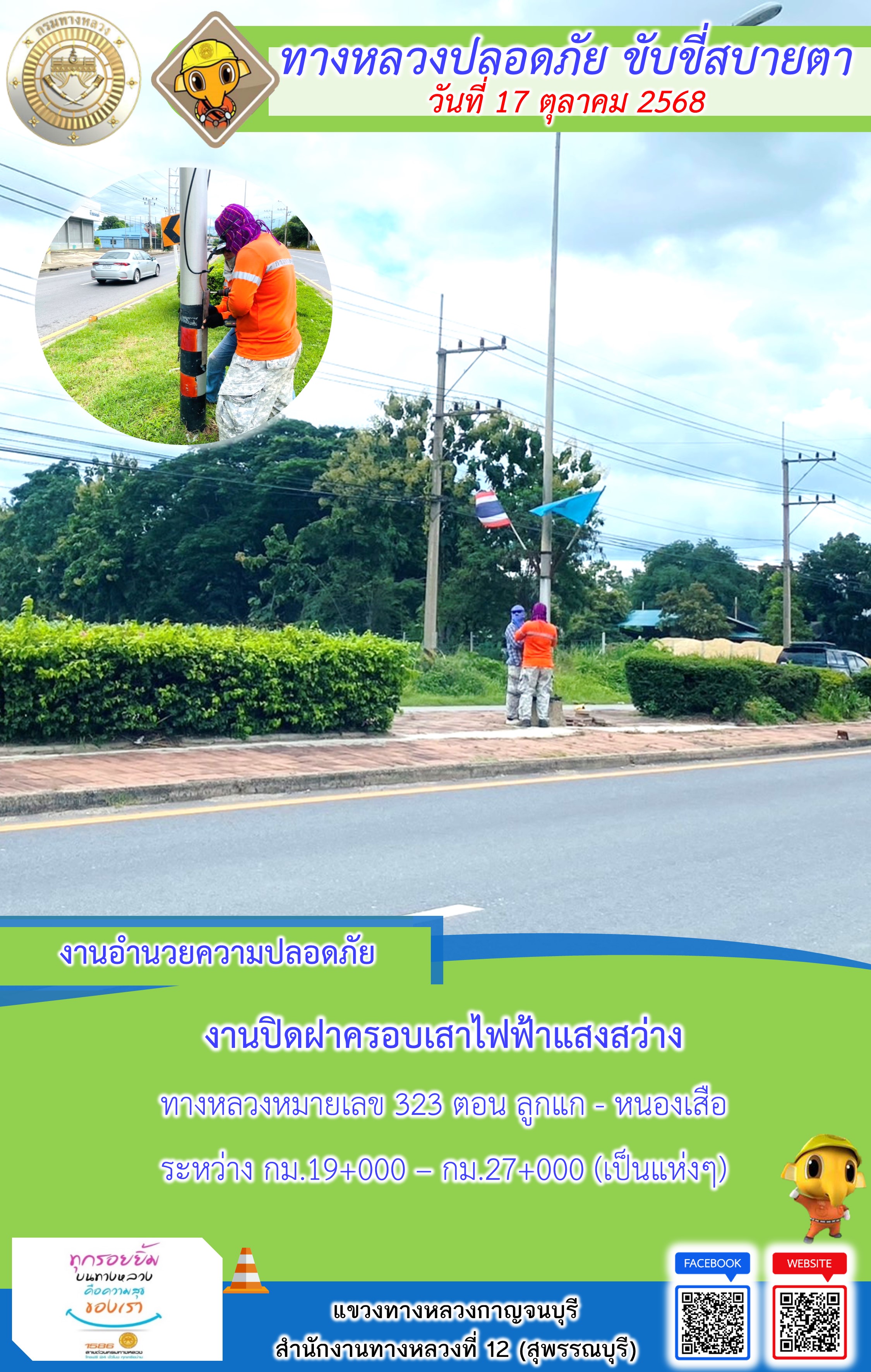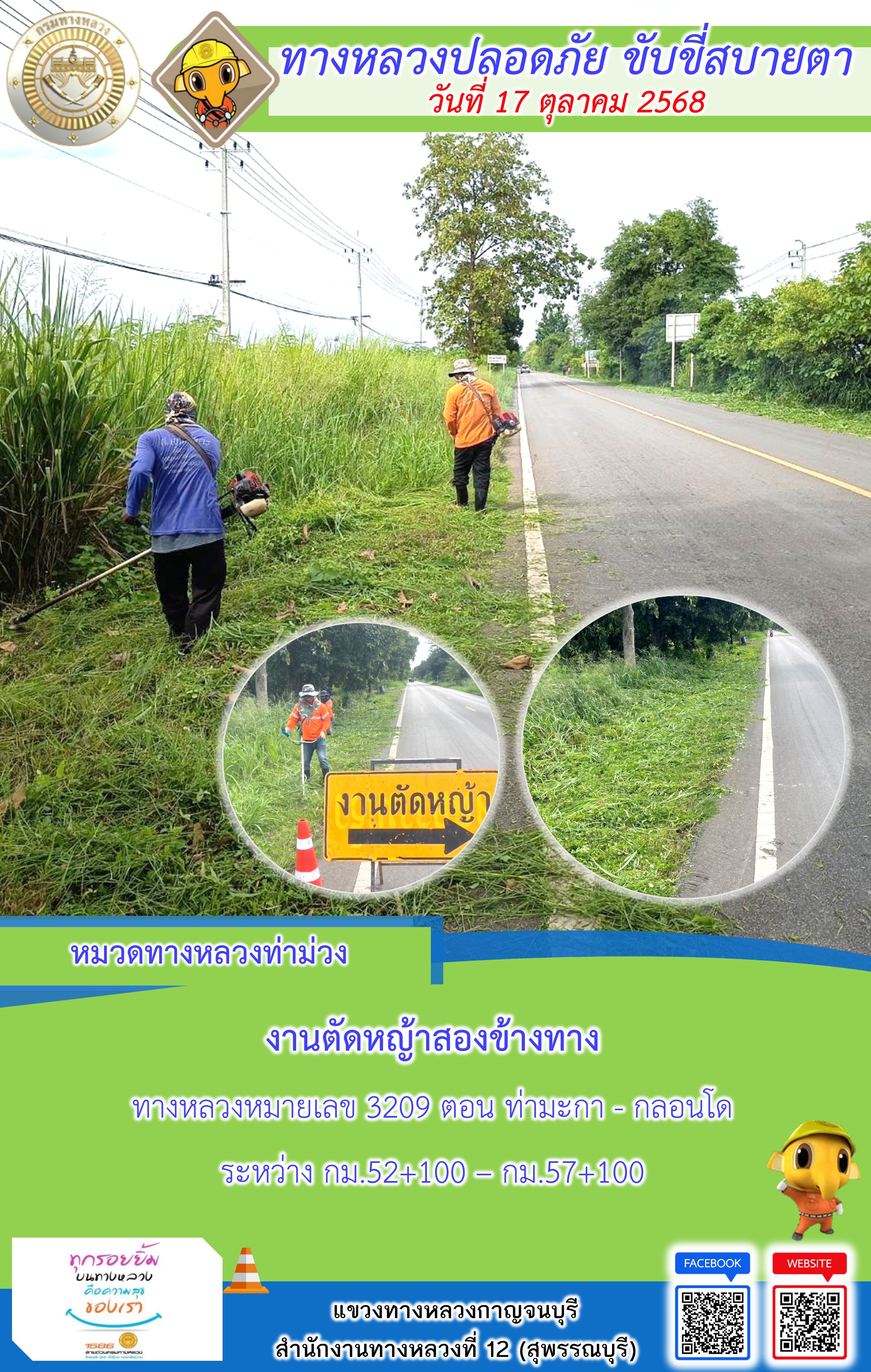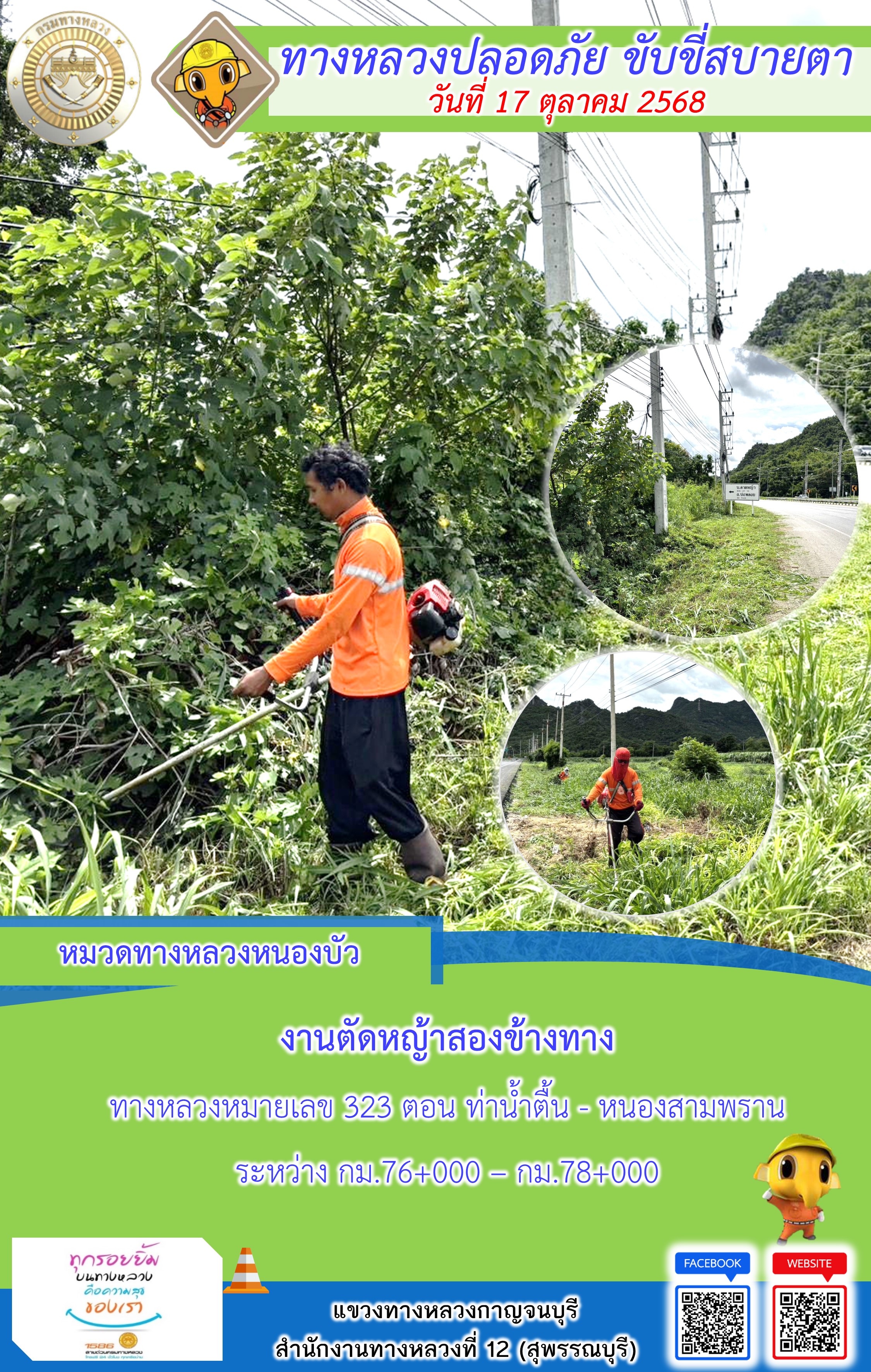 ข้อมูลภาพกิจกรรม : แขวงทางหลวงกาญจนบุรี โดยหมวดทางหลวงในสังกัด และงานอำนวยความปลอดภัยปฏิบัติงาน ประจำวันที่ 17 ต.ต. 68