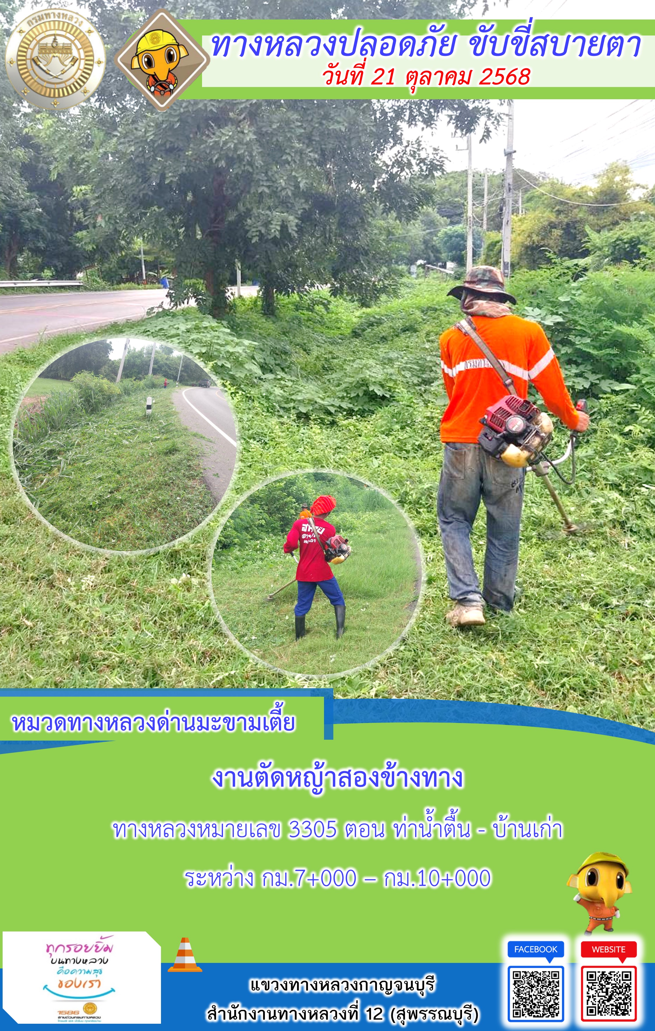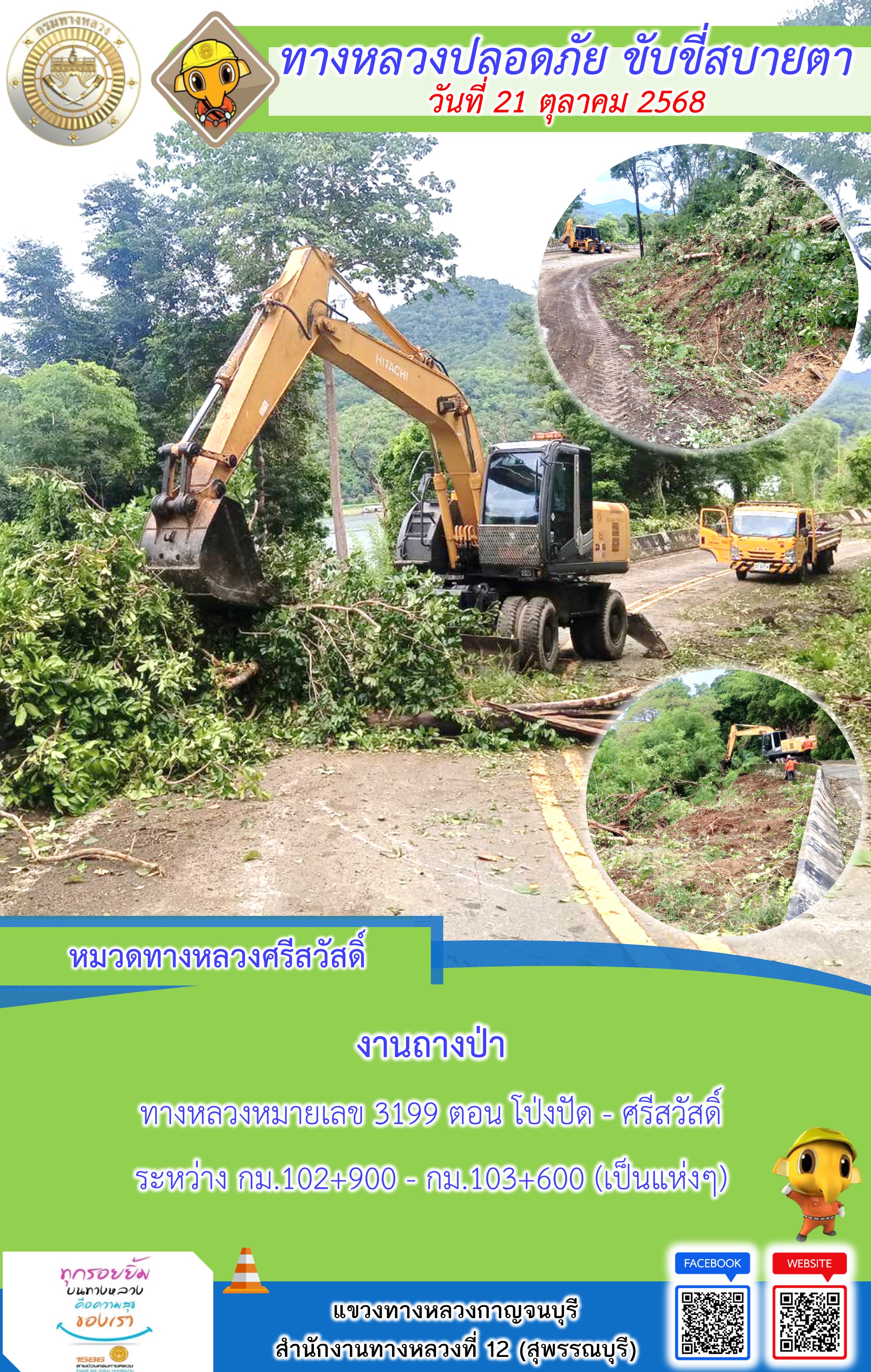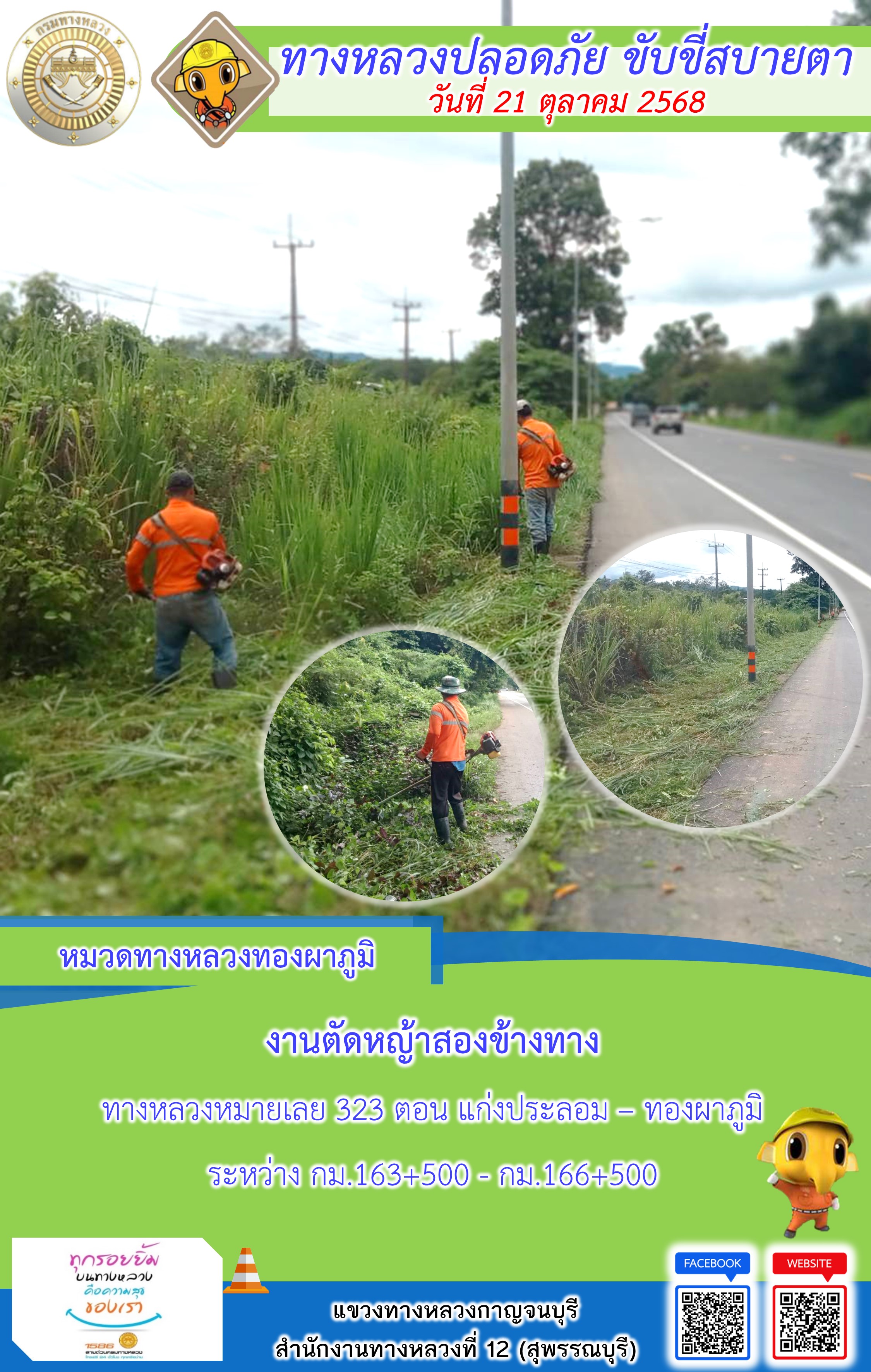 ข้อมูลภาพกิจกรรม : แขวงทางหลวงกาญจนบุรี โดยหมวดทางหลวงในสังกัด และงานอำนวยความปลอดภัยปฏิบัติงาน ประจำวันที่ 21 ต.ต. 68