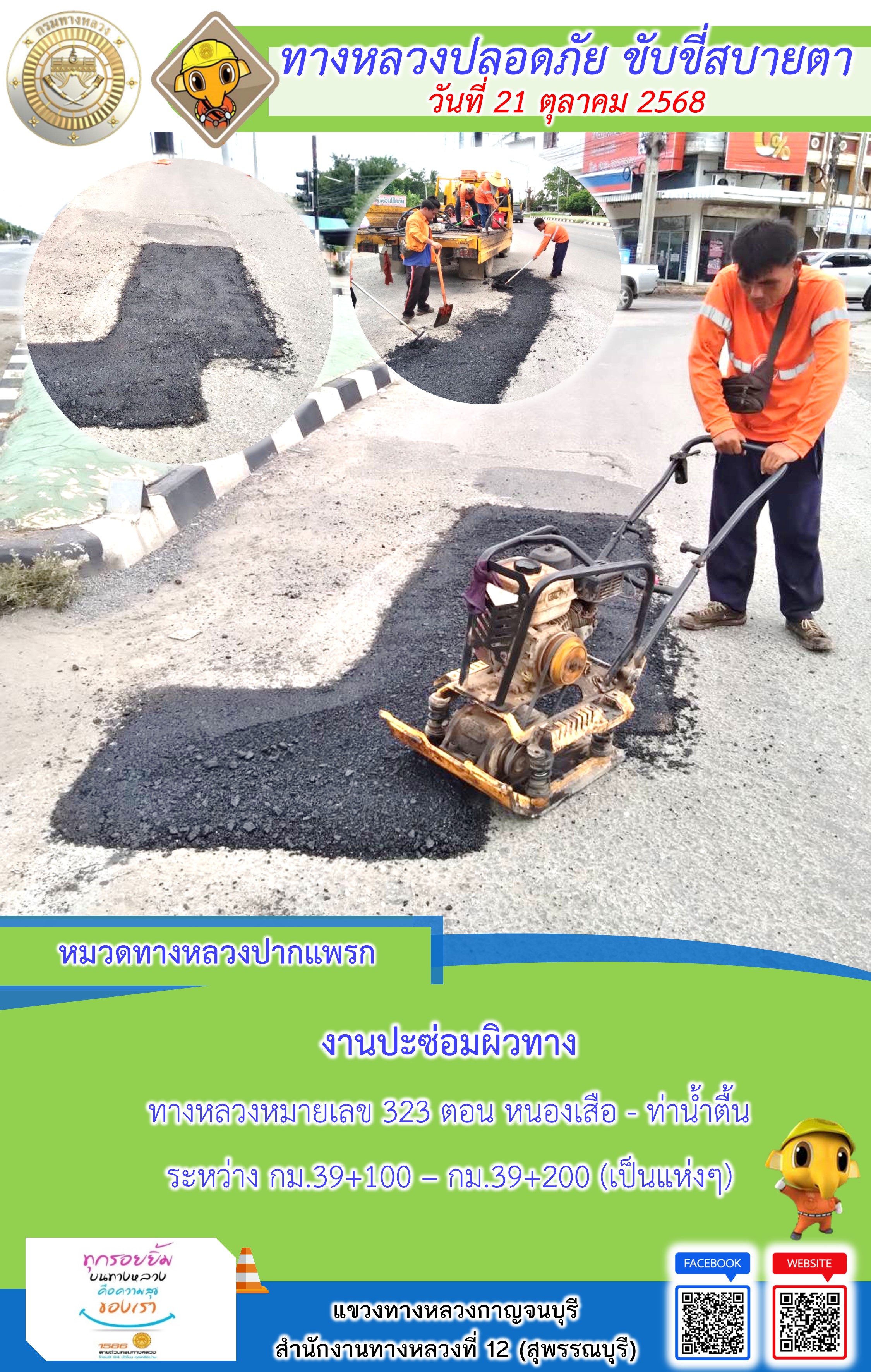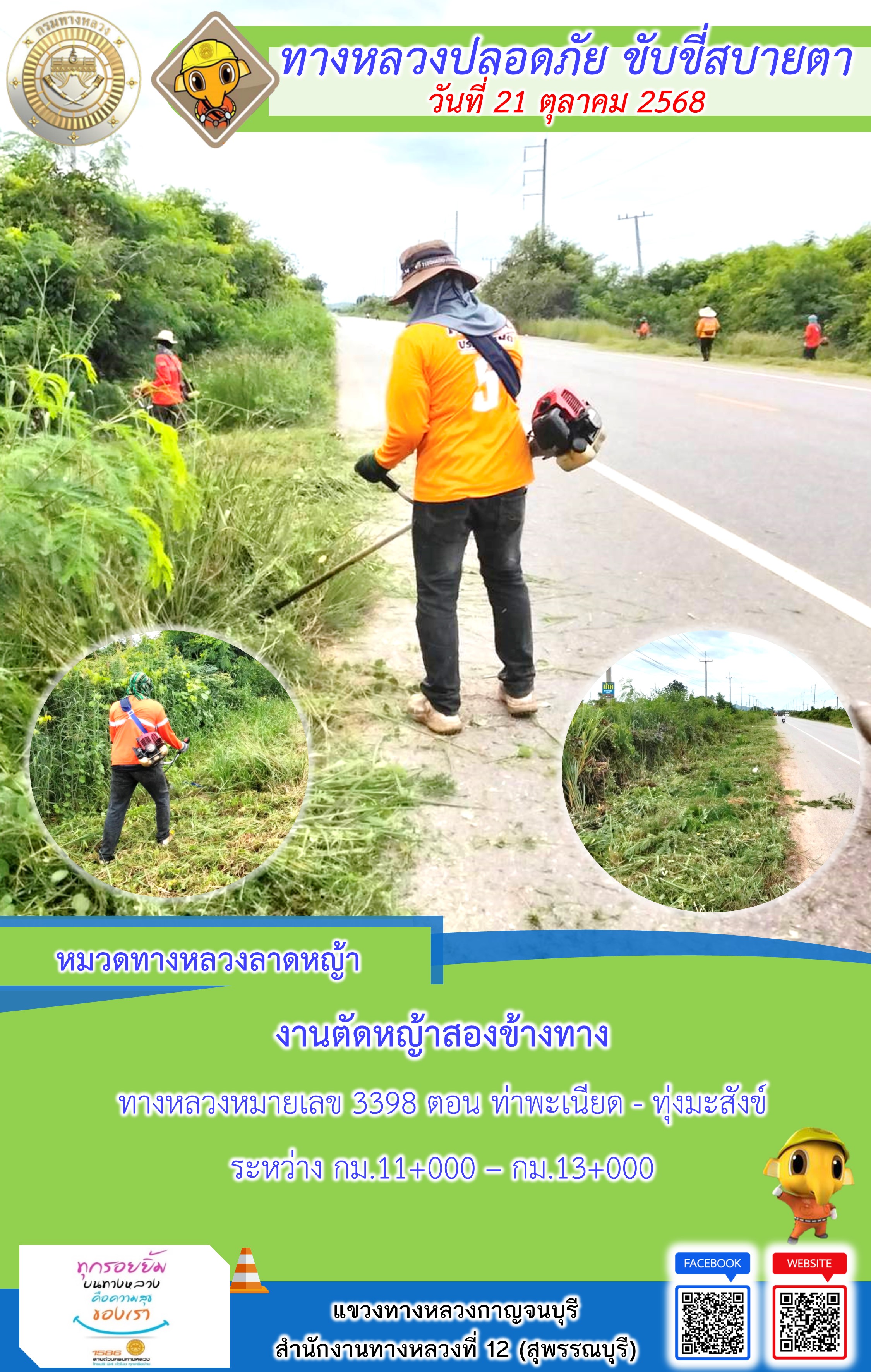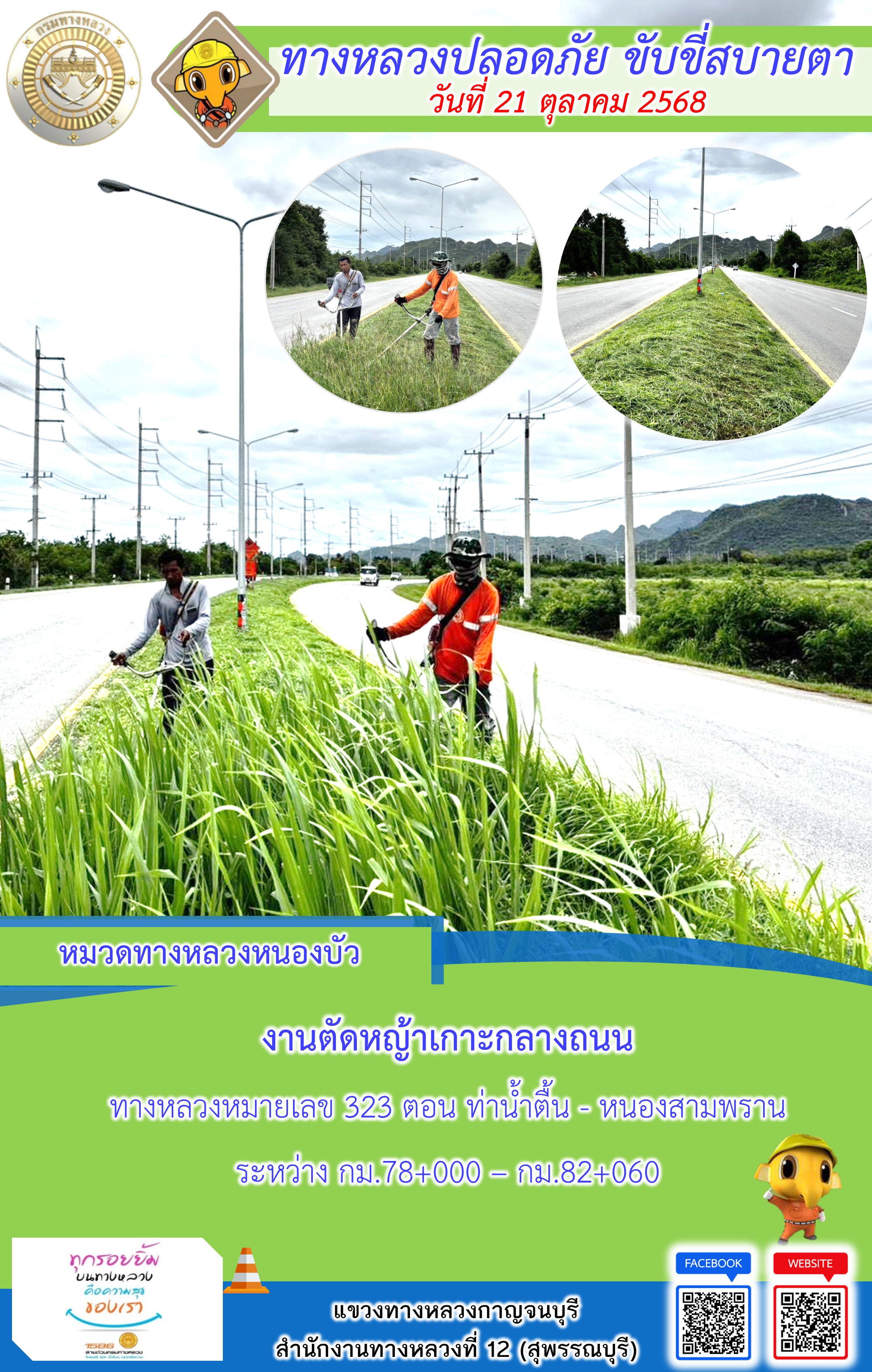 ข้อมูลภาพกิจกรรม : แขวงทางหลวงกาญจนบุรี โดยหมวดทางหลวงในสังกัด และงานอำนวยความปลอดภัยปฏิบัติงาน ประจำวันที่ 21 ต.ต. 68