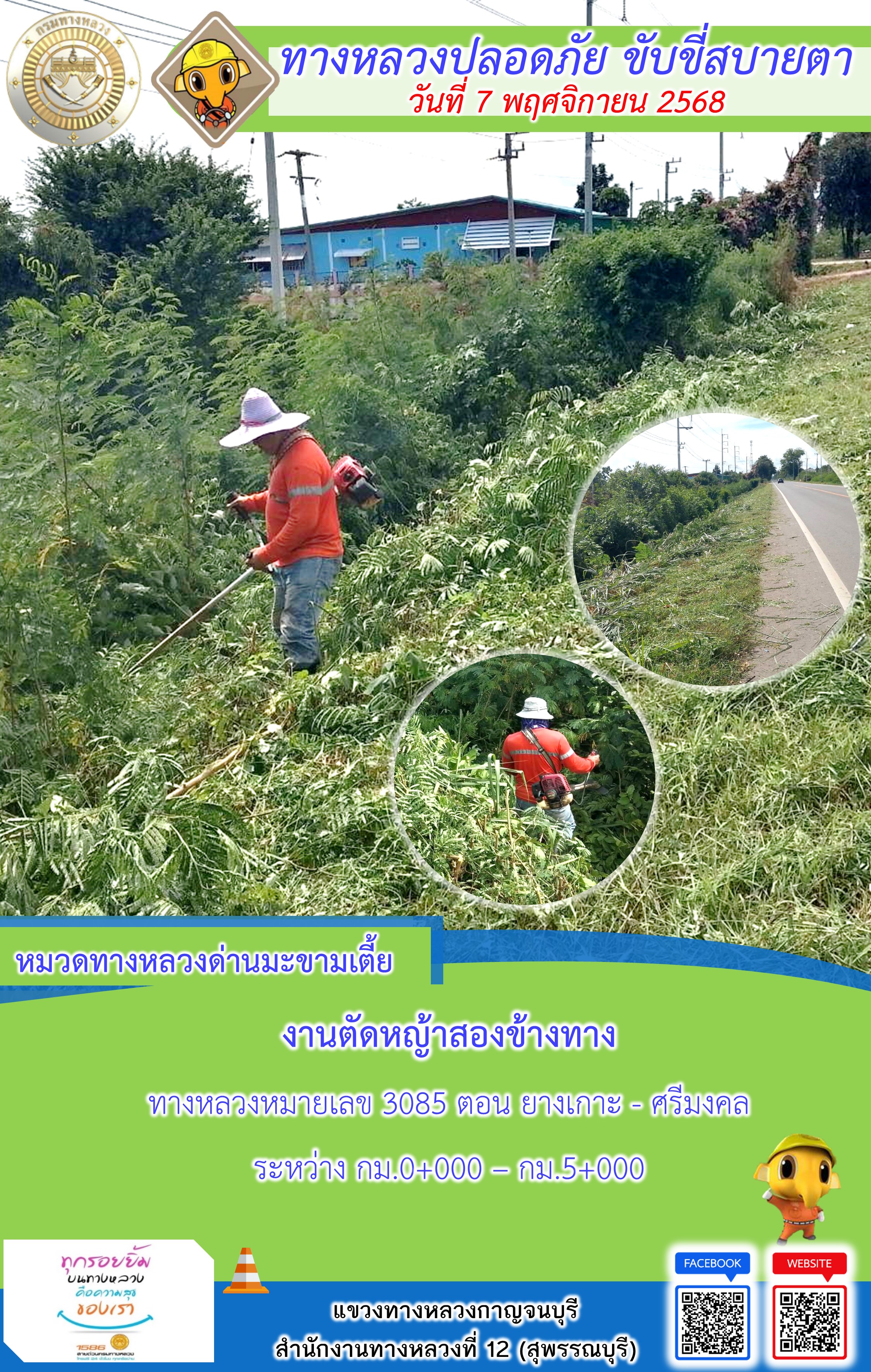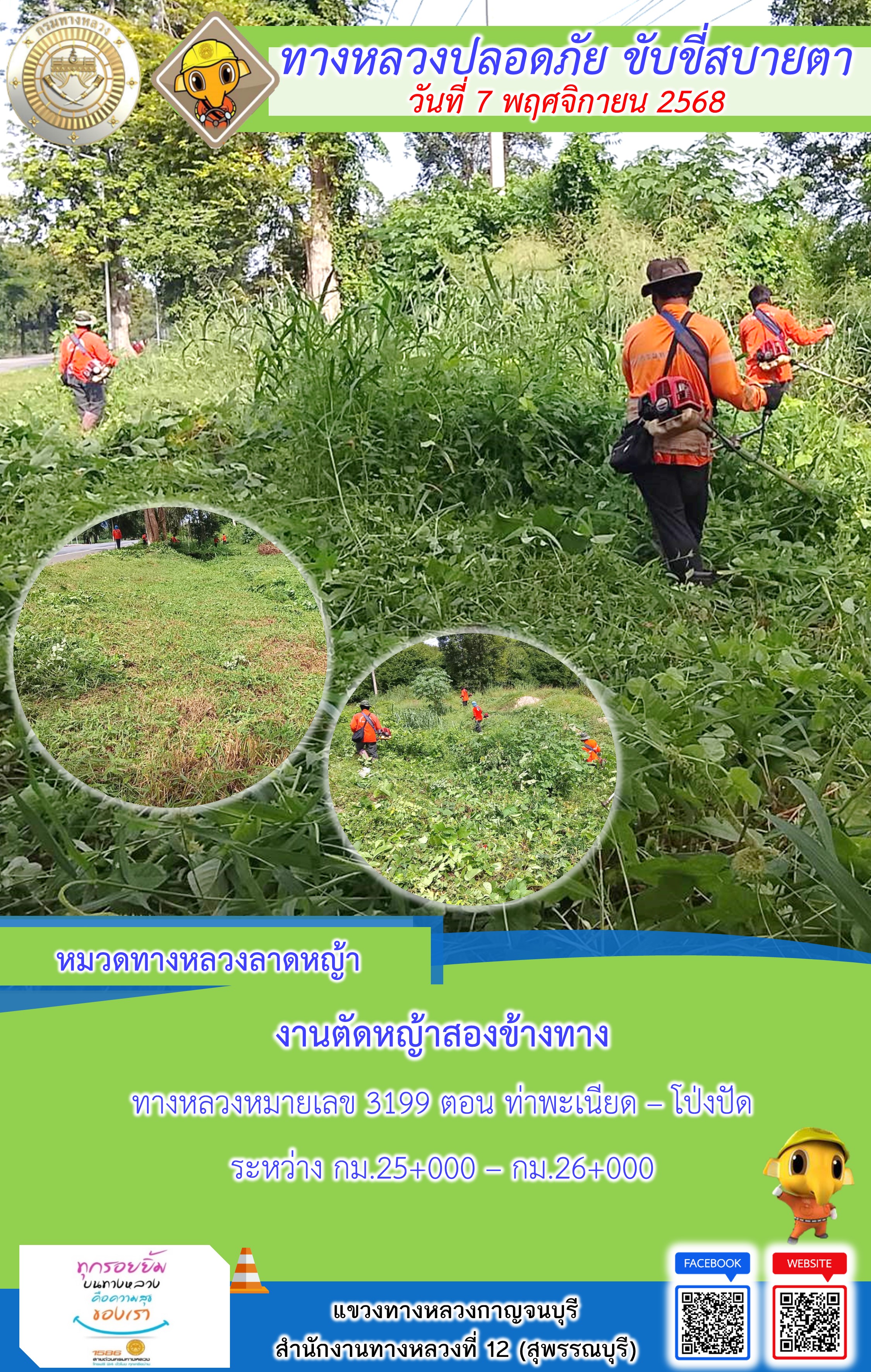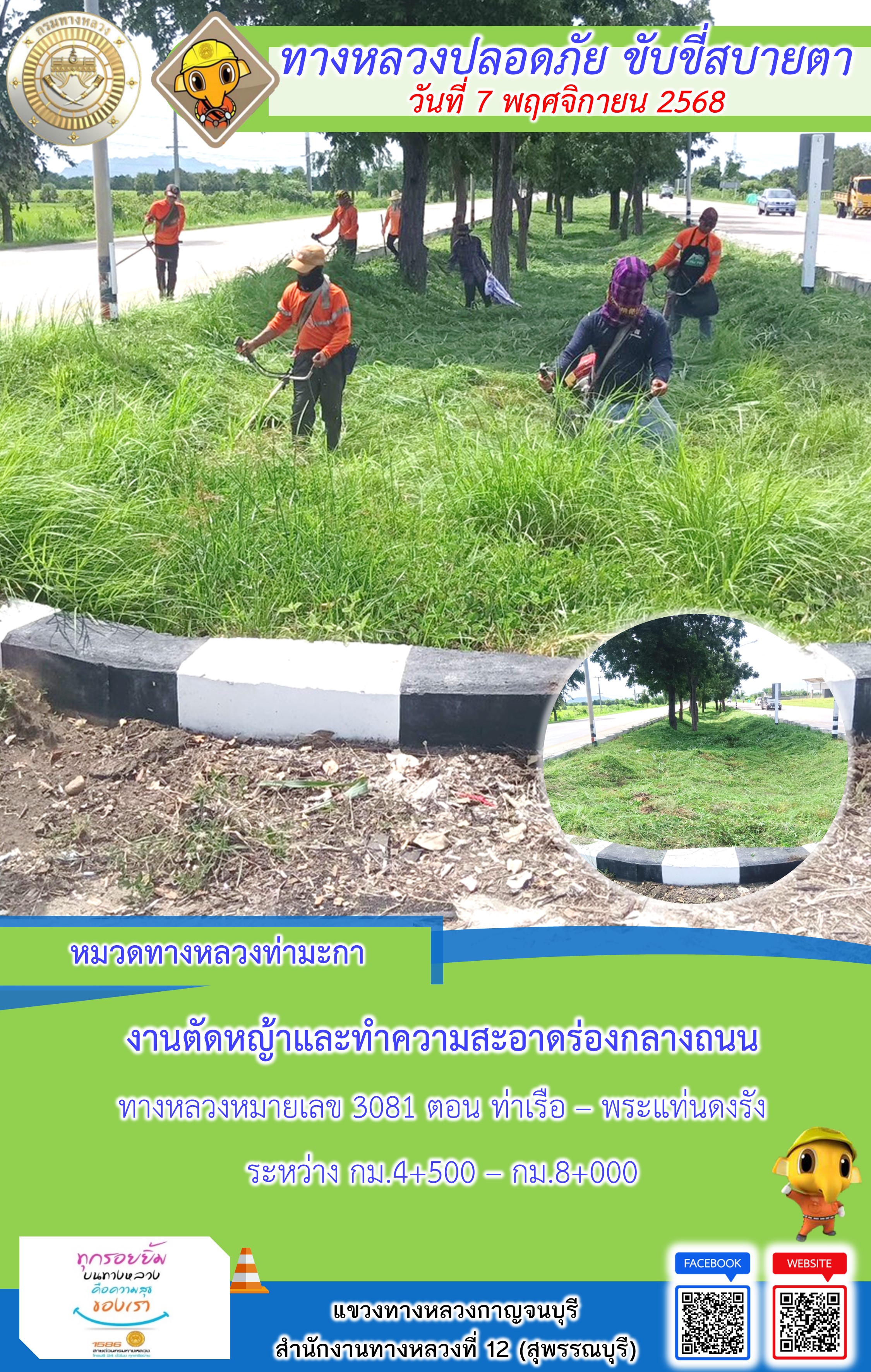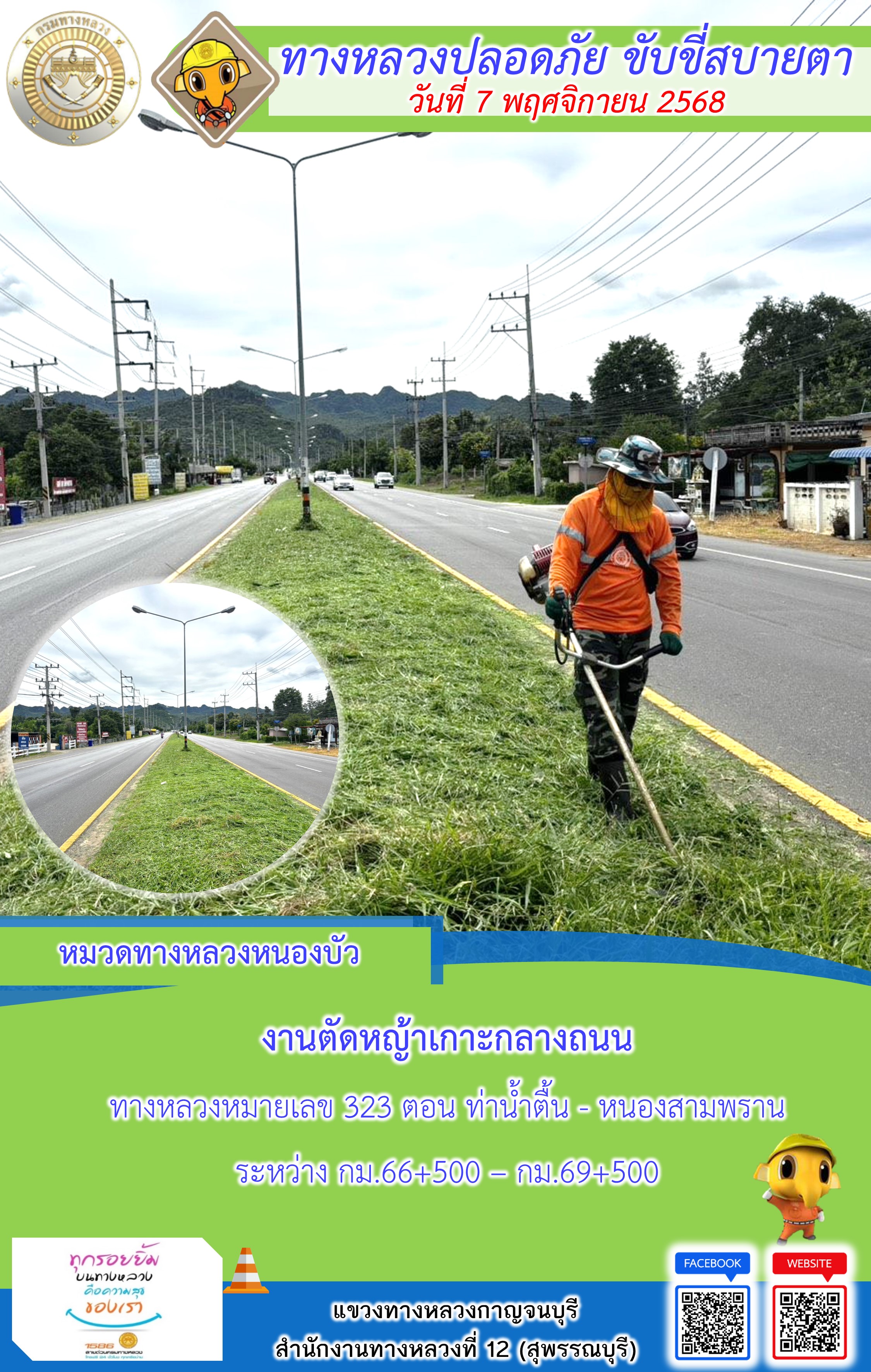 แขวงทางหลวงกาญจนบุรี โดยหมวดทางหลวงในสังกัด และงานอำนวยความปลอดภัยปฏิบัติงาน ประจำวันที่ 7 พ.ย. 68