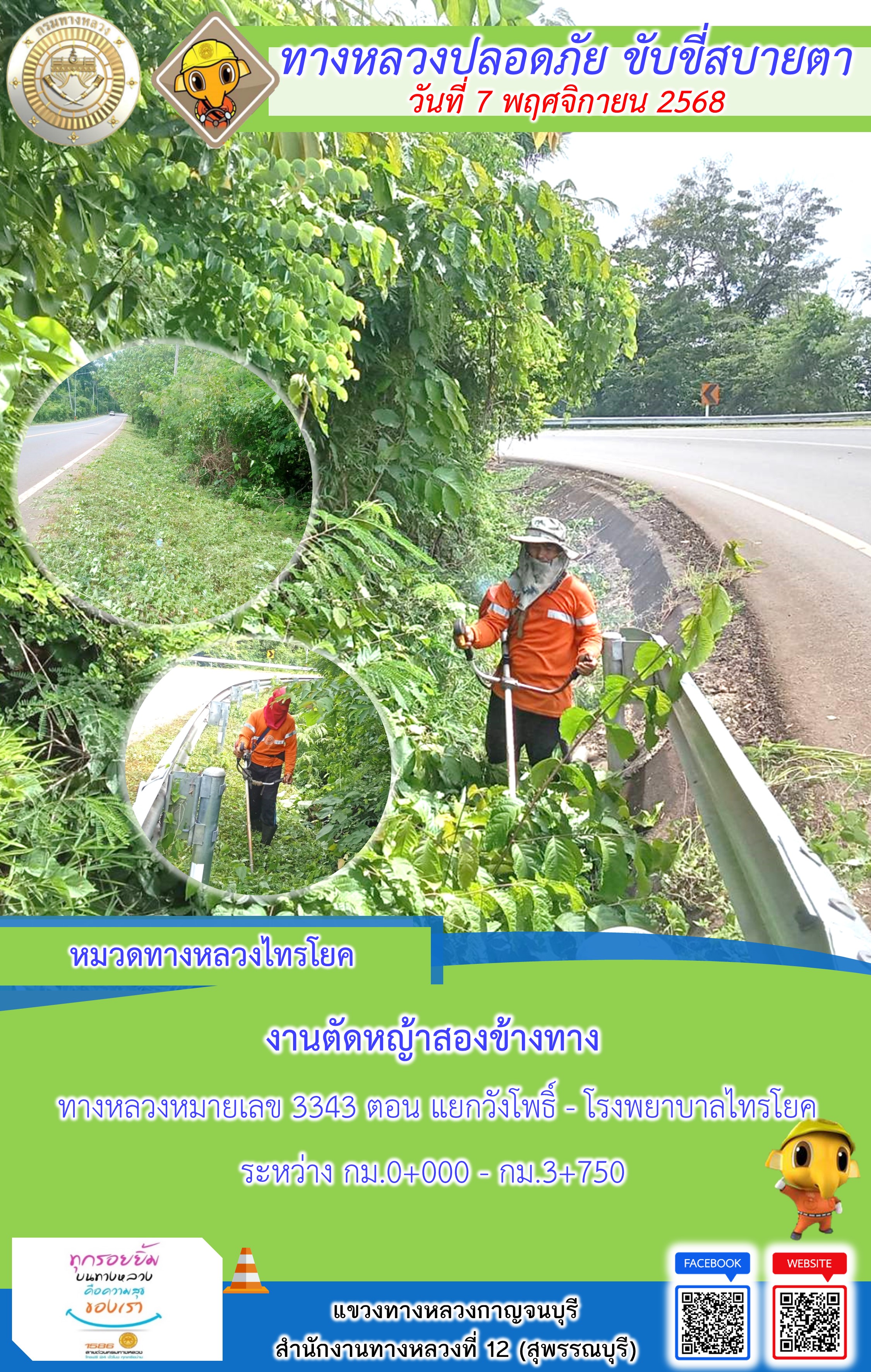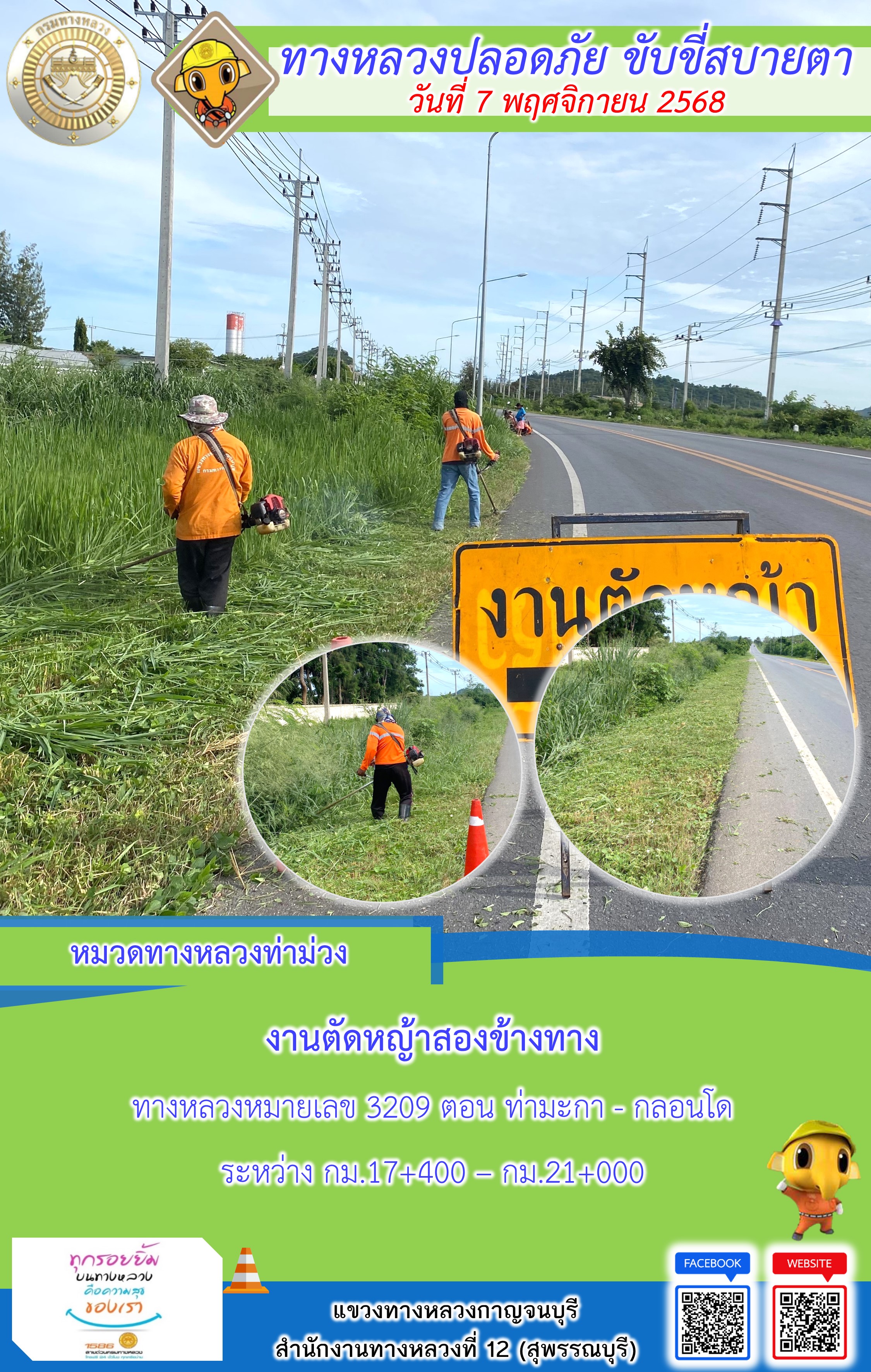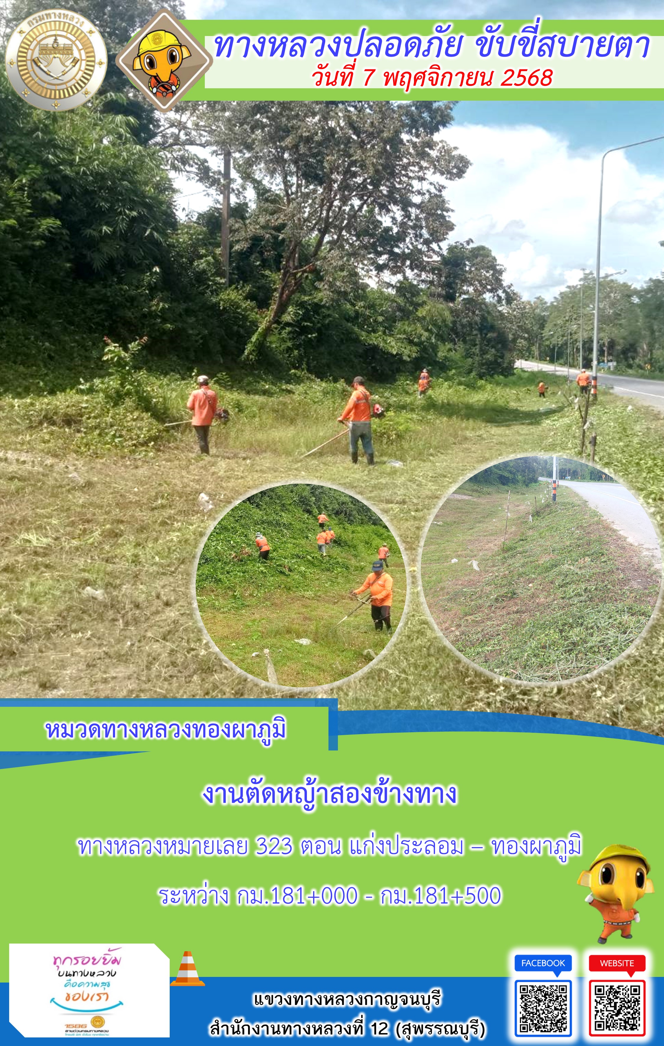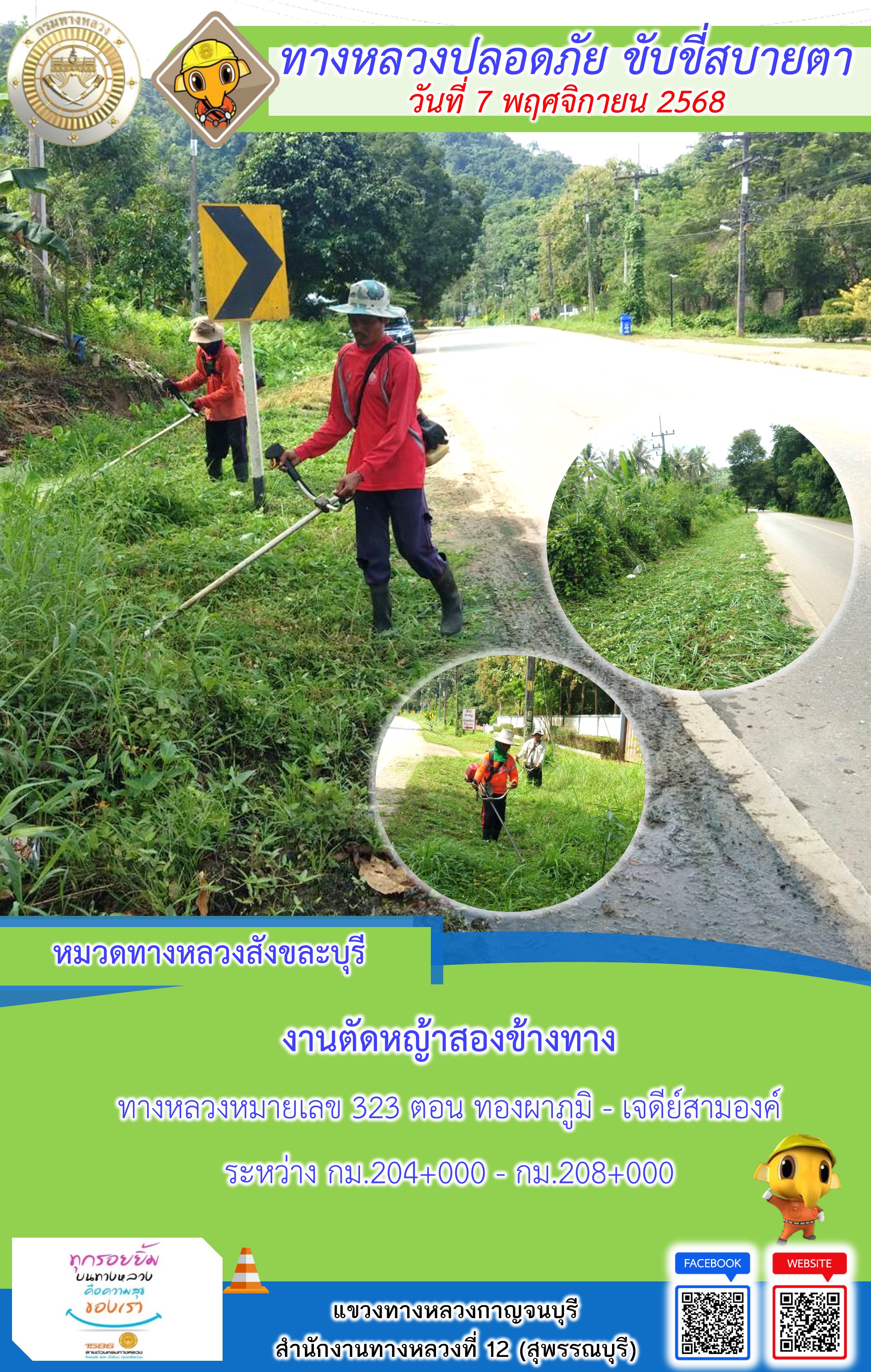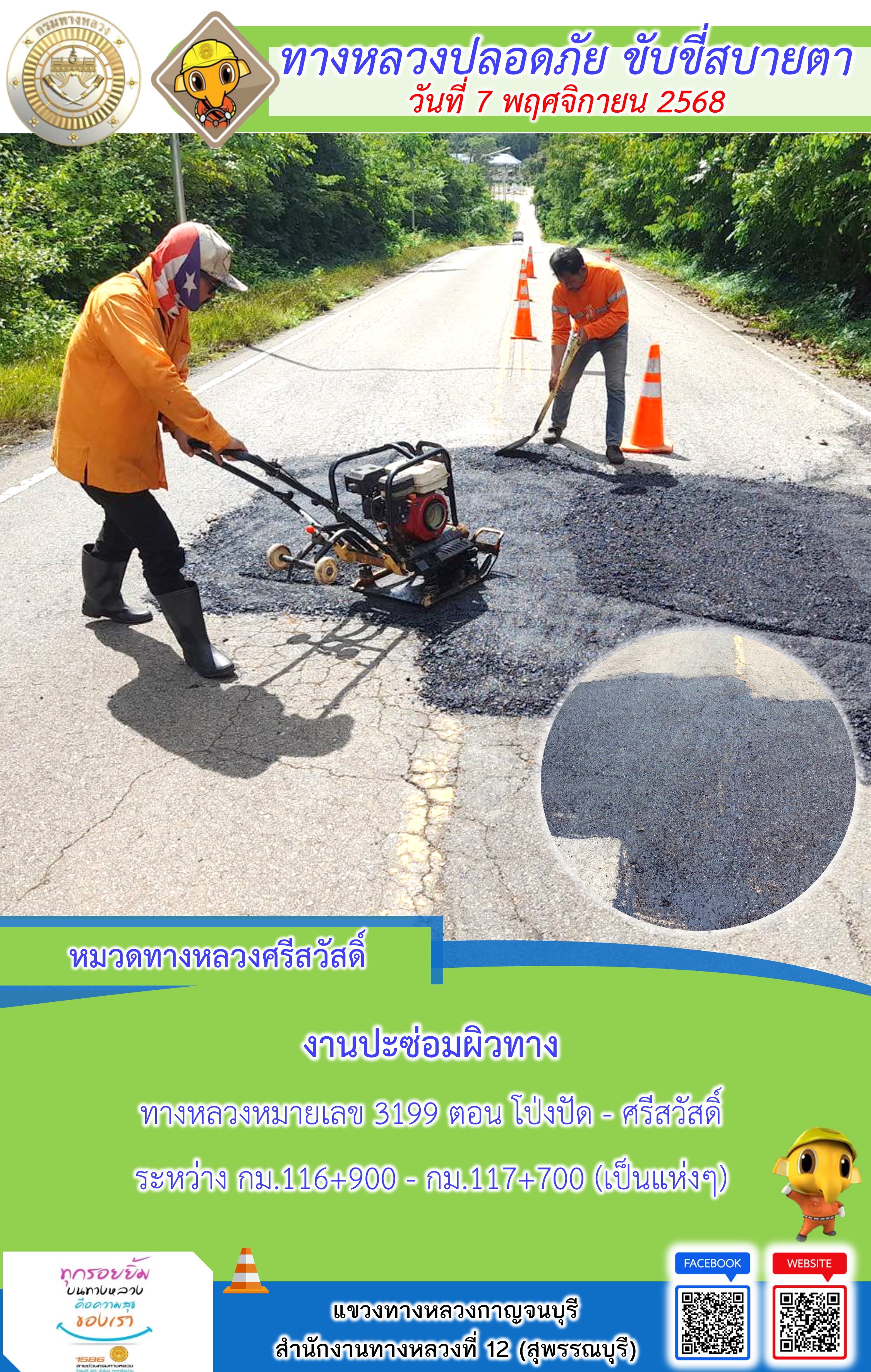 ข้อมูลภาพกิจกรรม : แขวงทางหลวงกาญจนบุรี โดยหมวดทางหลวงในสังกัด และงานอำนวยความปลอดภัยปฏิบัติงาน ประจำวันที่ 7 พ.ย. 68