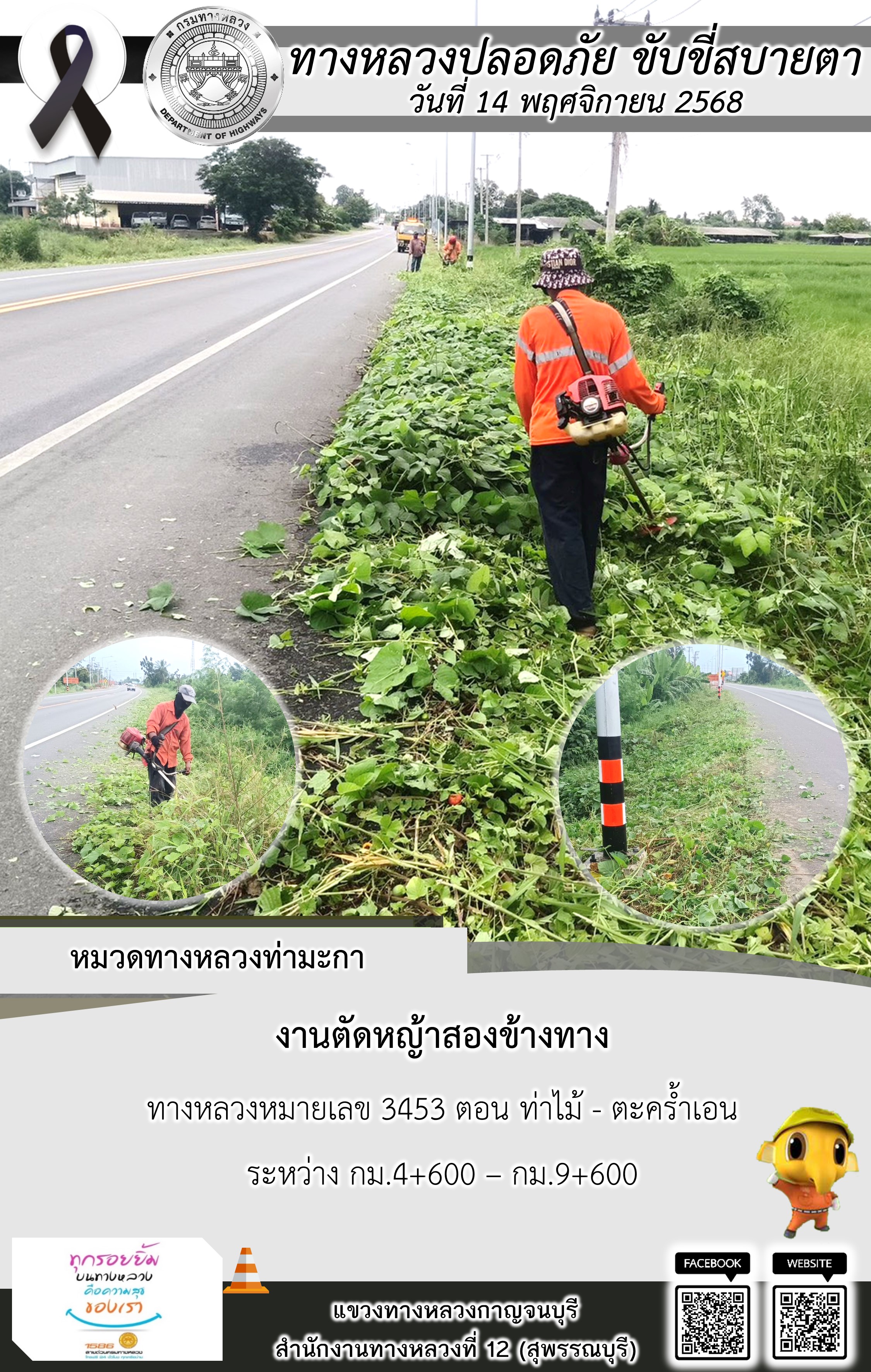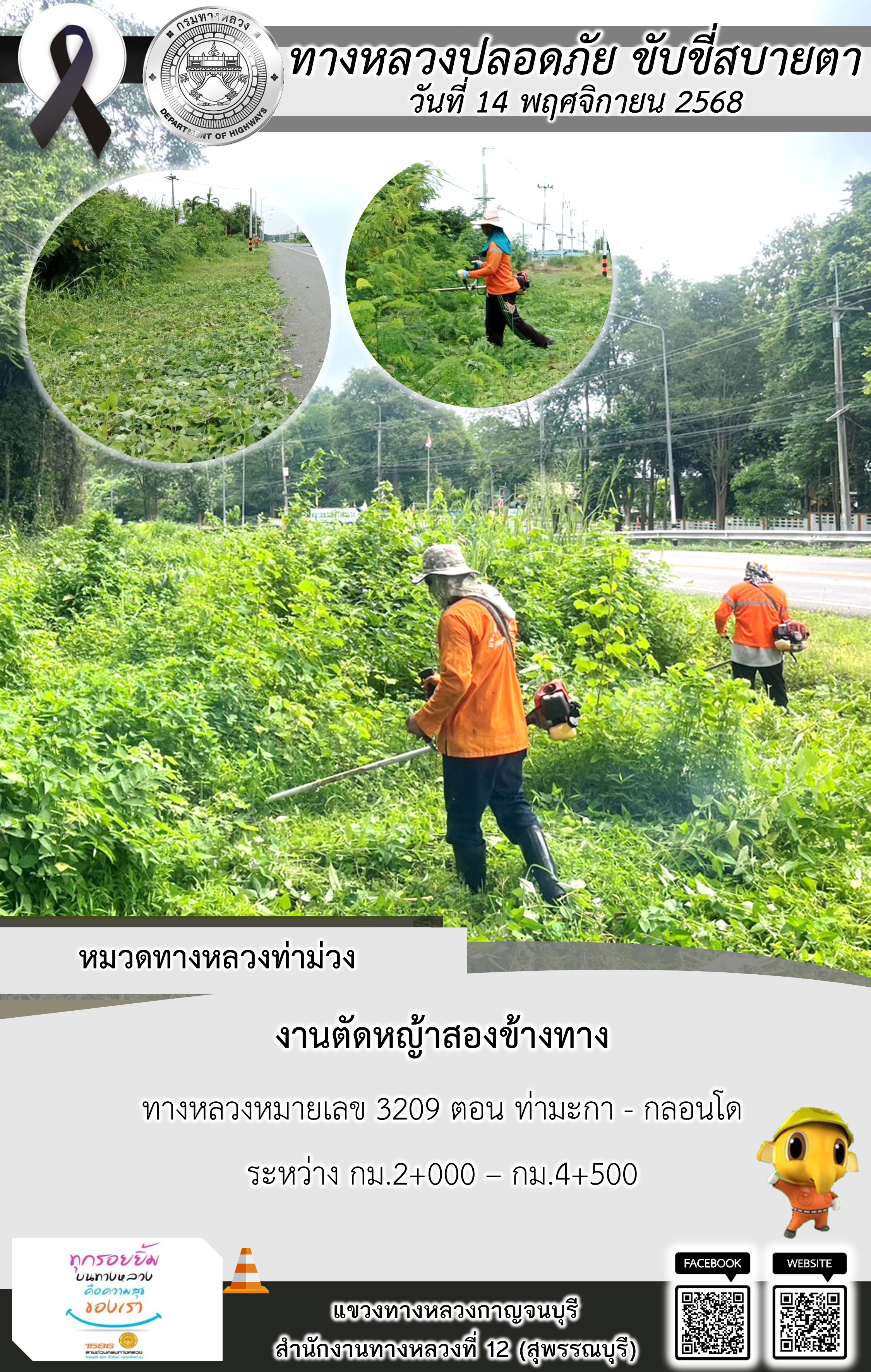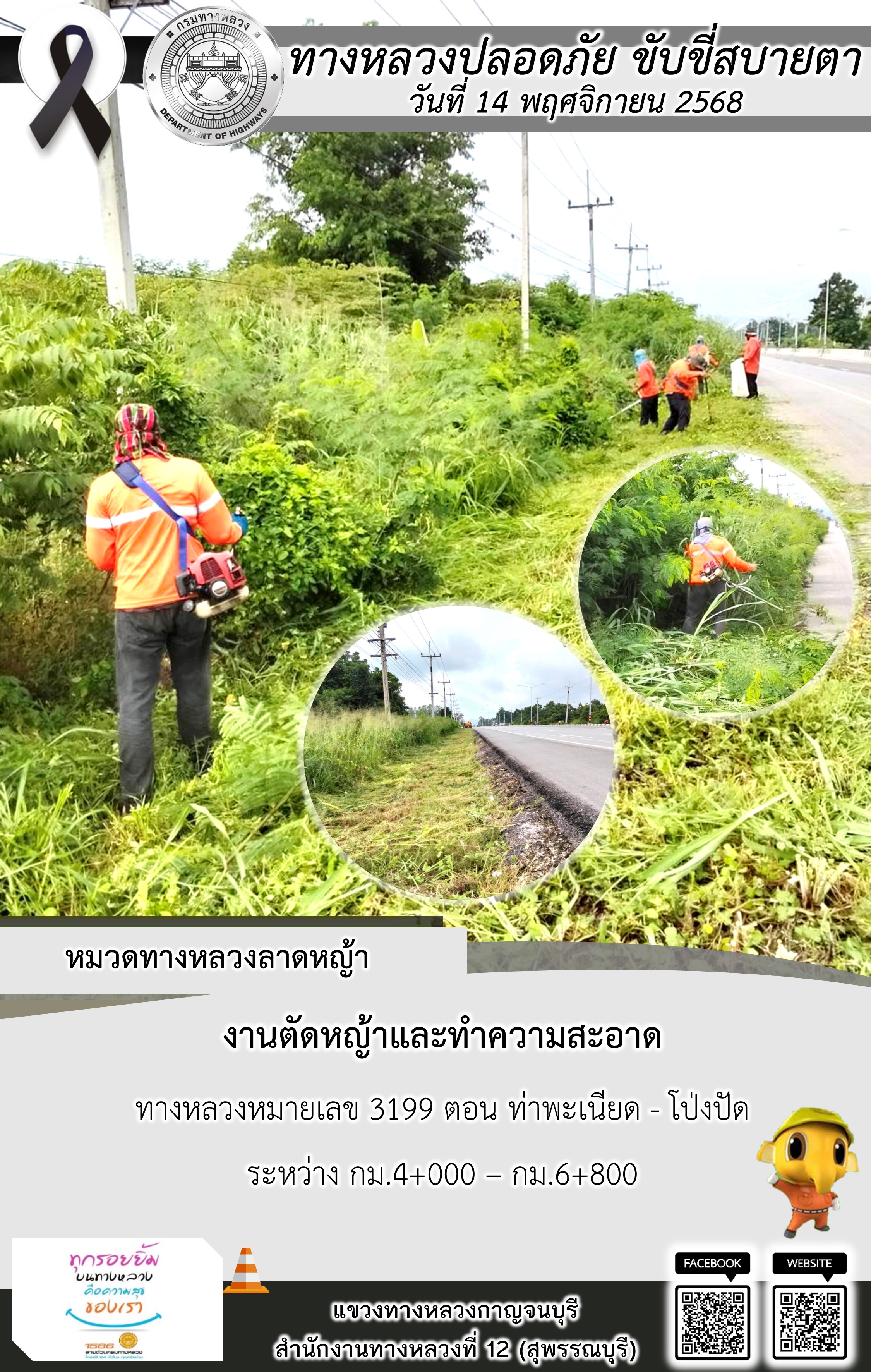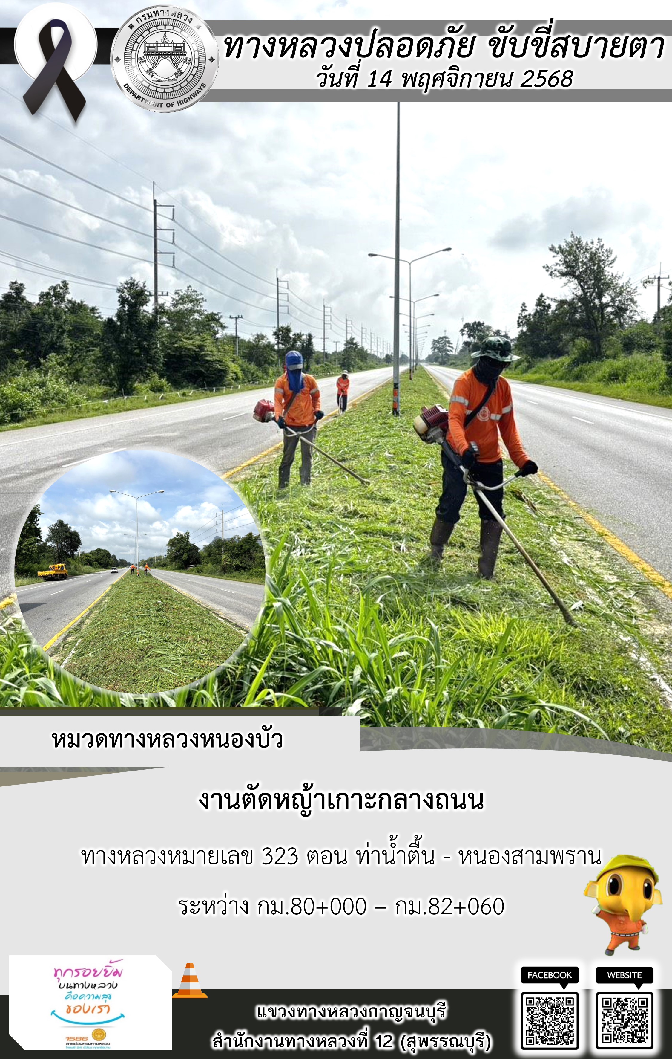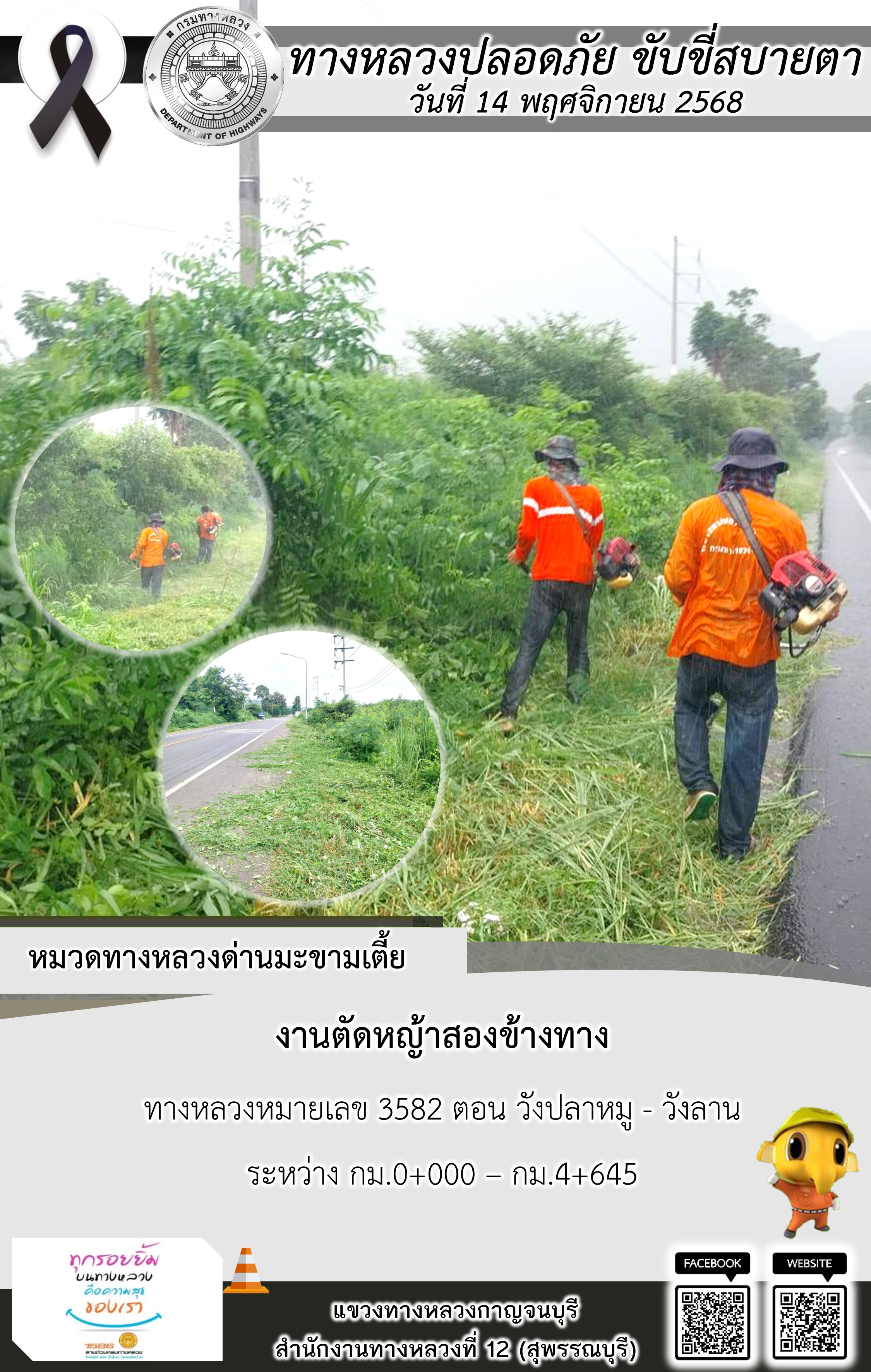 แขวงทางหลวงกาญจนบุรี โดยหมวดทางหลวงในสังกัด และงานอำนวยความปลอดภัยปฏิบัติงาน ประจำวันที่ 14 พ.ย. 68