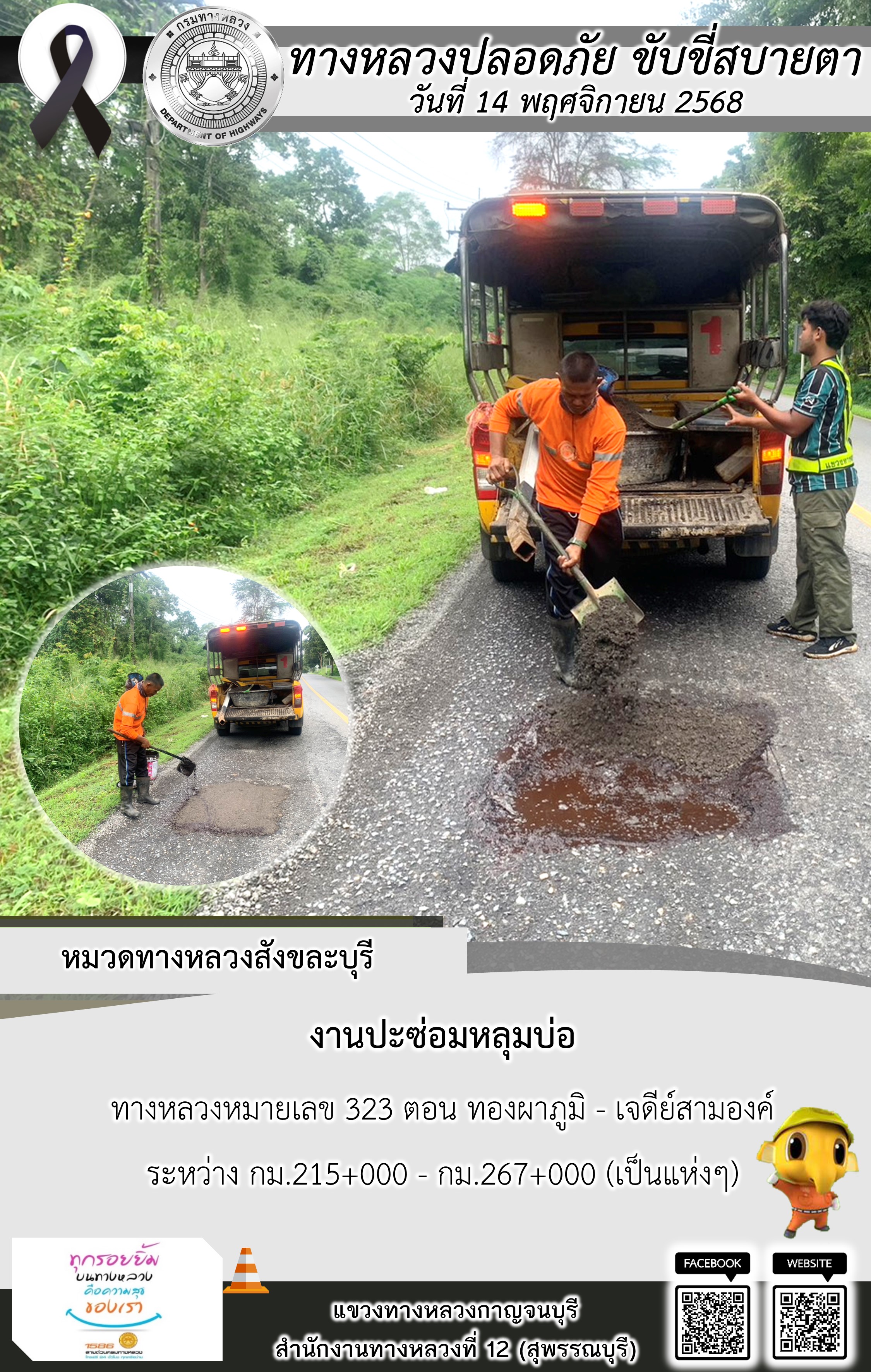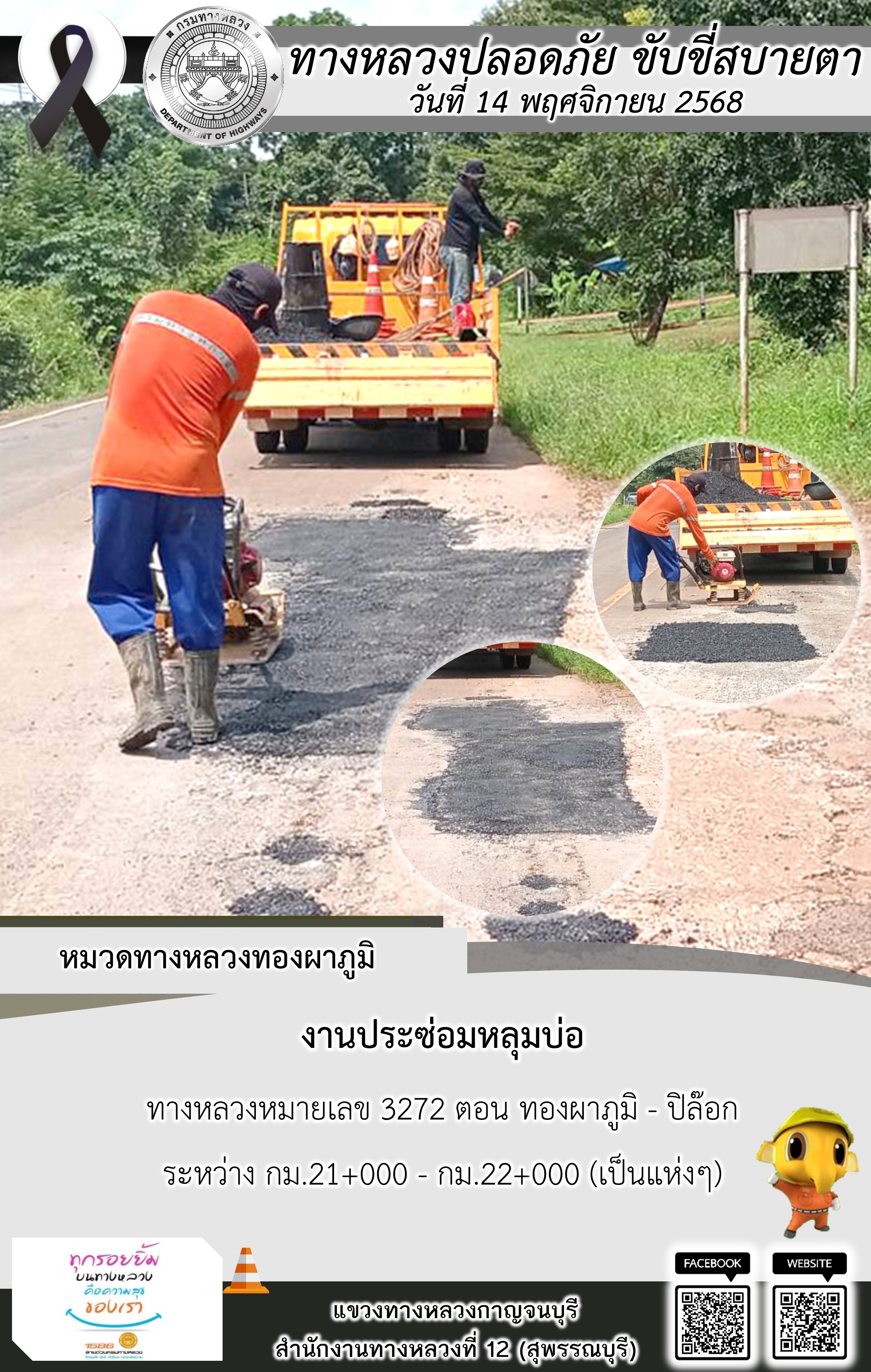 ข้อมูลภาพกิจกรรม : แขวงทางหลวงกาญจนบุรี โดยหมวดทางหลวงในสังกัด และงานอำนวยความปลอดภัยปฏิบัติงาน ประจำวันที่ 14 พ.ย. 68