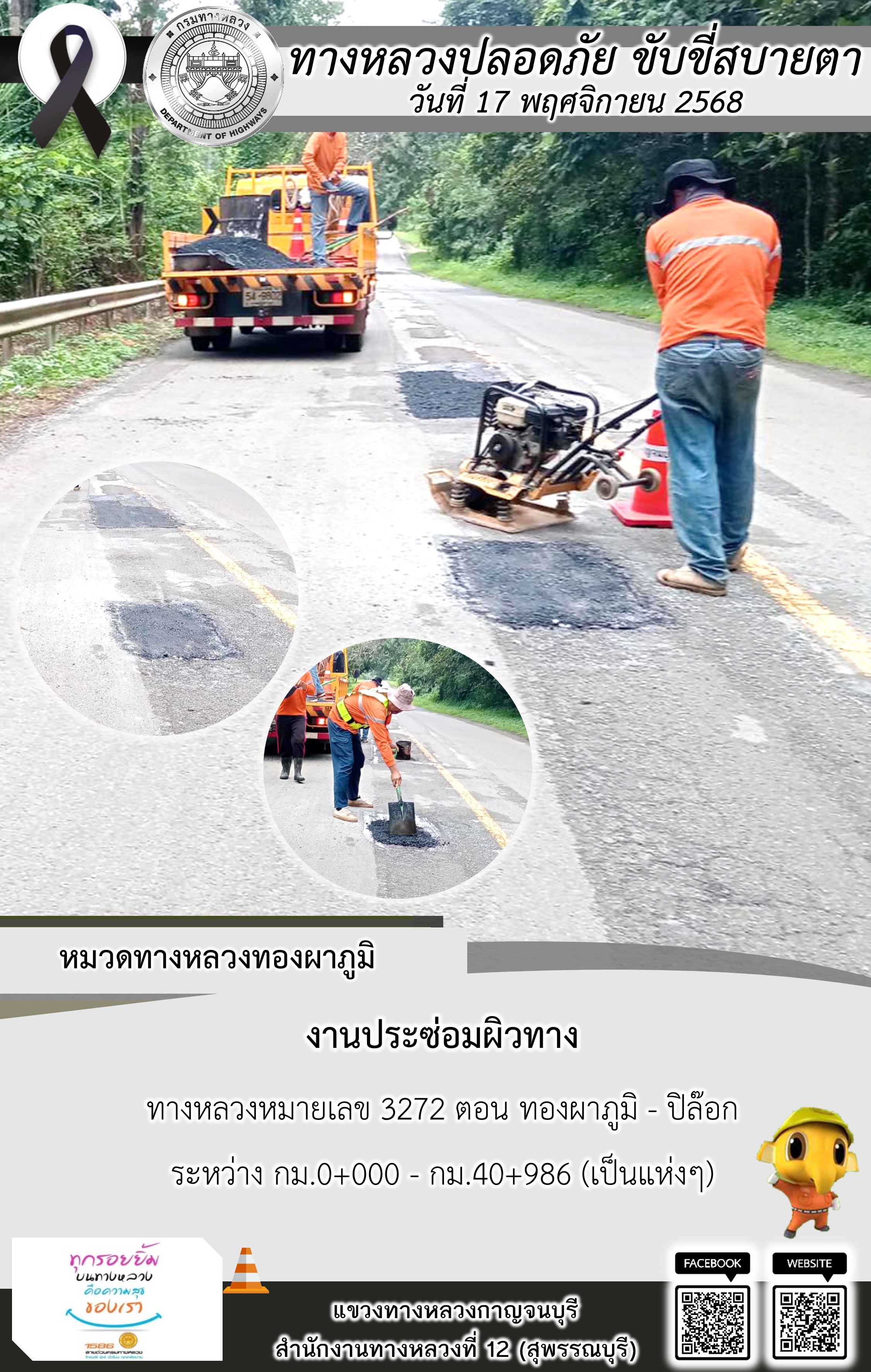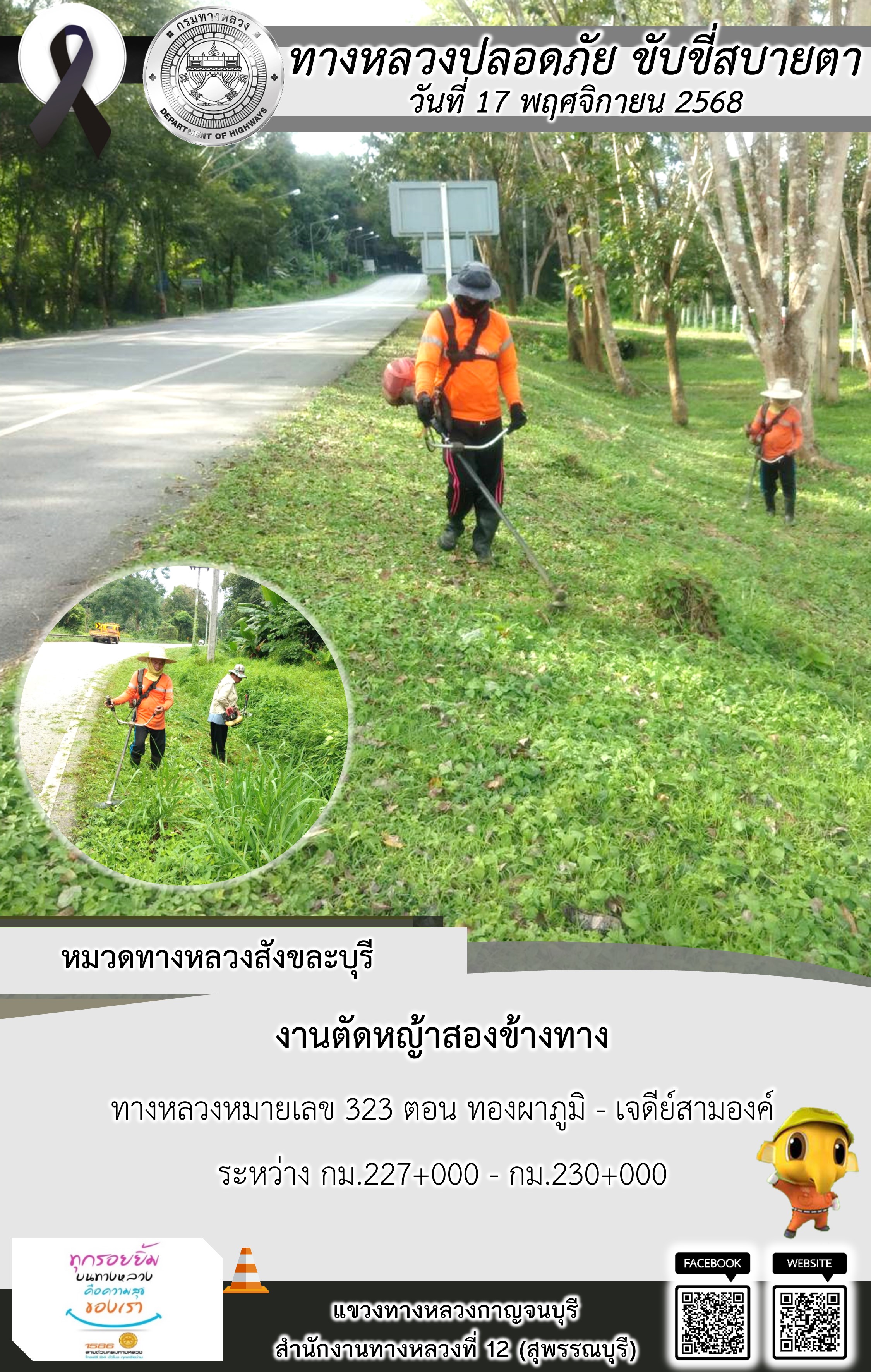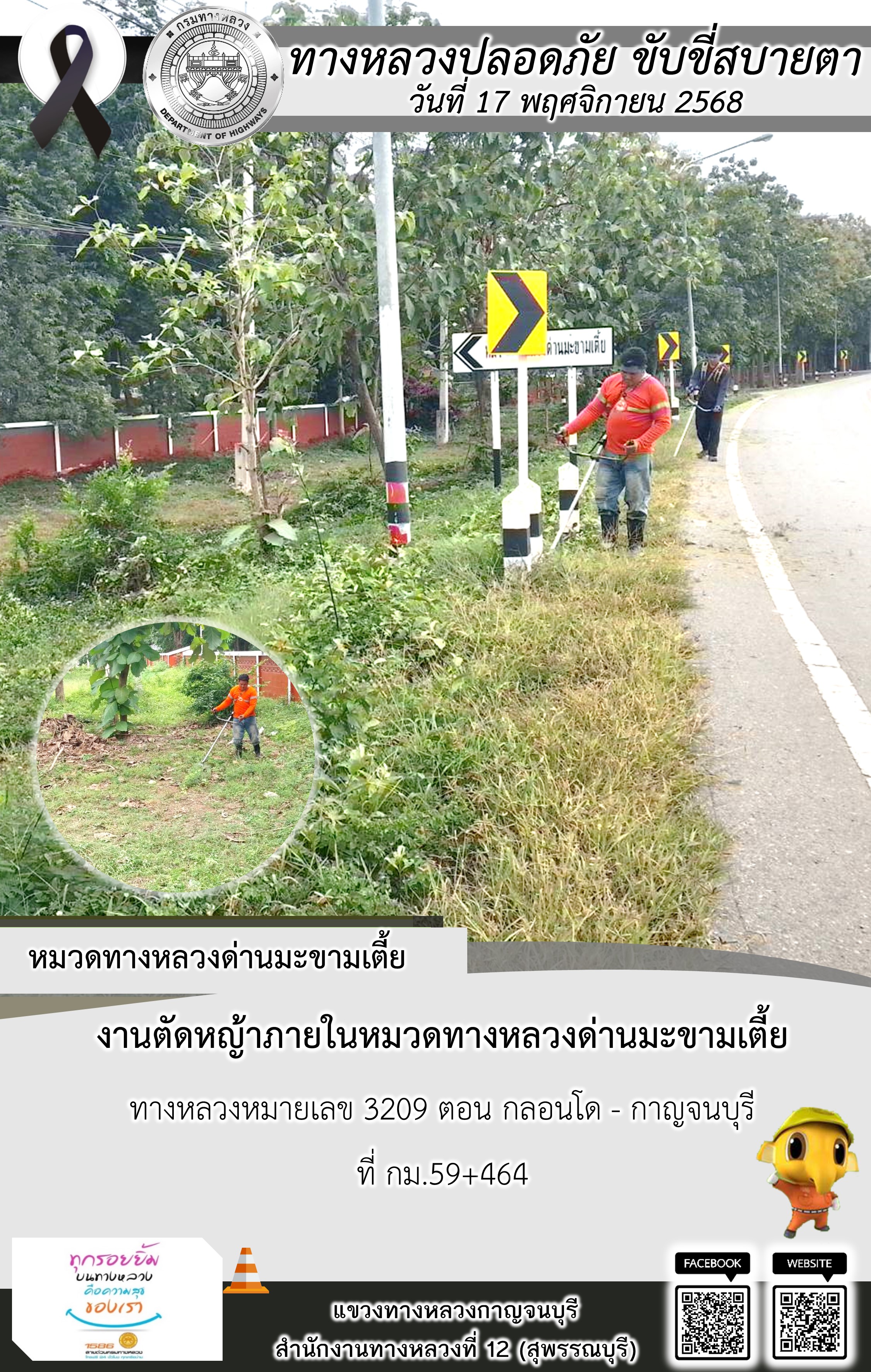 ข้อมูลภาพกิจกรรม : แขวงทางหลวงกาญจนบุรี โดยหมวดทางหลวงในสังกัด และงานอำนวยความปลอดภัยปฏิบัติงาน ประจำวันที่ 17 พ.ย. 68