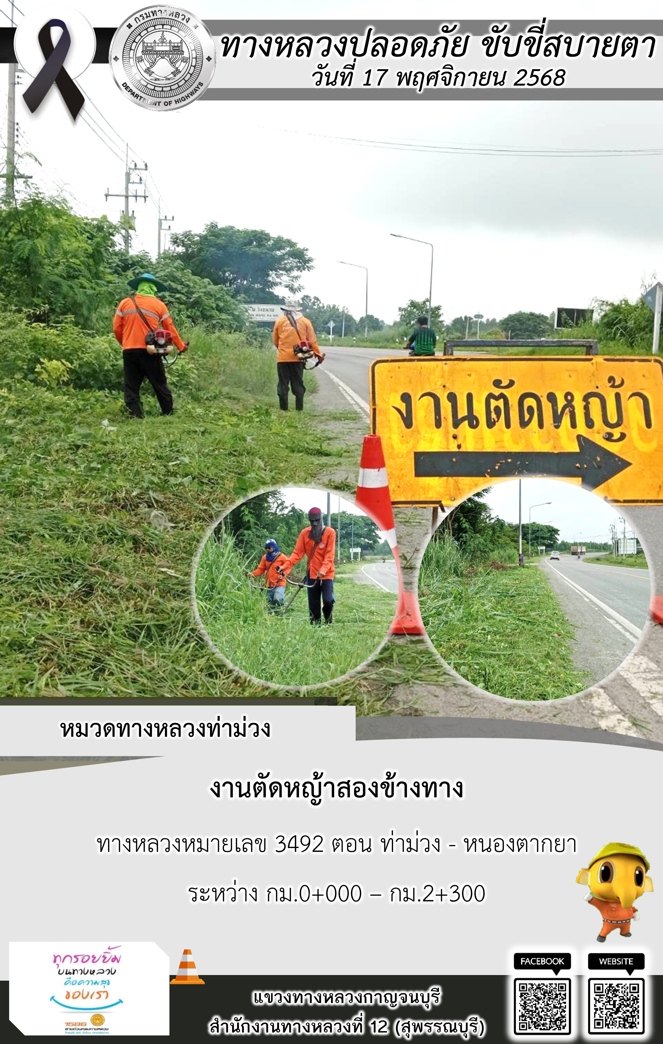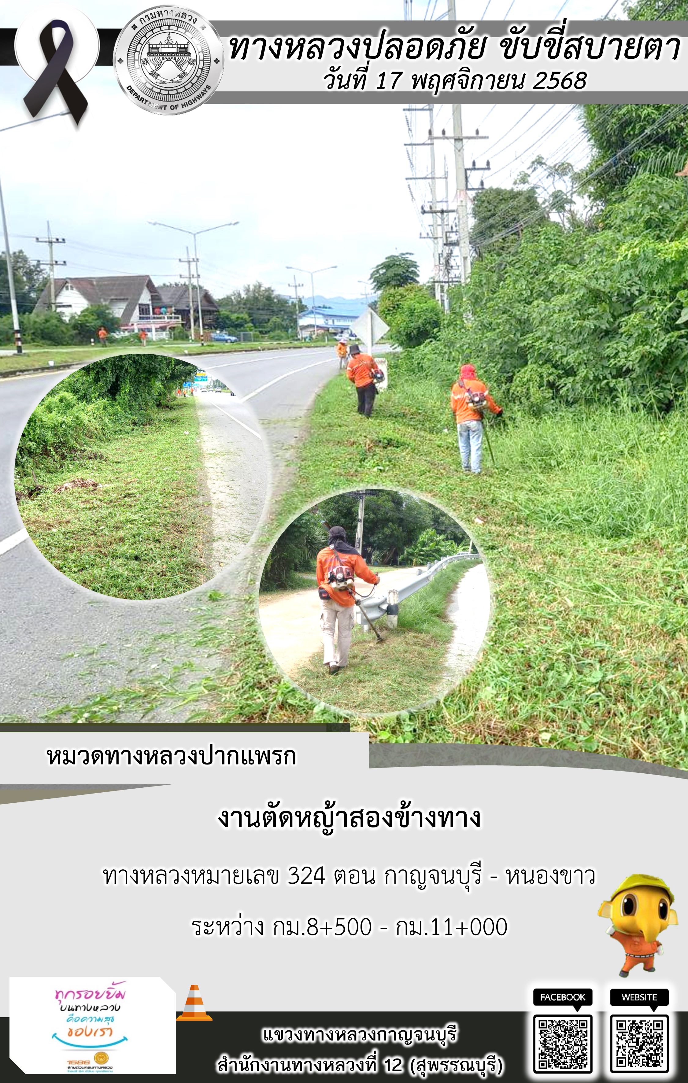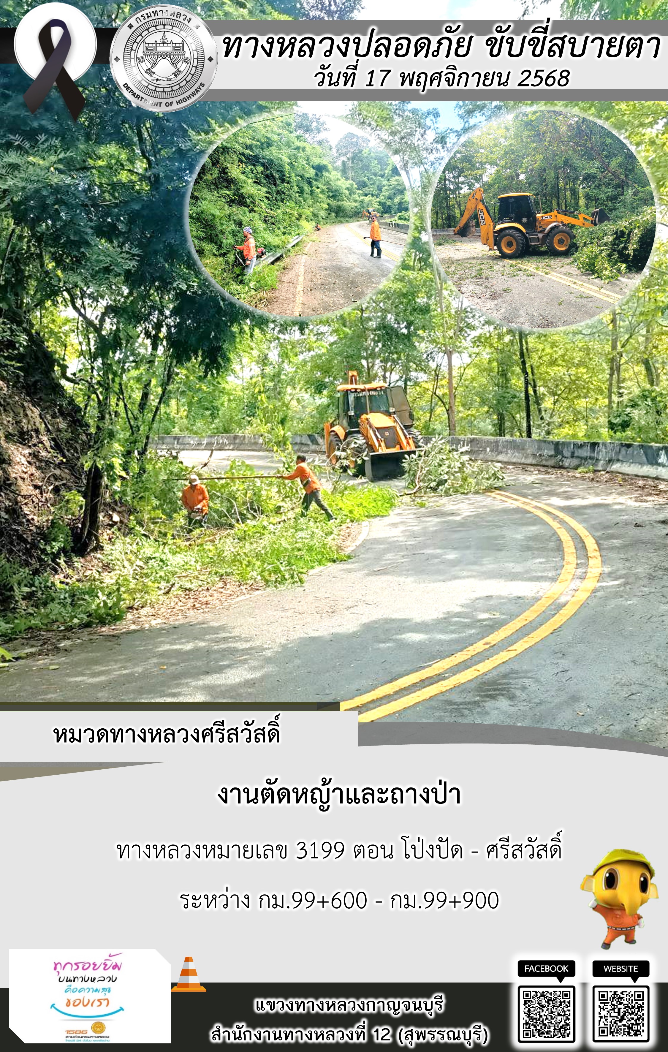 แขวงทางหลวงกาญจนบุรี โดยหมวดทางหลวงในสังกัด และงานอำนวยความปลอดภัยปฏิบัติงาน ประจำวันที่ 17 พ.ย. 68