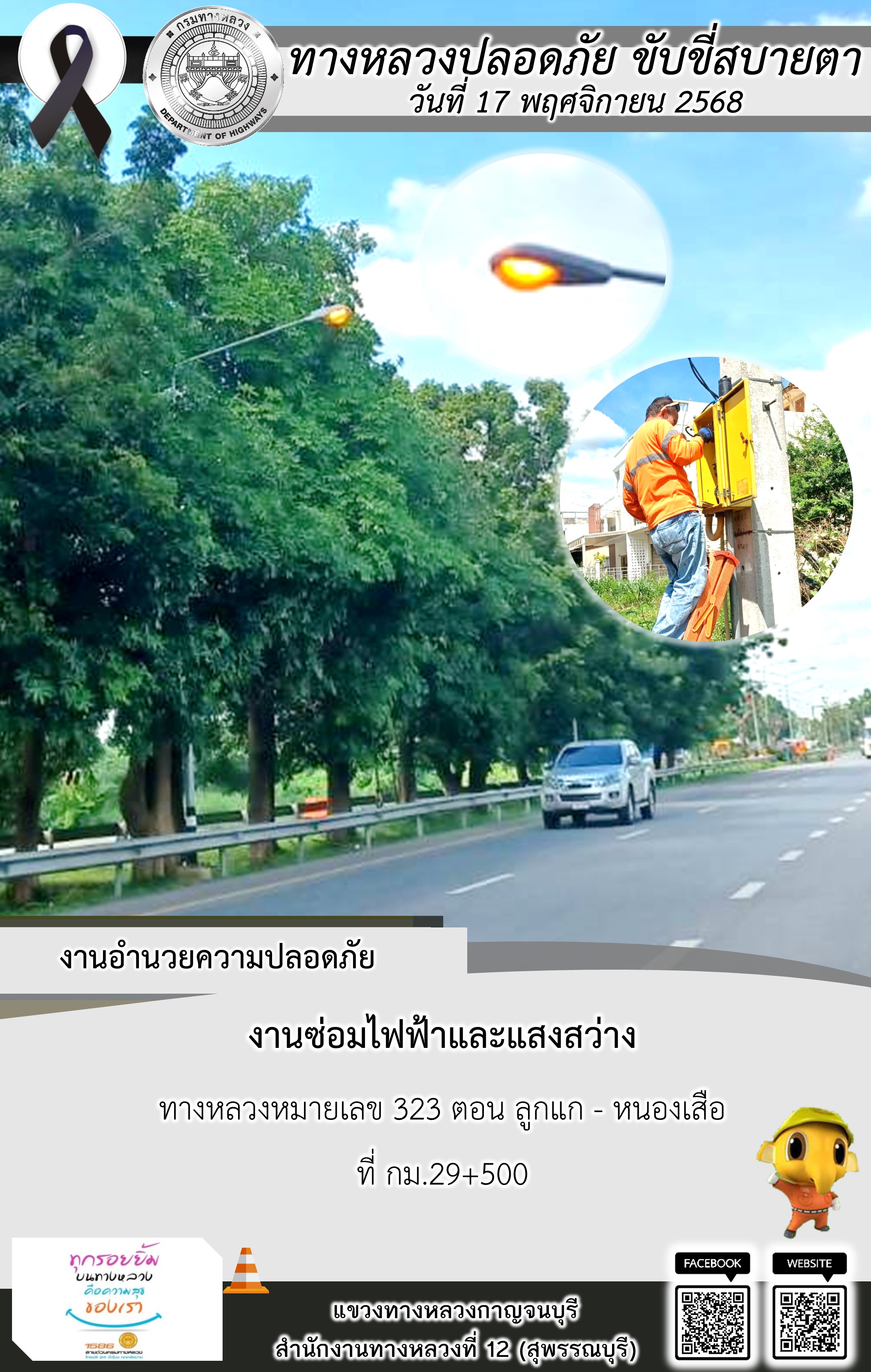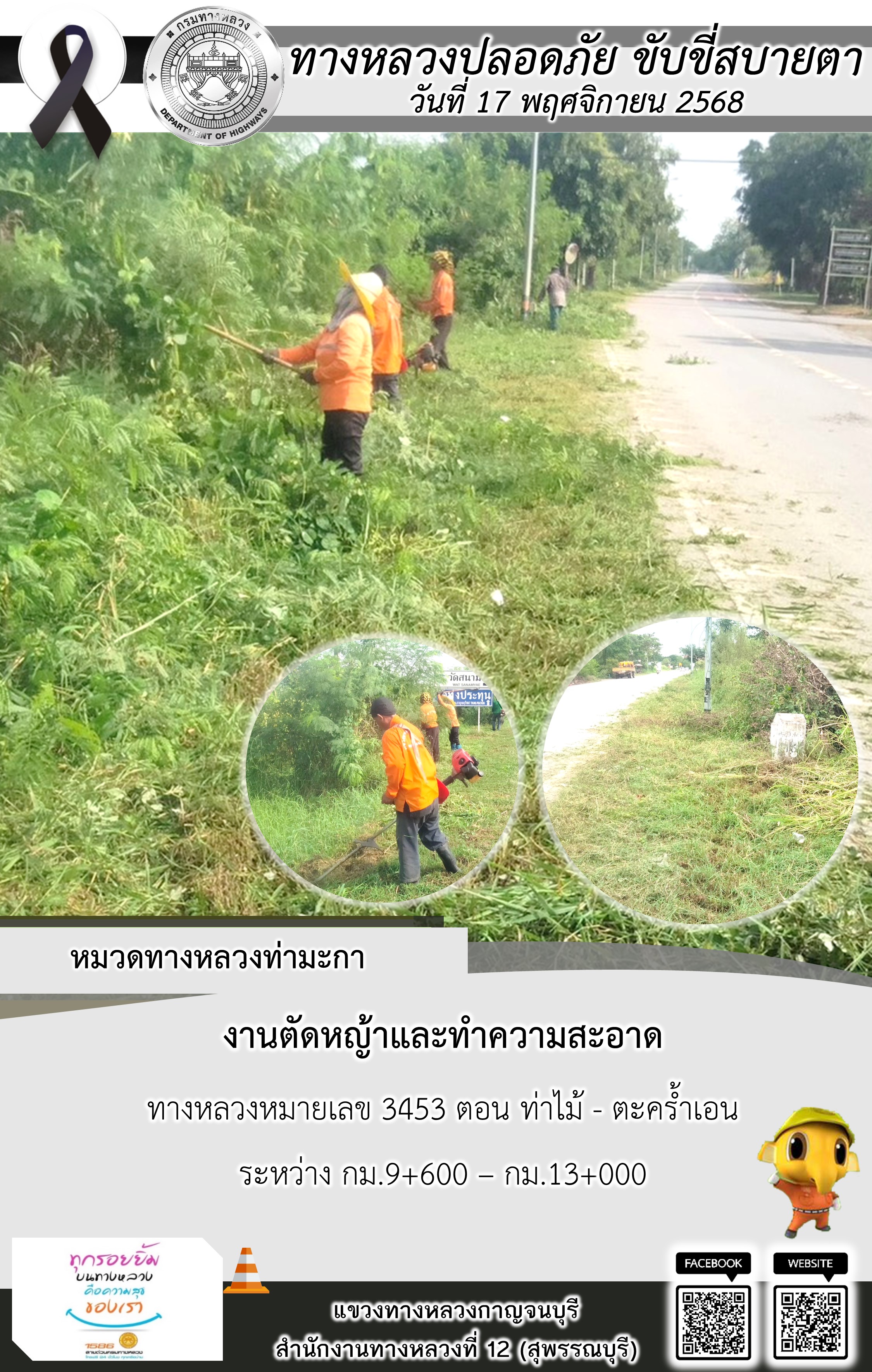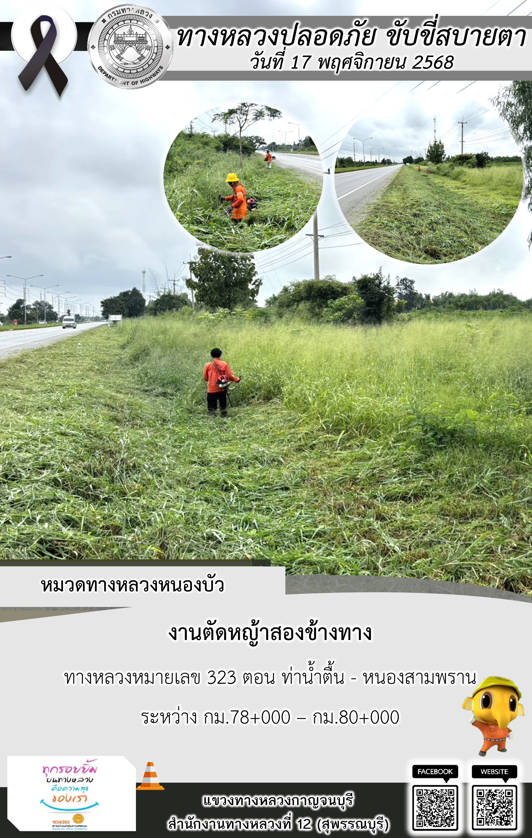 แขวงทางหลวงกาญจนบุรี โดยหมวดทางหลวงในสังกัด และงานอำนวยความปลอดภัยปฏิบัติงาน ประจำวันที่ 17 พ.ย. 68