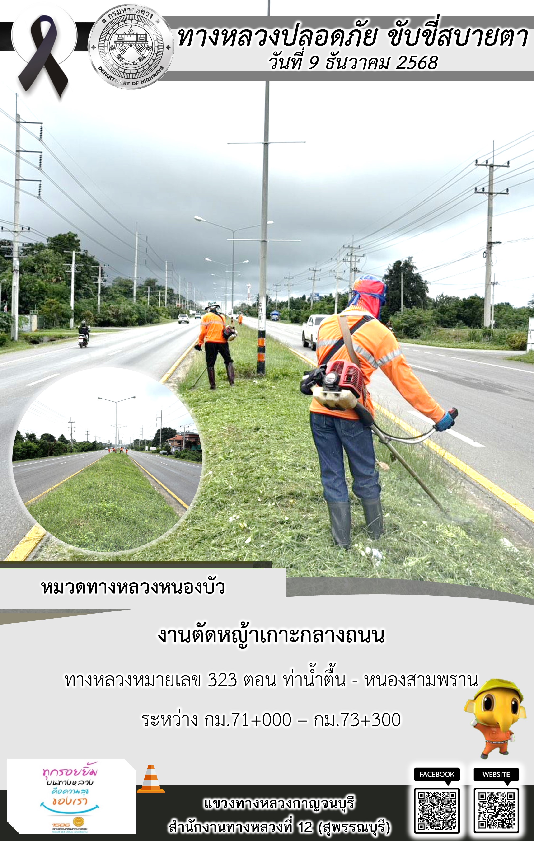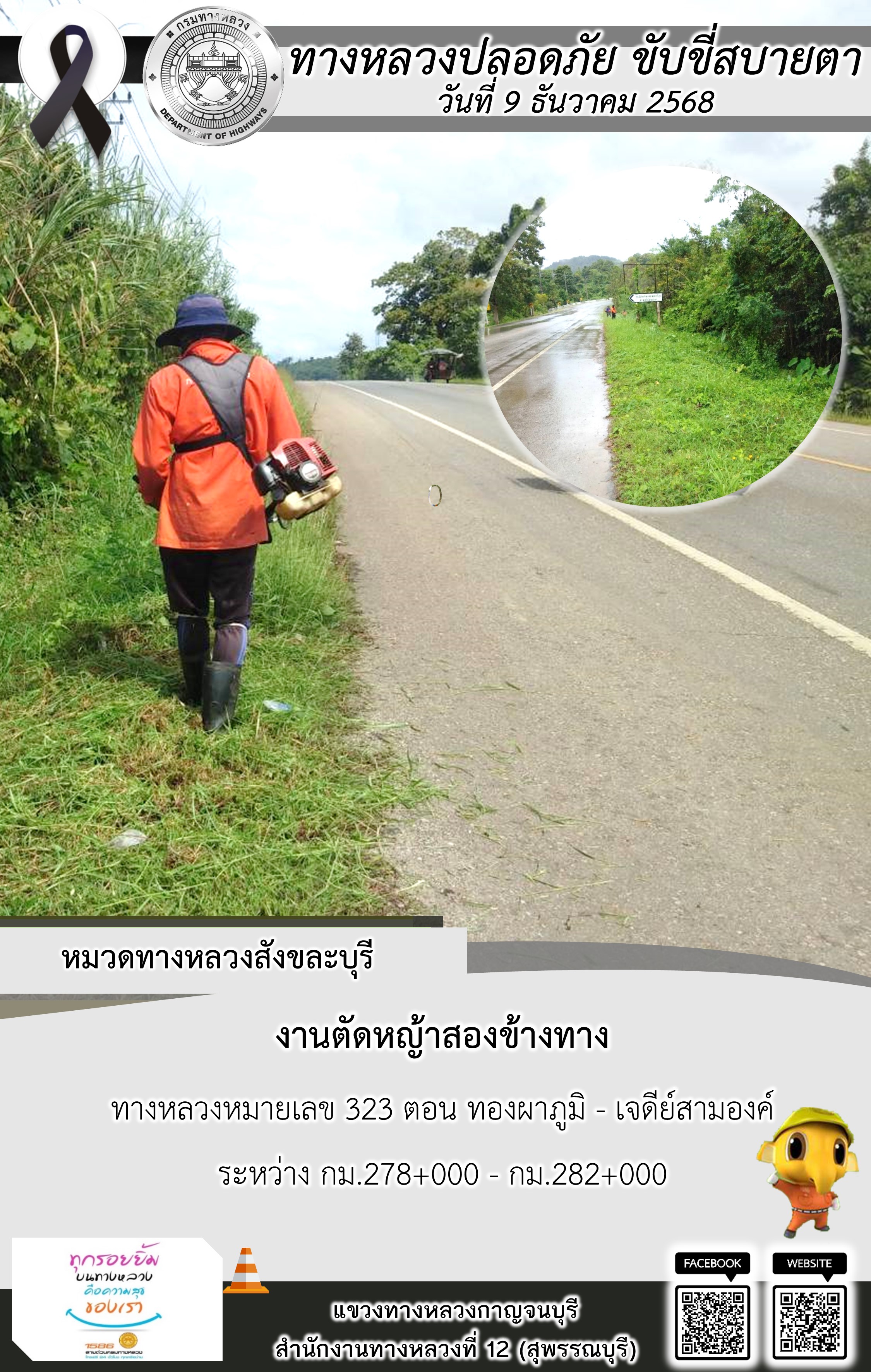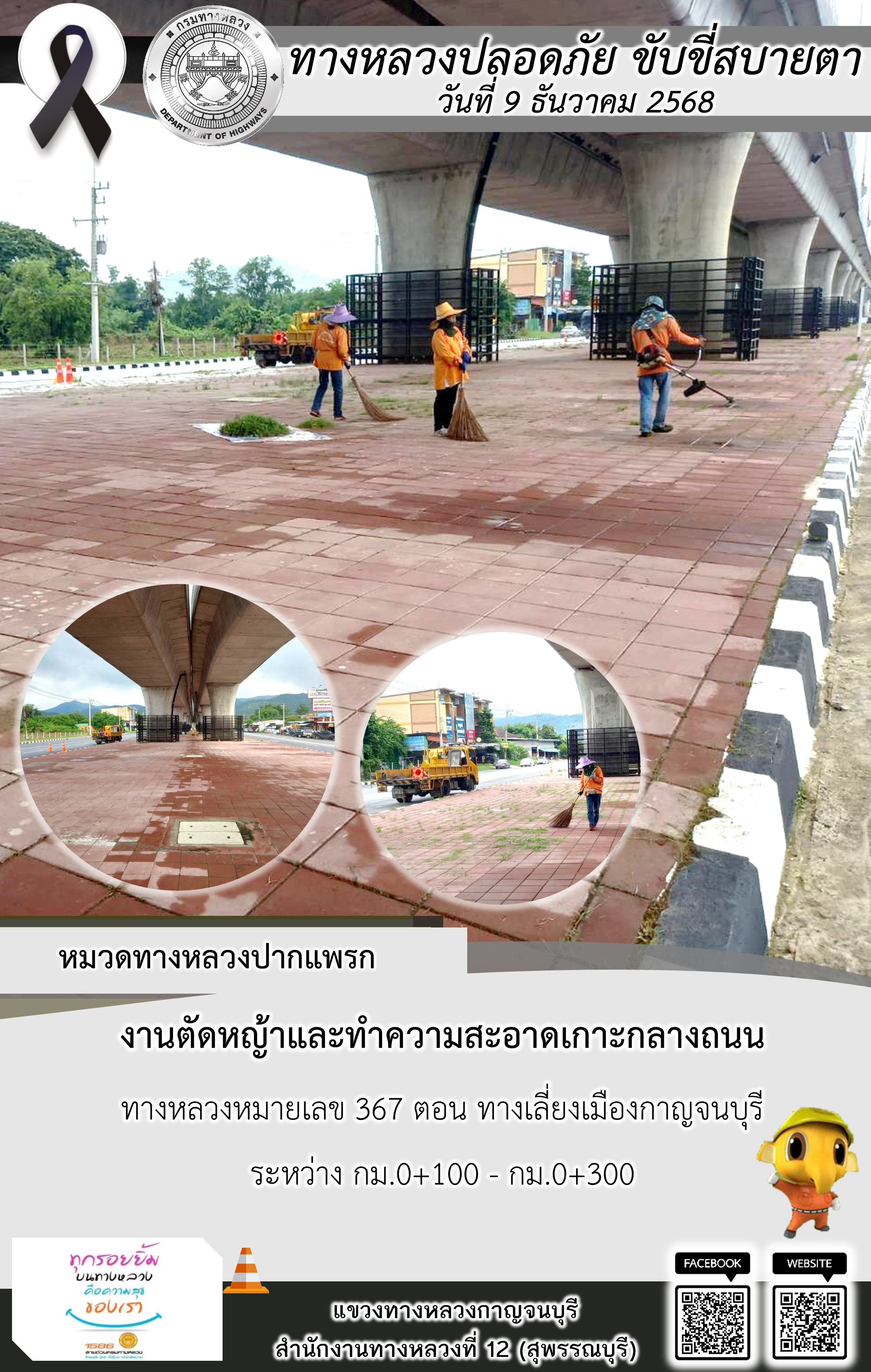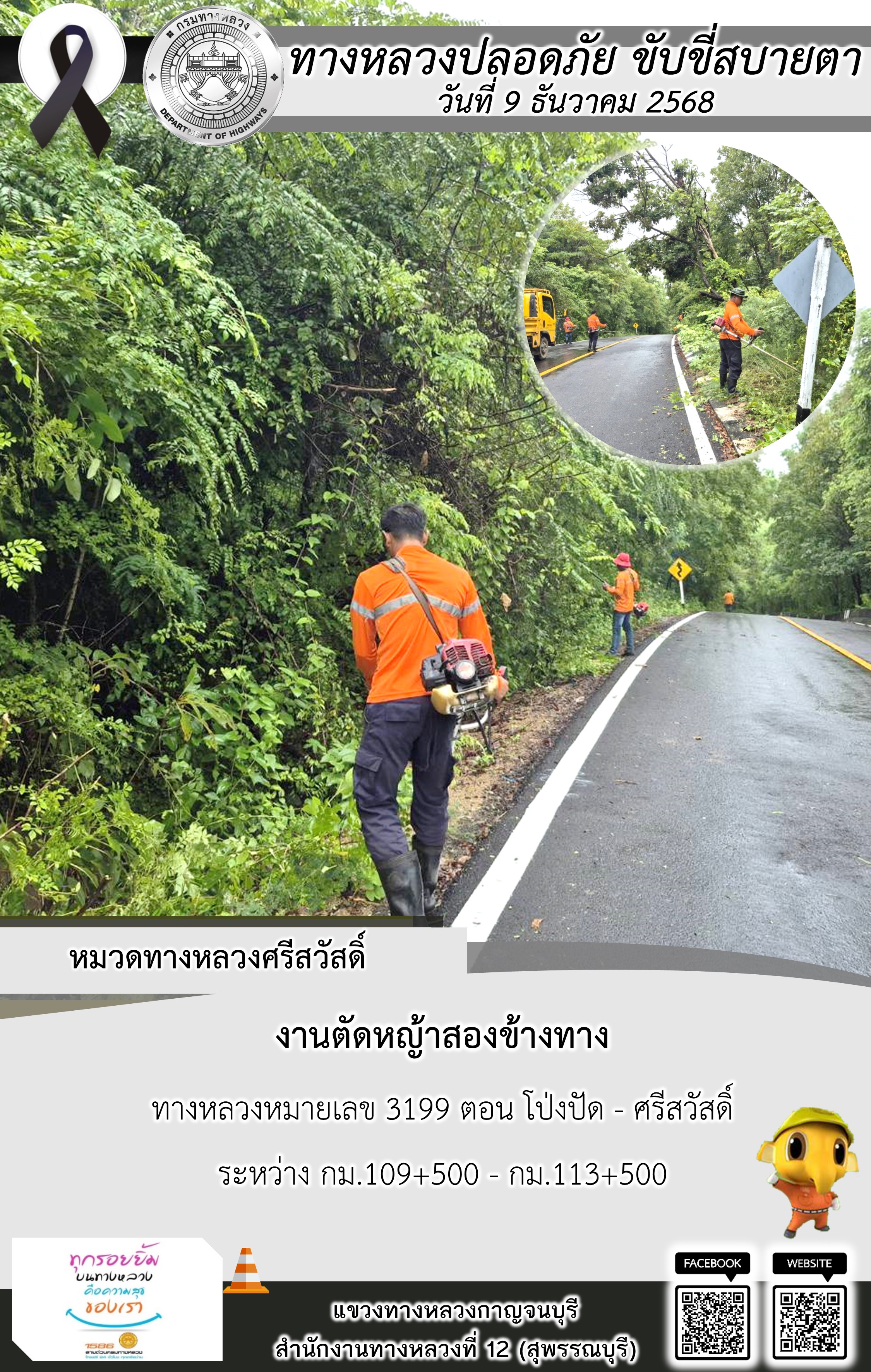 แขวงทางหลวงกาญจนบุรี โดยหมวดทางหลวงในสังกัด และงานอำนวยความปลอดภัยปฏิบัติงาน ประจำวันที่ 9 ธ.ค. 68