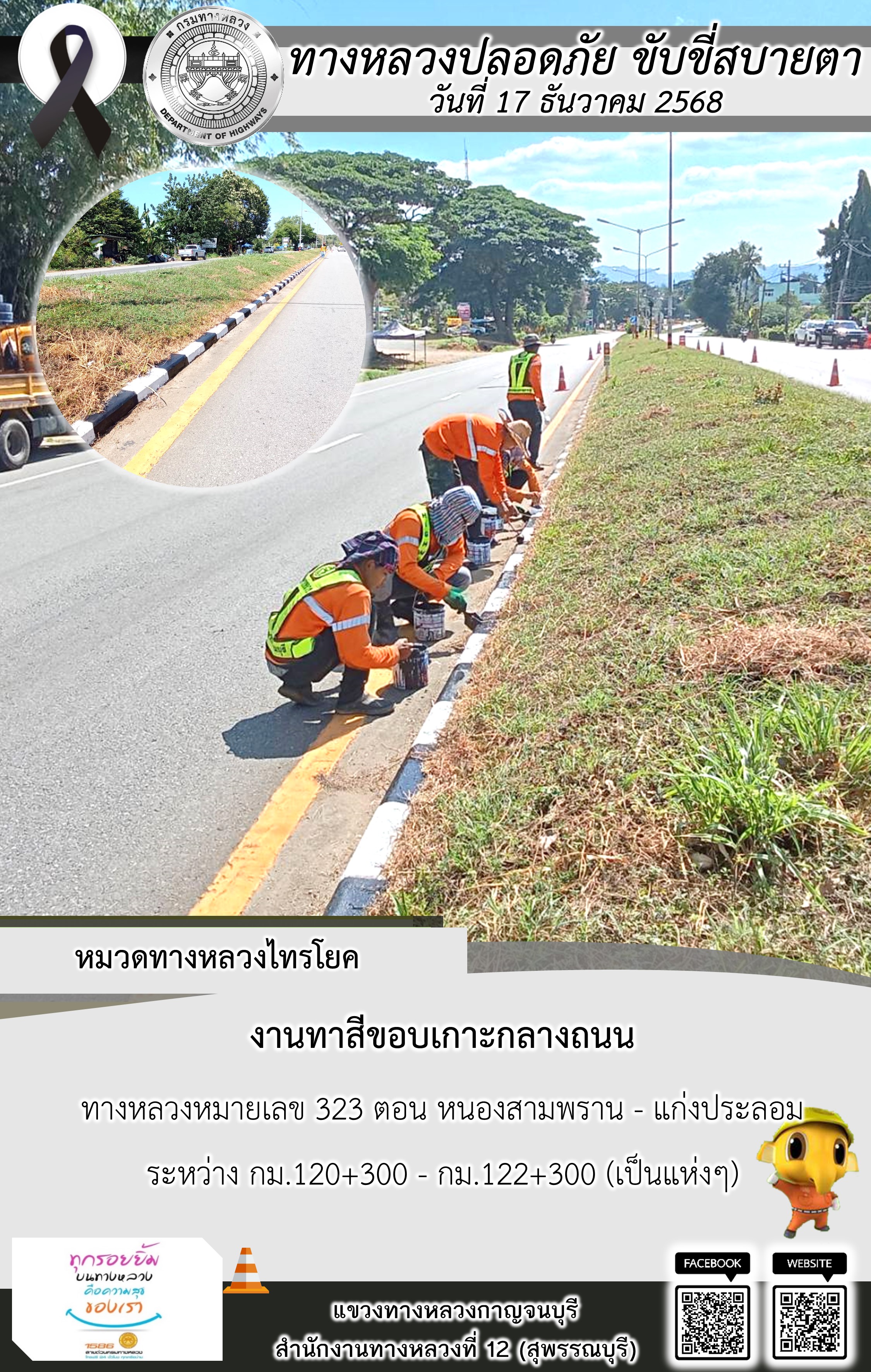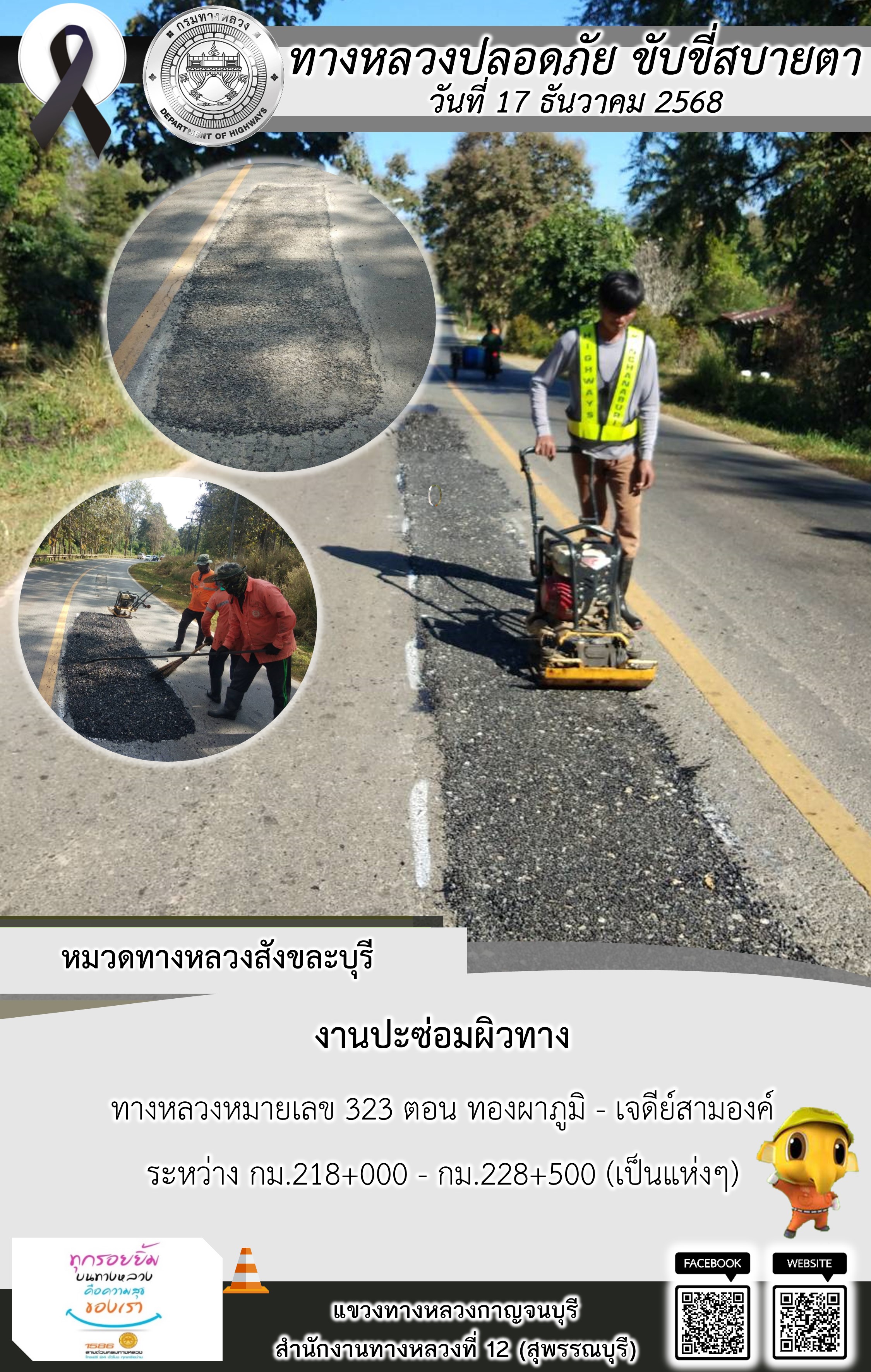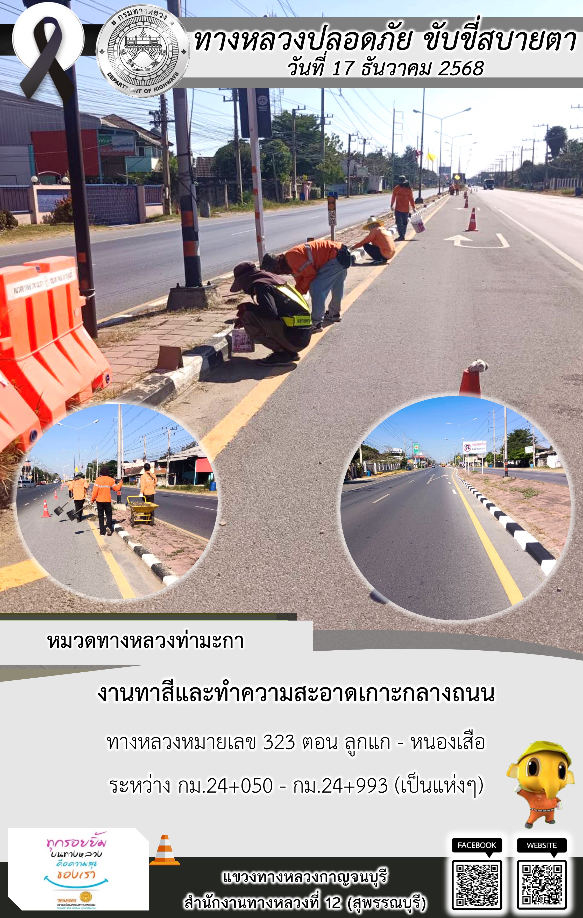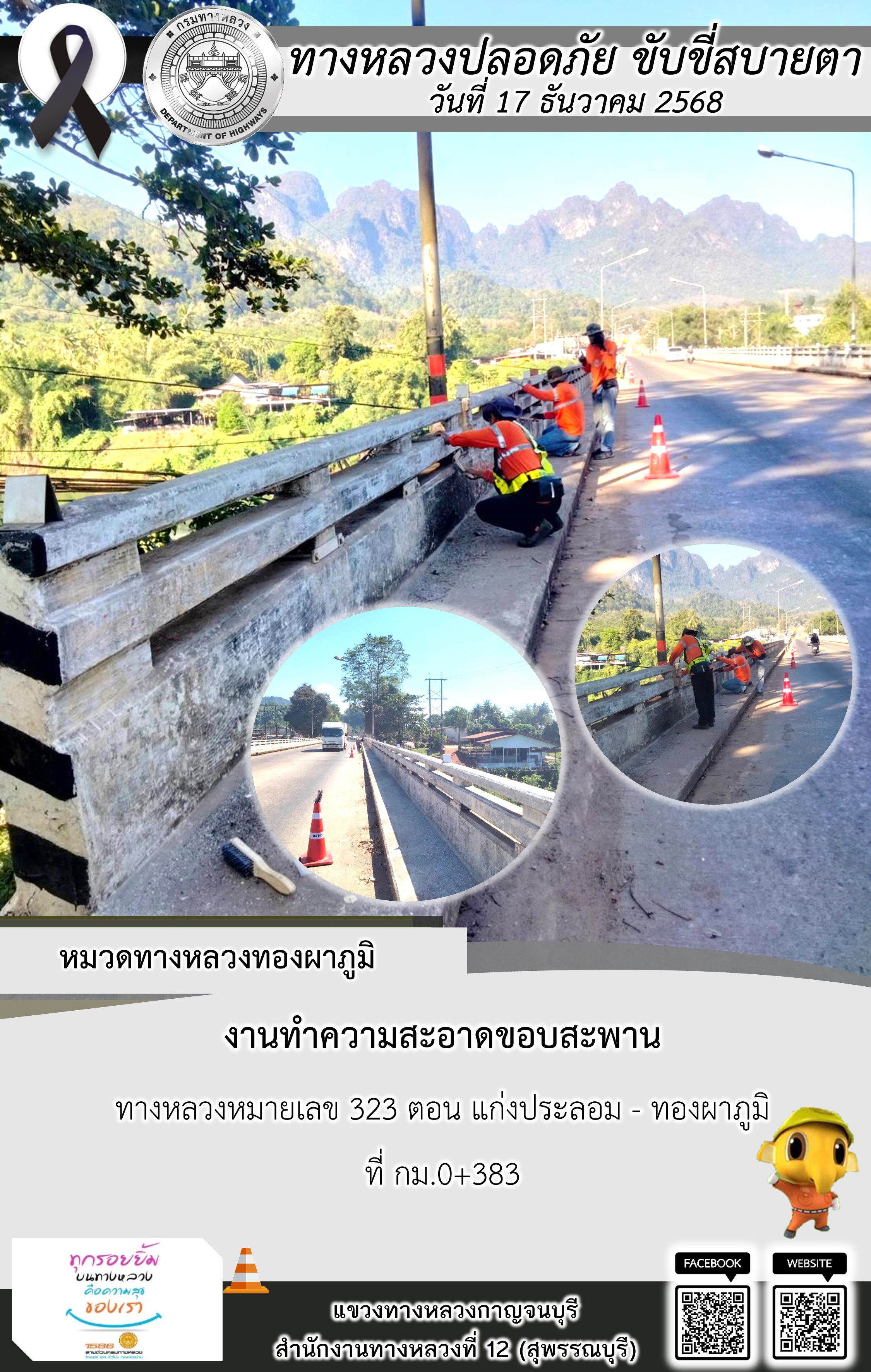 แขวงทางหลวงกาญจนบุรี โดยหมวดทางหลวงในสังกัด และงานอำนวยความปลอดภัยปฏิบัติงาน ประจำวันที่ 17 ธ.ค. 68