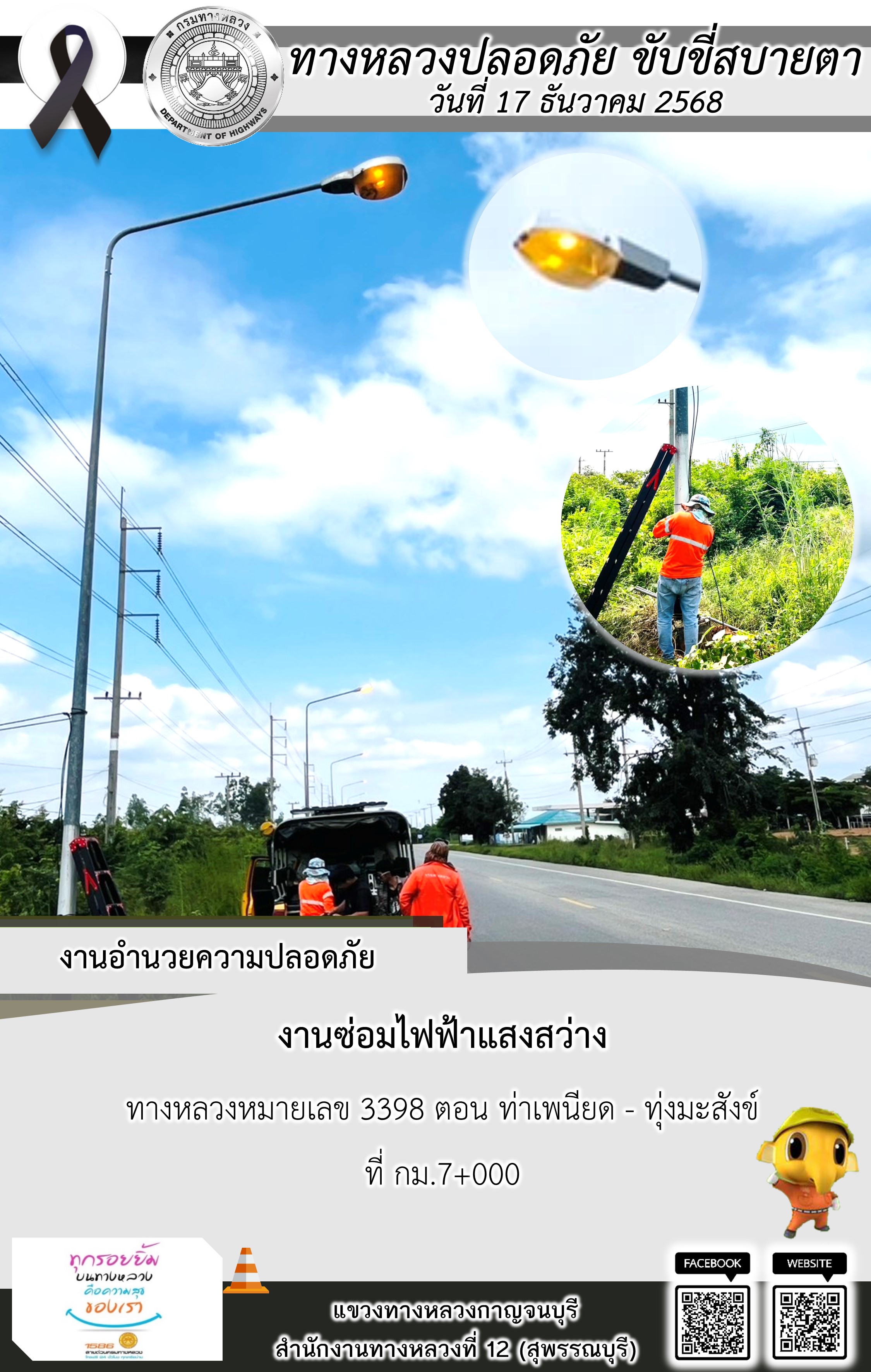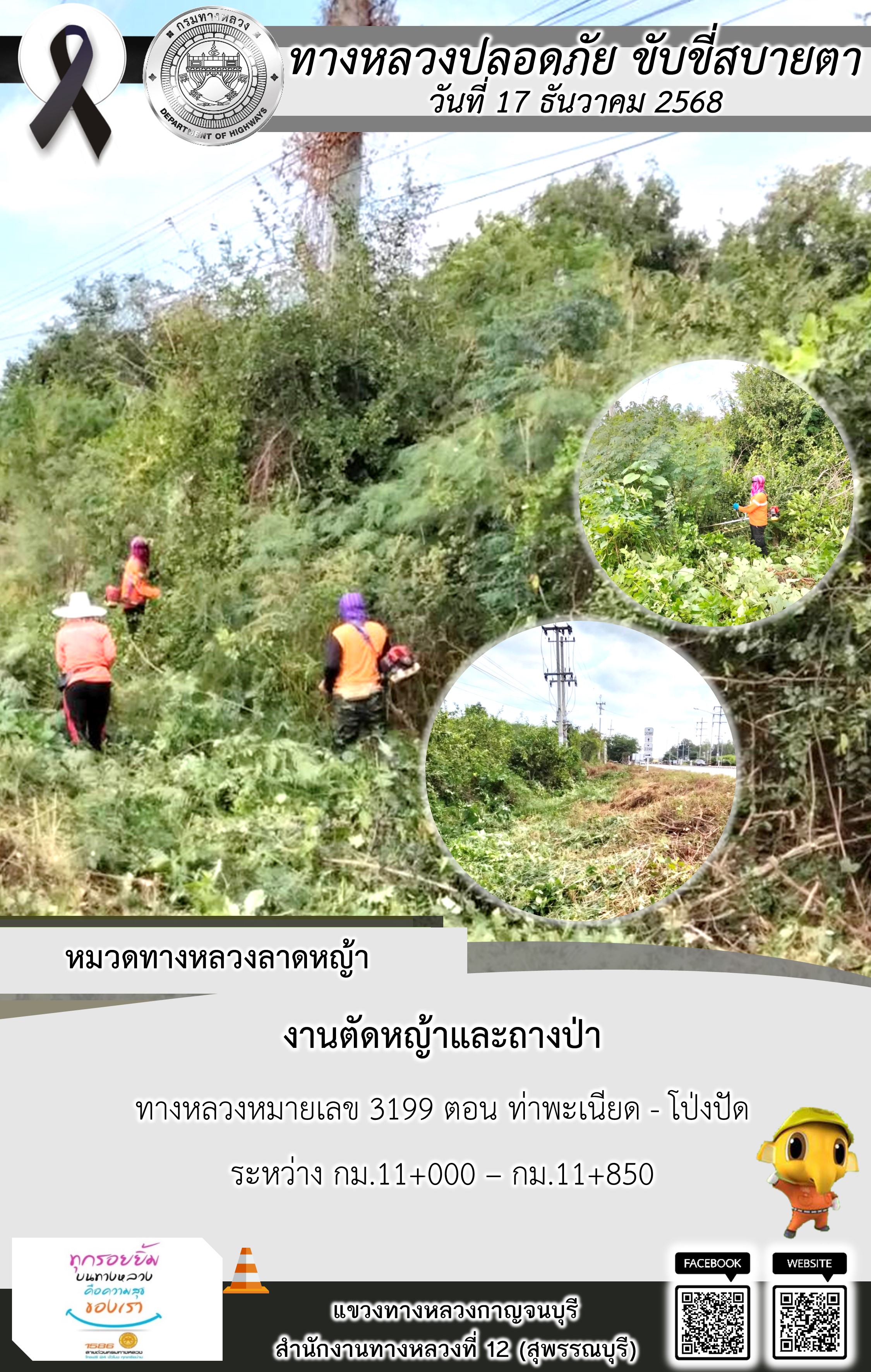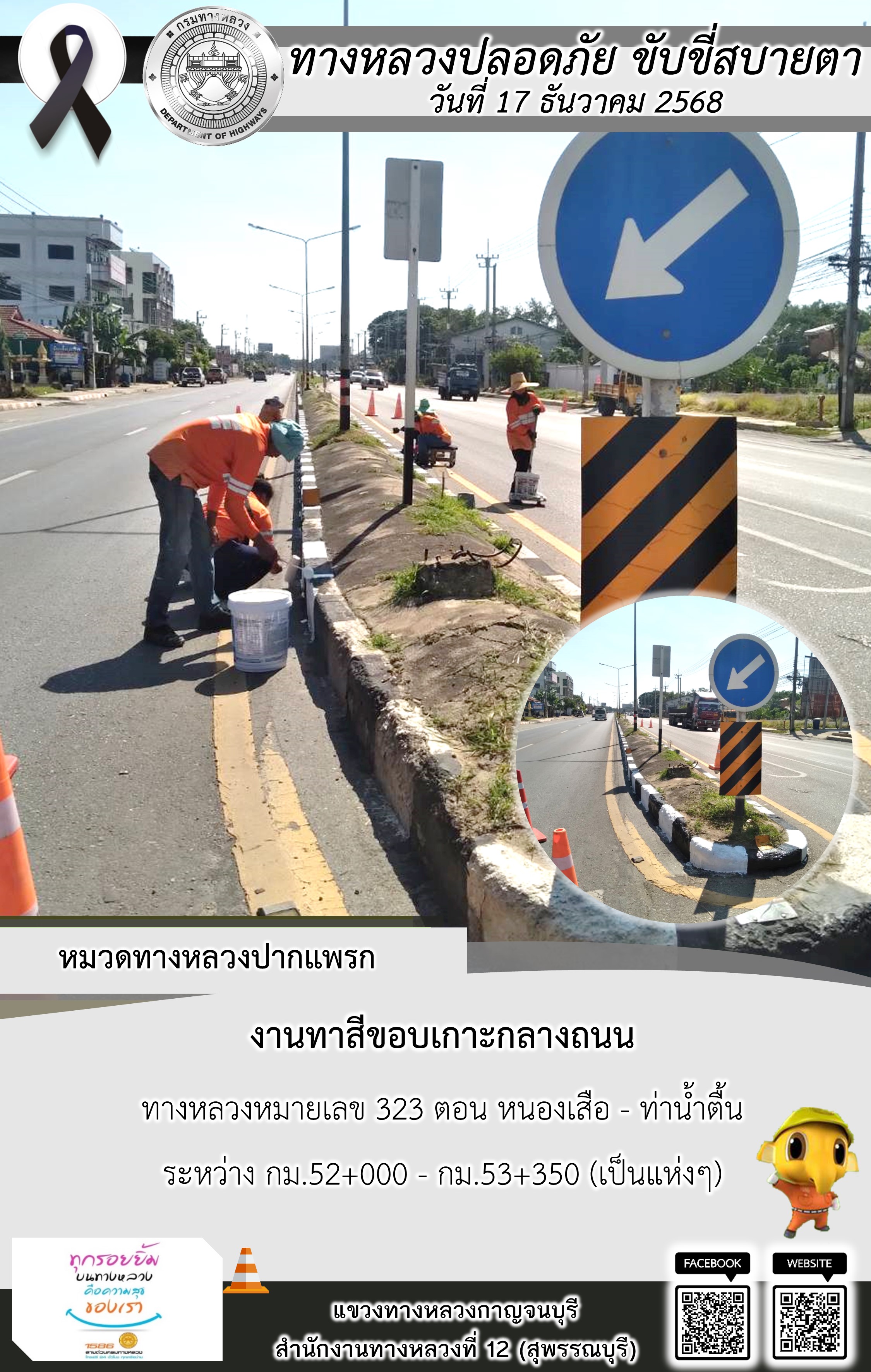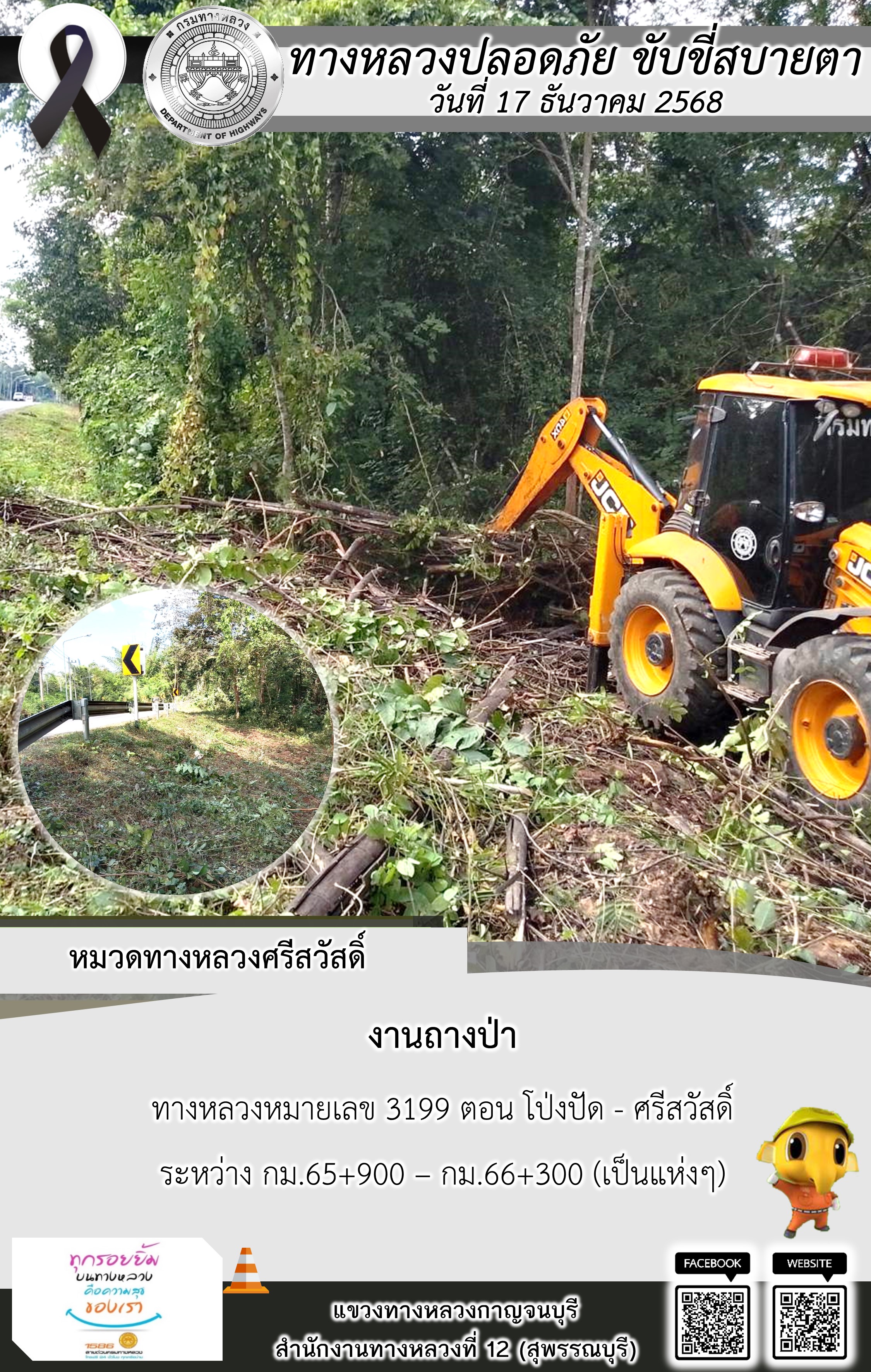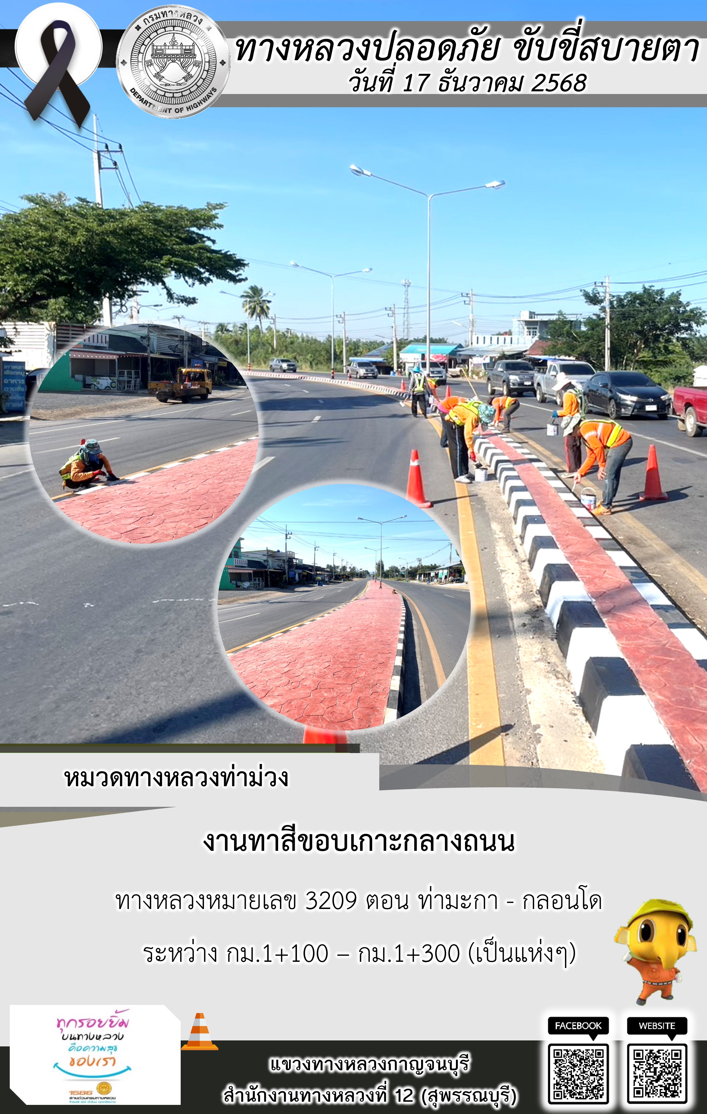 แขวงทางหลวงกาญจนบุรี โดยหมวดทางหลวงในสังกัด และงานอำนวยความปลอดภัยปฏิบัติงาน ประจำวันที่ 17 ธ.ค. 68