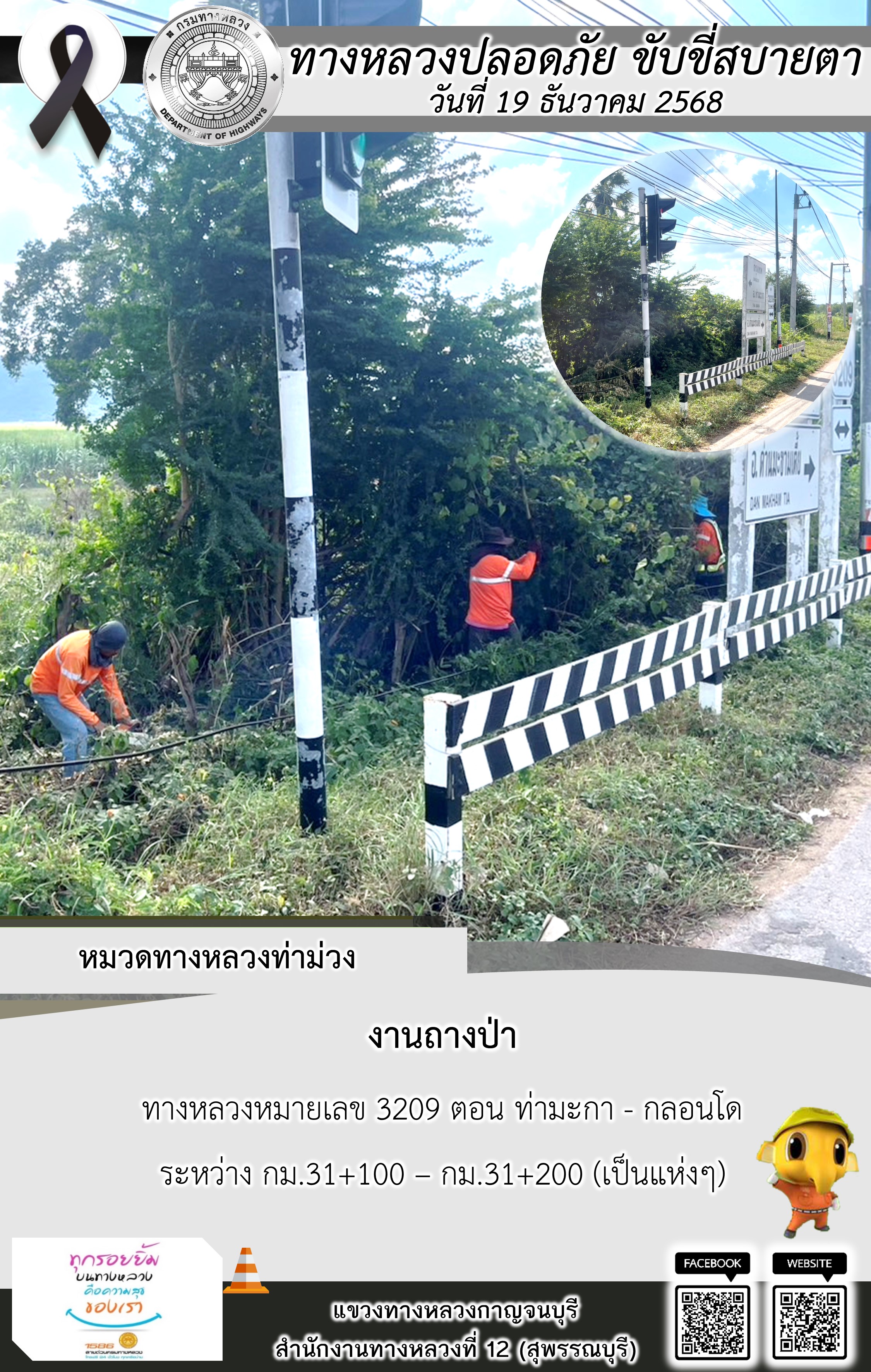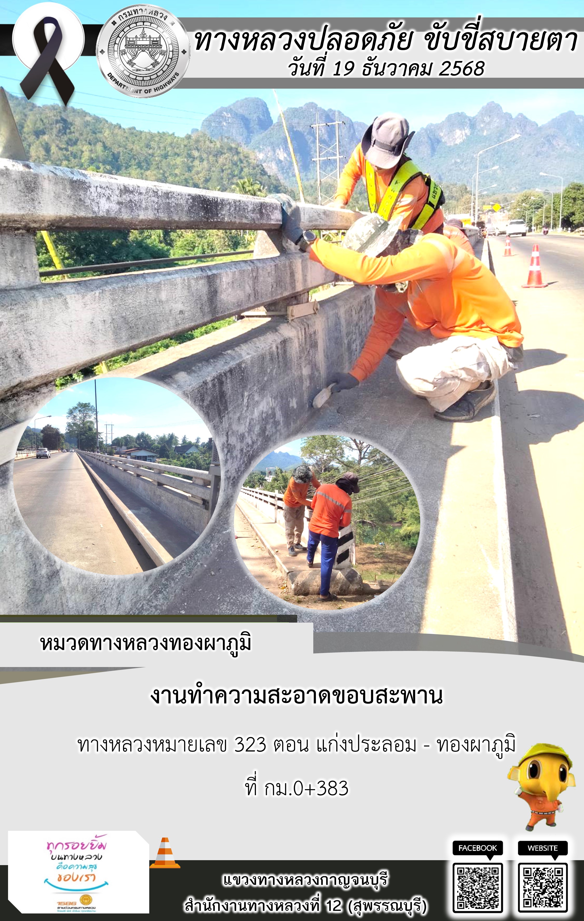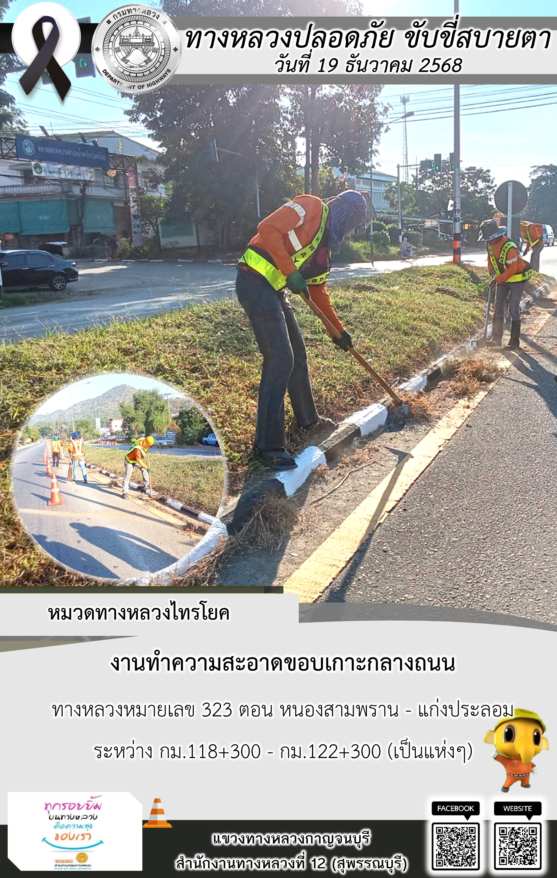 ข้อมูลภาพกิจกรรม : แขวงทางหลวงกาญจนบุรี โดยหมวดทางหลวงในสังกัด และงานอำนวยความปลอดภัยปฏิบัติงาน ประจำวันที่ 19 ธ.ค. 68