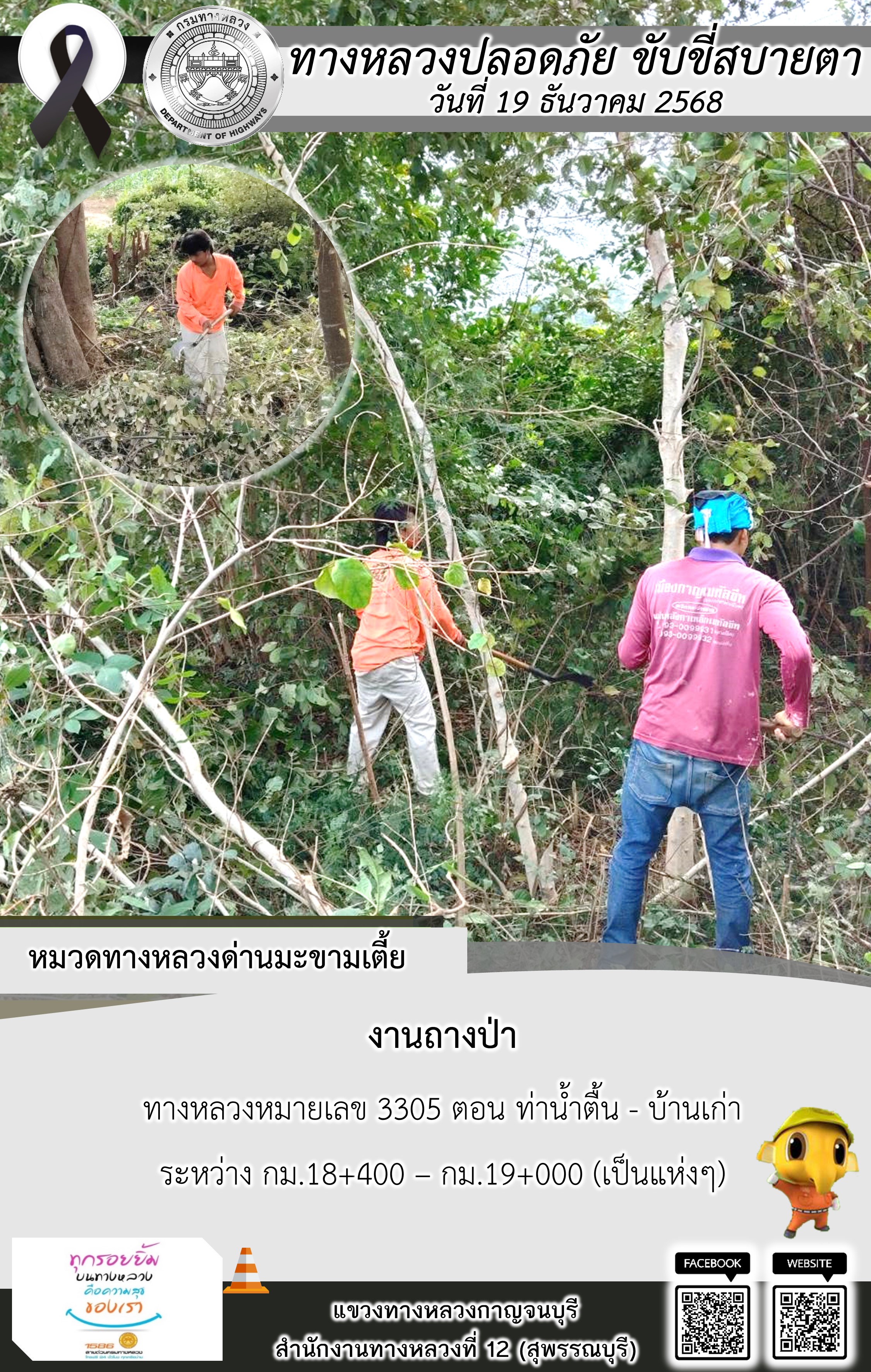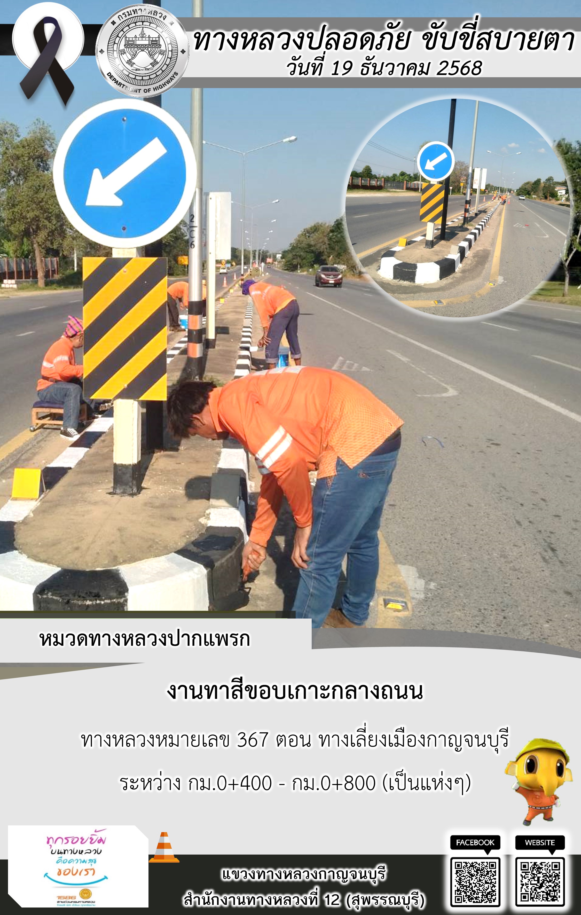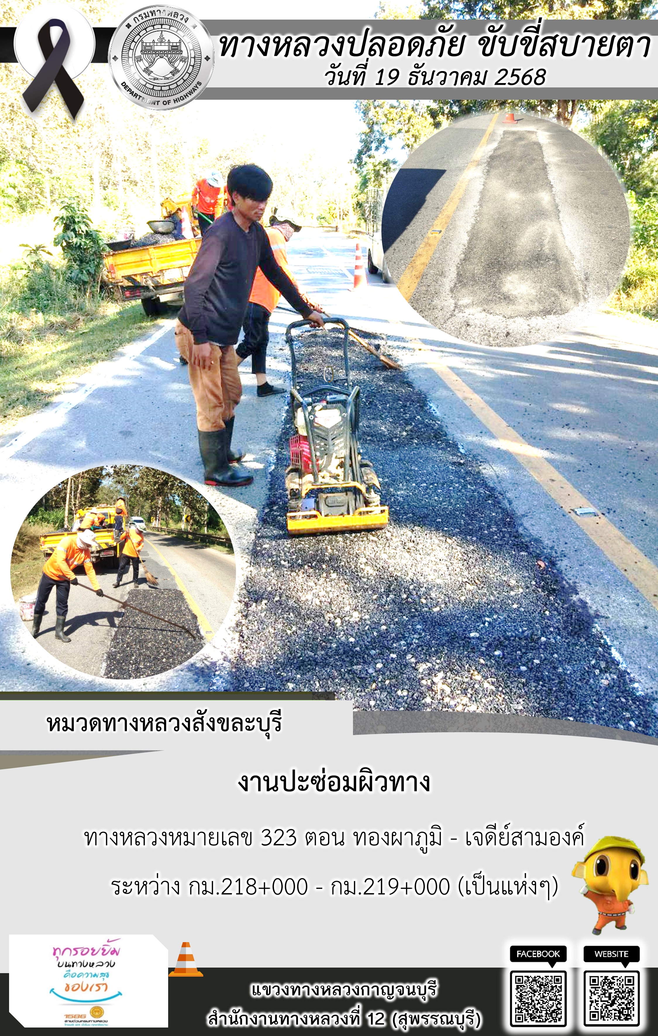 ข้อมูลภาพกิจกรรม : แขวงทางหลวงกาญจนบุรี โดยหมวดทางหลวงในสังกัด และงานอำนวยความปลอดภัยปฏิบัติงาน ประจำวันที่ 19 ธ.ค. 68