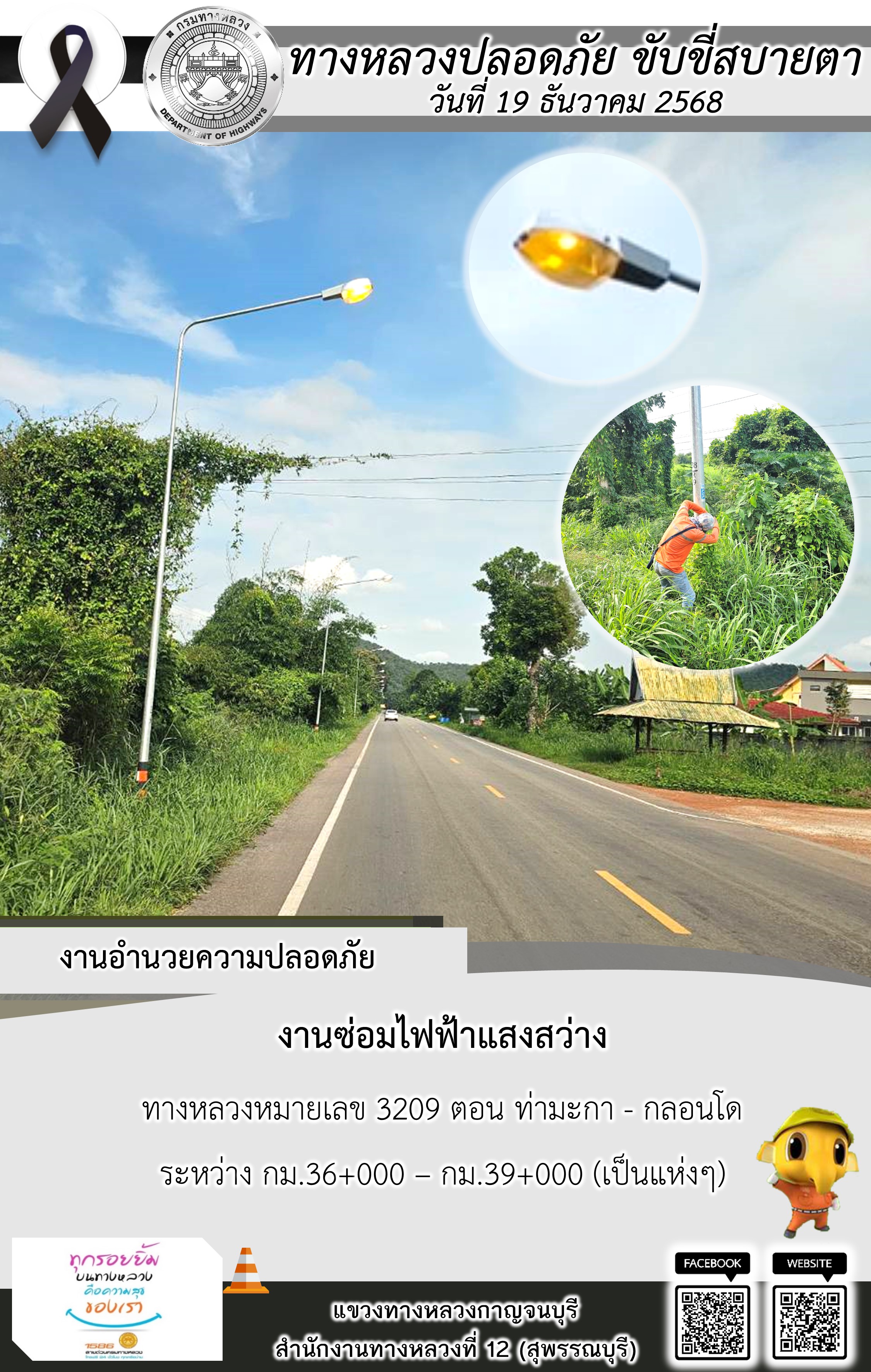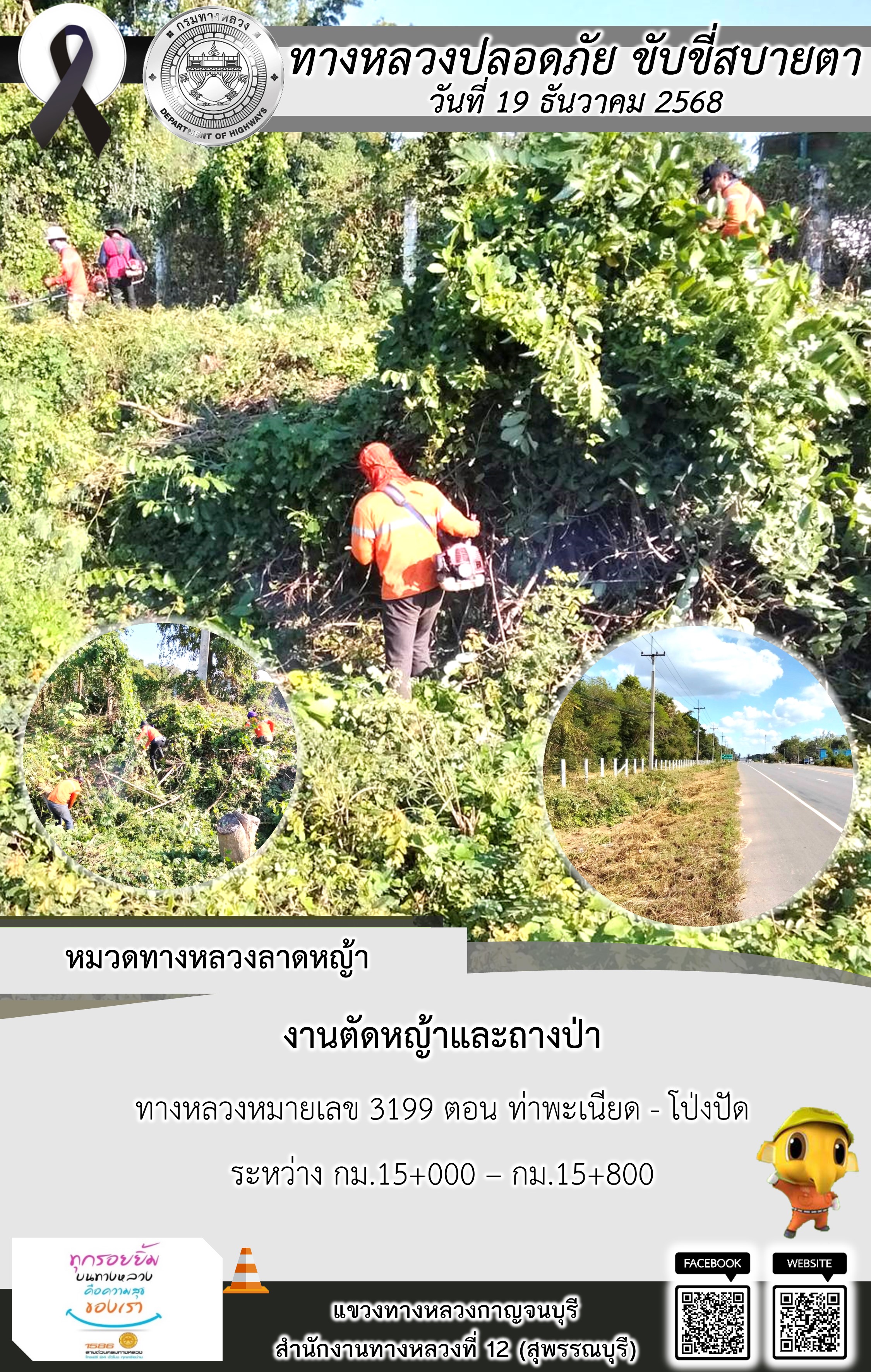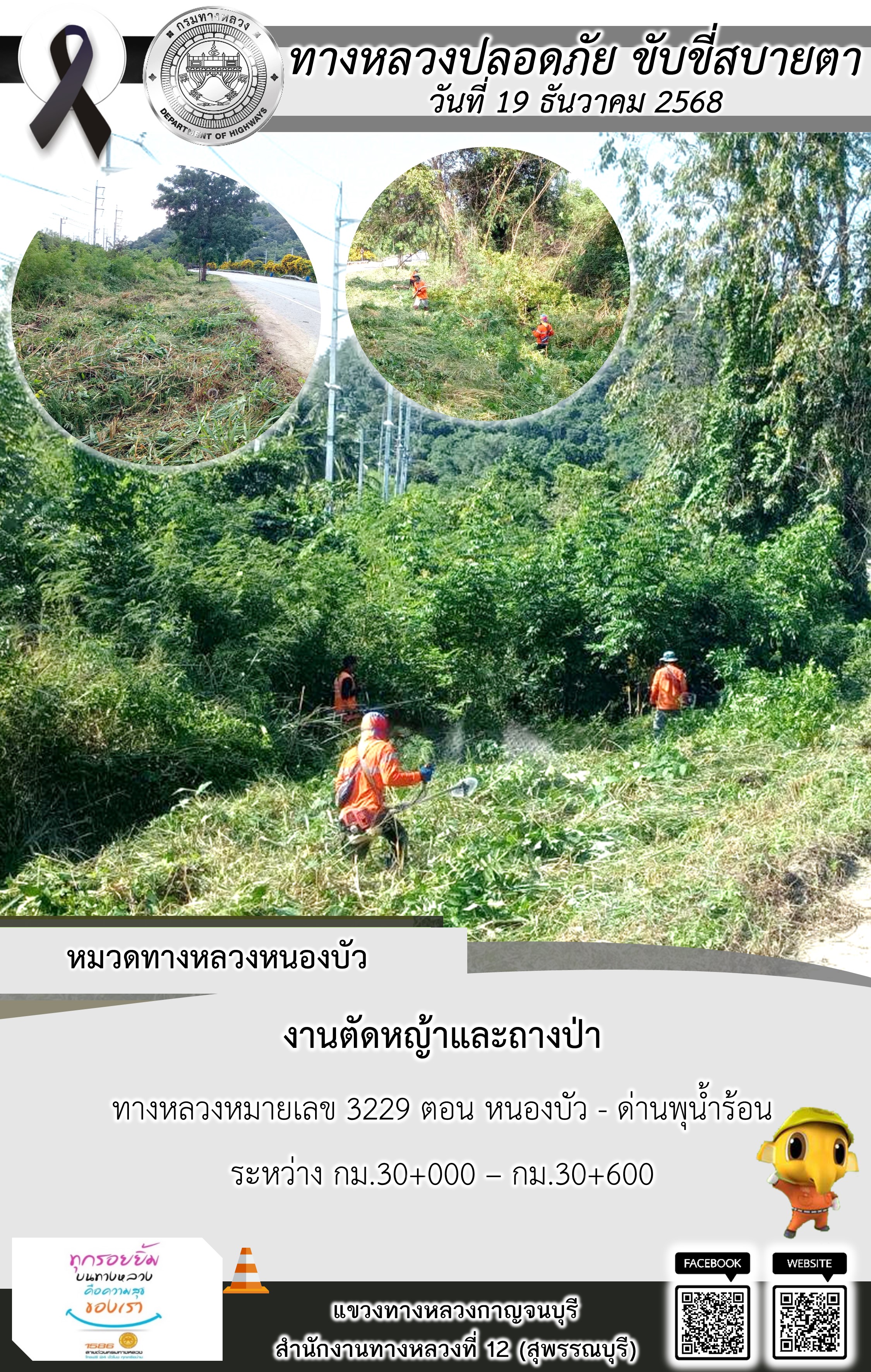 แขวงทางหลวงกาญจนบุรี โดยหมวดทางหลวงในสังกัด และงานอำนวยความปลอดภัยปฏิบัติงาน ประจำวันที่ 19 ธ.ค. 68
