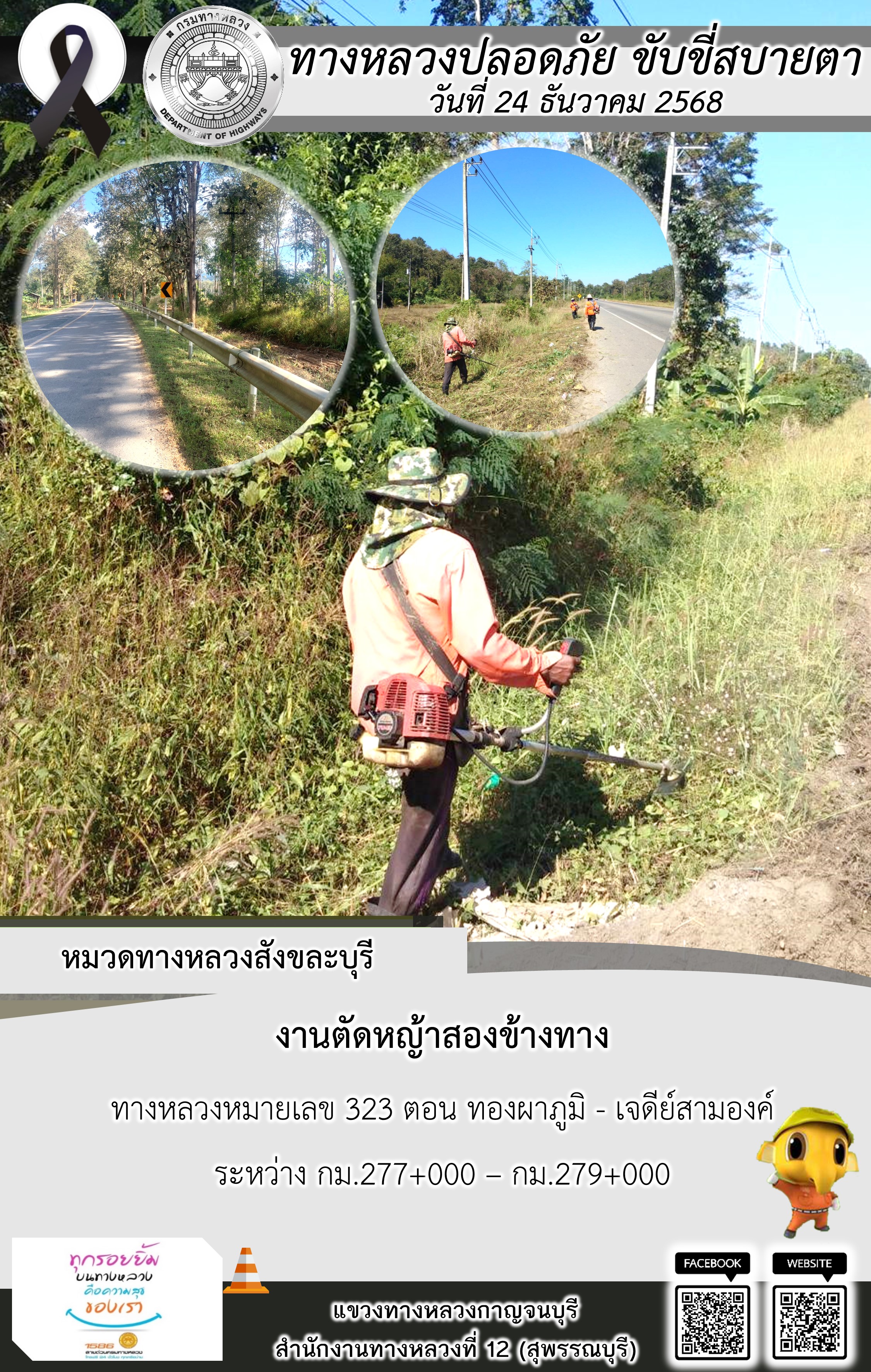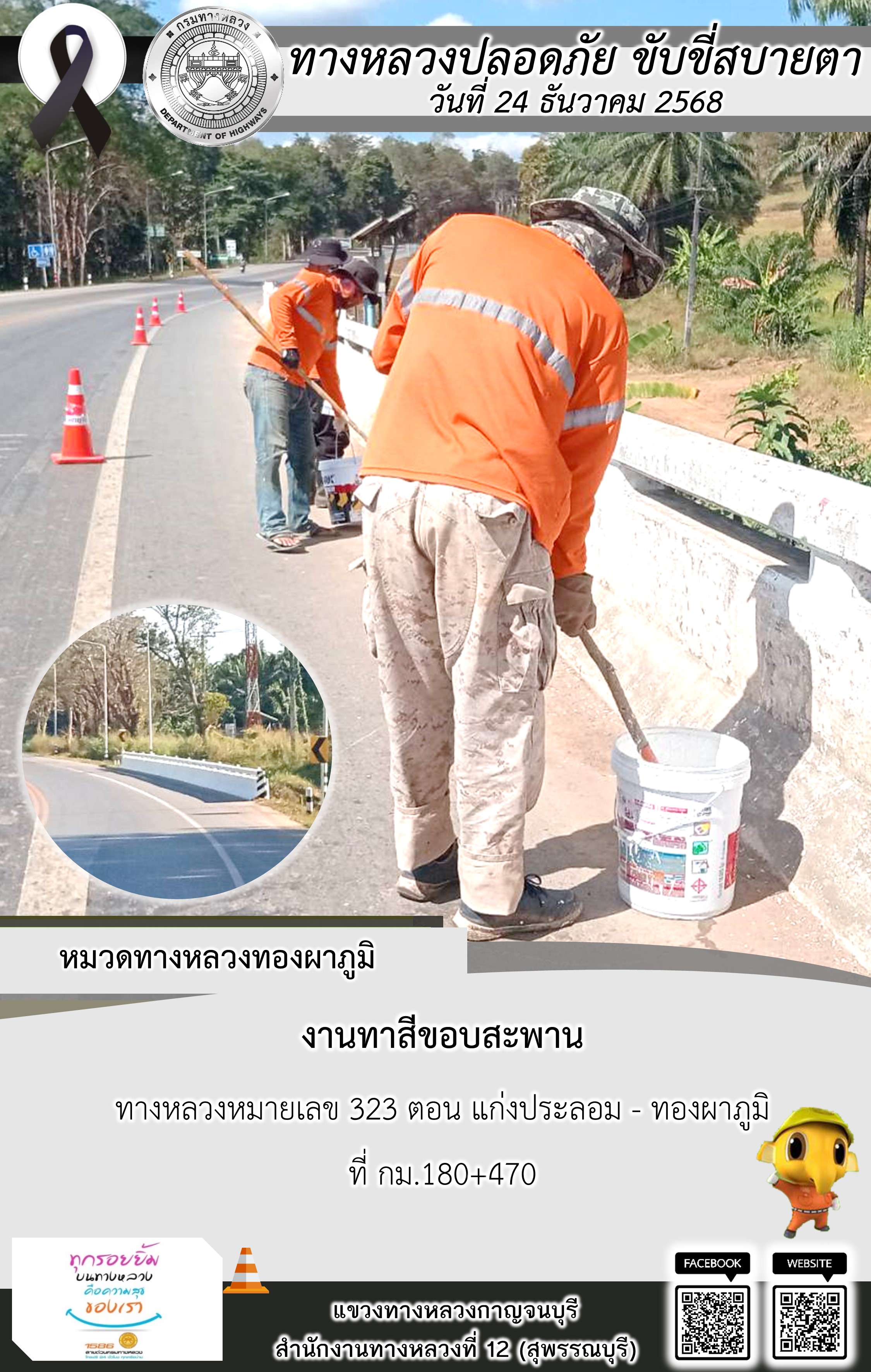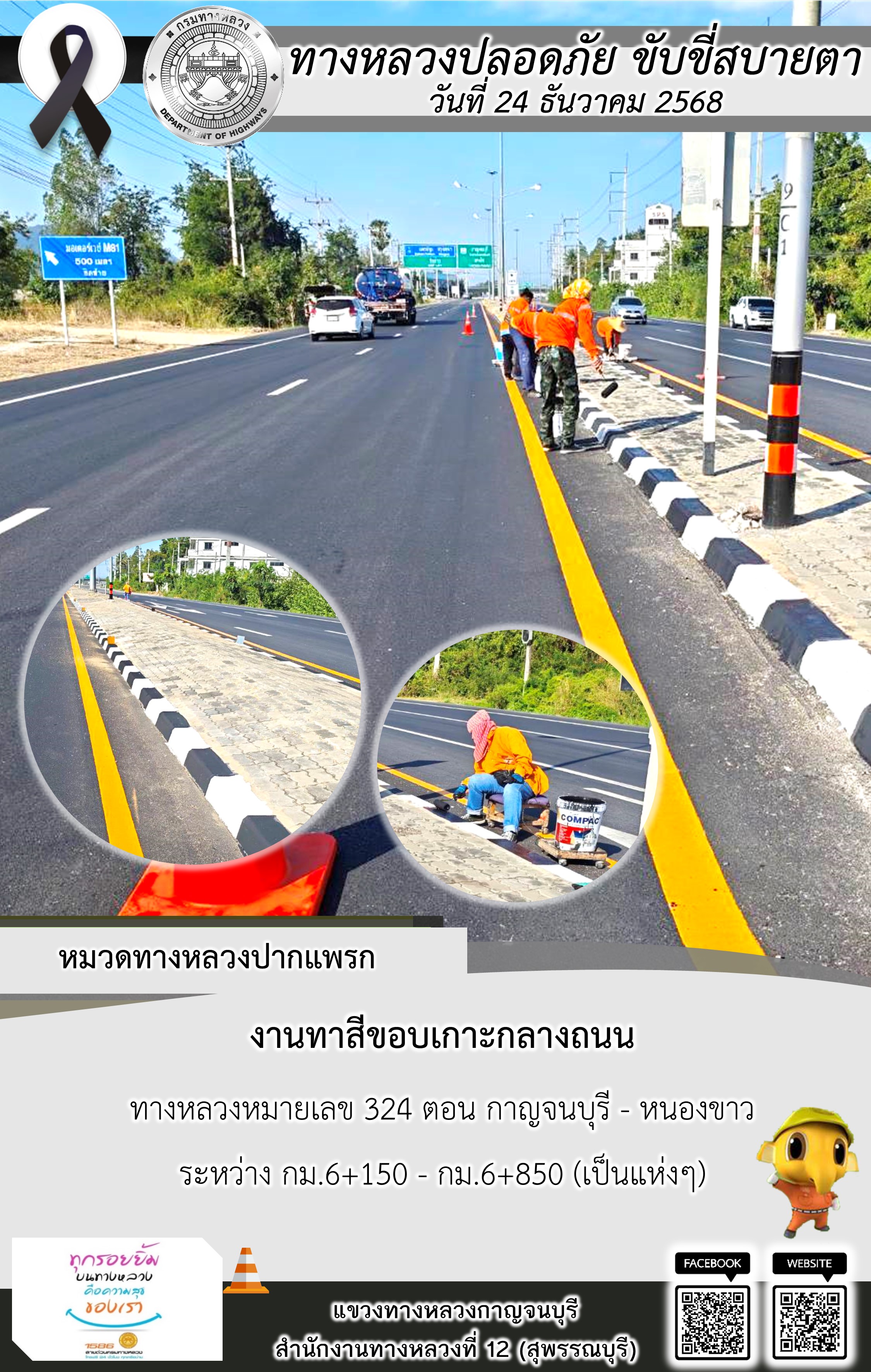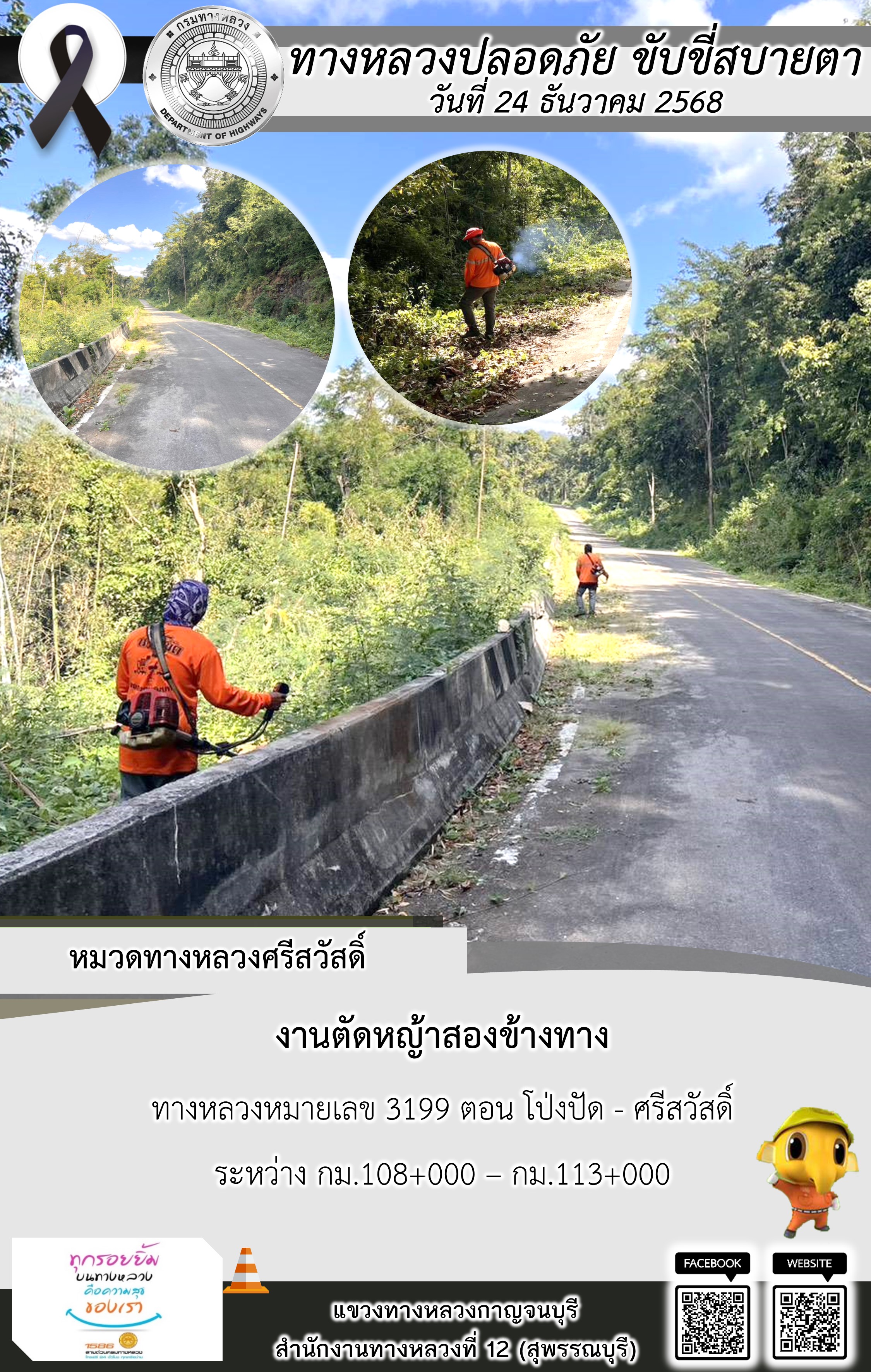 แขวงทางหลวงกาญจนบุรี โดยหมวดทางหลวงในสังกัด และงานอำนวยความปลอดภัยปฏิบัติงาน ประจำวันที่ 24 ธ.ค. 68