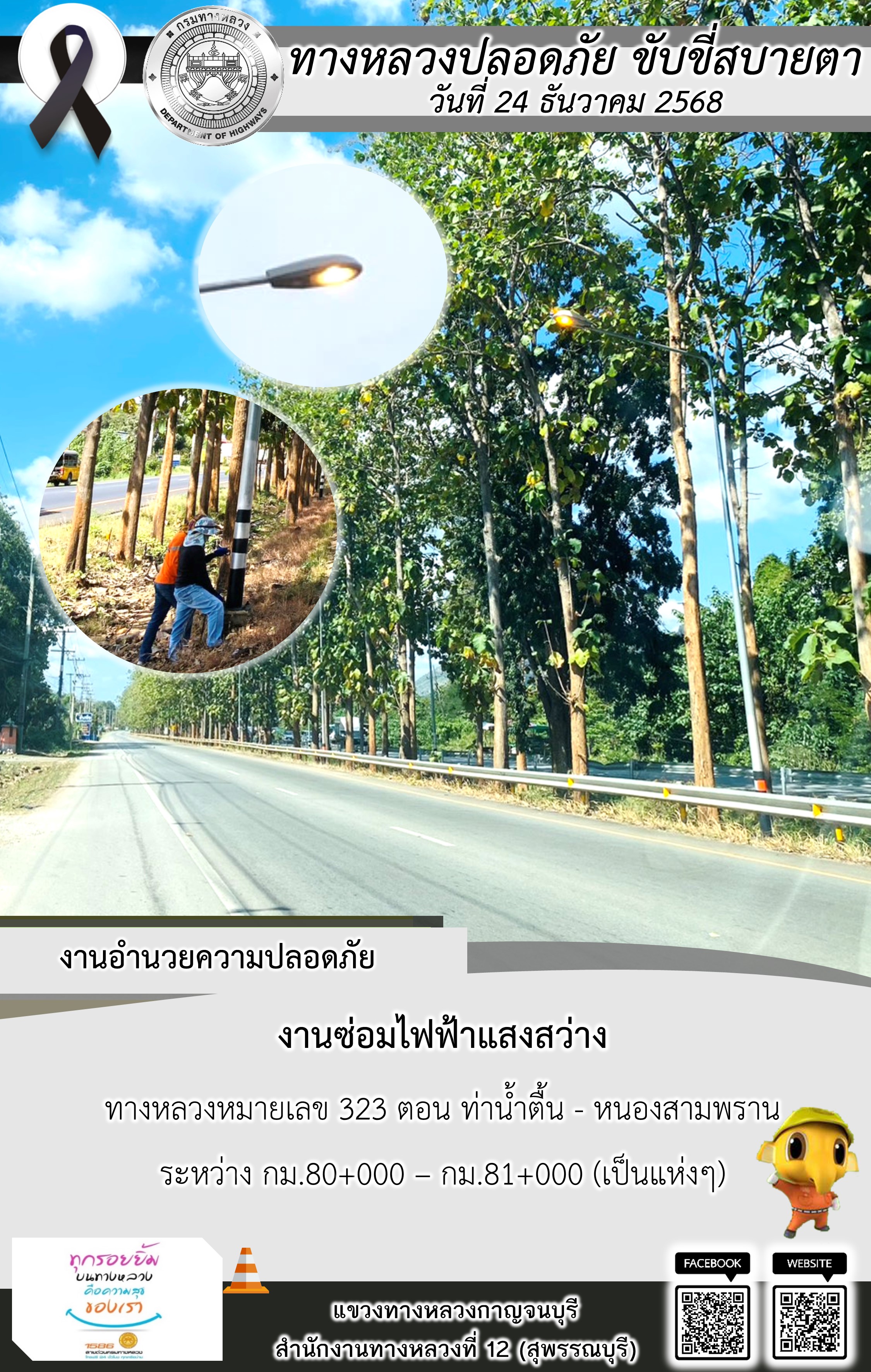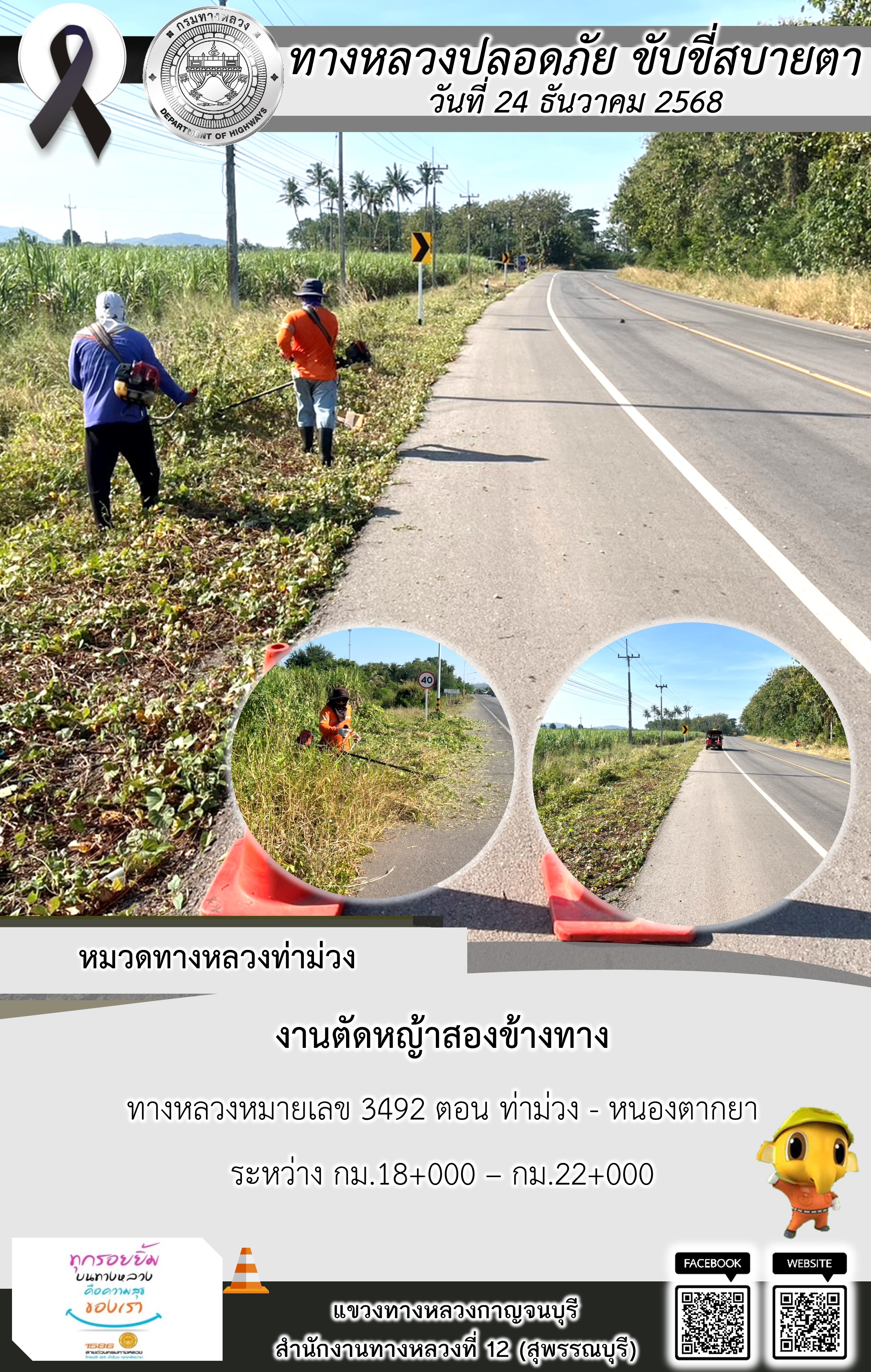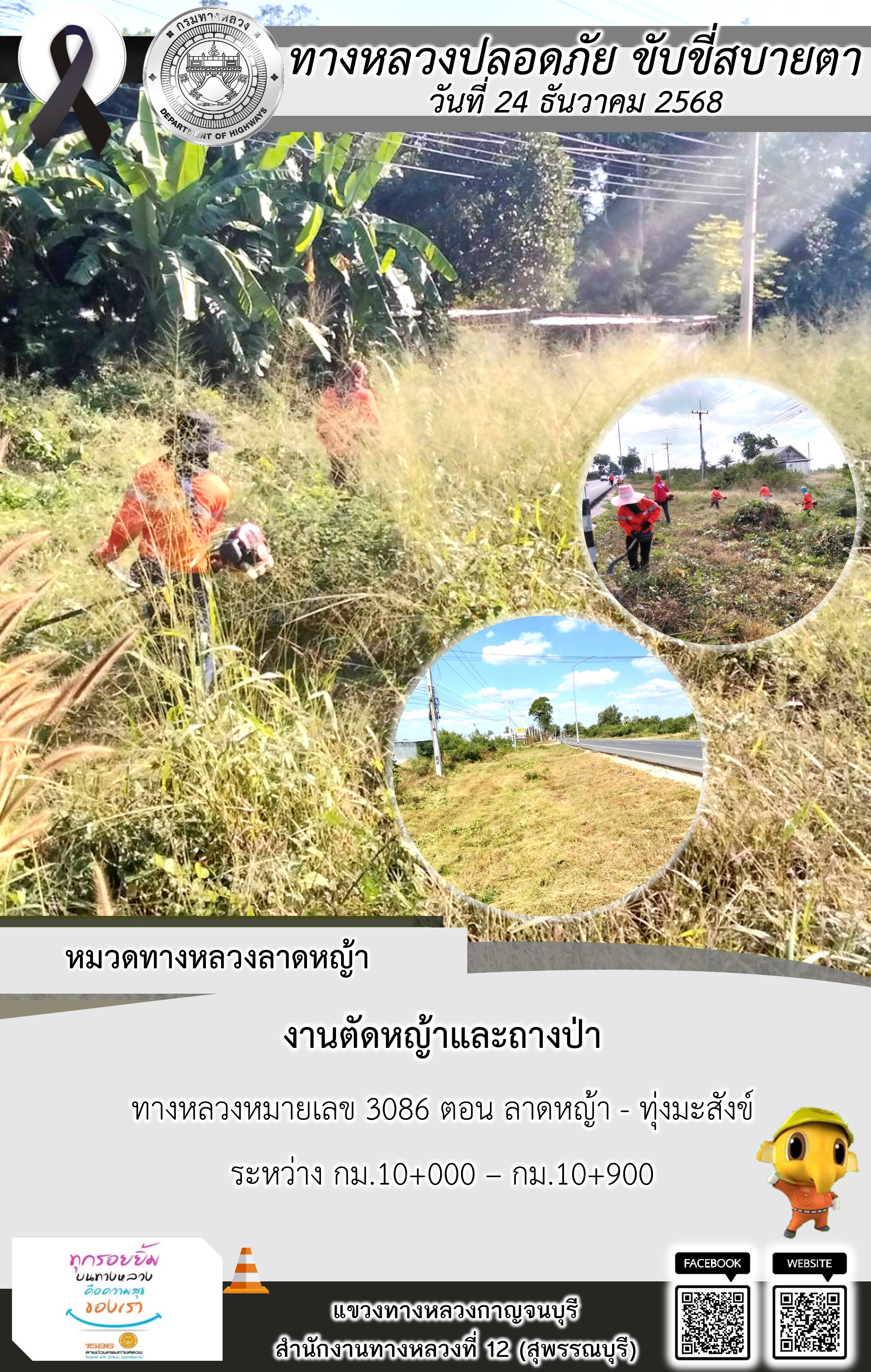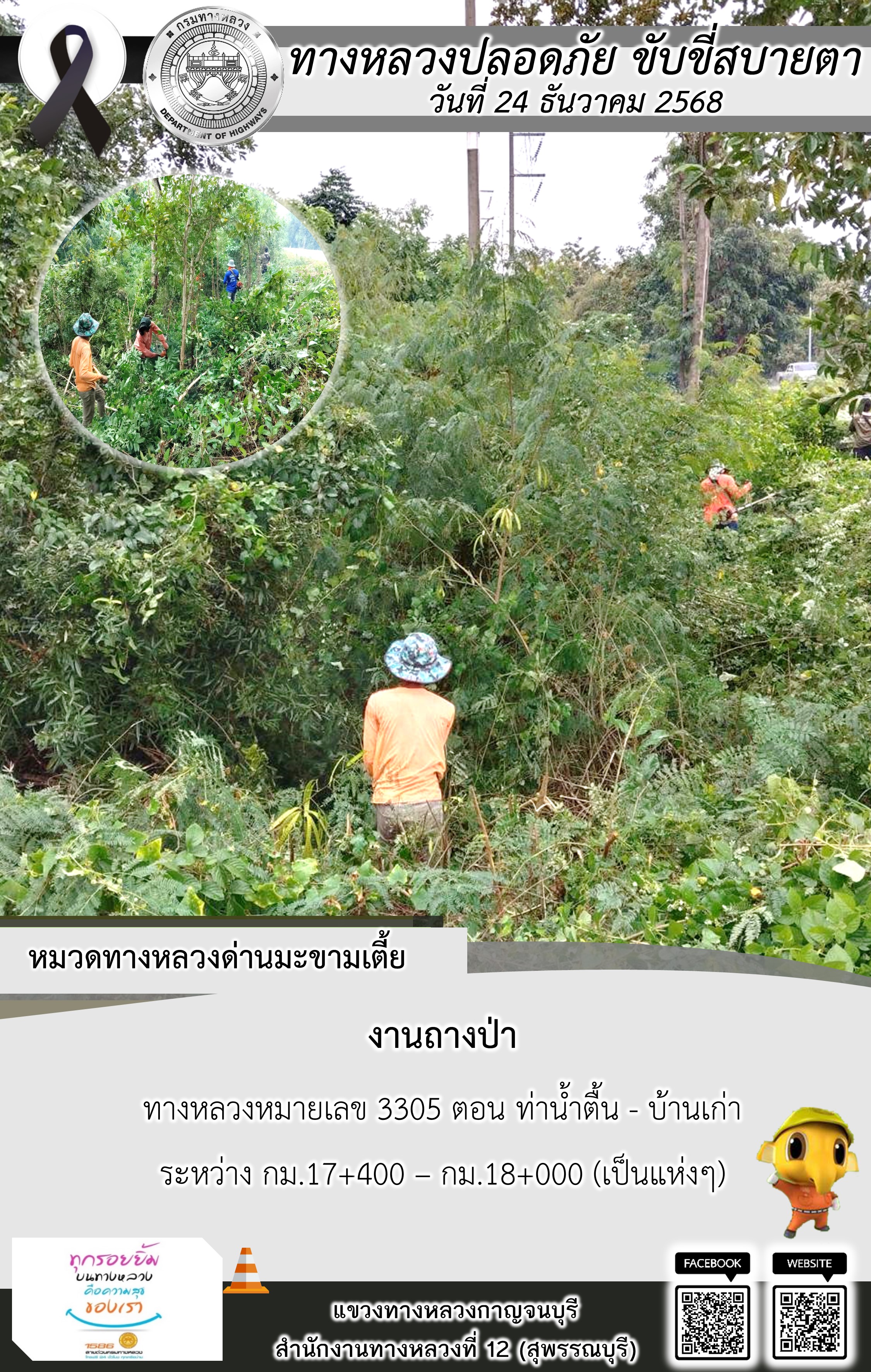 แขวงทางหลวงกาญจนบุรี โดยหมวดทางหลวงในสังกัด และงานอำนวยความปลอดภัยปฏิบัติงาน ประจำวันที่ 24 ธ.ค. 68