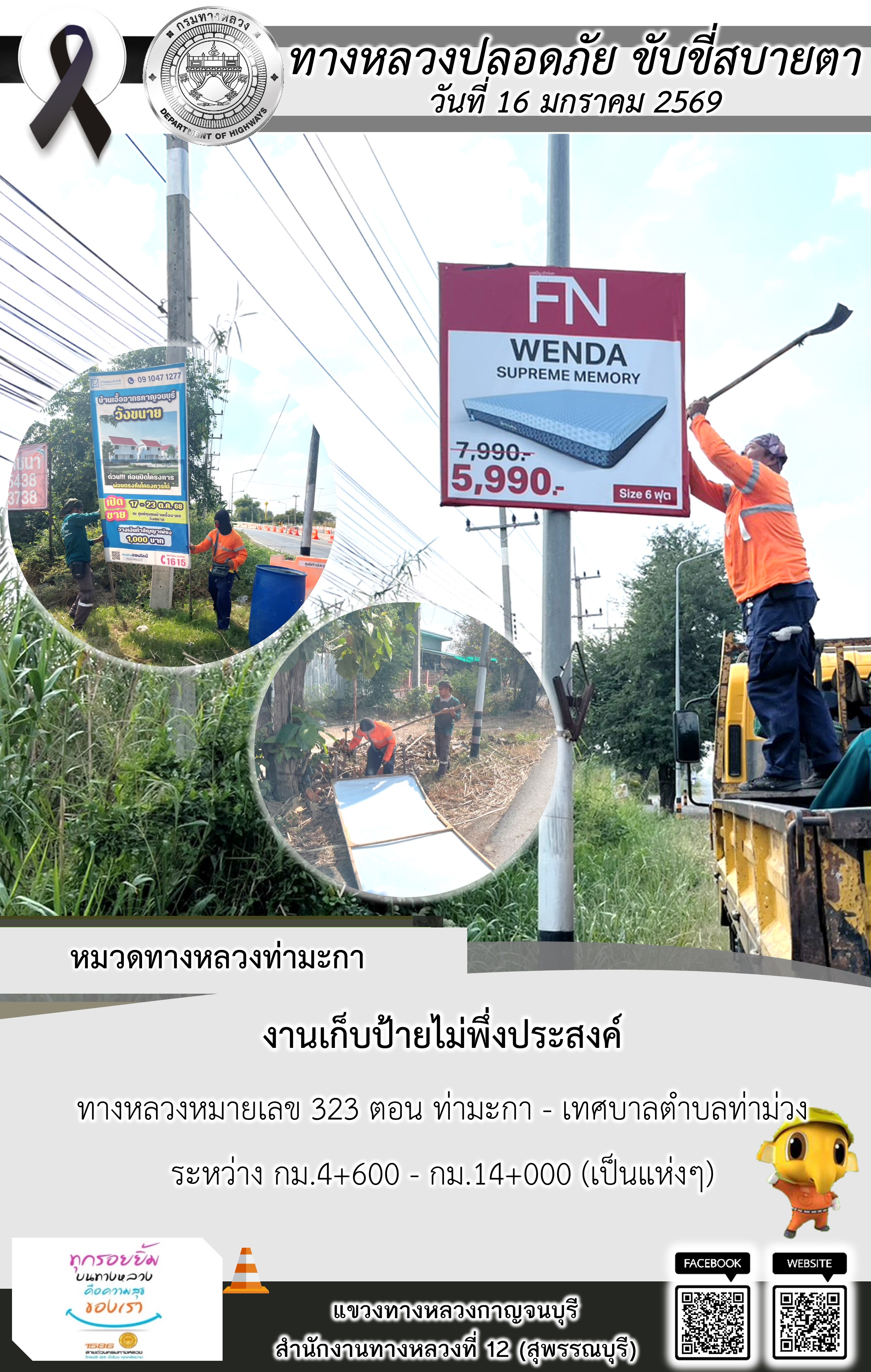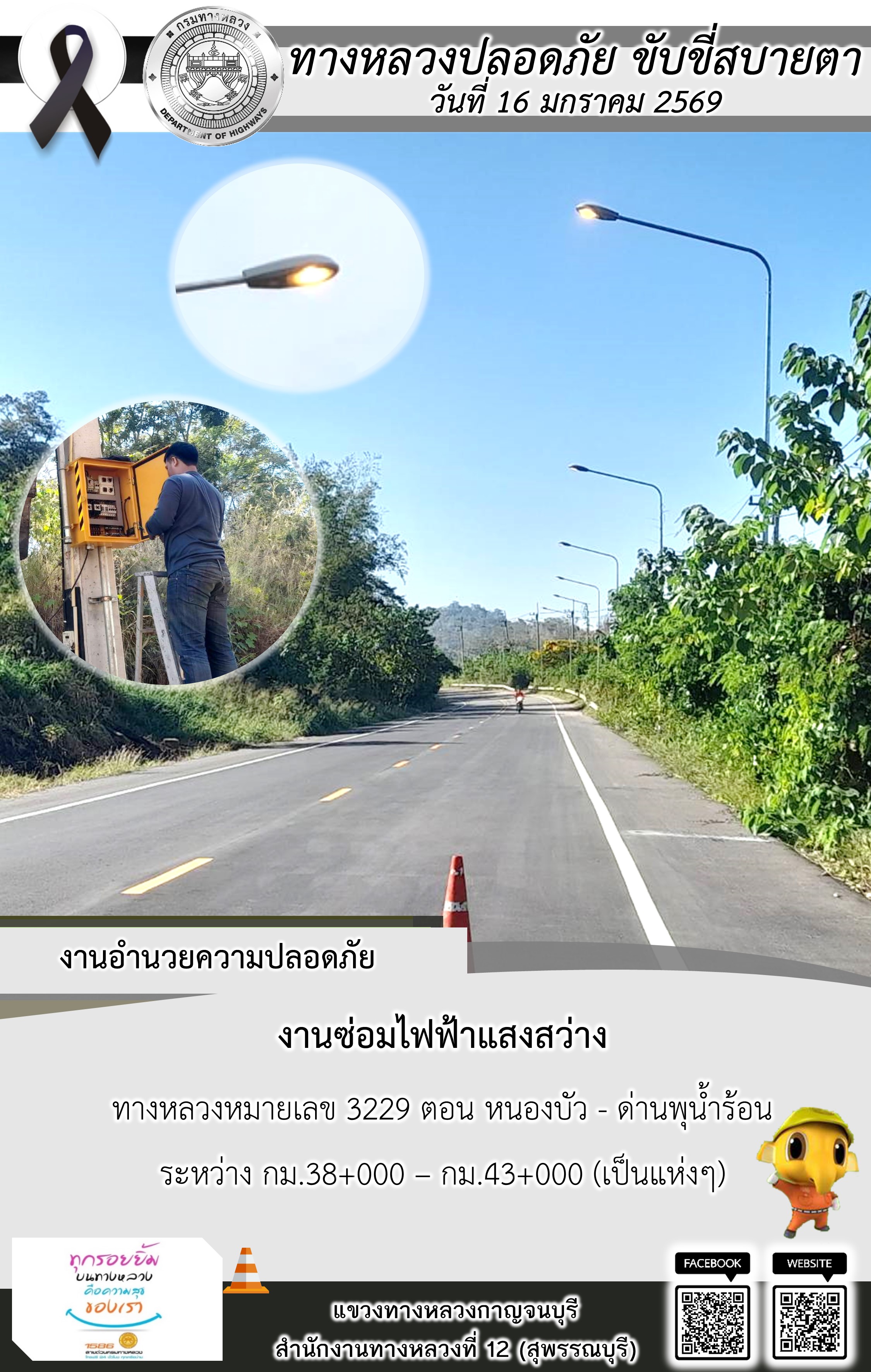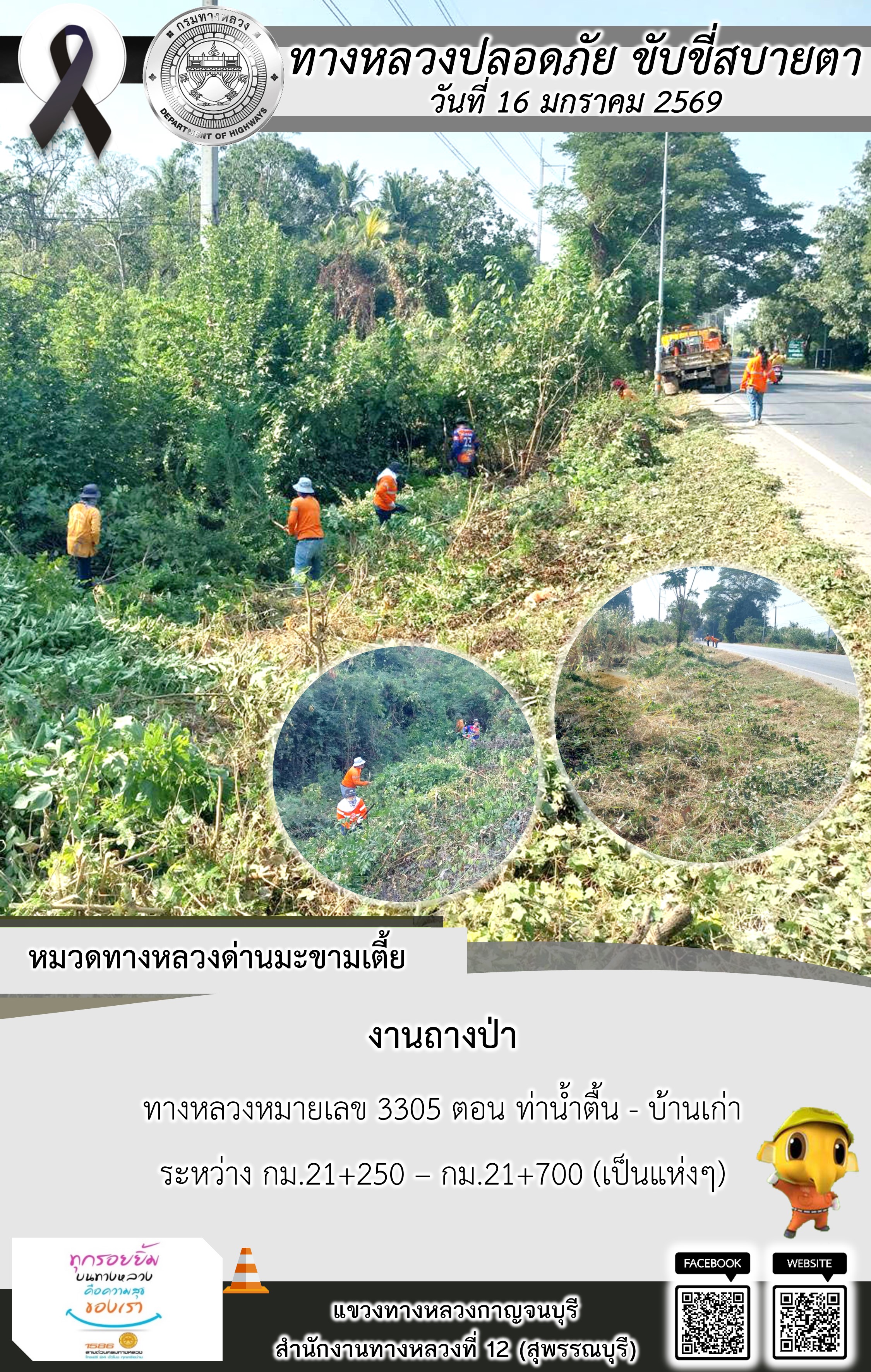แขวงทางหลวงกาญจนบุรี โดยหมวดทางหลวงในสังกัด และงานอำนวยความปลอดภัยปฏิบัติงาน ประจำวันที่ 16 ม.ค. 69