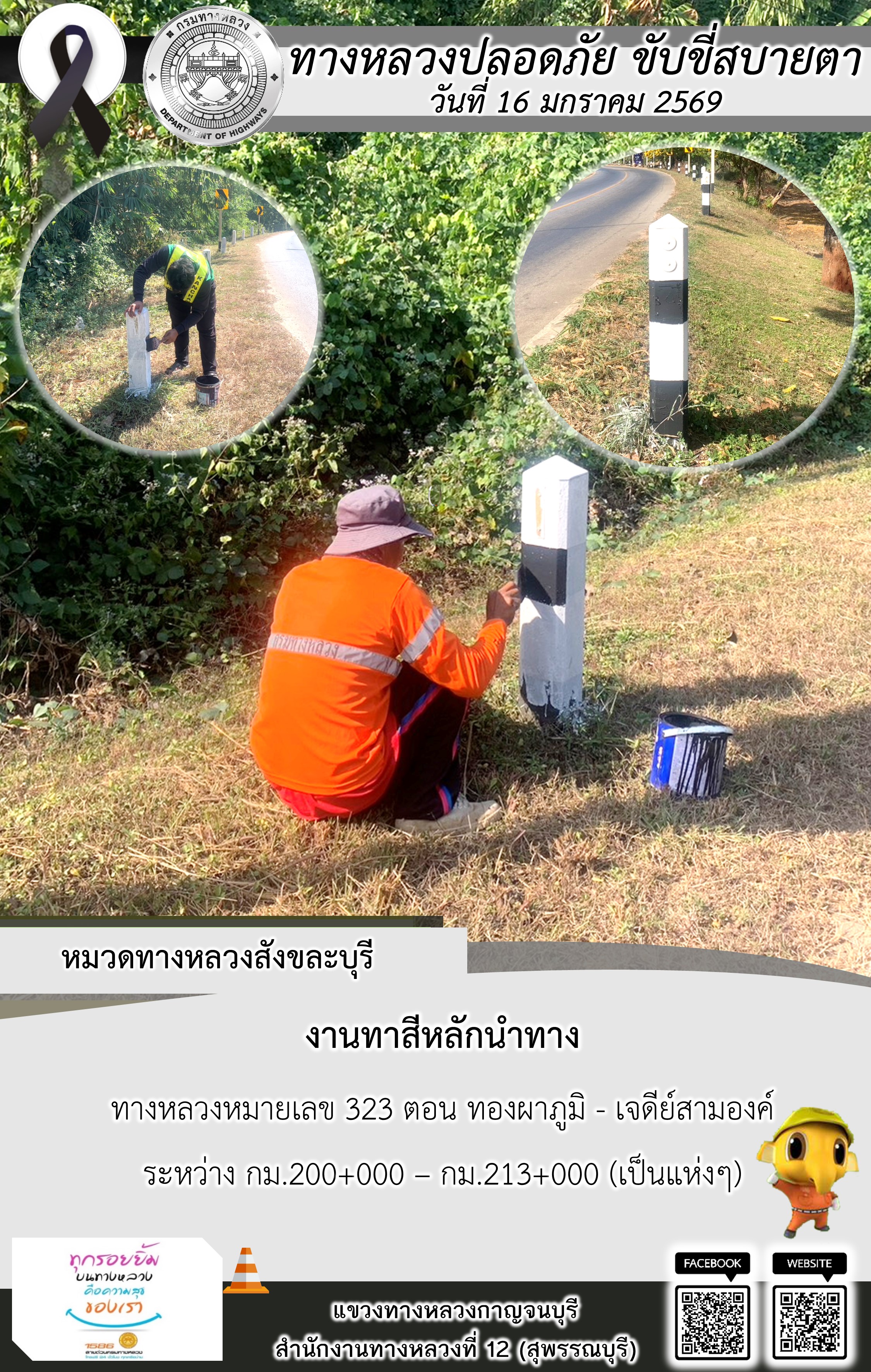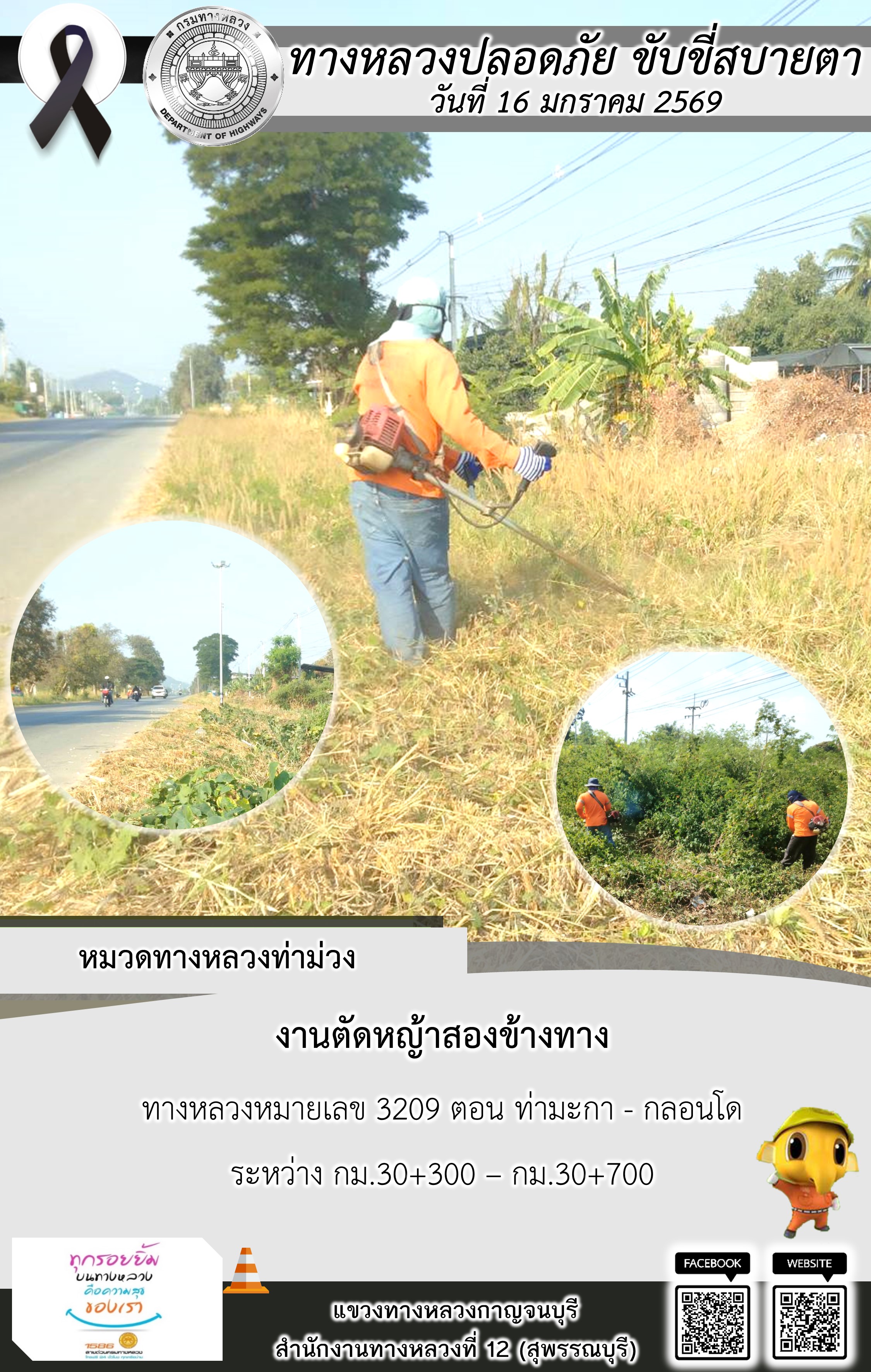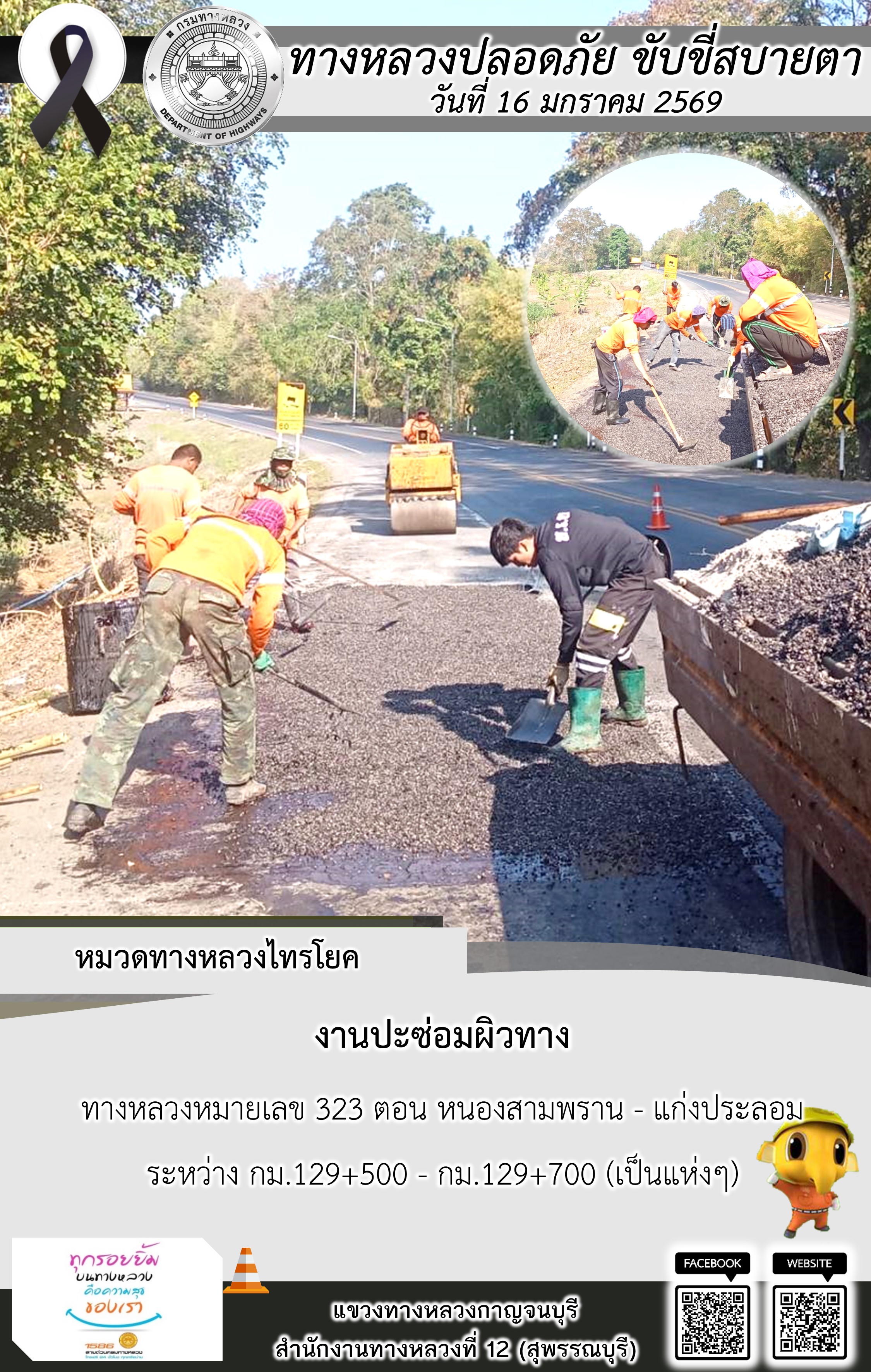 ข้อมูลภาพกิจกรรม : แขวงทางหลวงกาญจนบุรี โดยหมวดทางหลวงในสังกัด และงานอำนวยความปลอดภัยปฏิบัติงาน ประจำวันที่ 16 ม.ค. 69