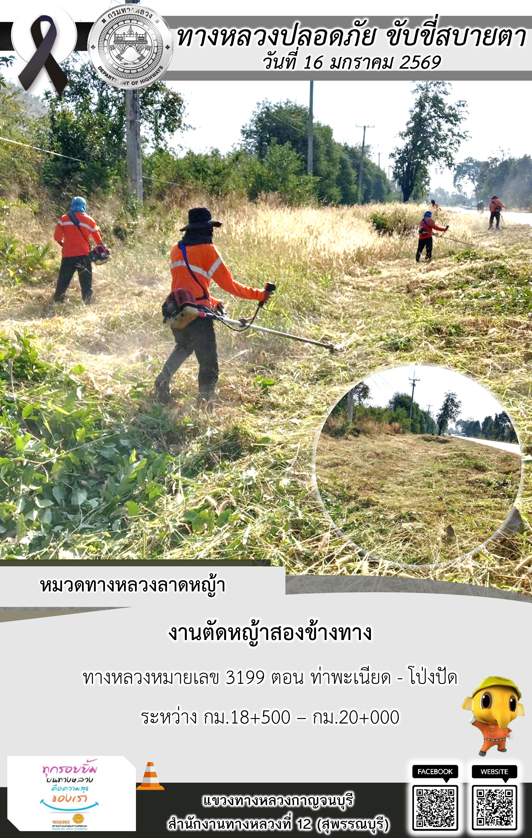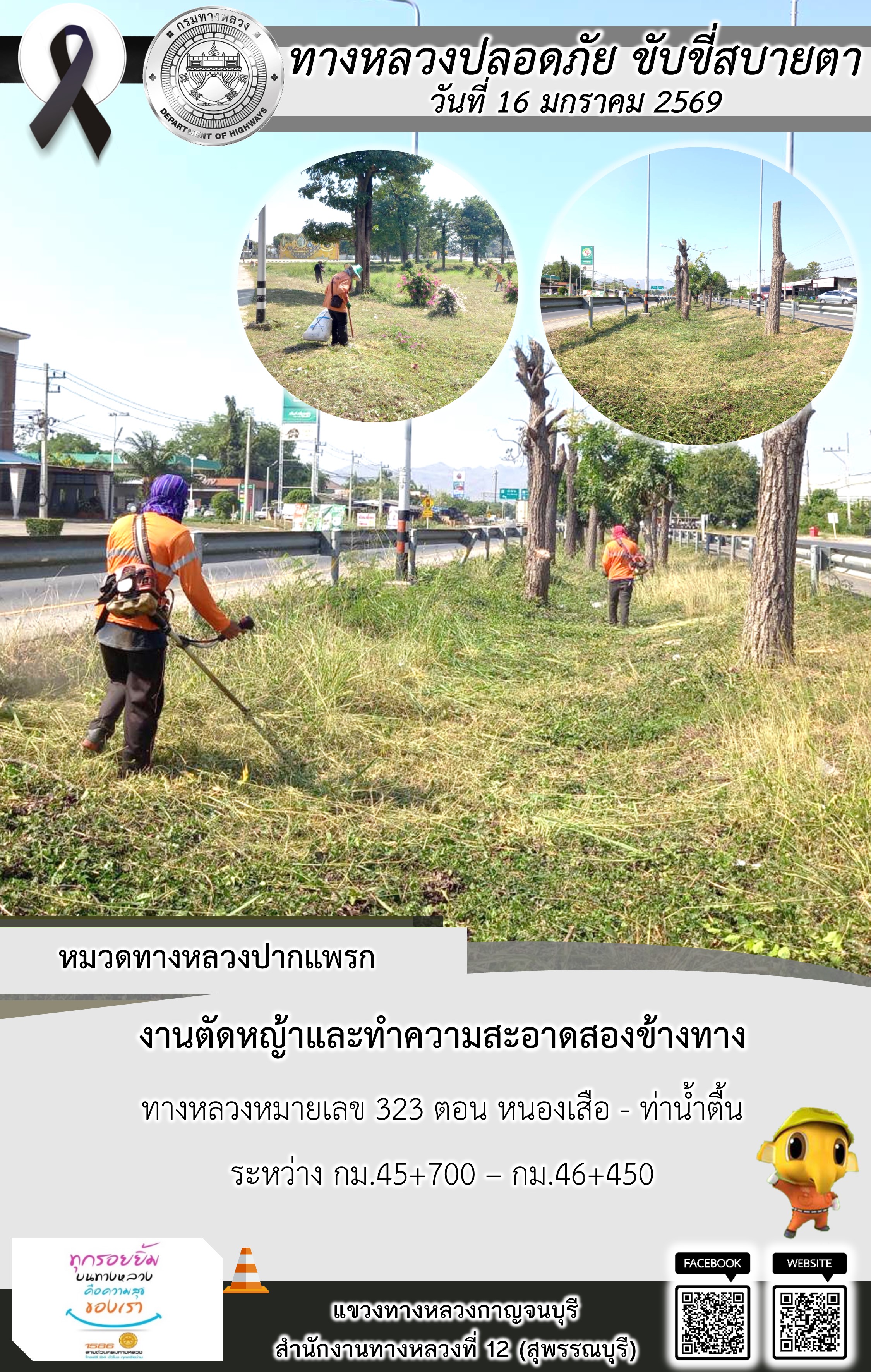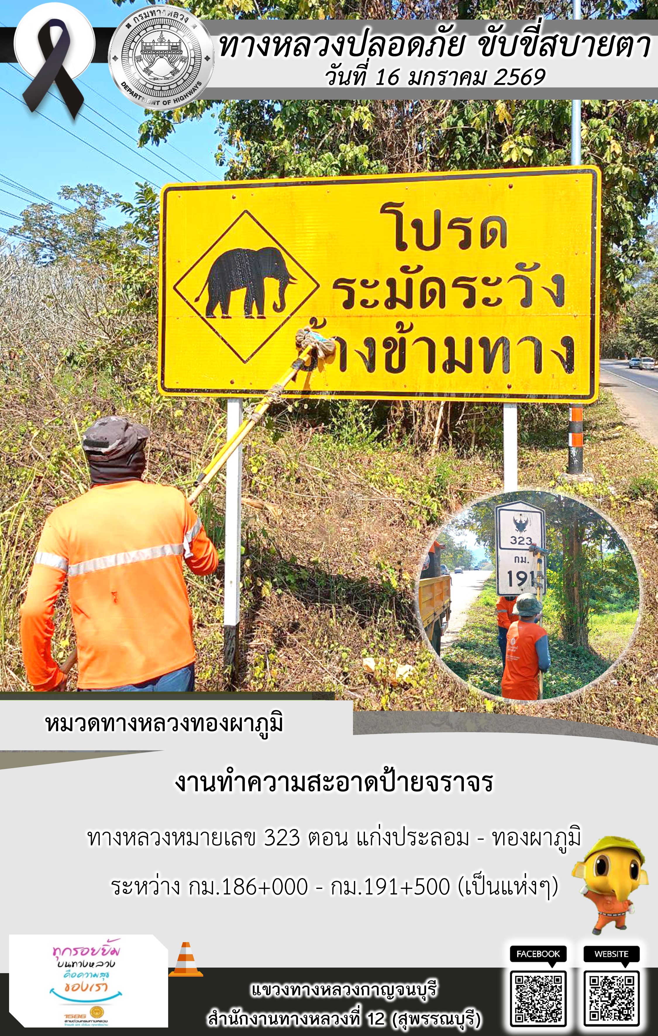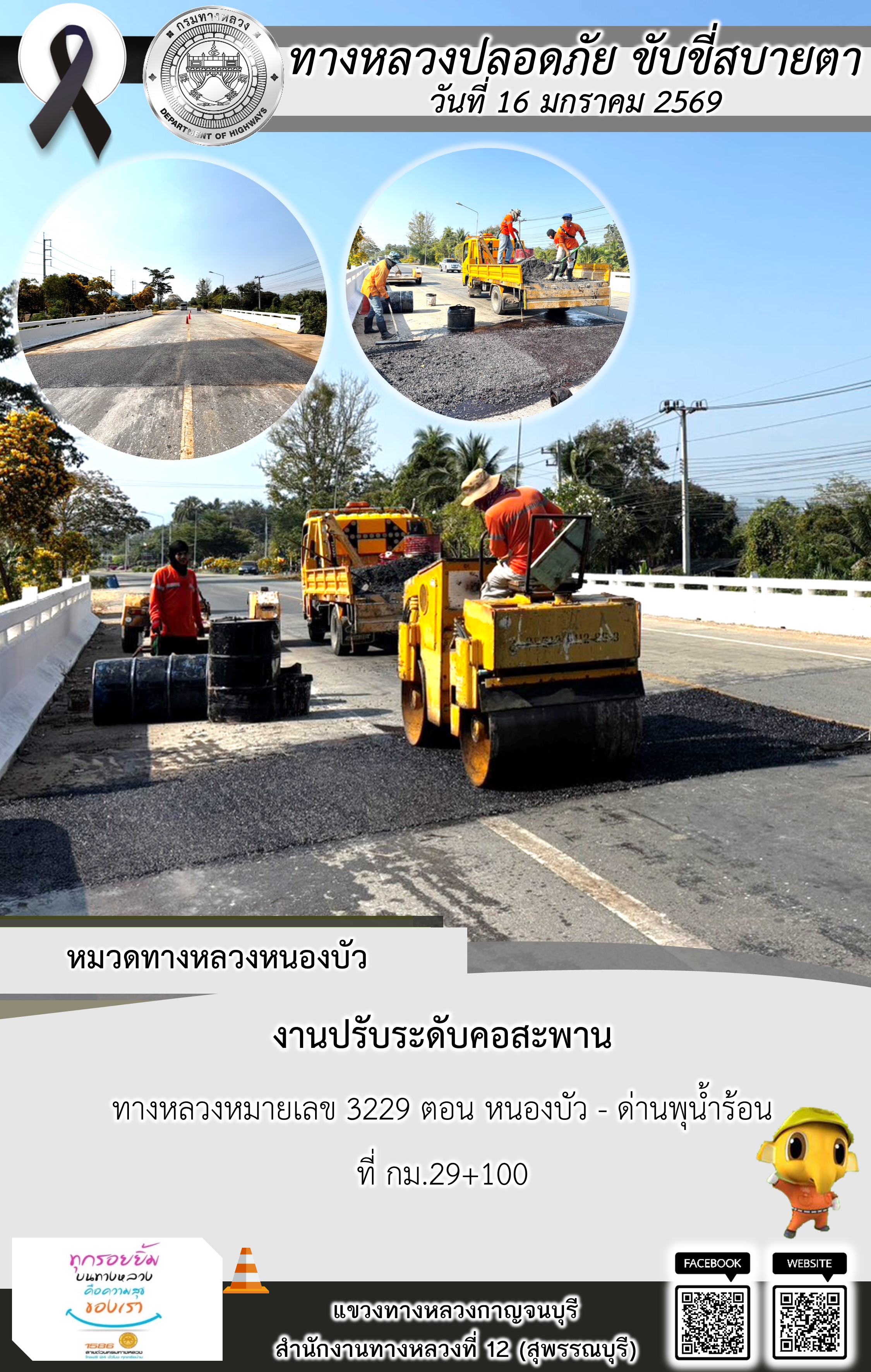 ข้อมูลภาพกิจกรรม : แขวงทางหลวงกาญจนบุรี โดยหมวดทางหลวงในสังกัด และงานอำนวยความปลอดภัยปฏิบัติงาน ประจำวันที่ 16 ม.ค. 69