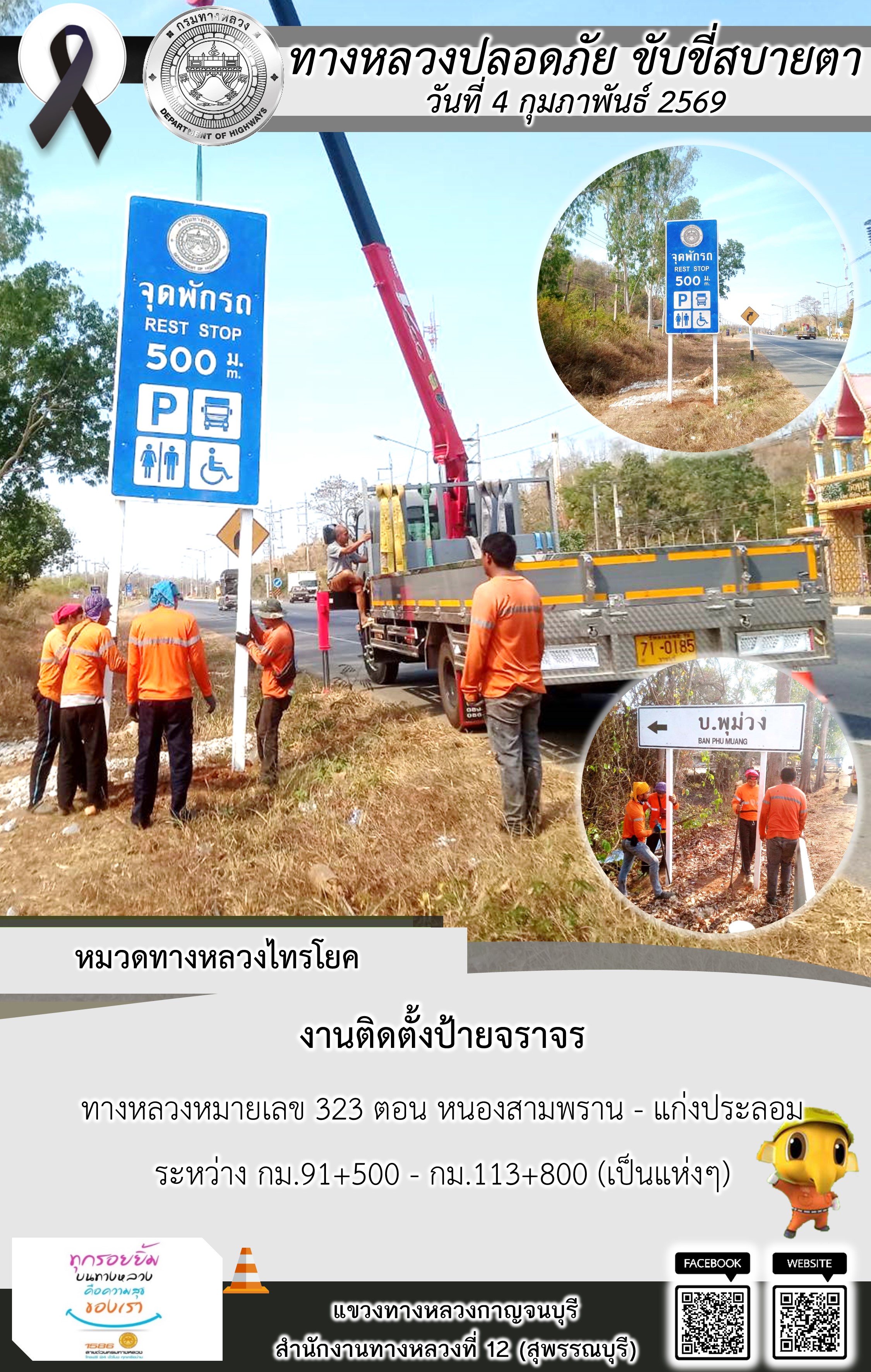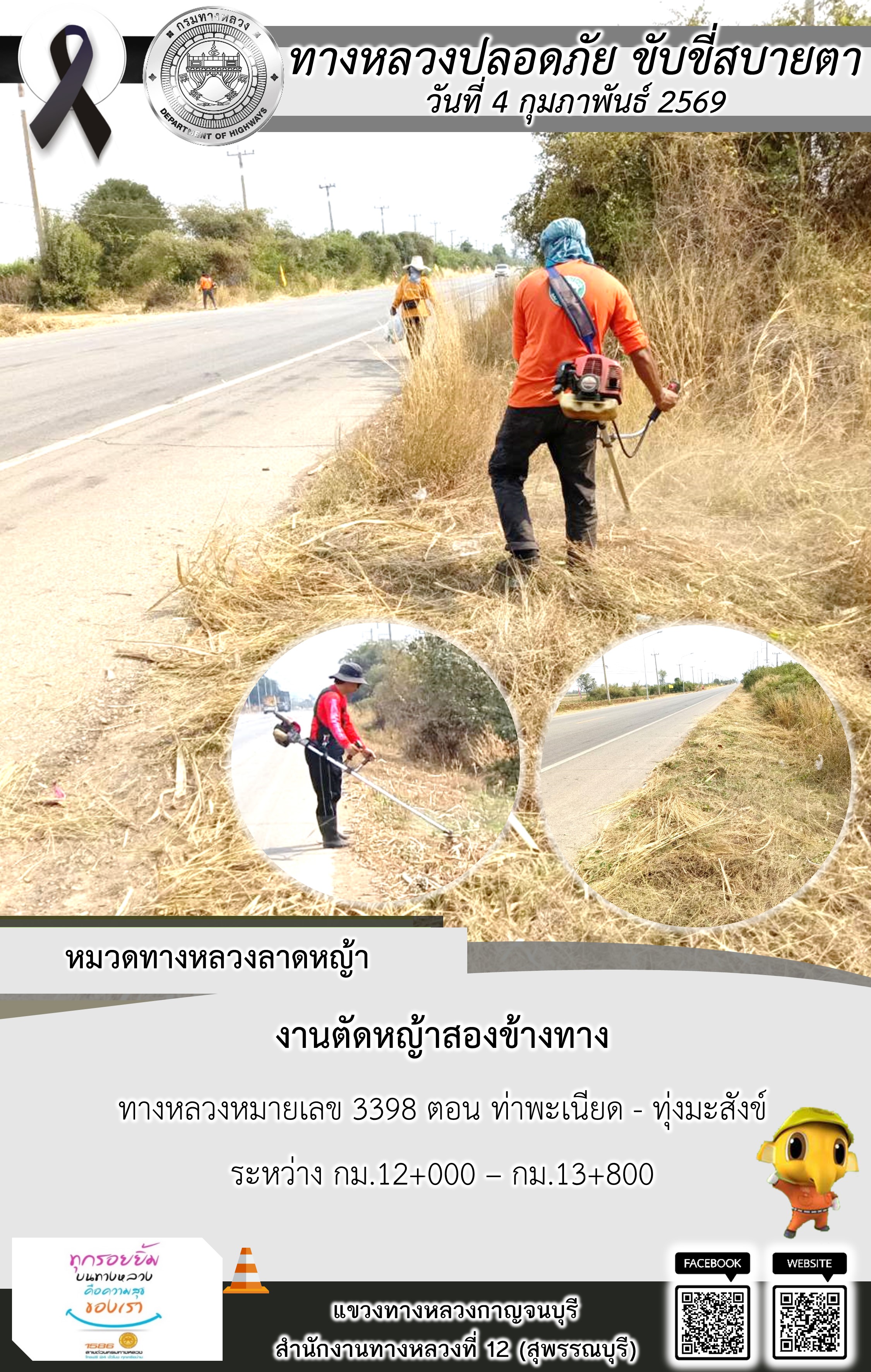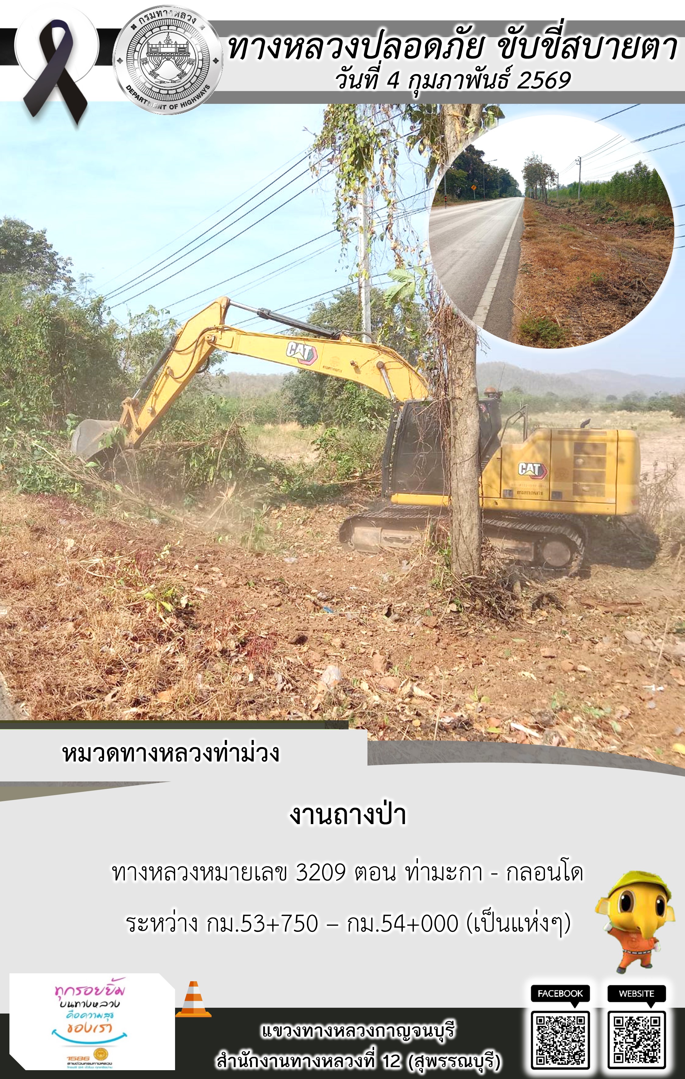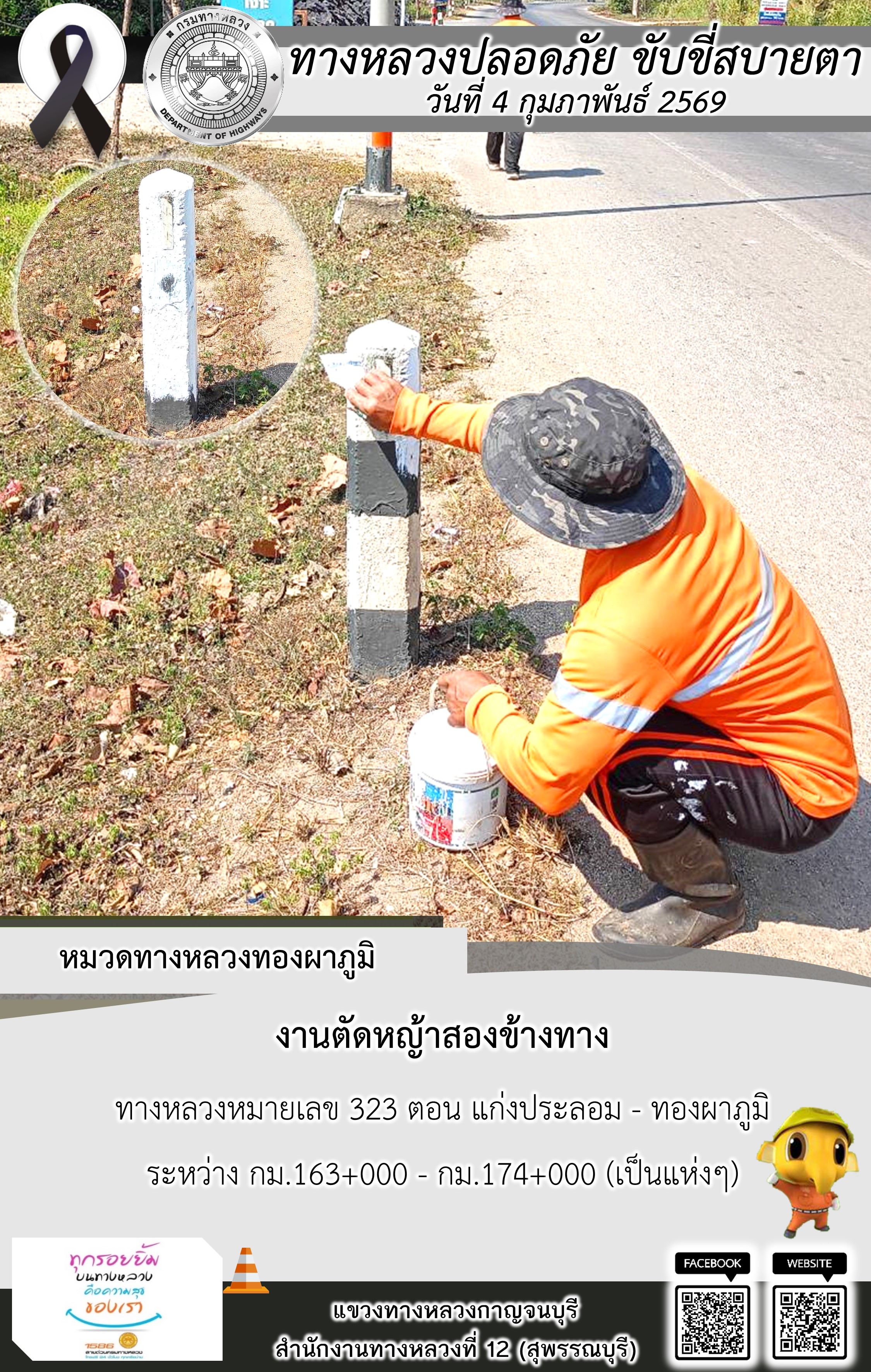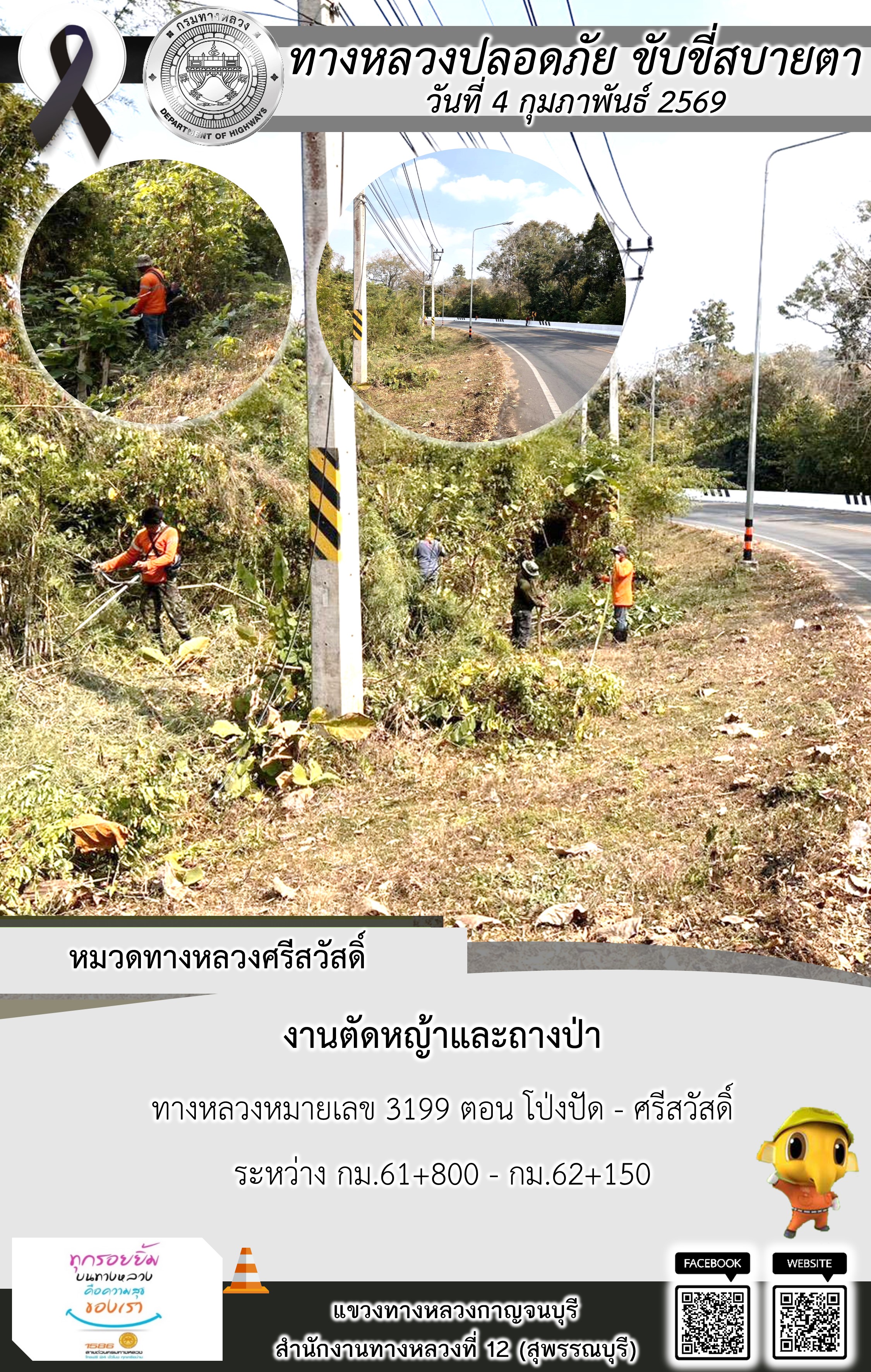 แขวงทางหลวงกาญจนบุรี โดยหมวดทางหลวงในสังกัด และงานอำนวยความปลอดภัยปฏิบัติงาน ประจำวันที่ 4 ก.พ. 69