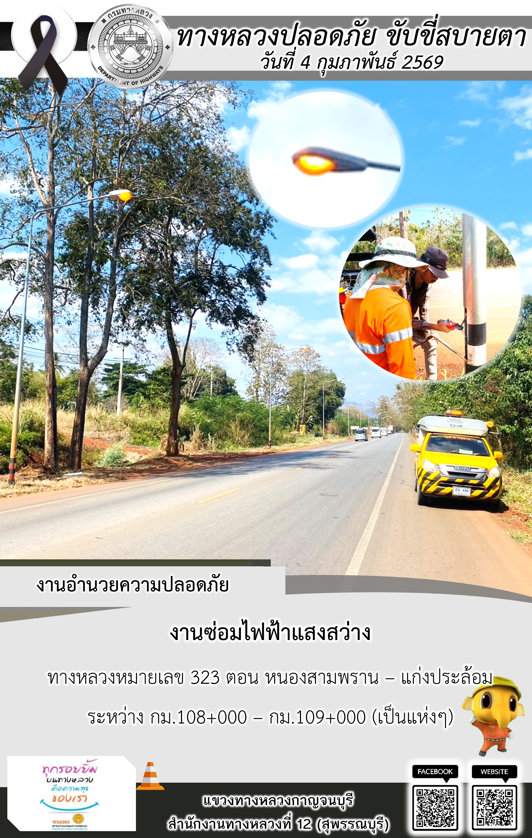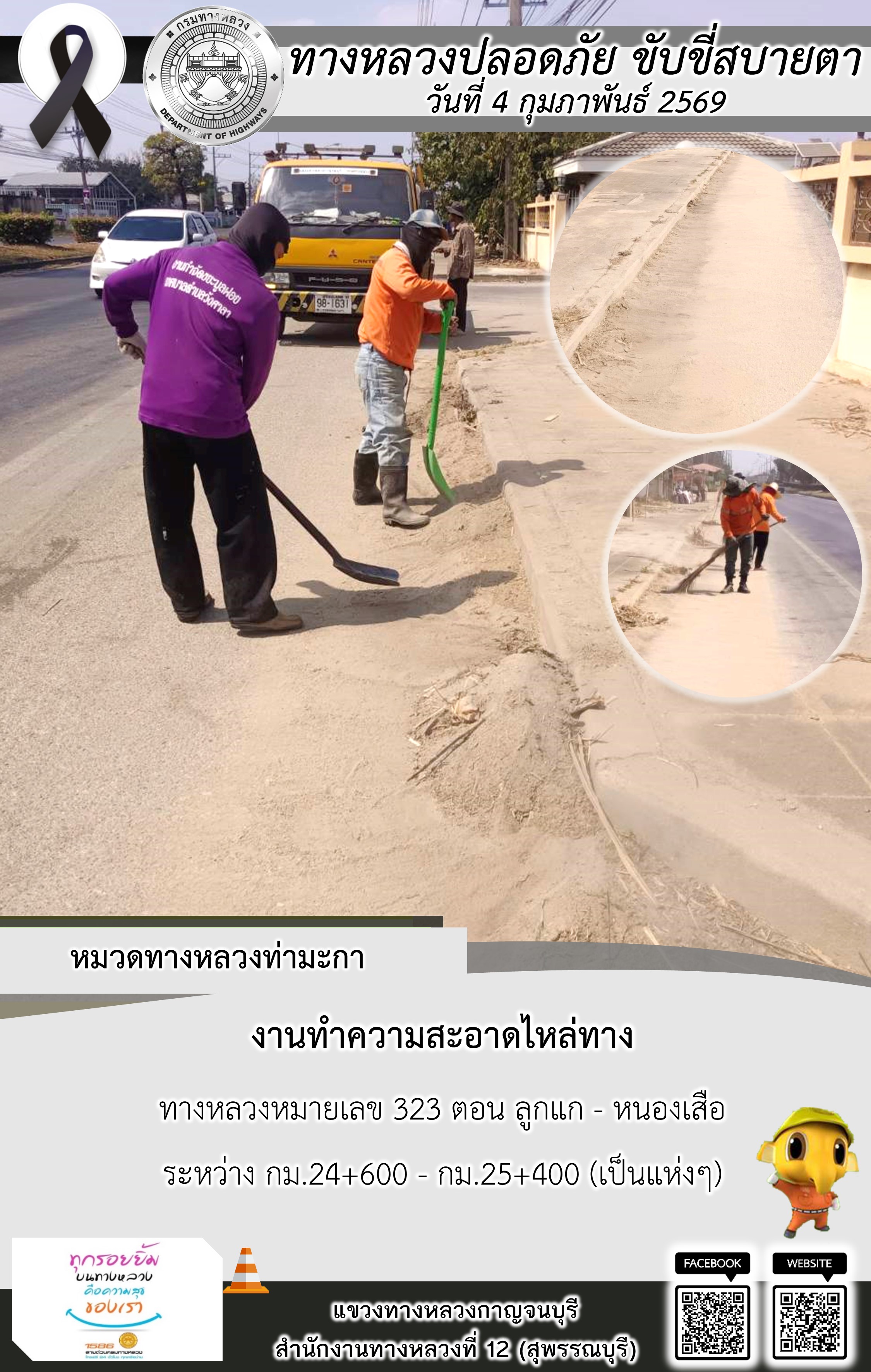 ข้อมูลภาพกิจกรรม : แขวงทางหลวงกาญจนบุรี โดยหมวดทางหลวงในสังกัด และงานอำนวยความปลอดภัยปฏิบัติงาน ประจำวันที่ 4 ก.พ. 69