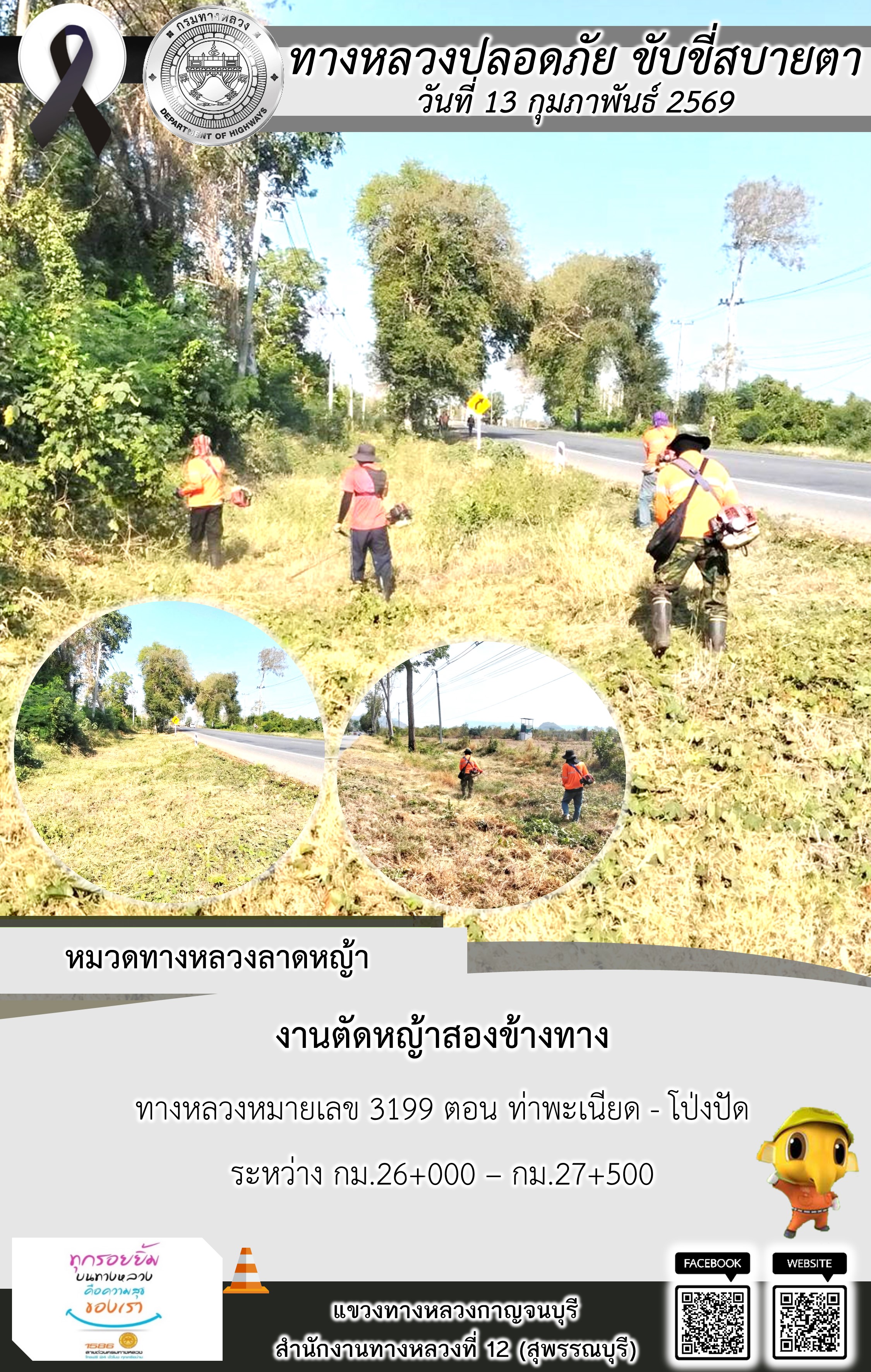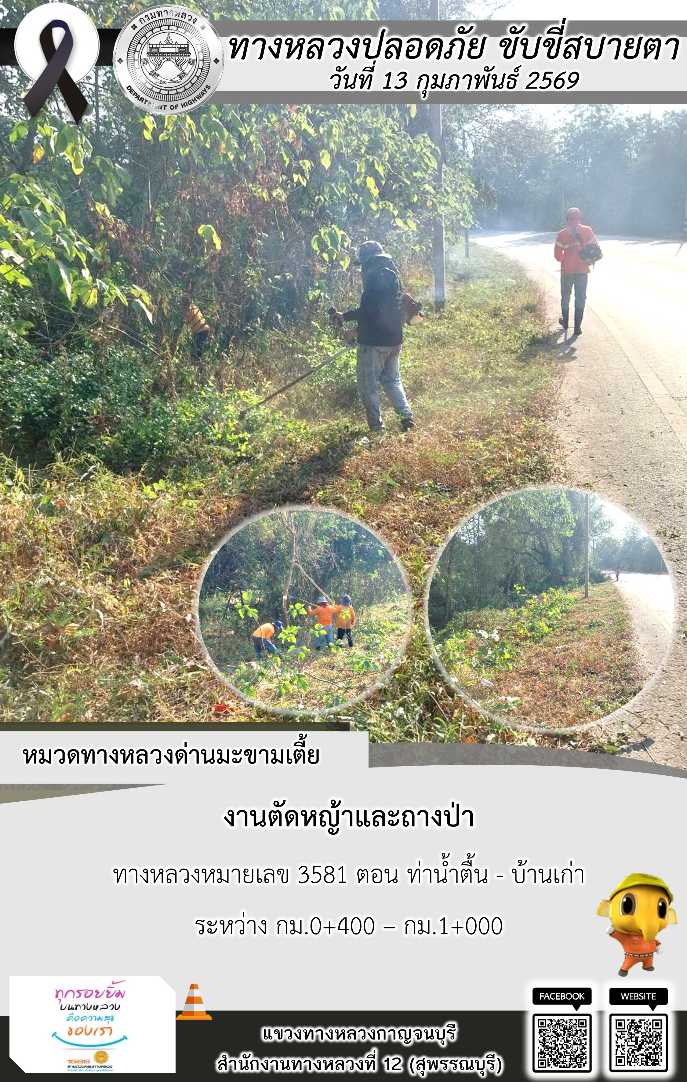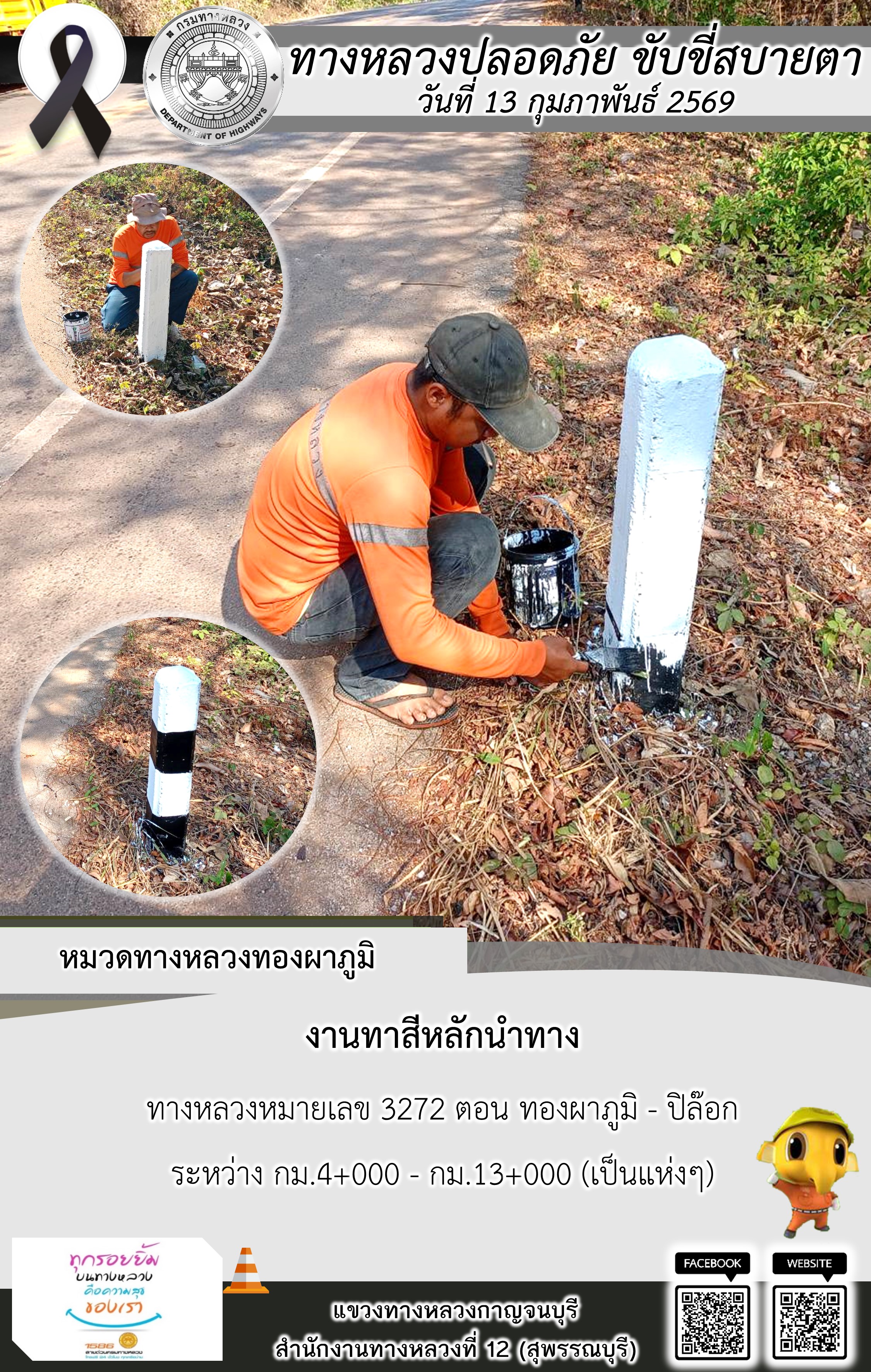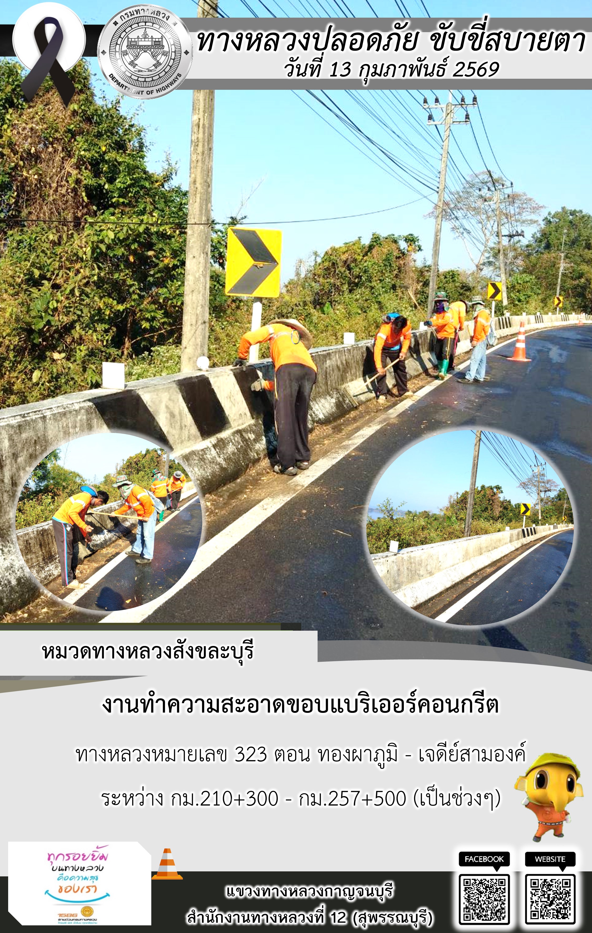 ข้อมูลภาพกิจกรรม : แขวงทางหลวงกาญจนบุรี โดยหมวดทางหลวงในสังกัด และงานอำนวยความปลอดภัยปฏิบัติงาน ประจำวันที่ 13 ก.พ. 69