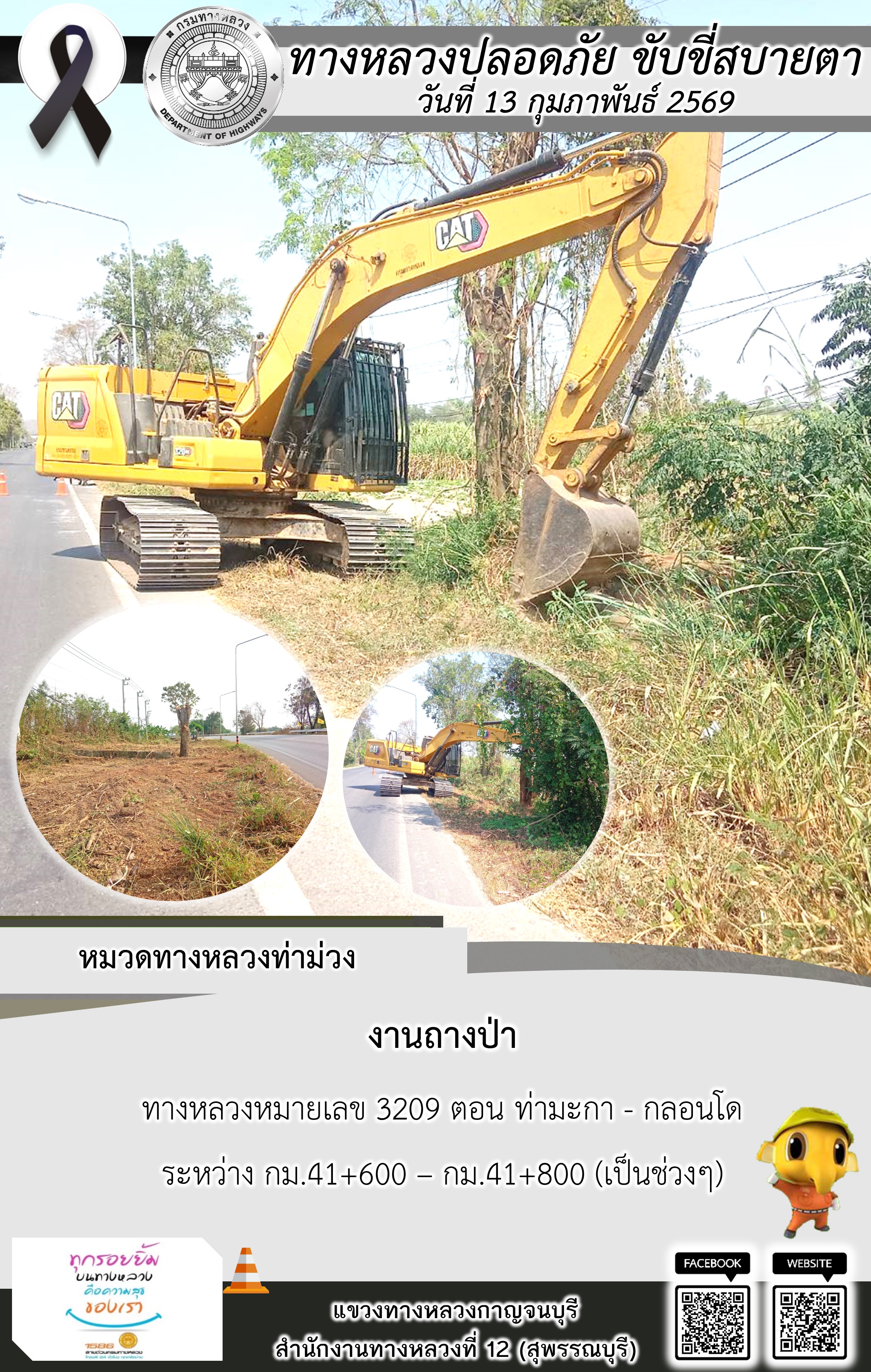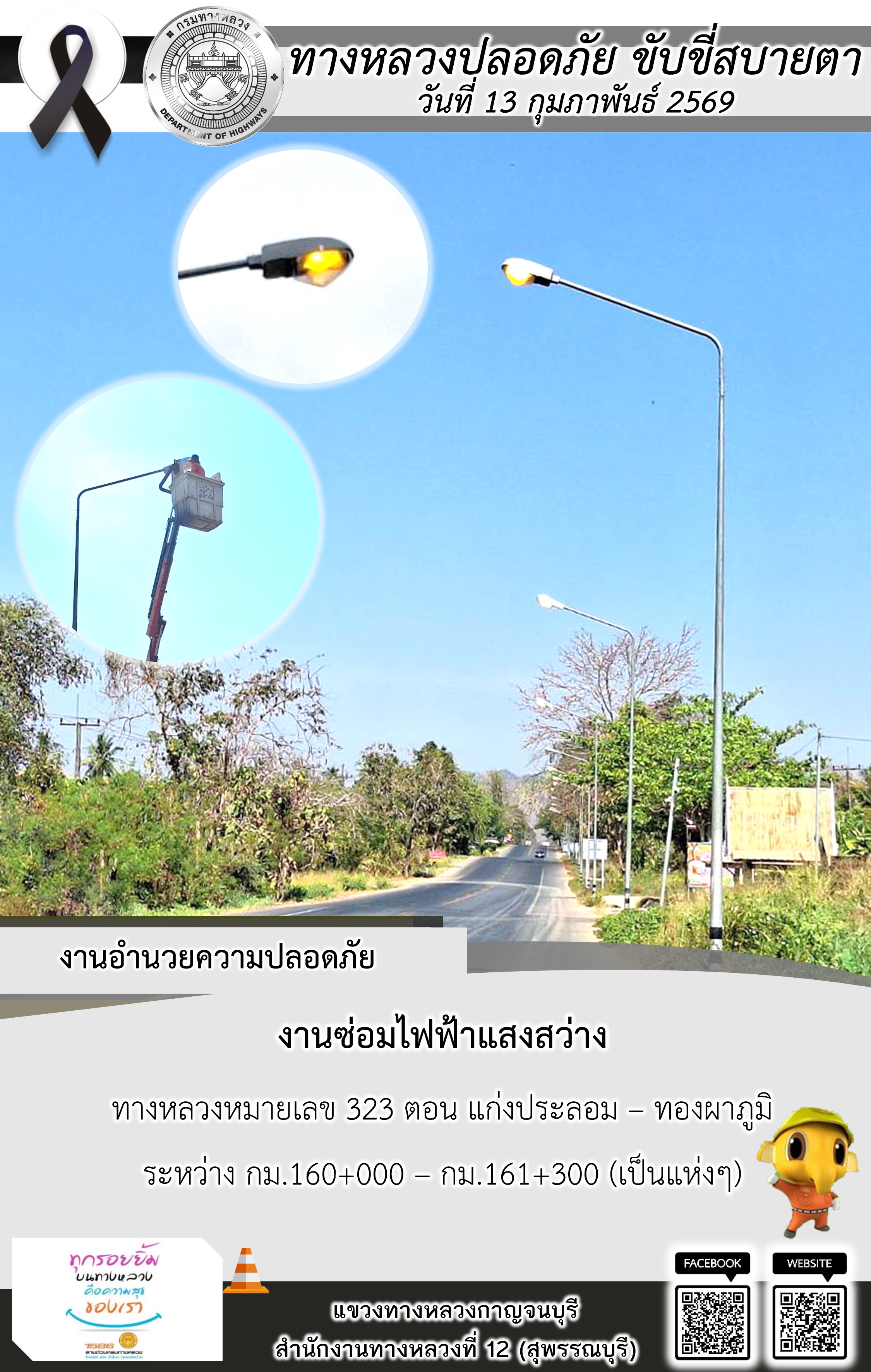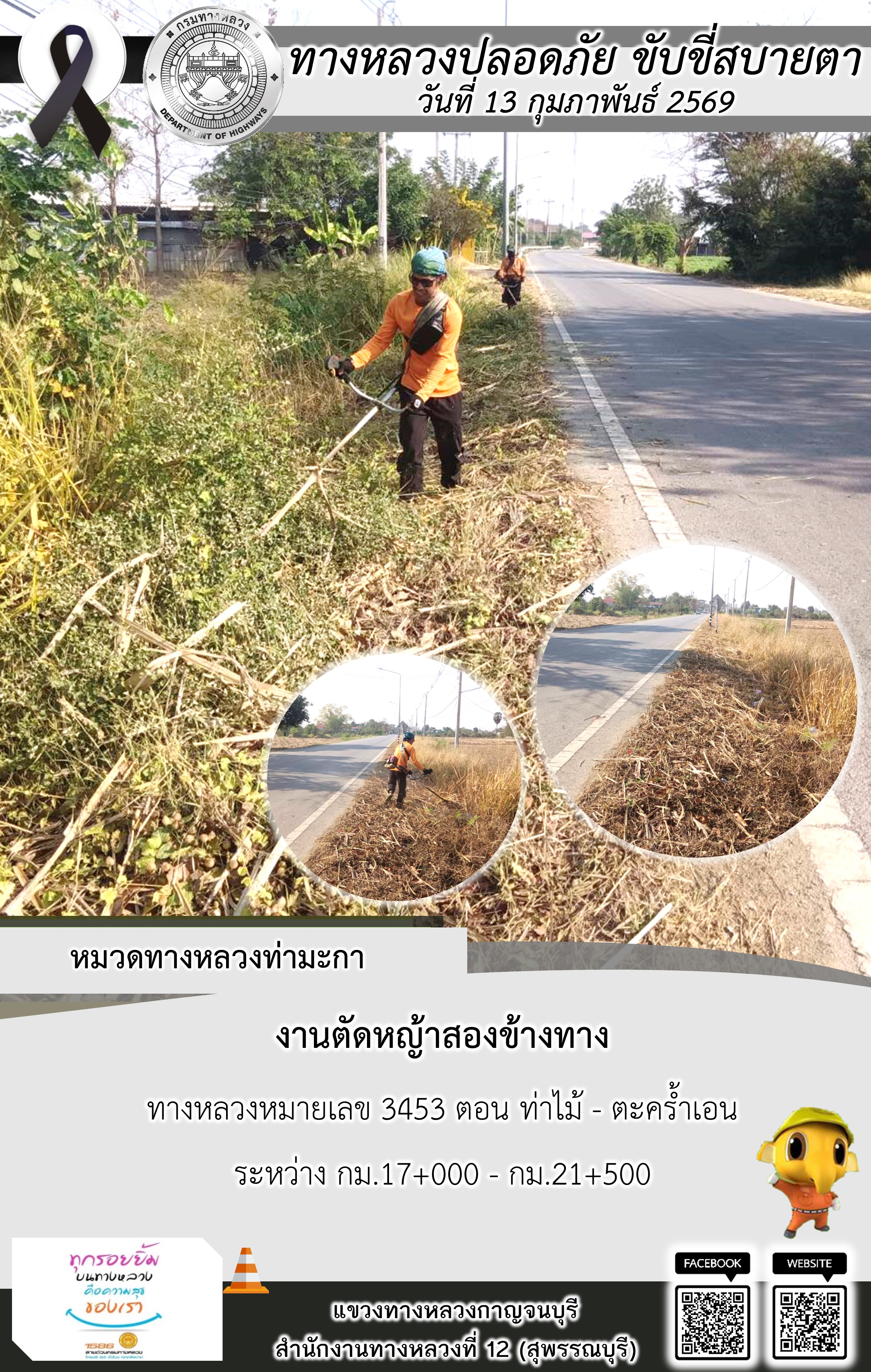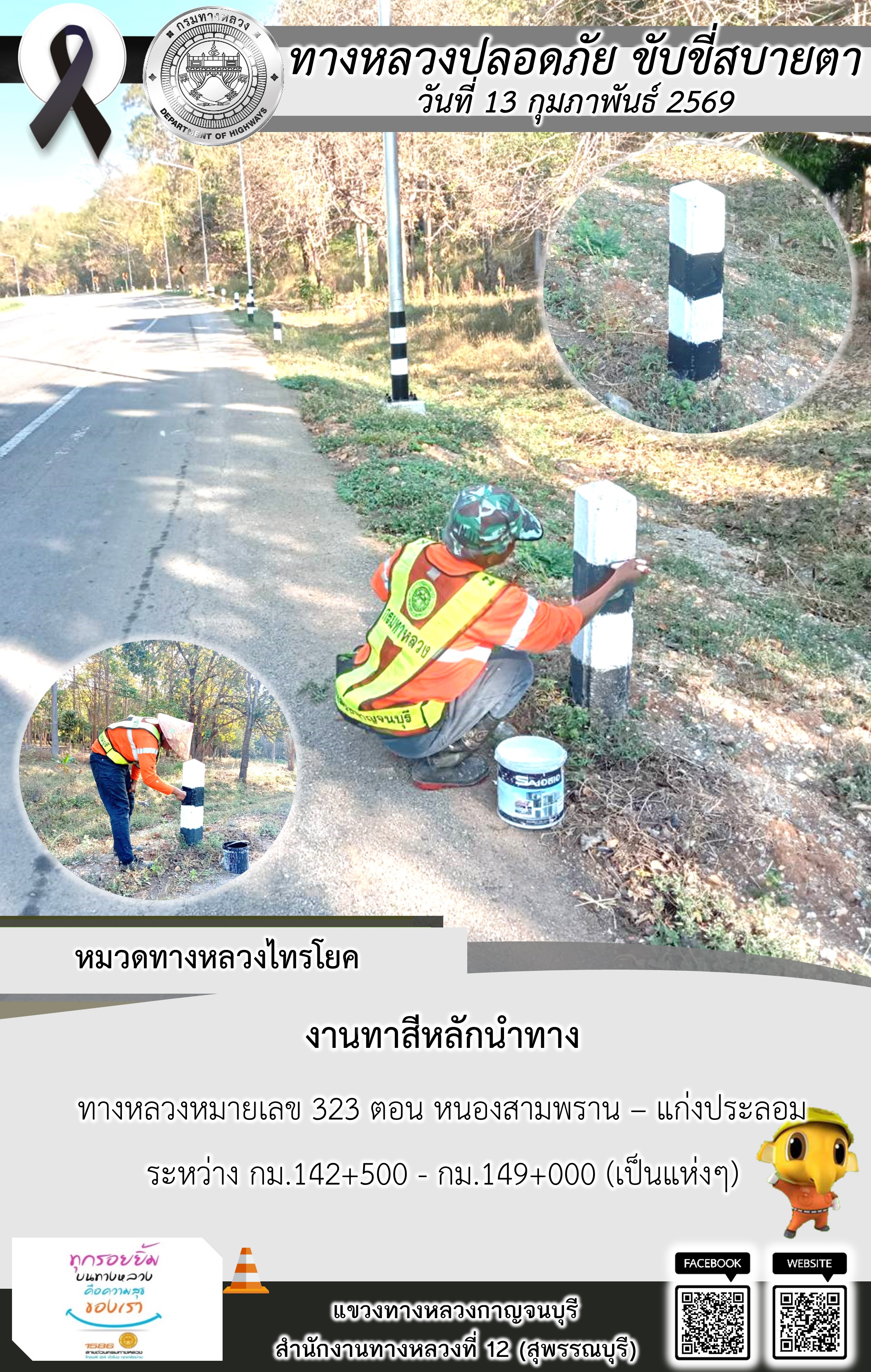 ข้อมูลภาพกิจกรรม : แขวงทางหลวงกาญจนบุรี โดยหมวดทางหลวงในสังกัด และงานอำนวยความปลอดภัยปฏิบัติงาน ประจำวันที่ 13 ก.พ. 69