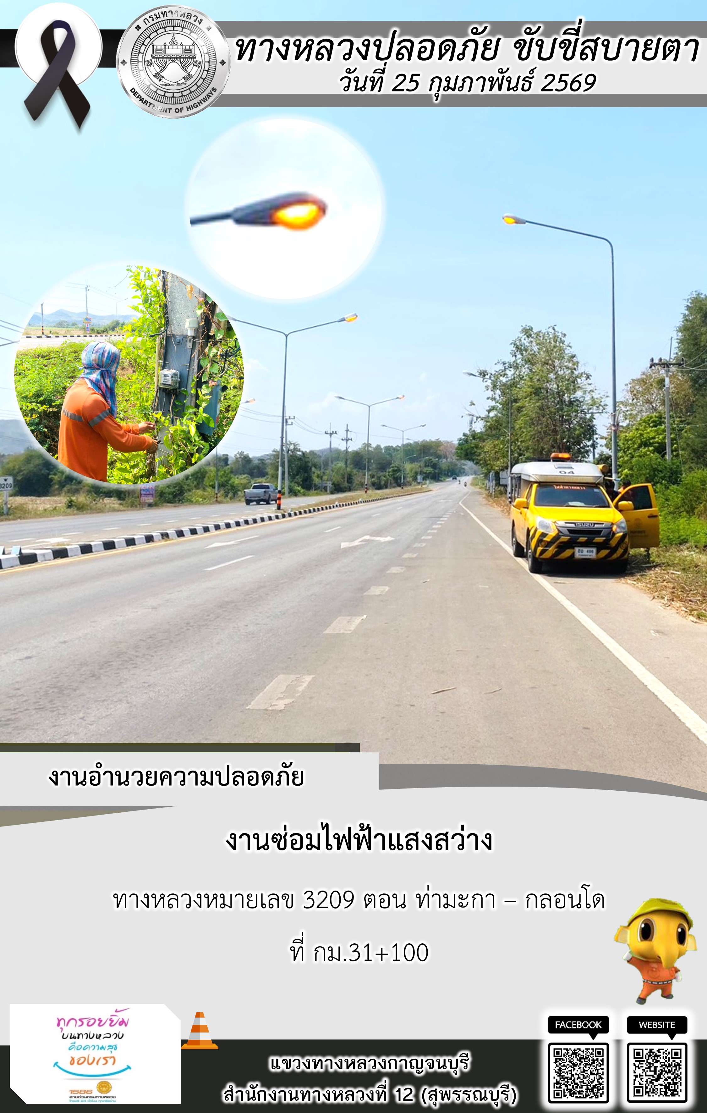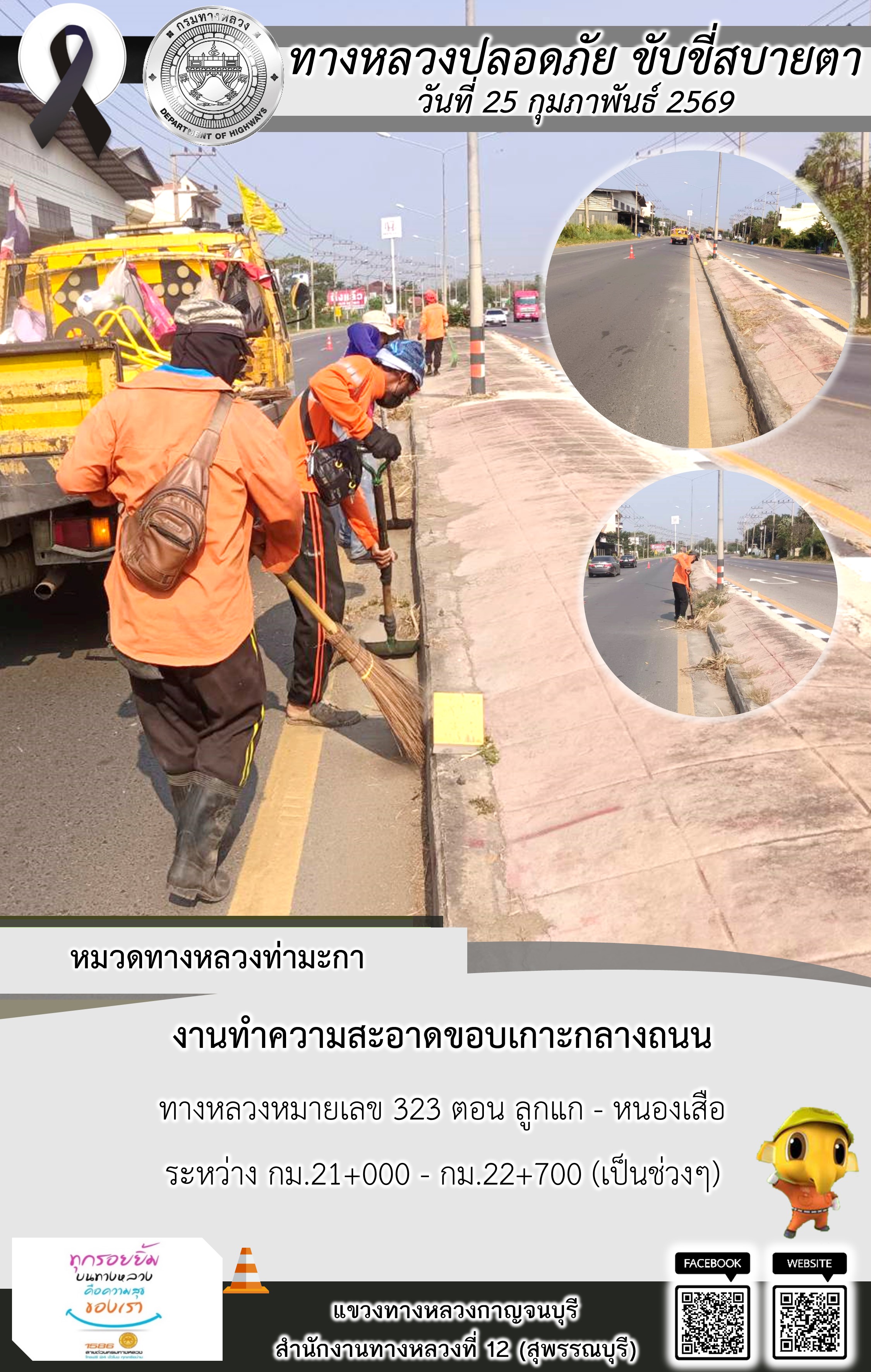 ข้อมูลภาพกิจกรรม : แขวงทางหลวงกาญจนบุรี โดยหมวดทางหลวงในสังกัด และงานอำนวยความปลอดภัยปฏิบัติงาน ประจำวันที่ 25 ก.พ. 69