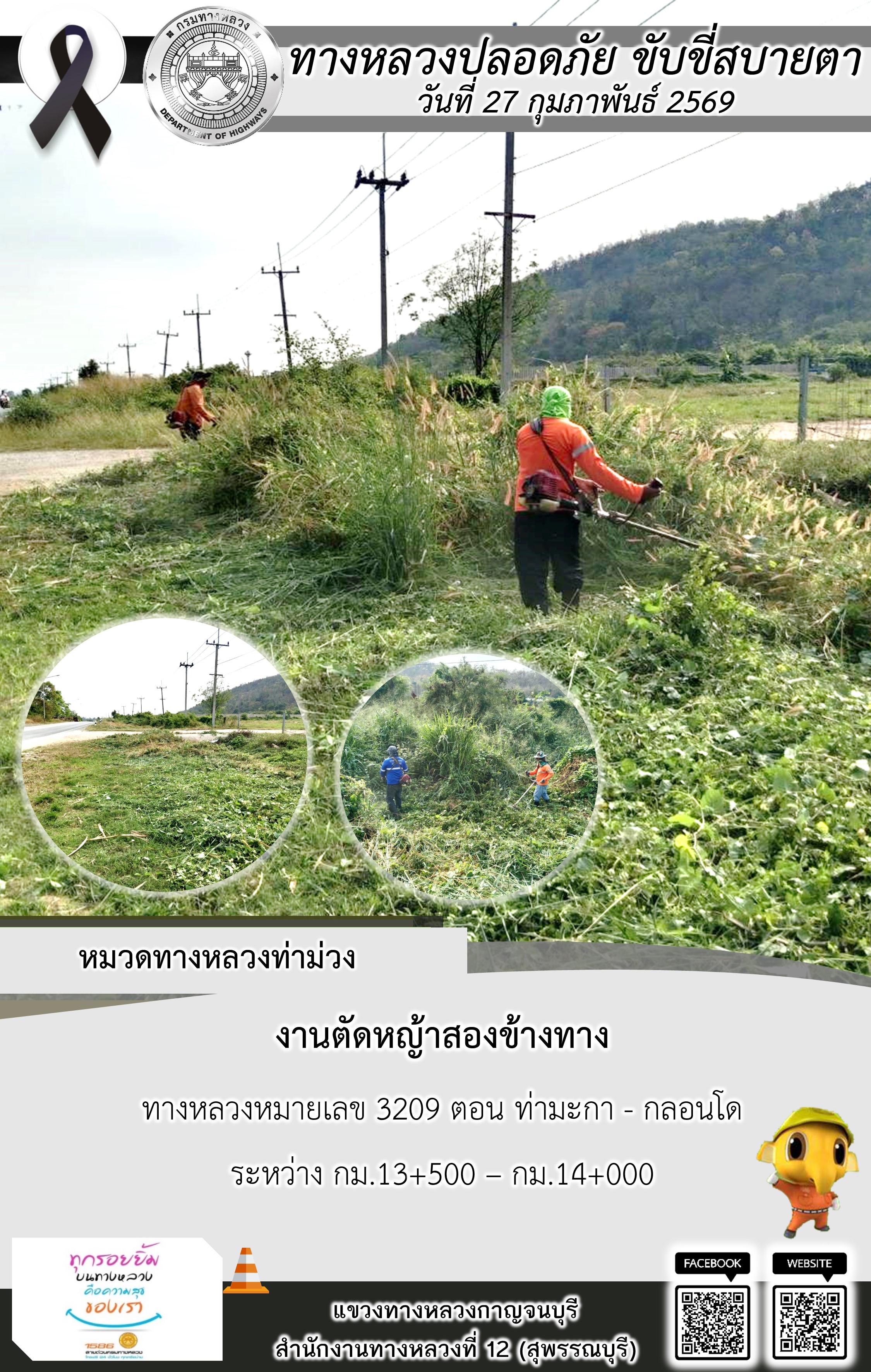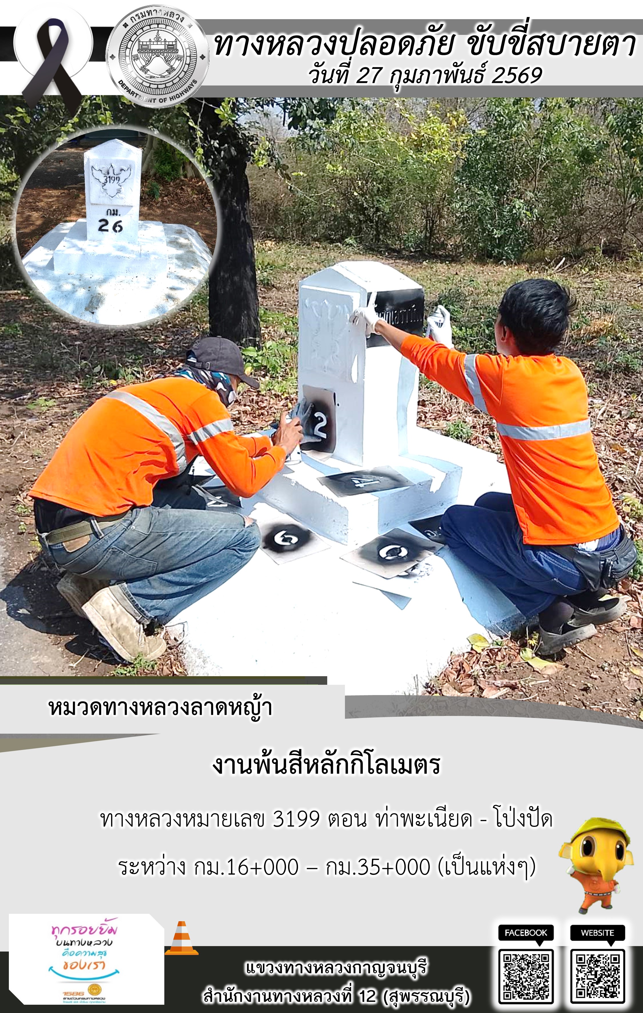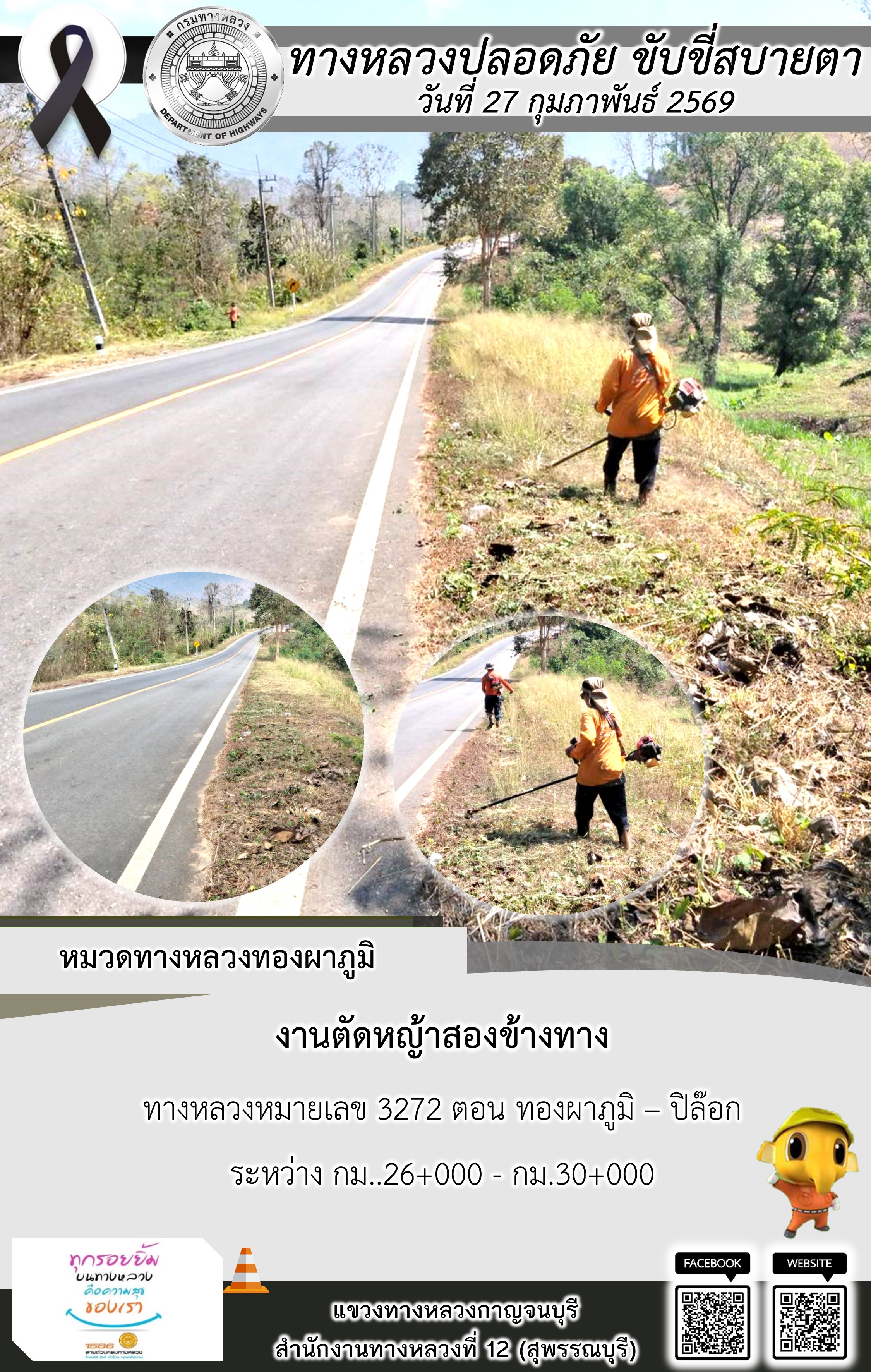 ข้อมูลภาพกิจกรรม : แขวงทางหลวงกาญจนบุรี โดยหมวดทางหลวงในสังกัด และงานอำนวยความปลอดภัยปฏิบัติงาน ประจำวันที่ 27 ก.พ. 69
