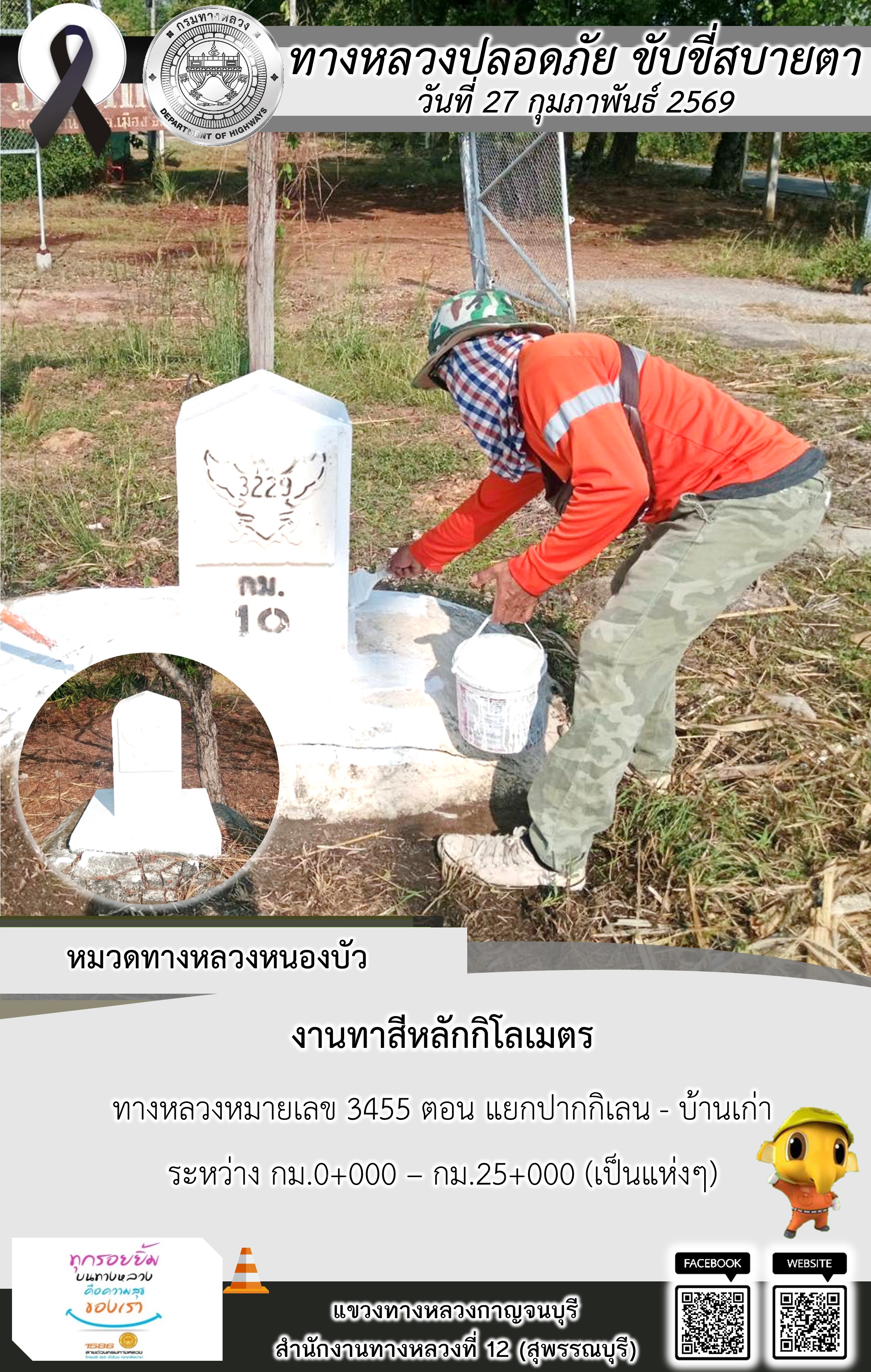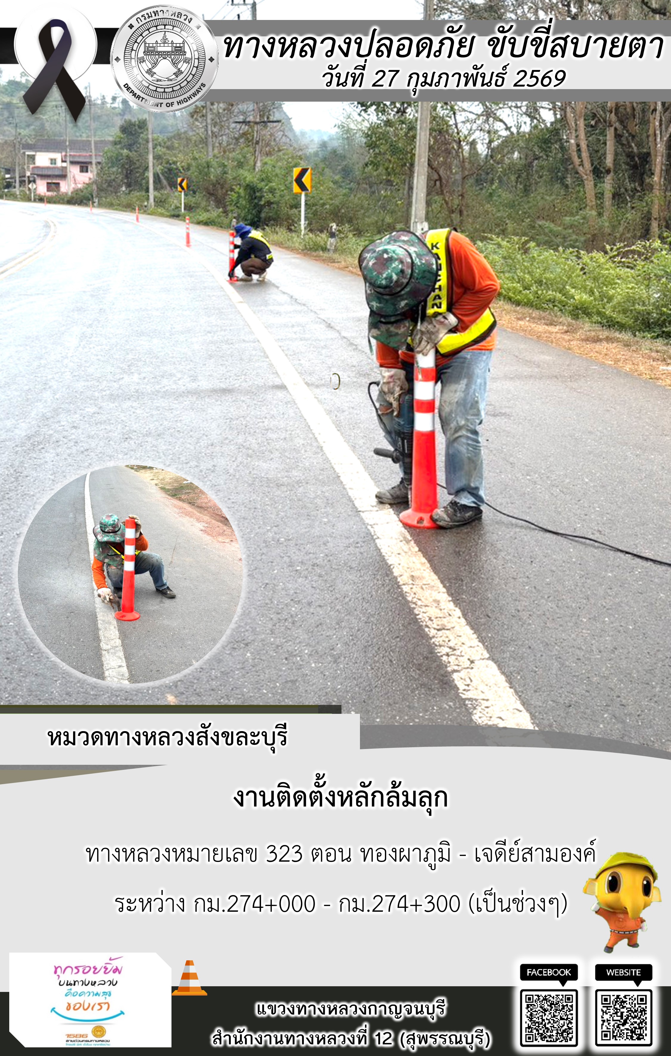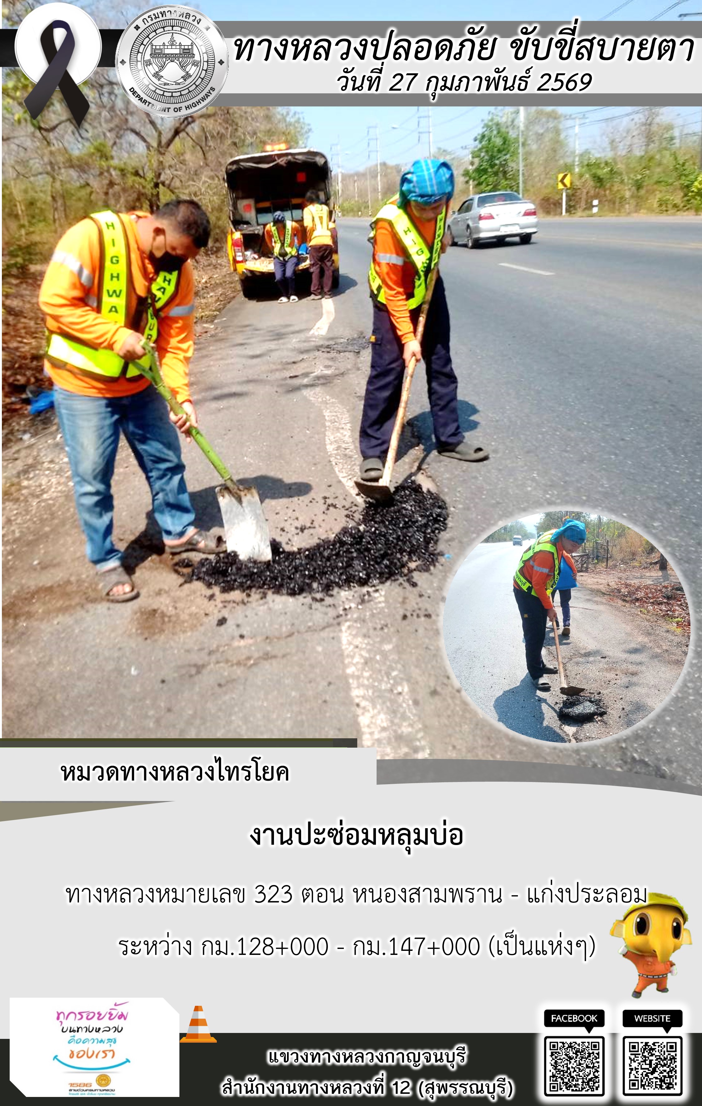 ข้อมูลภาพกิจกรรม : แขวงทางหลวงกาญจนบุรี โดยหมวดทางหลวงในสังกัด และงานอำนวยความปลอดภัยปฏิบัติงาน ประจำวันที่ 27 ก.พ. 69