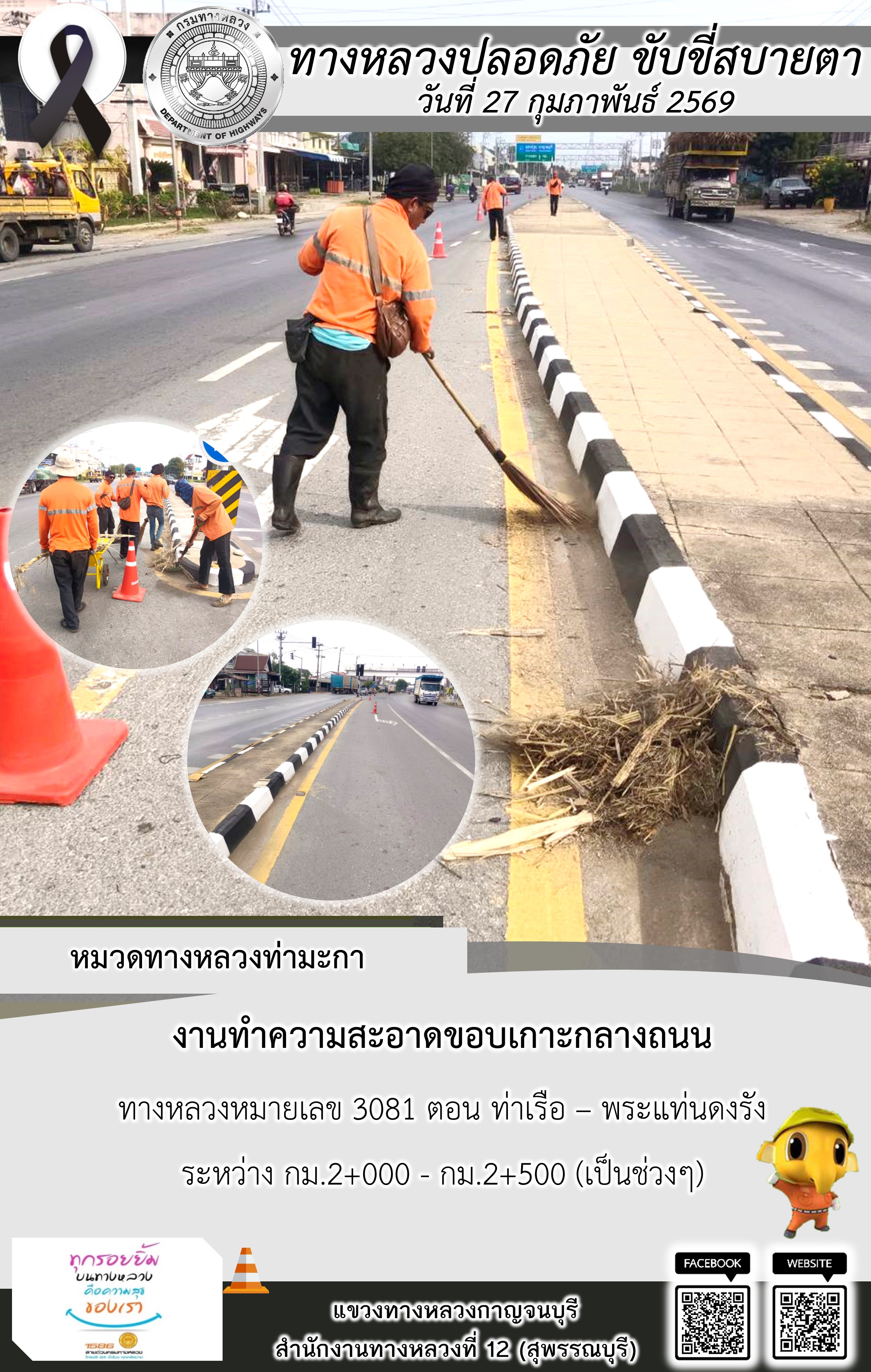 แขวงทางหลวงกาญจนบุรี โดยหมวดทางหลวงในสังกัด และงานอำนวยความปลอดภัยปฏิบัติงาน ประจำวันที่ 27 ก.พ. 69