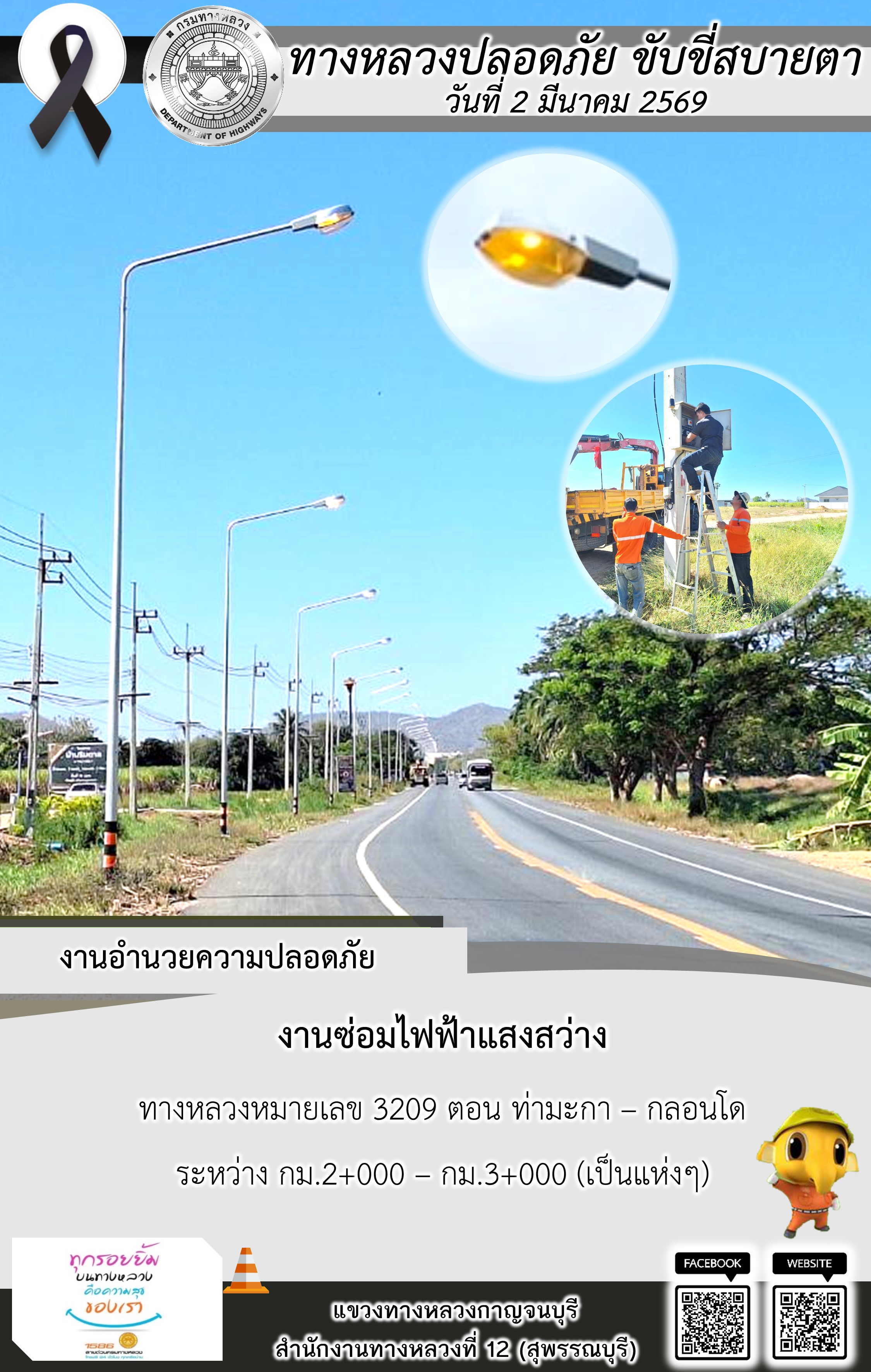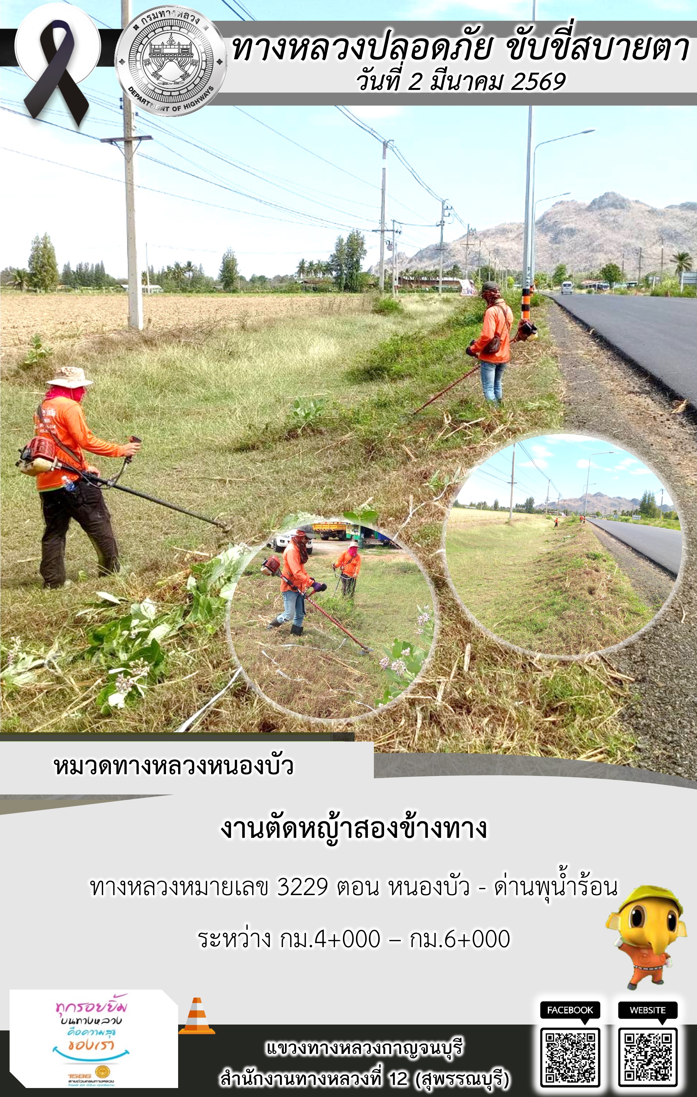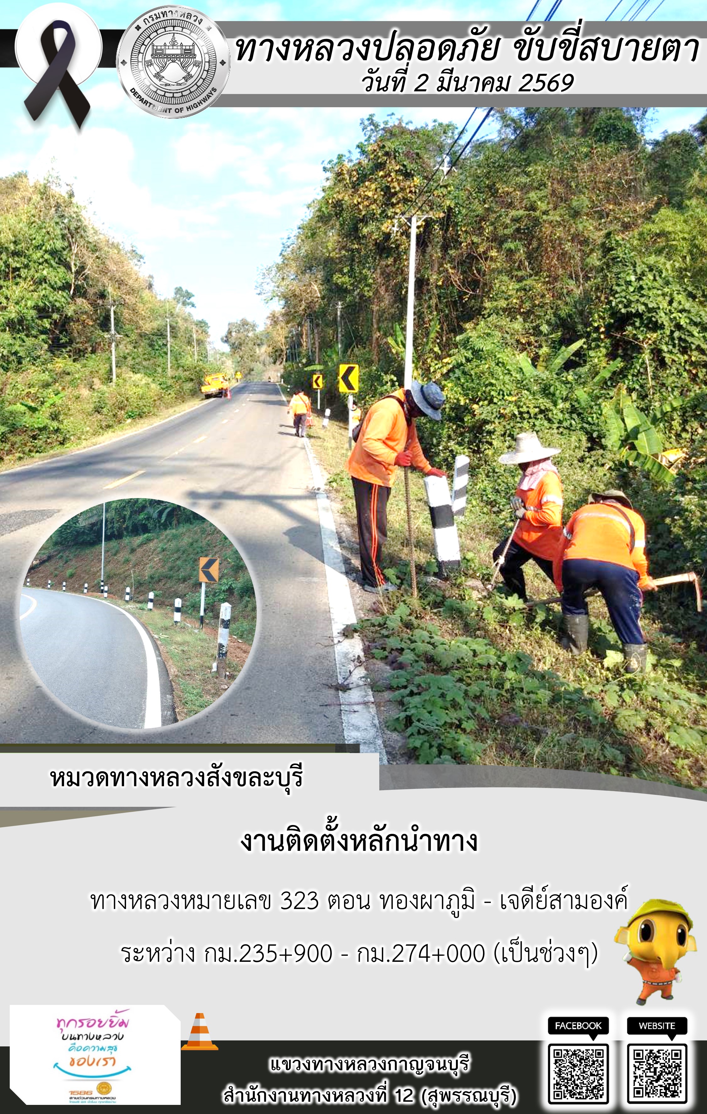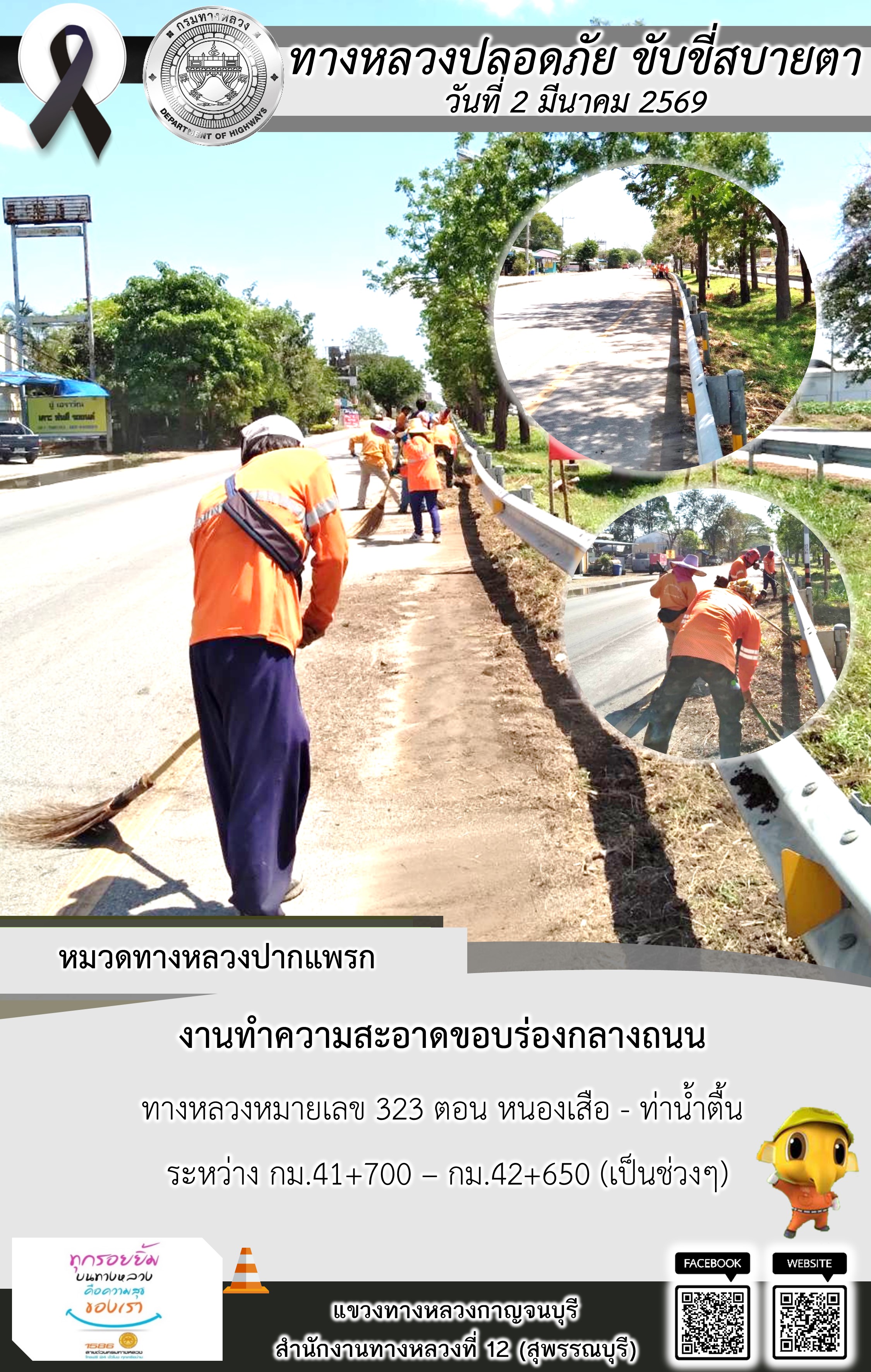 ข้อมูลภาพกิจกรรม : แขวงทางหลวงกาญจนบุรี โดยหมวดทางหลวงในสังกัด และงานอำนวยความปลอดภัยปฏิบัติงาน ประจำวันที่ 2 มี.ค. 69