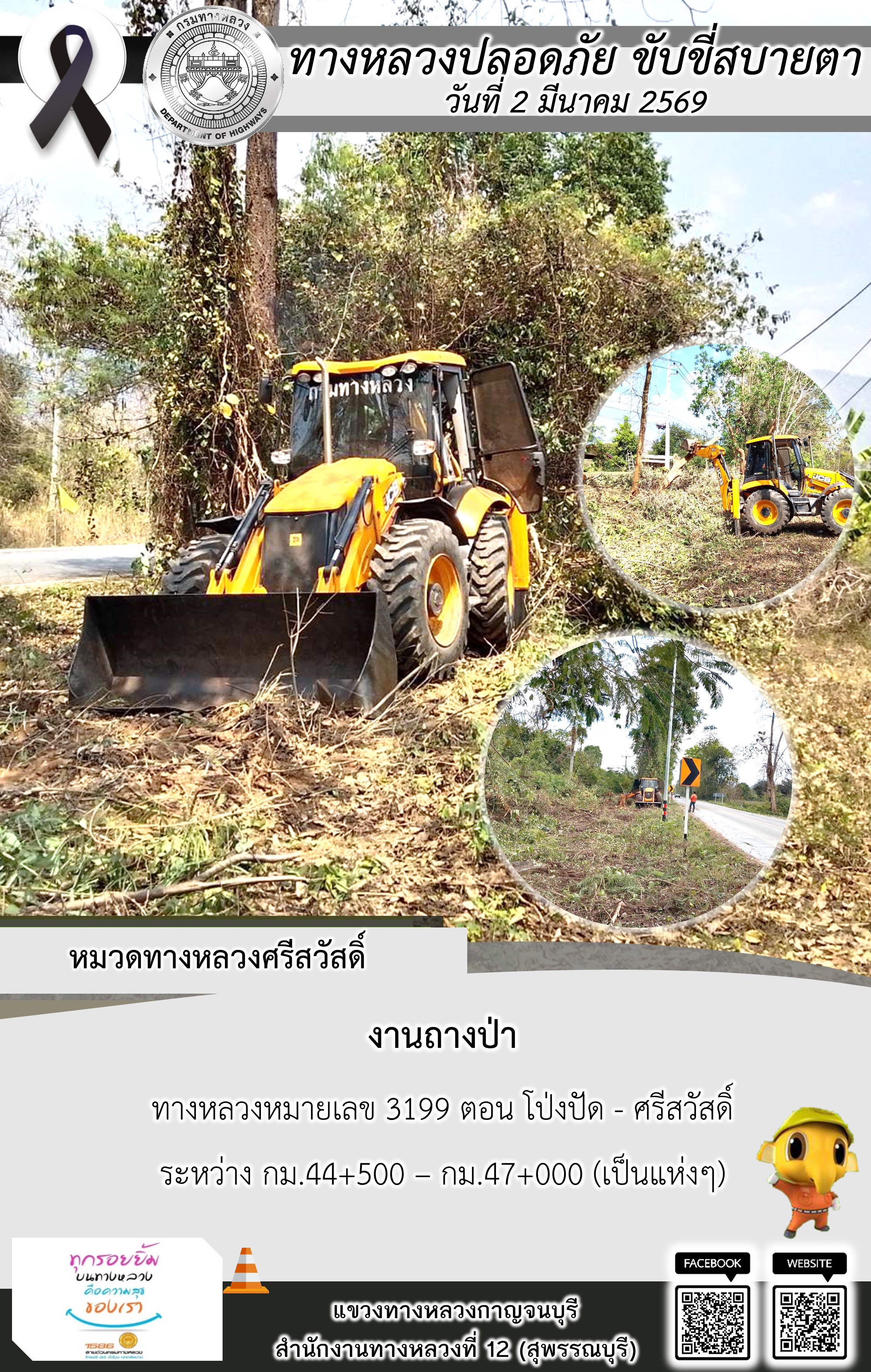 แขวงทางหลวงกาญจนบุรี โดยหมวดทางหลวงในสังกัด และงานอำนวยความปลอดภัยปฏิบัติงาน ประจำวันที่ 2 มี.ค. 69