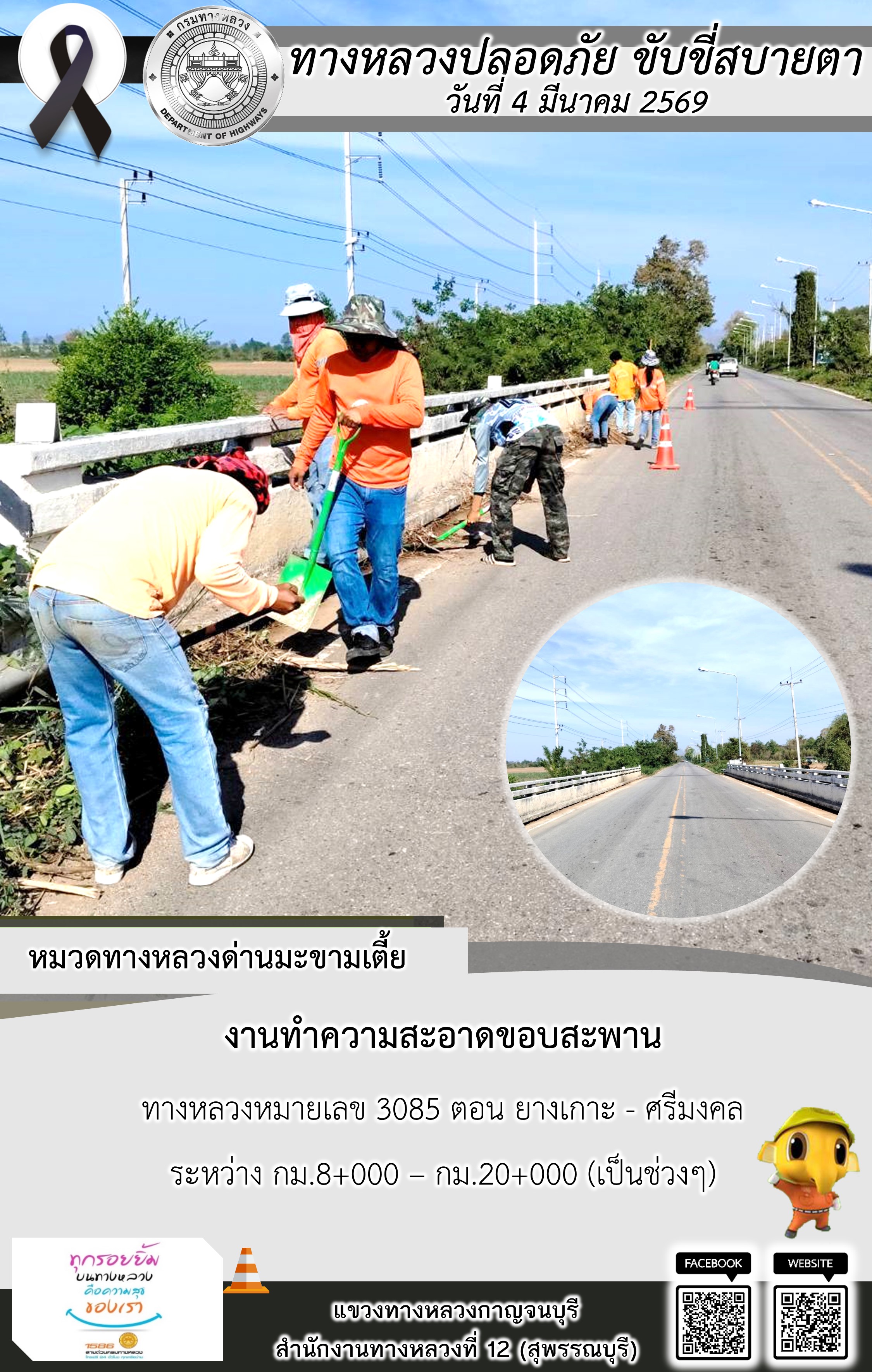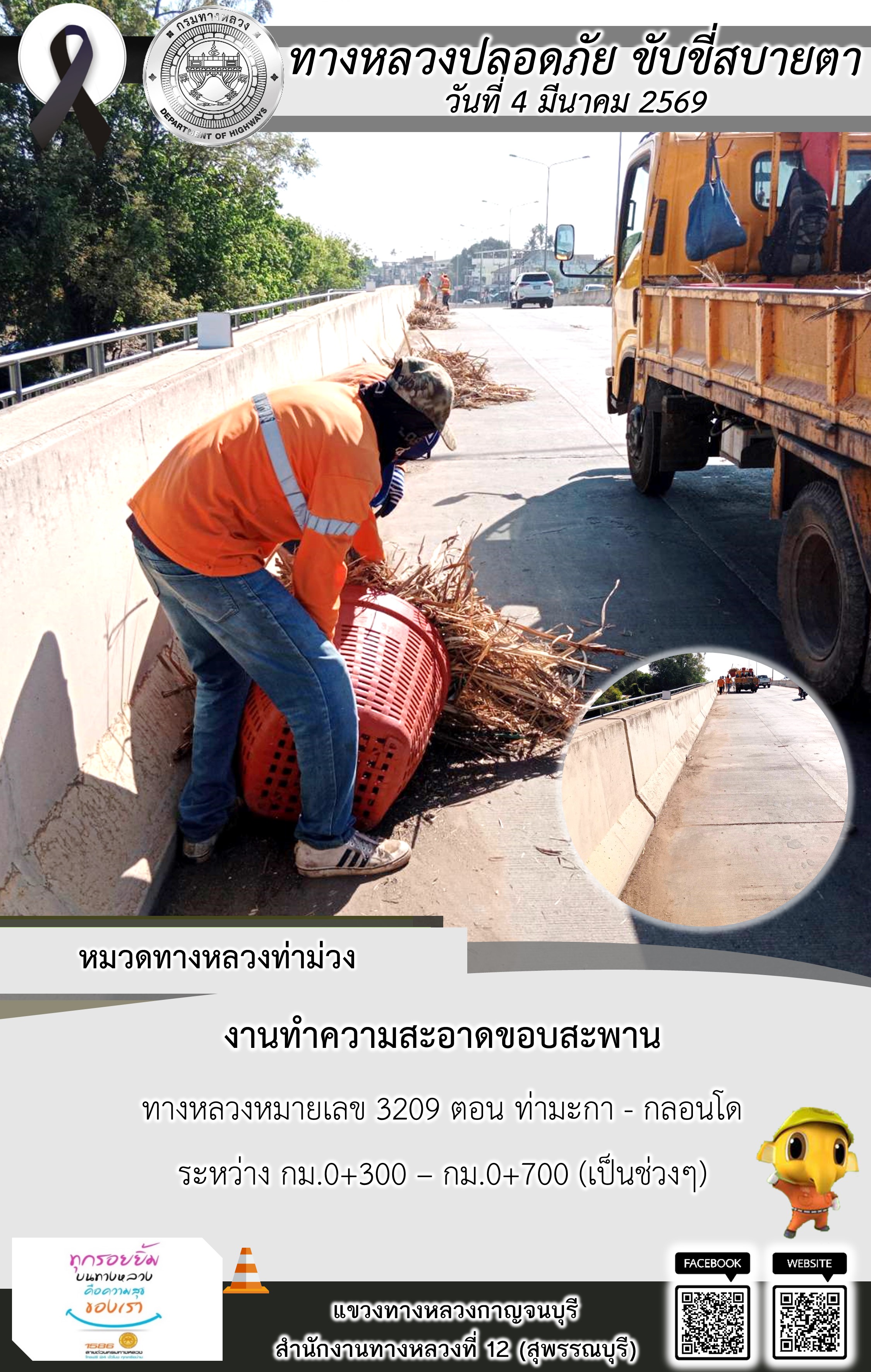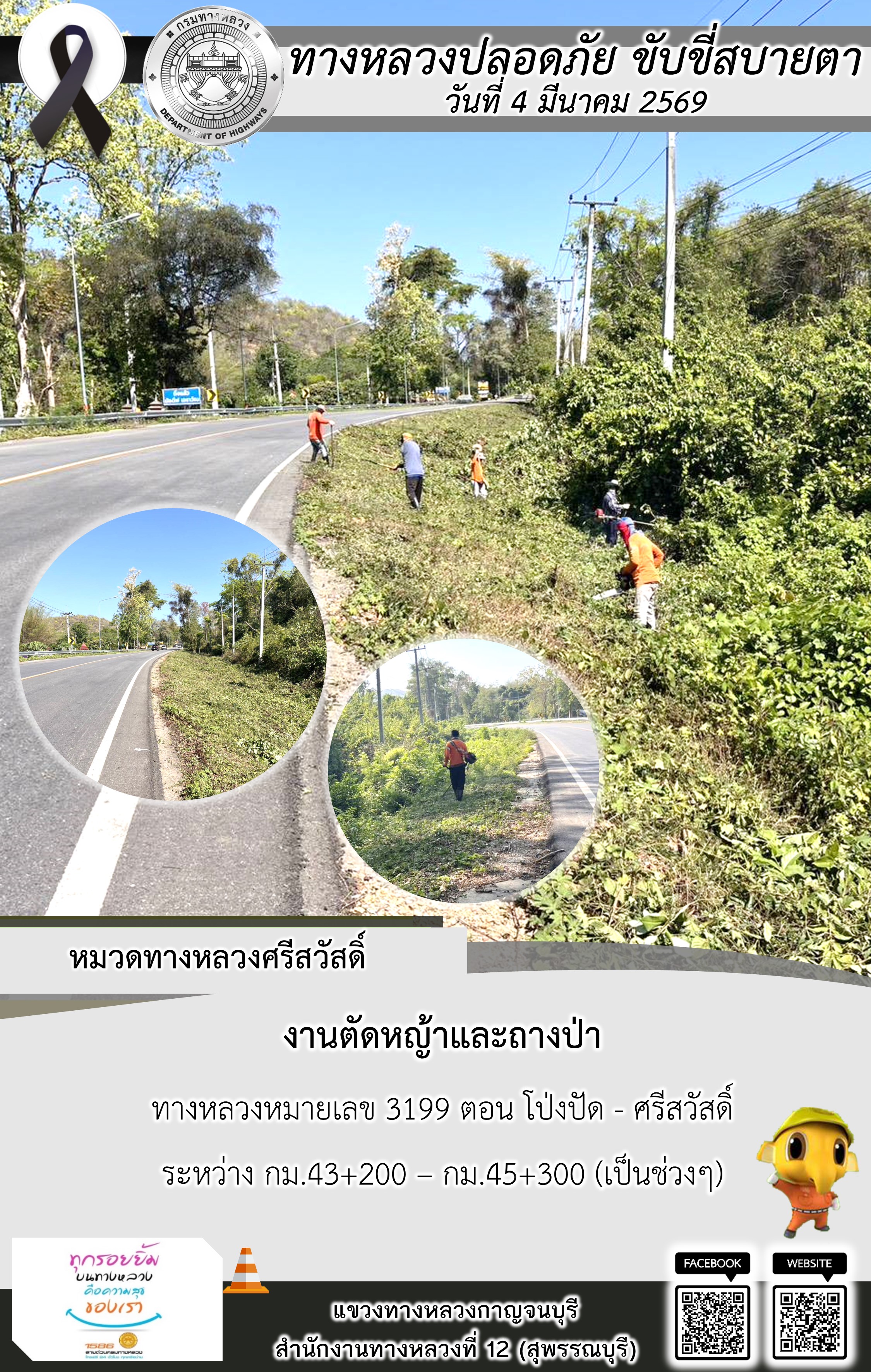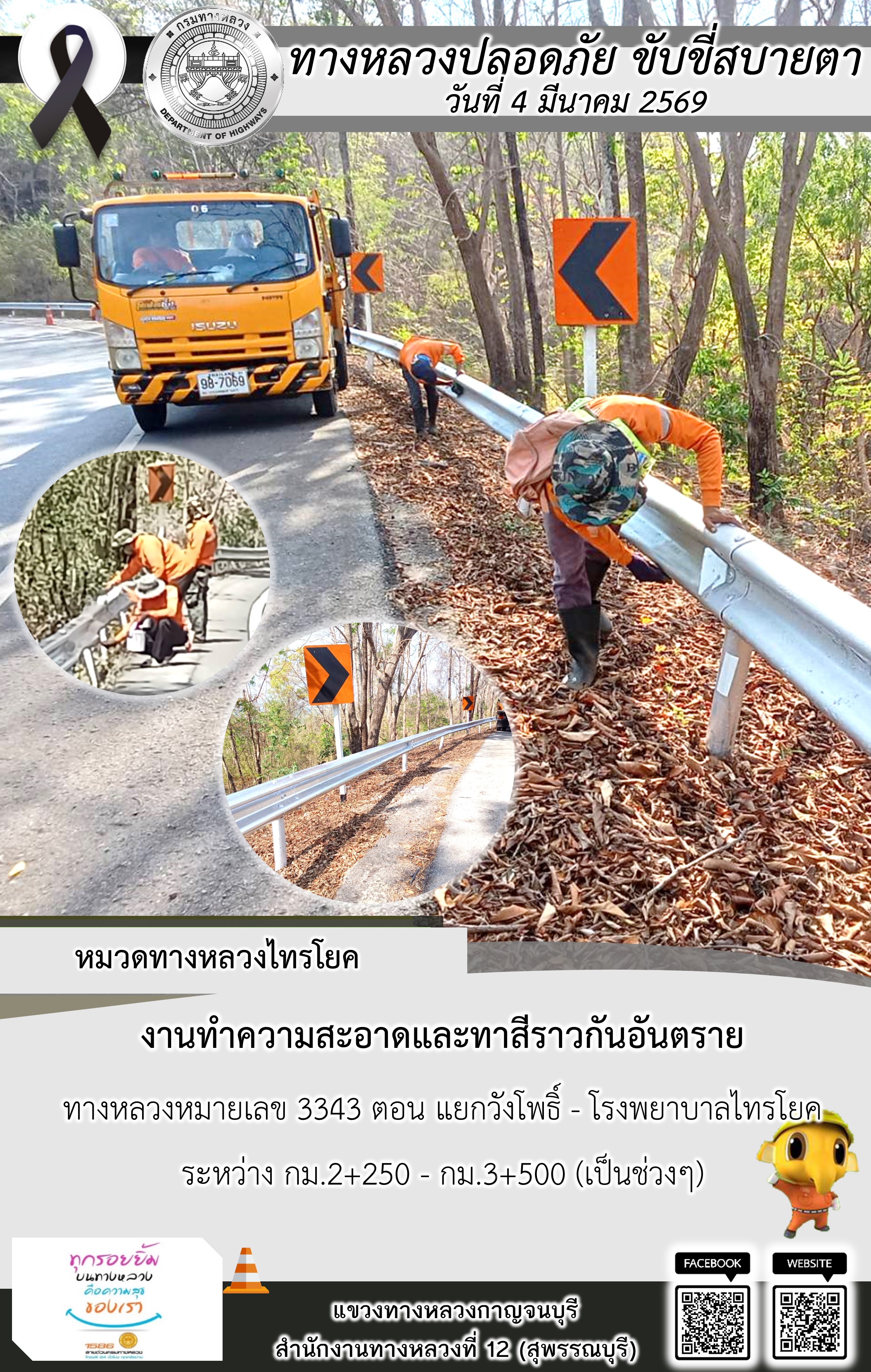 แขวงทางหลวงกาญจนบุรี โดยหมวดทางหลวงในสังกัด และงานอำนวยความปลอดภัยปฏิบัติงาน ประจำวันที่ 4 มี.ค. 69