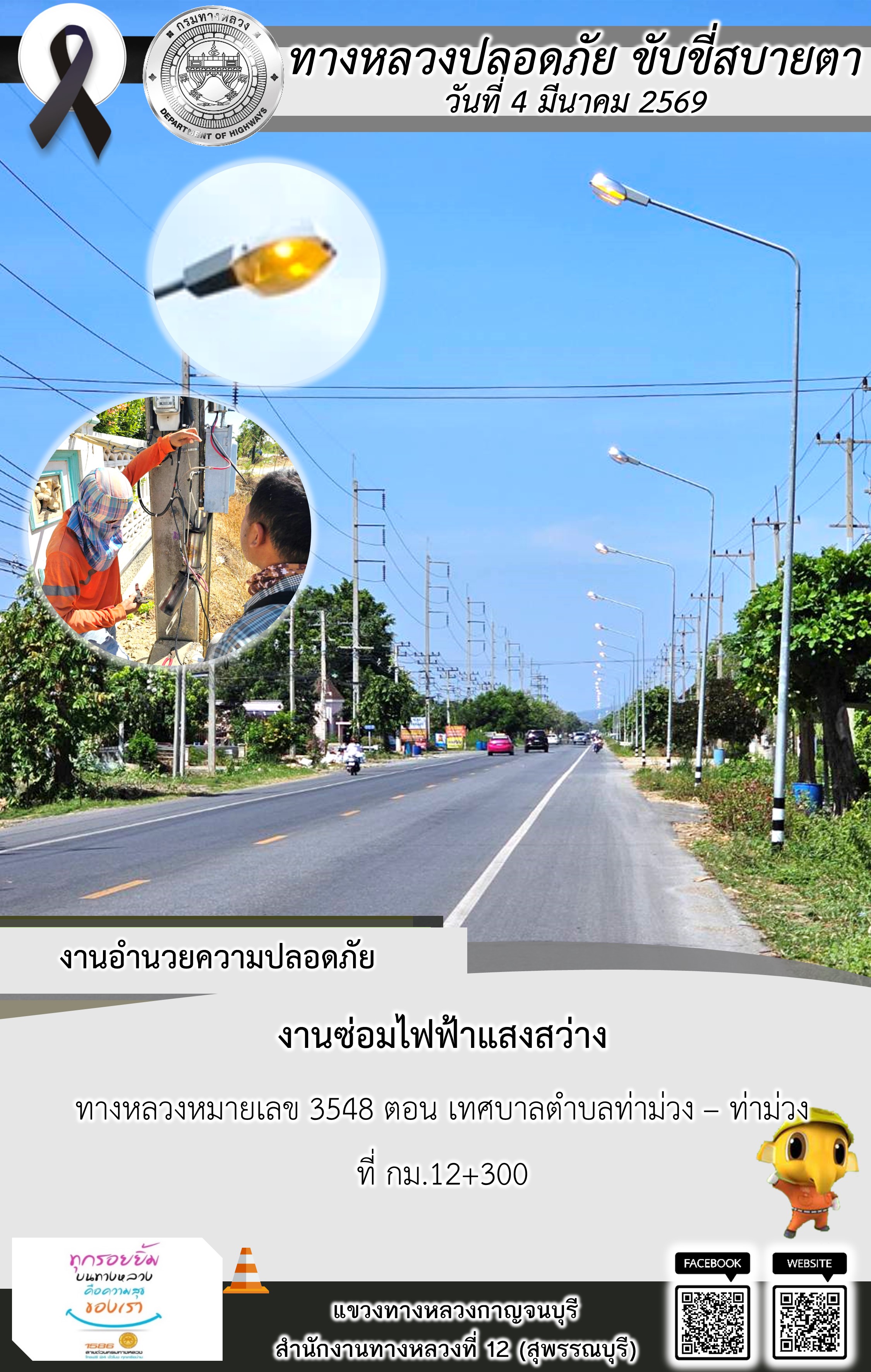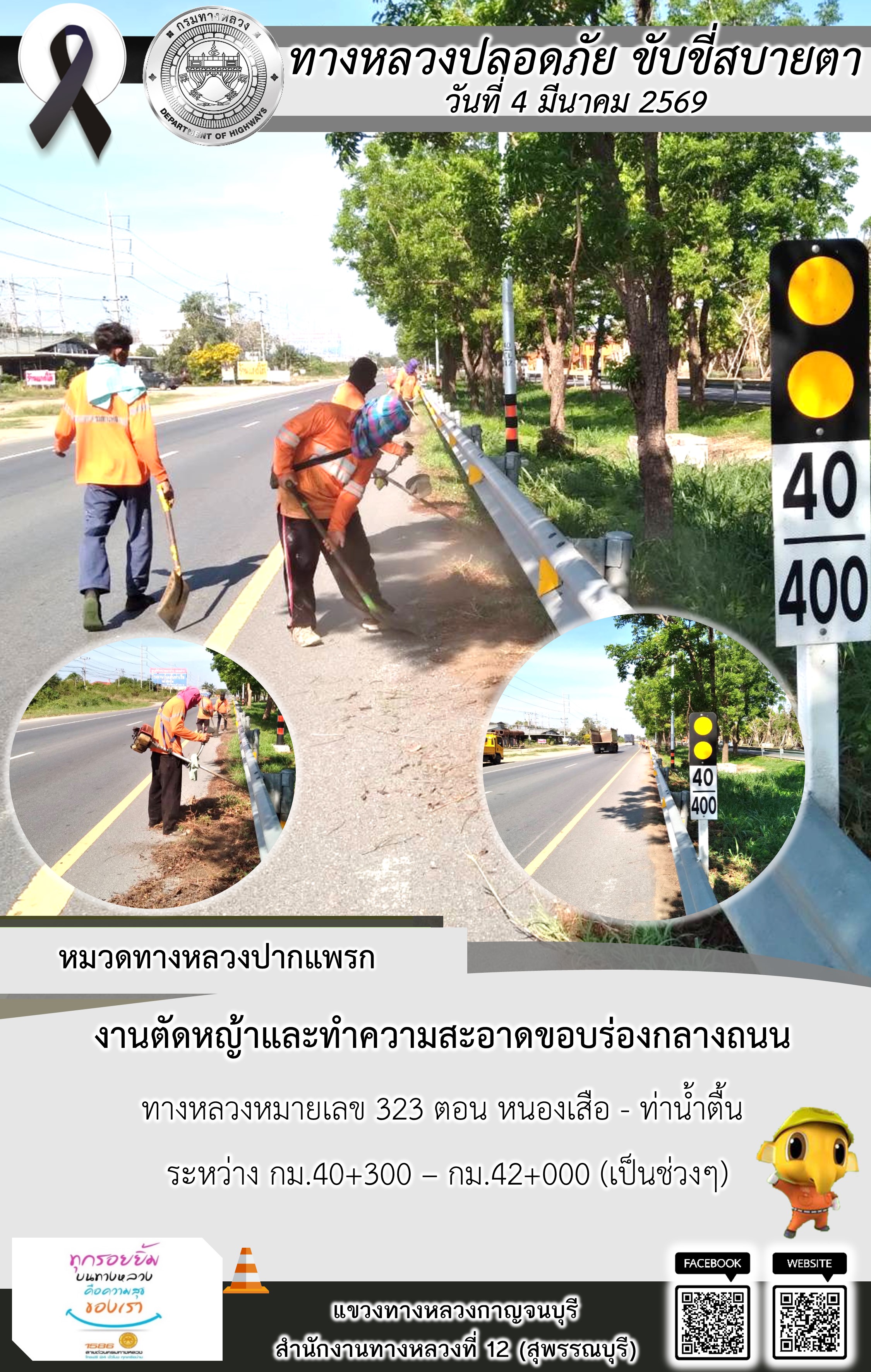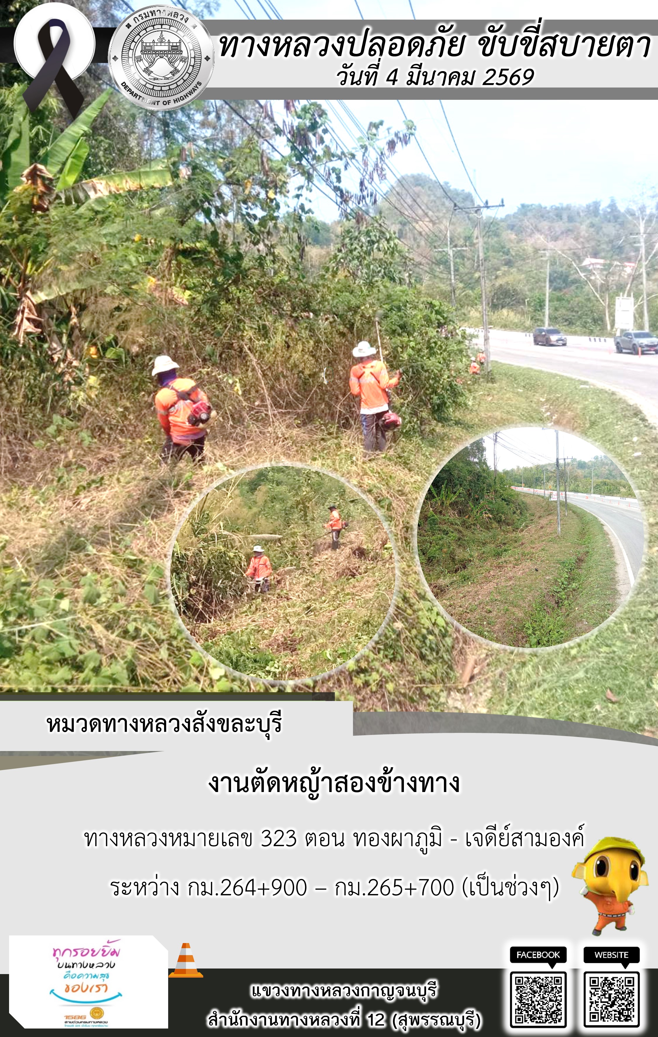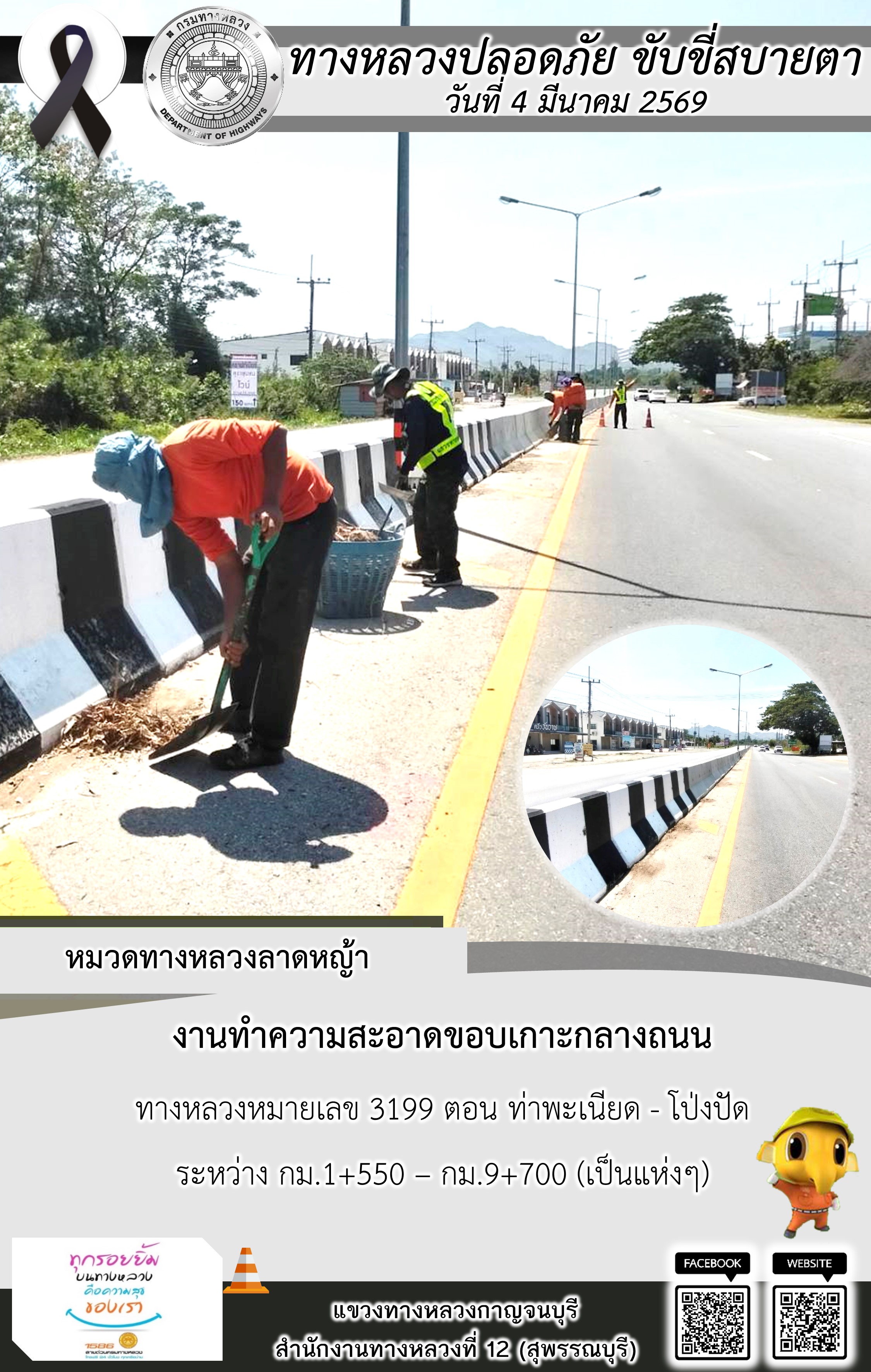 แขวงทางหลวงกาญจนบุรี โดยหมวดทางหลวงในสังกัด และงานอำนวยความปลอดภัยปฏิบัติงาน ประจำวันที่ 4 มี.ค. 69