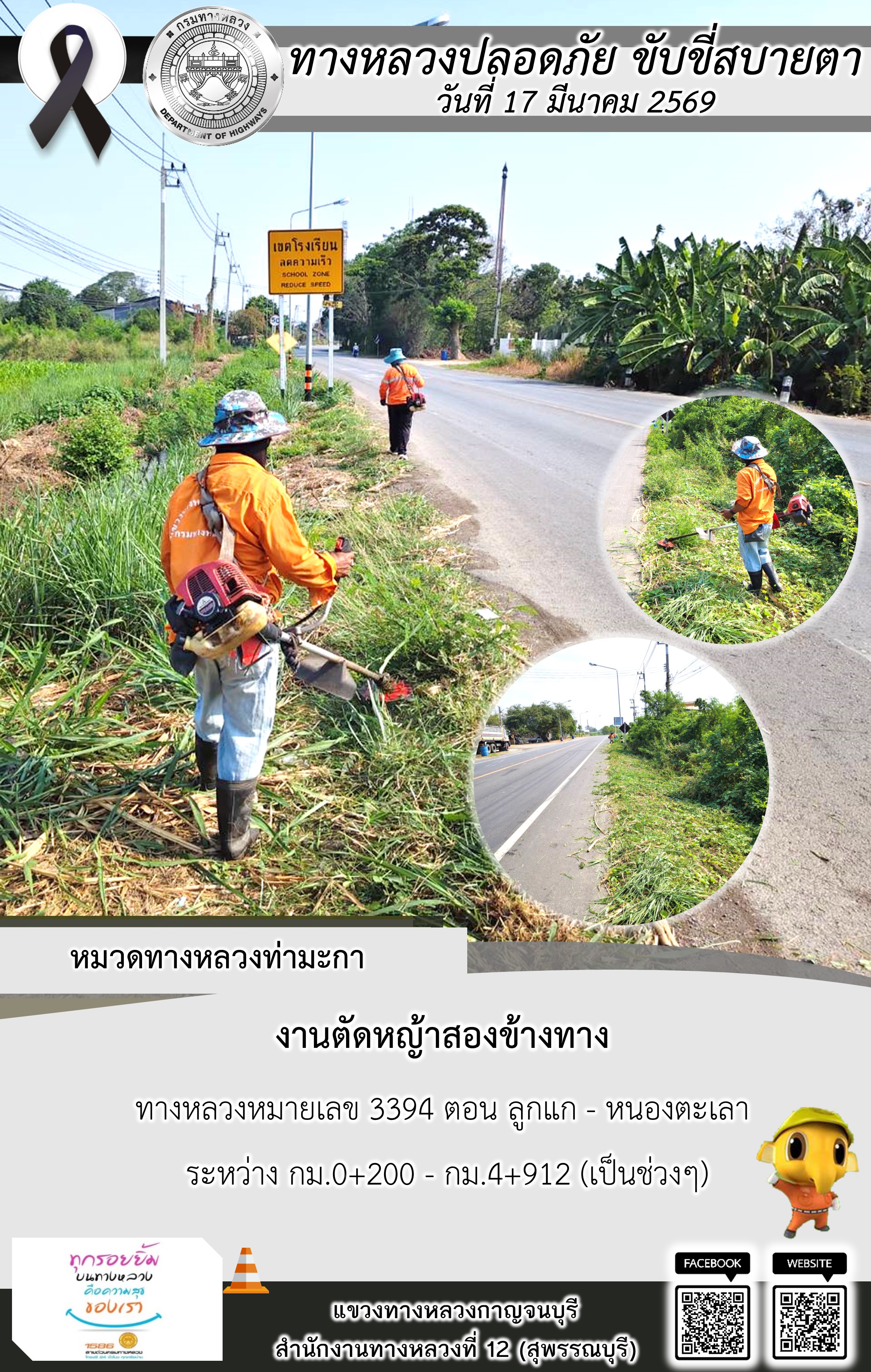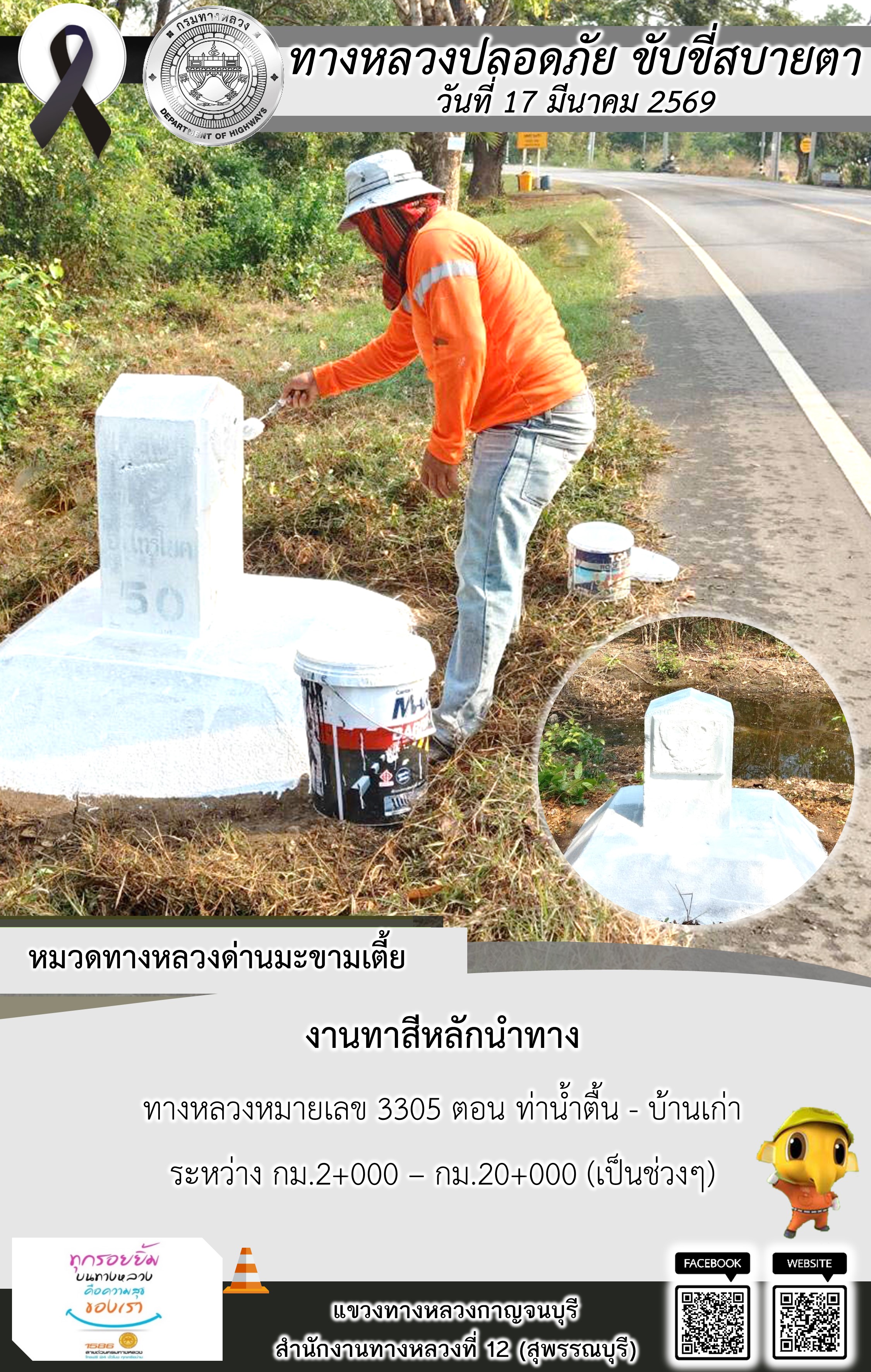 ข้อมูลภาพกิจกรรม : แขวงทางหลวงกาญจนบุรี โดยหมวดทางหลวงในสังกัด และงานอำนวยความปลอดภัยปฏิบัติงาน ประจำวันที่ 17 มี.ค. 69