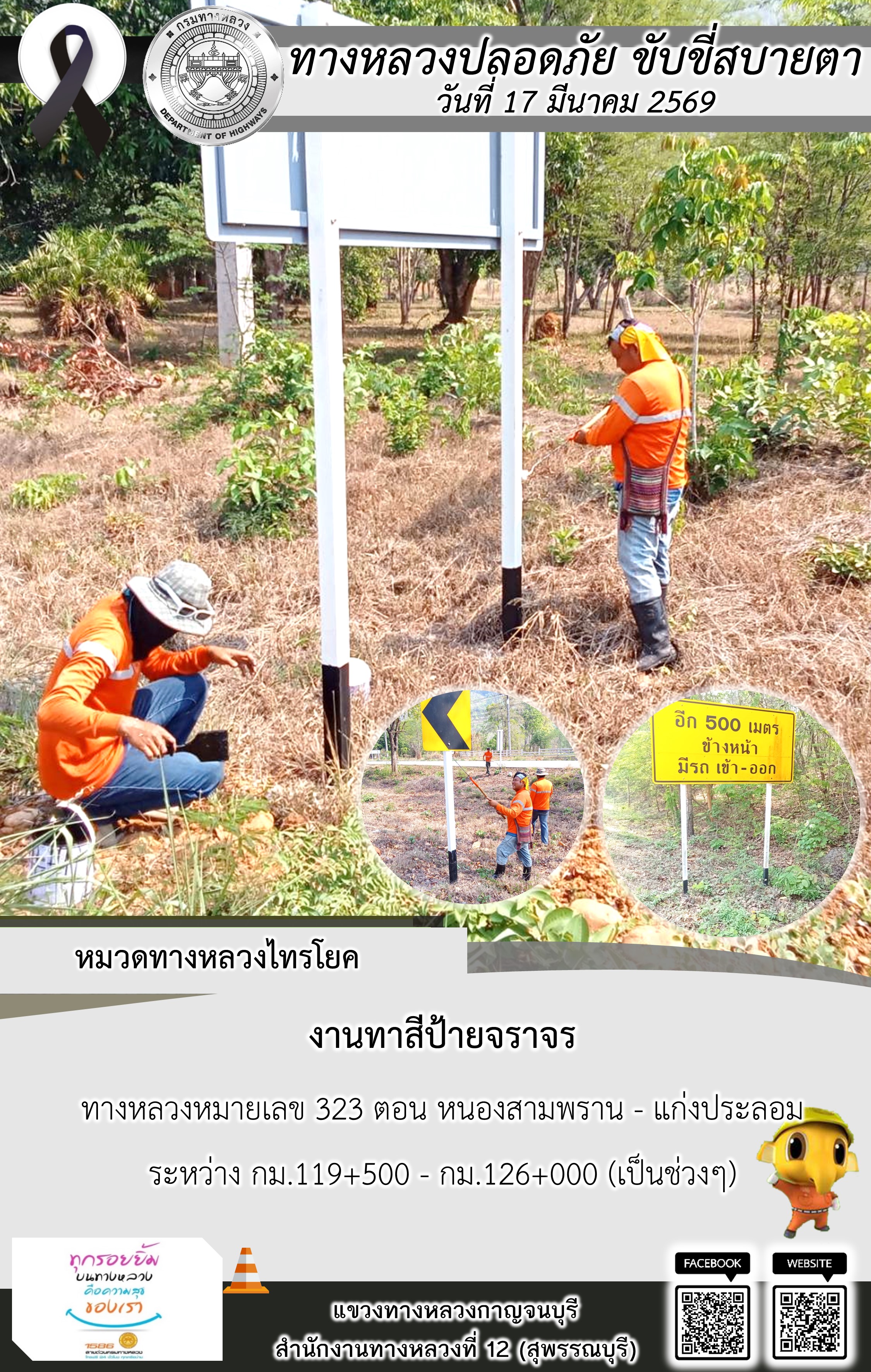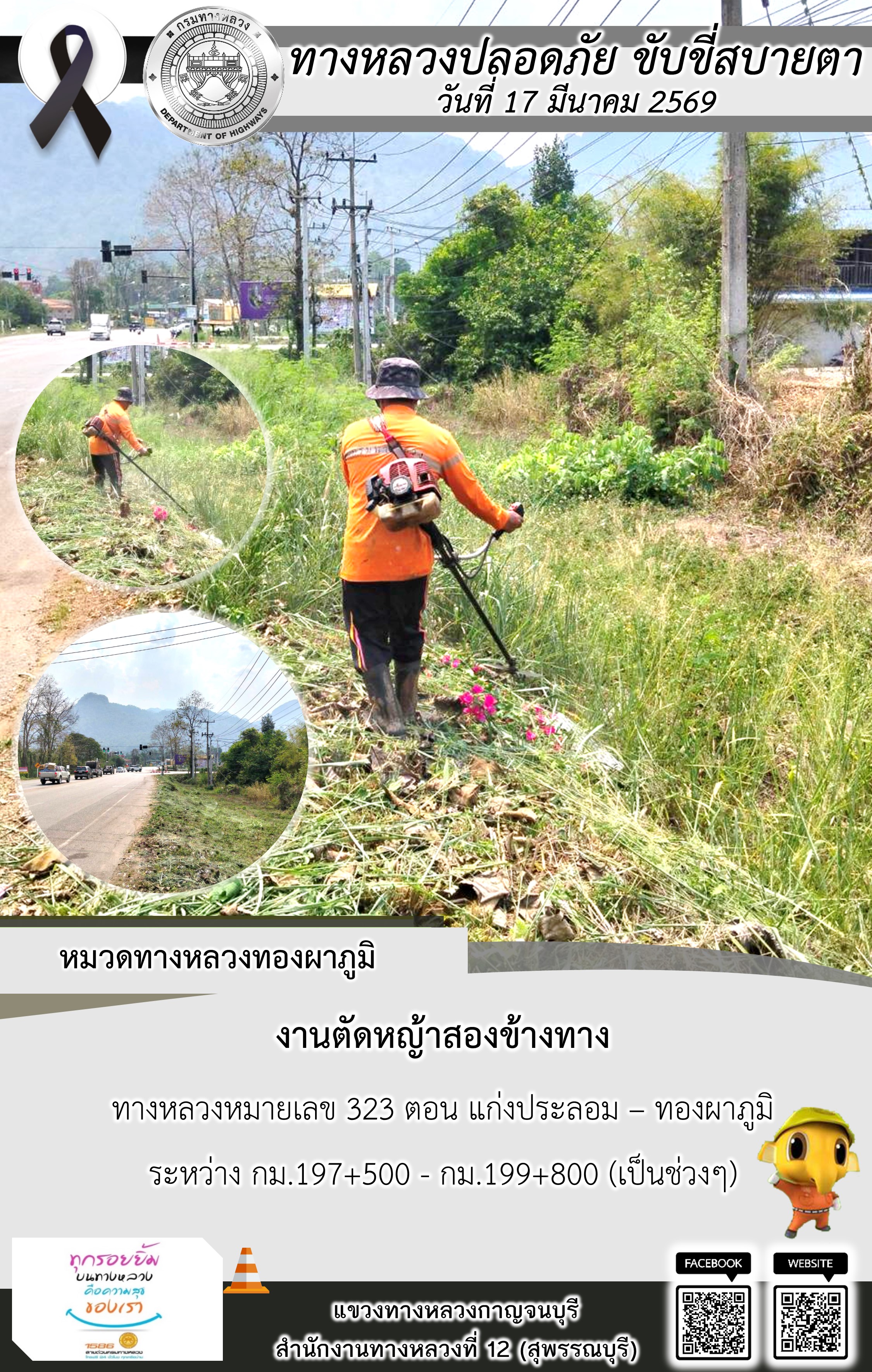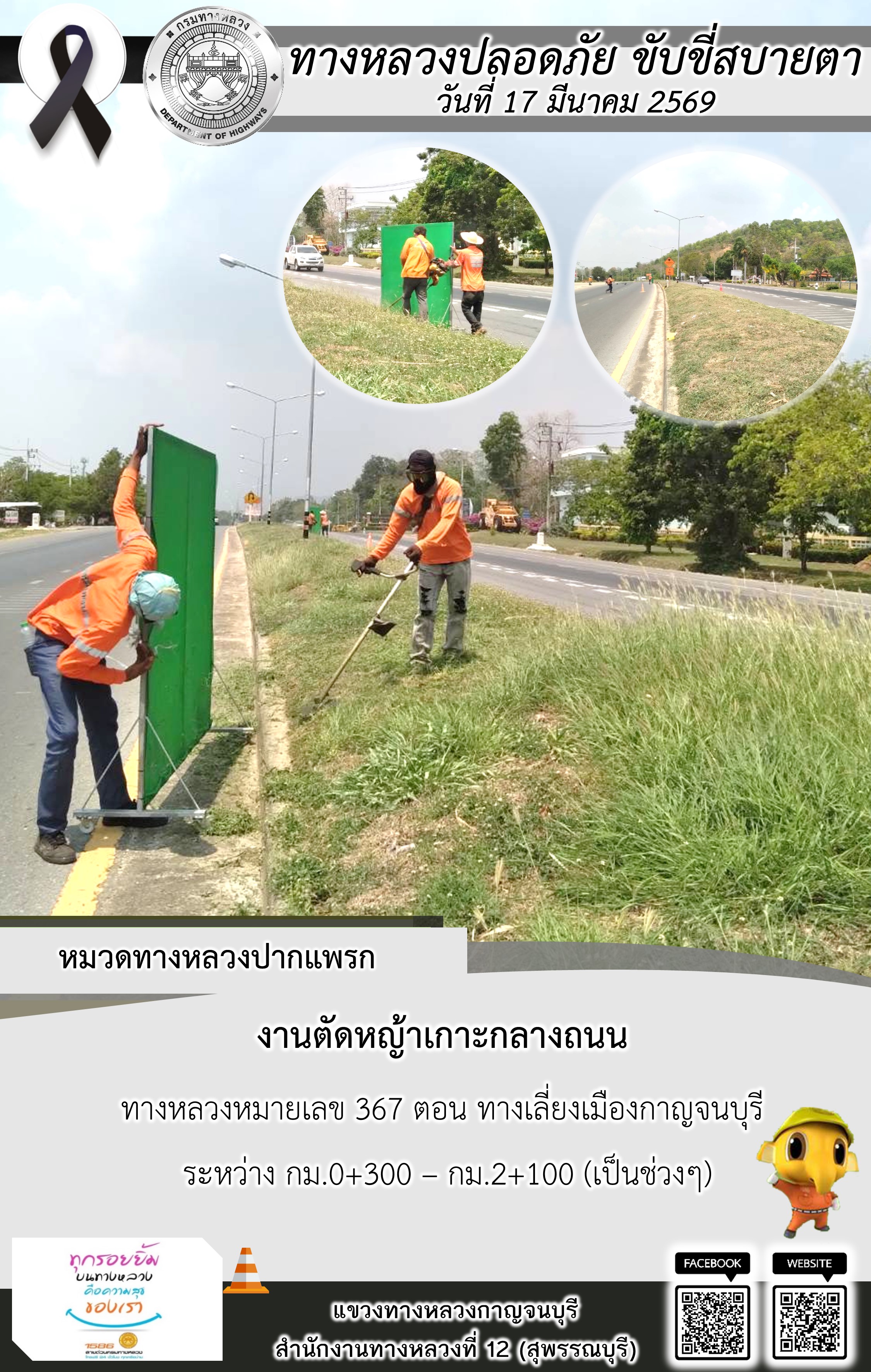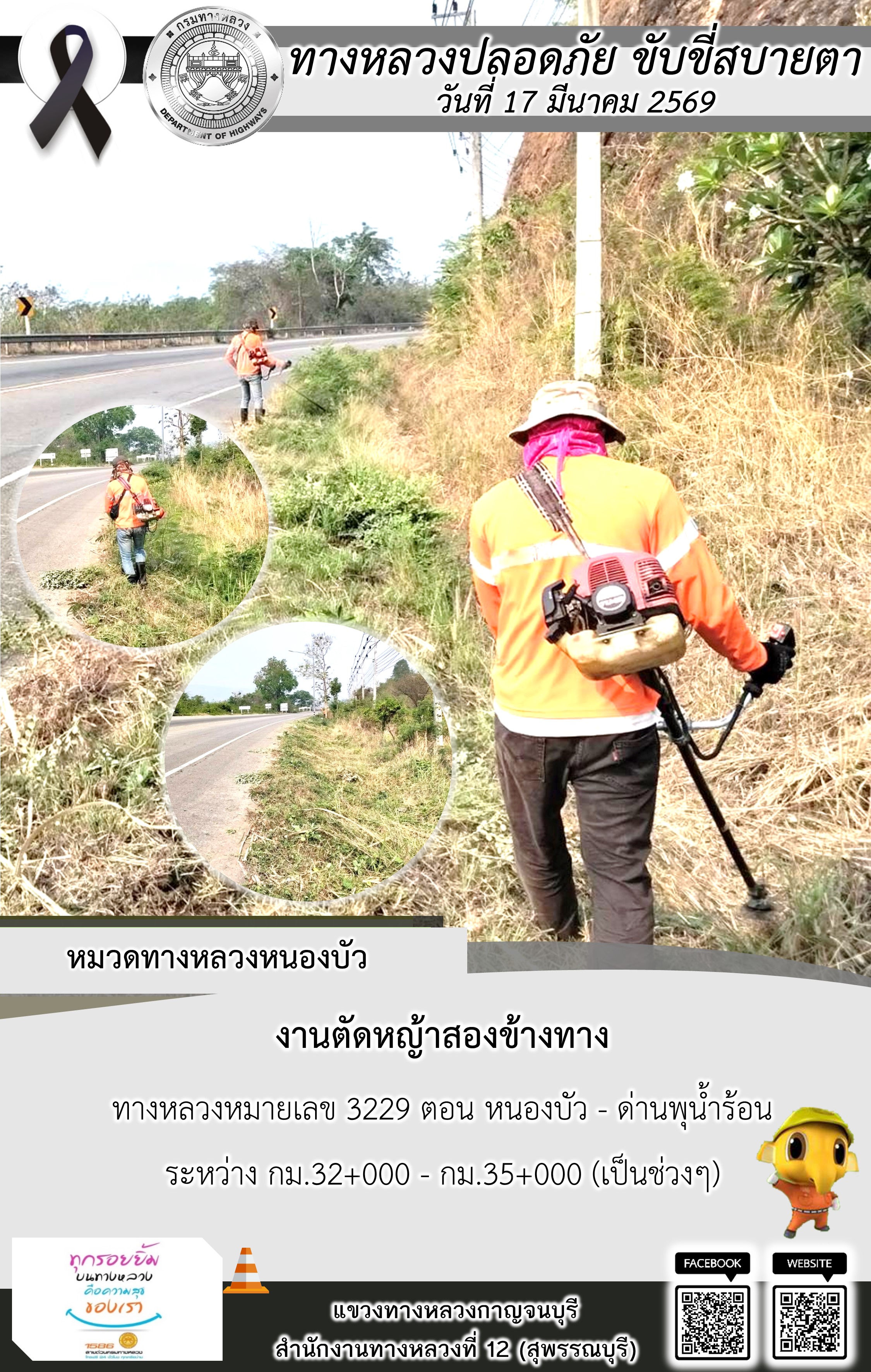 แขวงทางหลวงกาญจนบุรี โดยหมวดทางหลวงในสังกัด และงานอำนวยความปลอดภัยปฏิบัติงาน ประจำวันที่ 17 มี.ค. 69