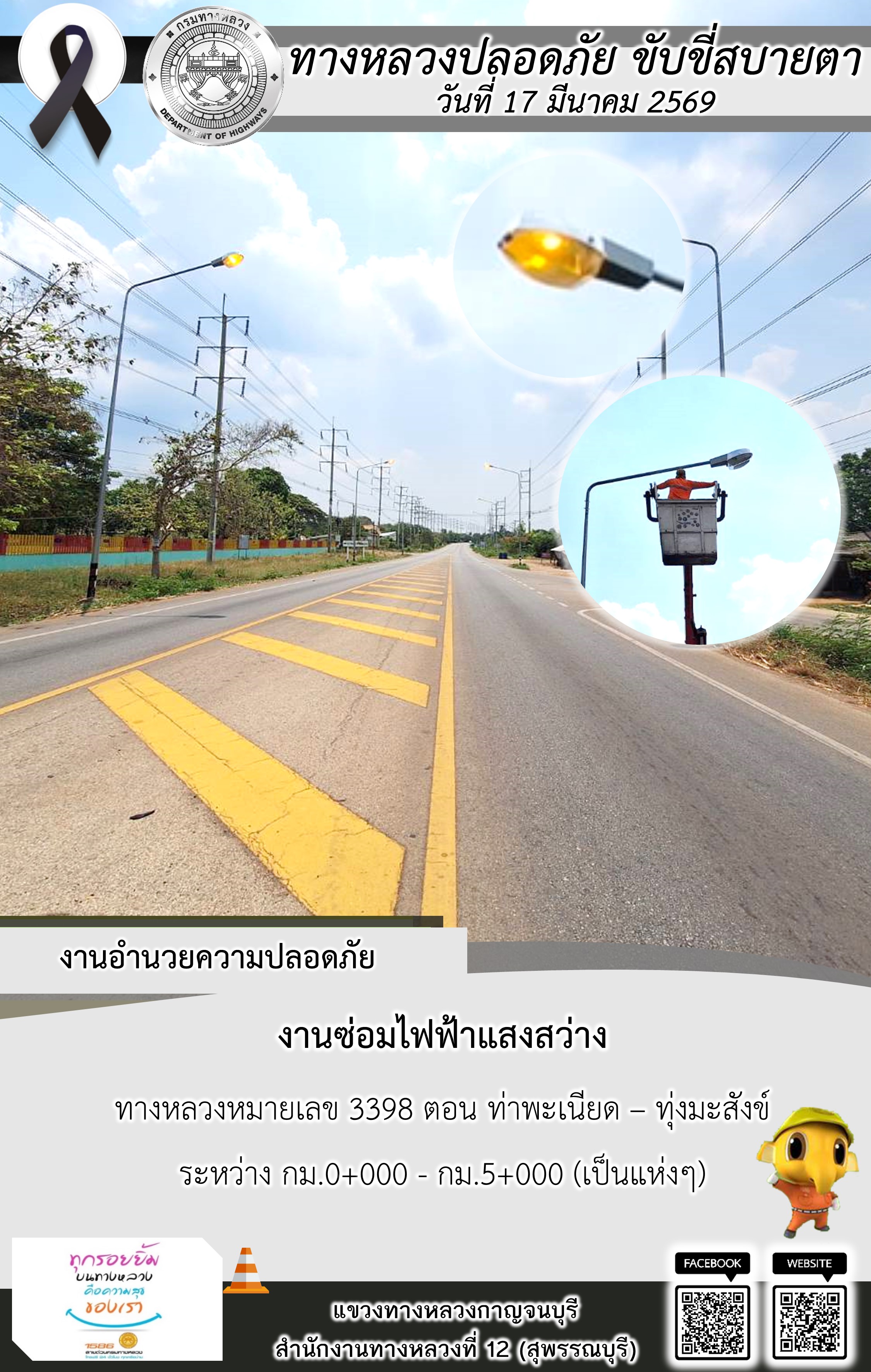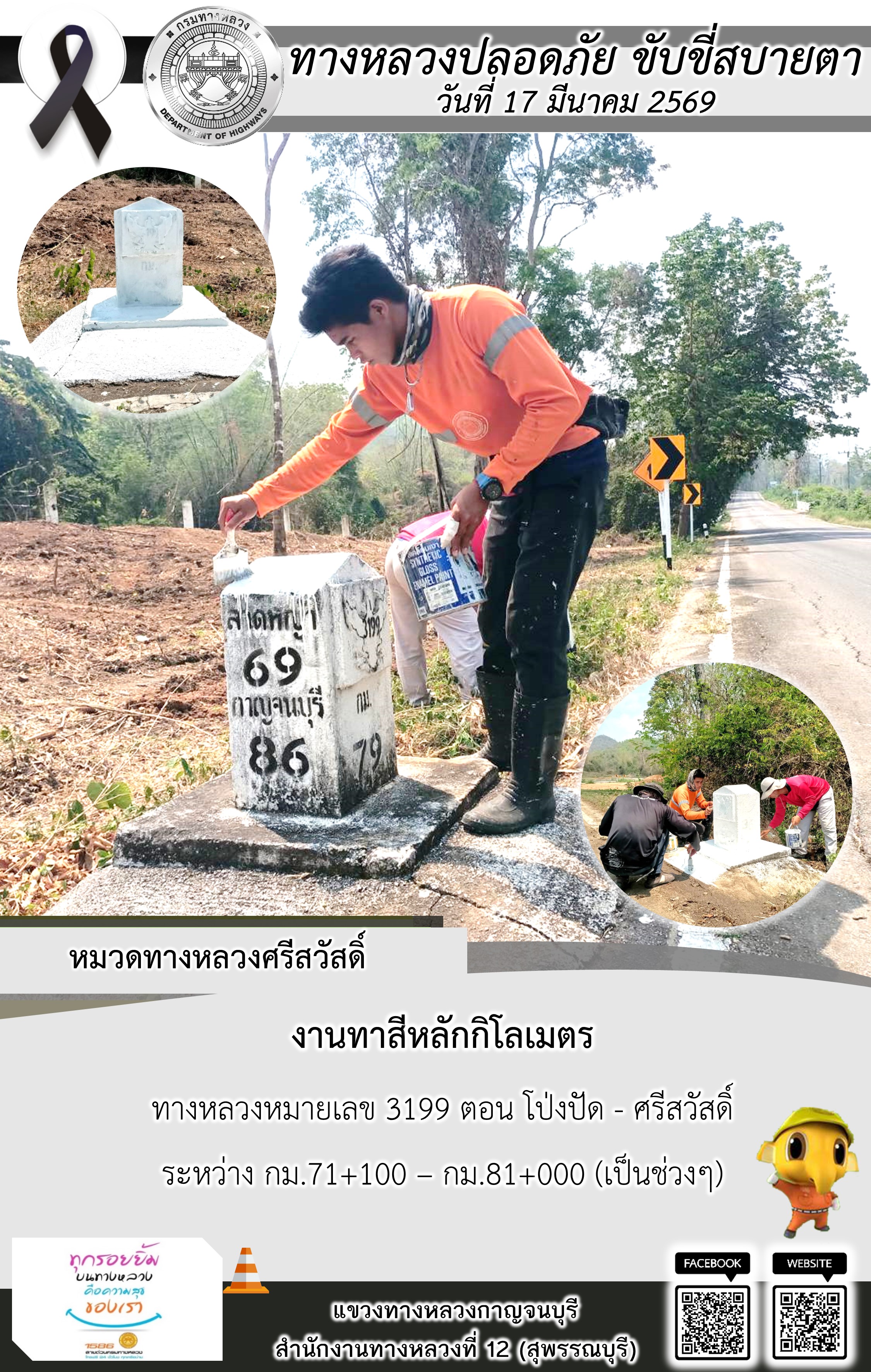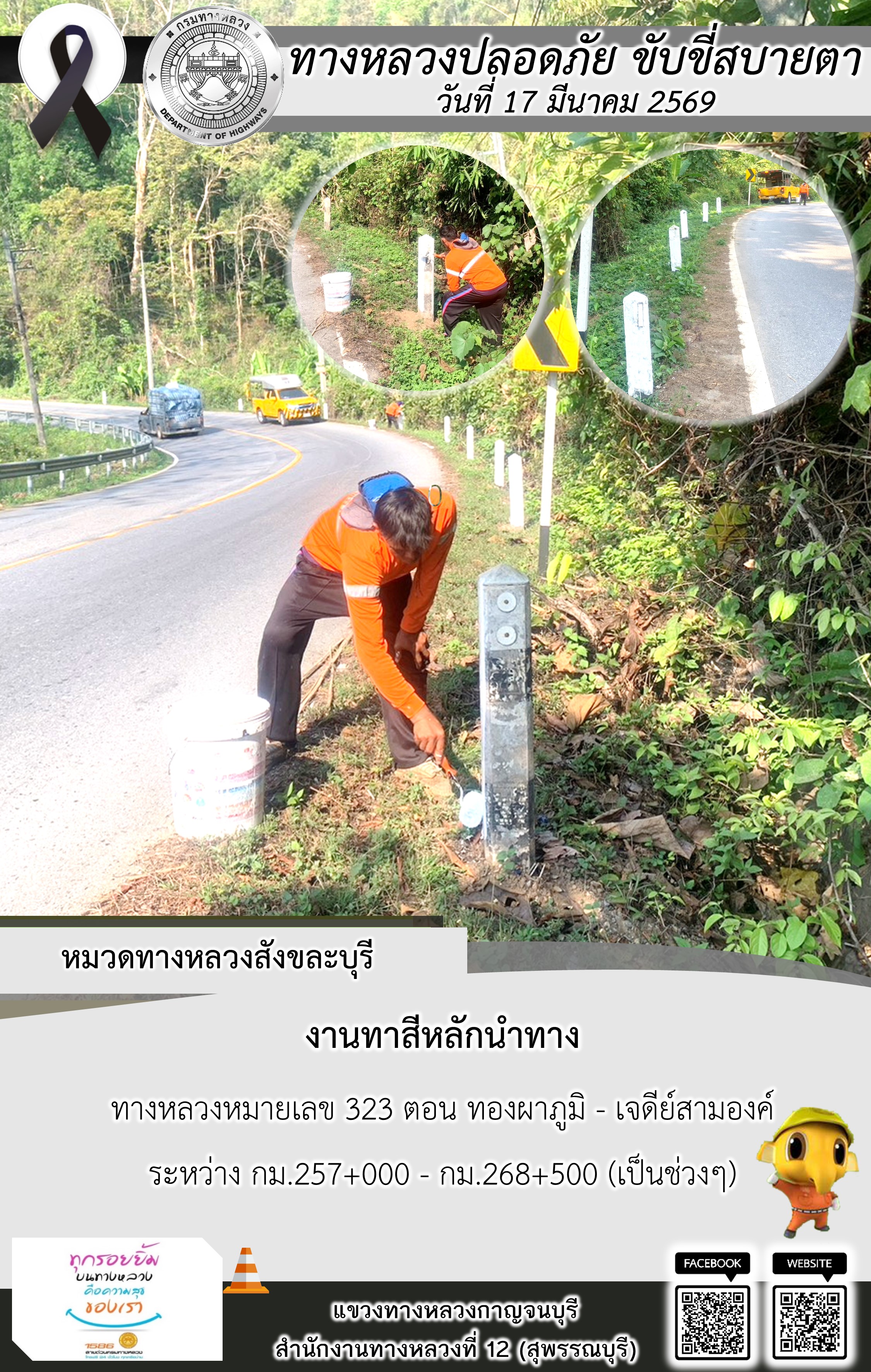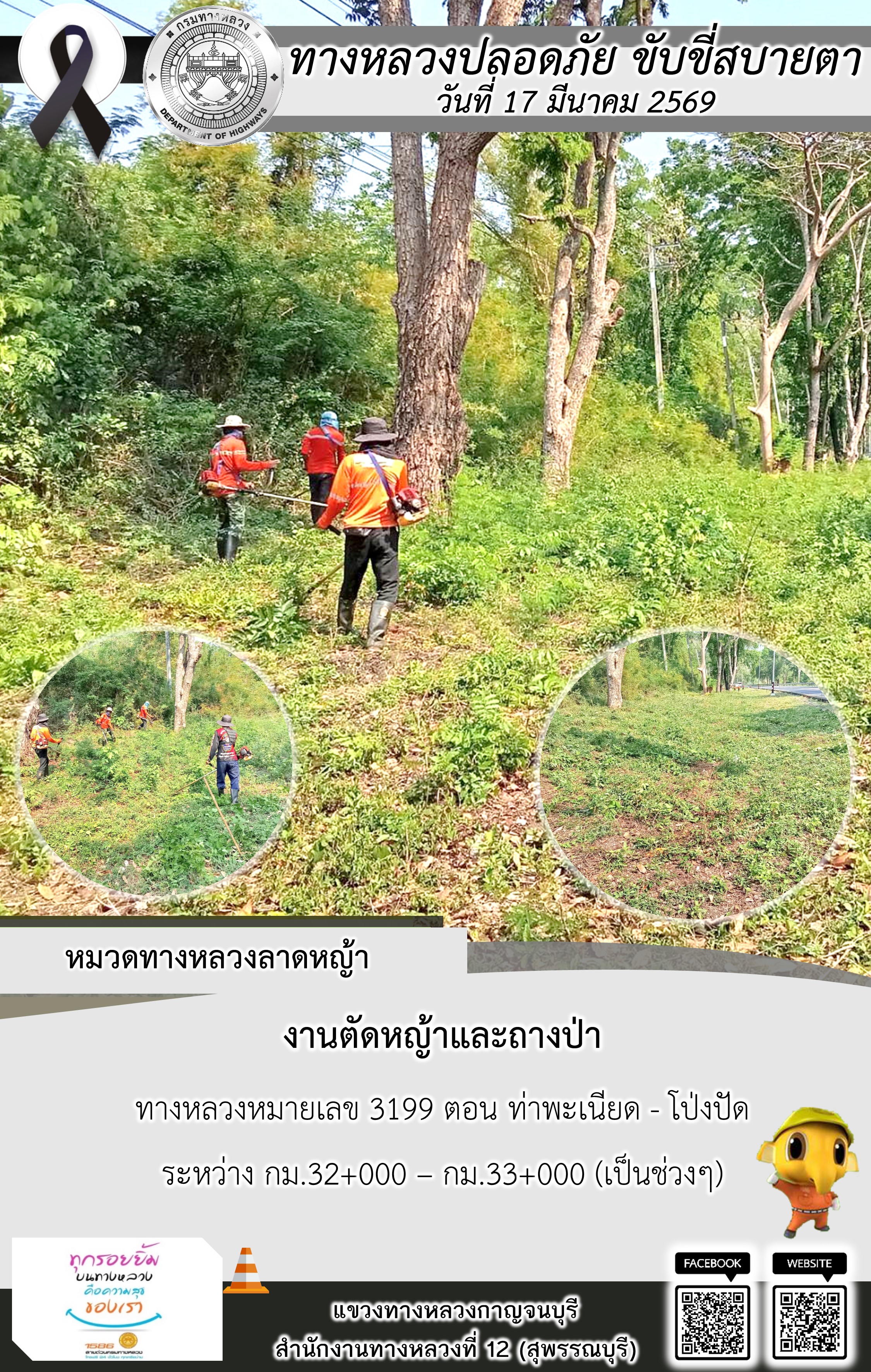 แขวงทางหลวงกาญจนบุรี โดยหมวดทางหลวงในสังกัด และงานอำนวยความปลอดภัยปฏิบัติงาน ประจำวันที่ 17 มี.ค. 69
