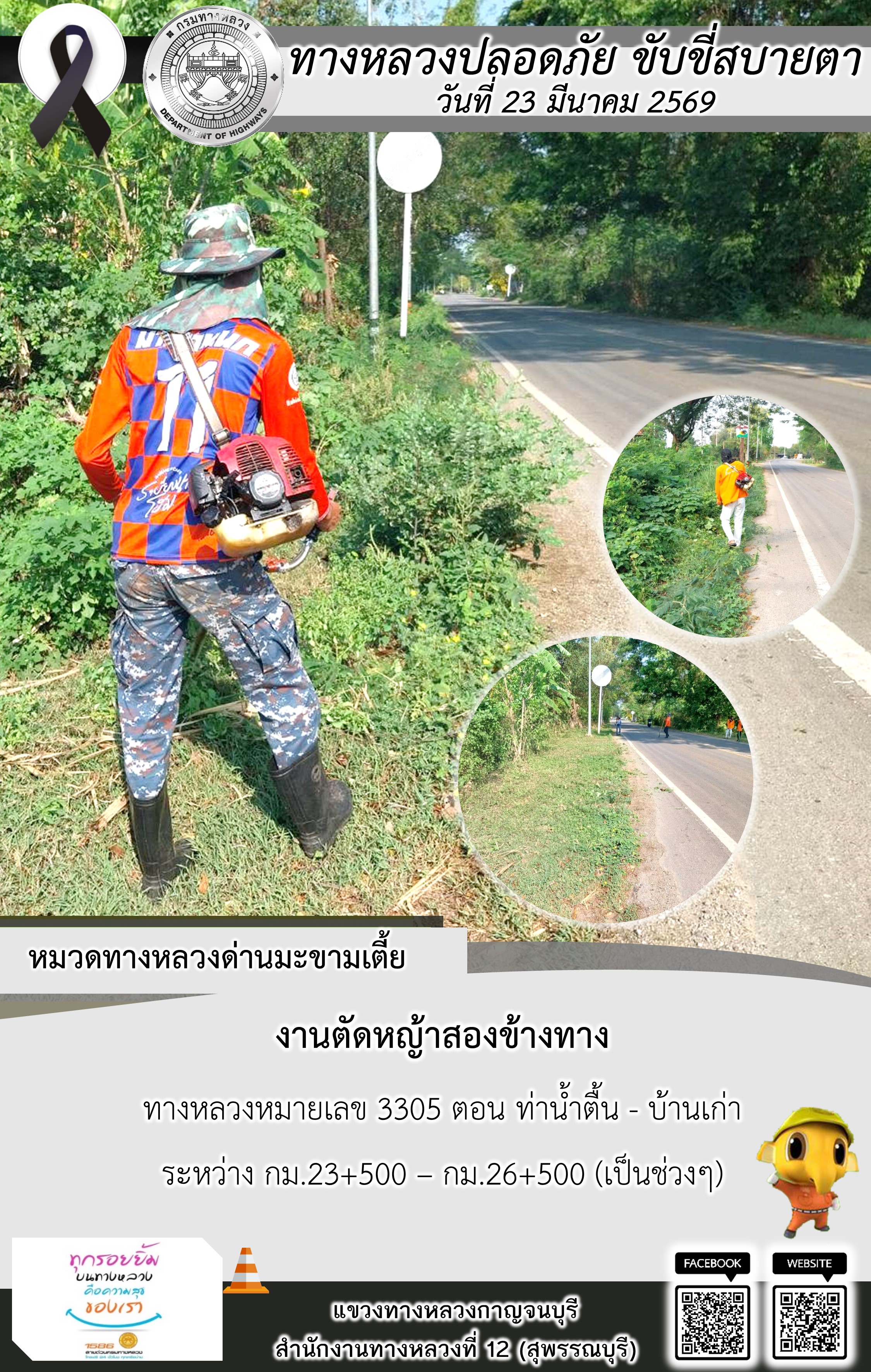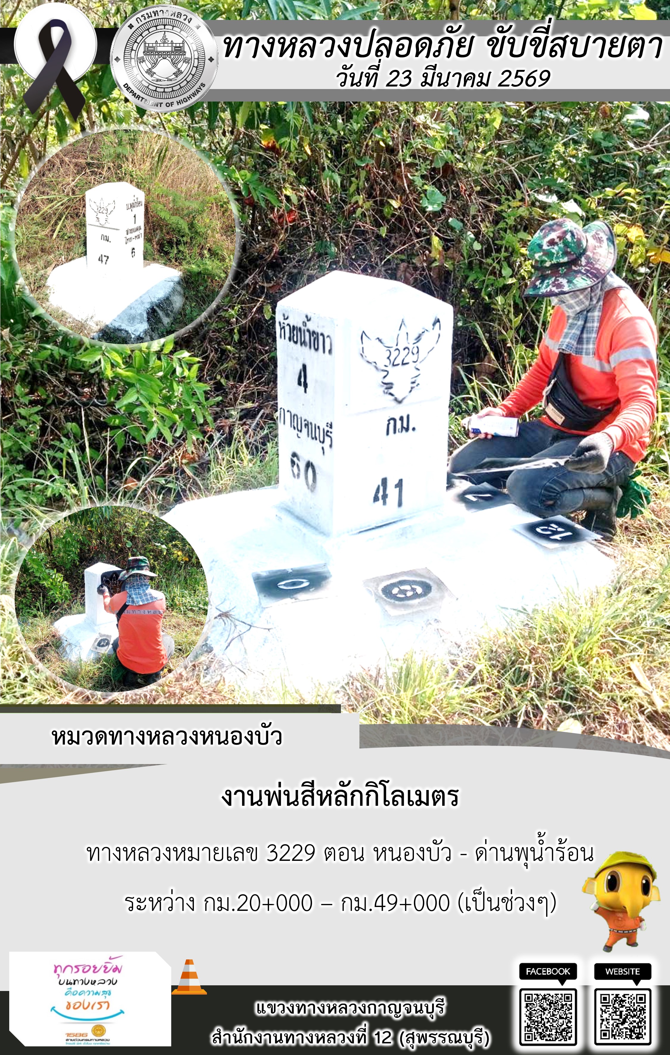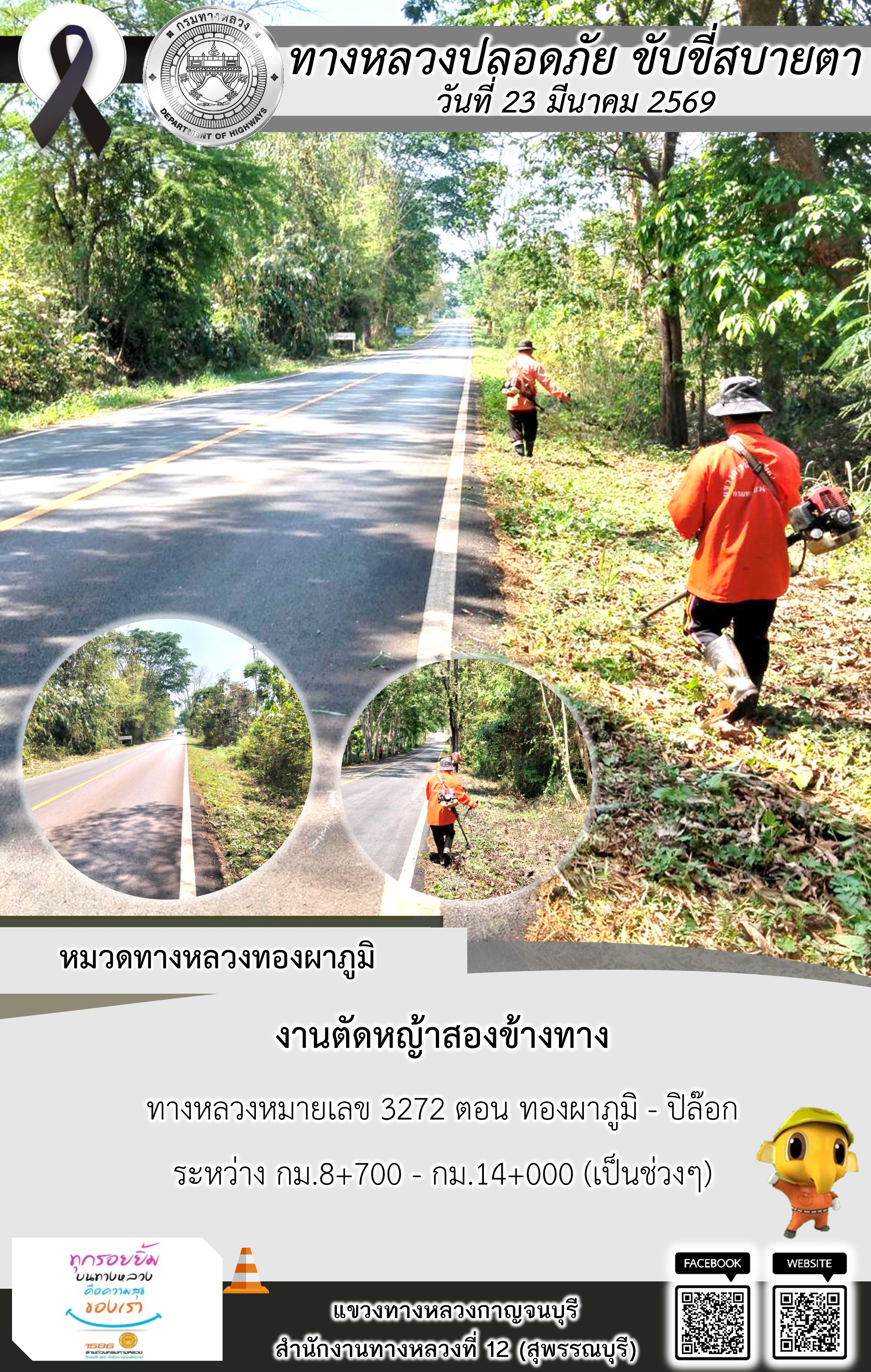 ข้อมูลภาพกิจกรรม : แขวงทางหลวงกาญจนบุรี โดยหมวดทางหลวงในสังกัด และงานอำนวยความปลอดภัยปฏิบัติงาน ประจำวันที่ 23 มี.ค. 69