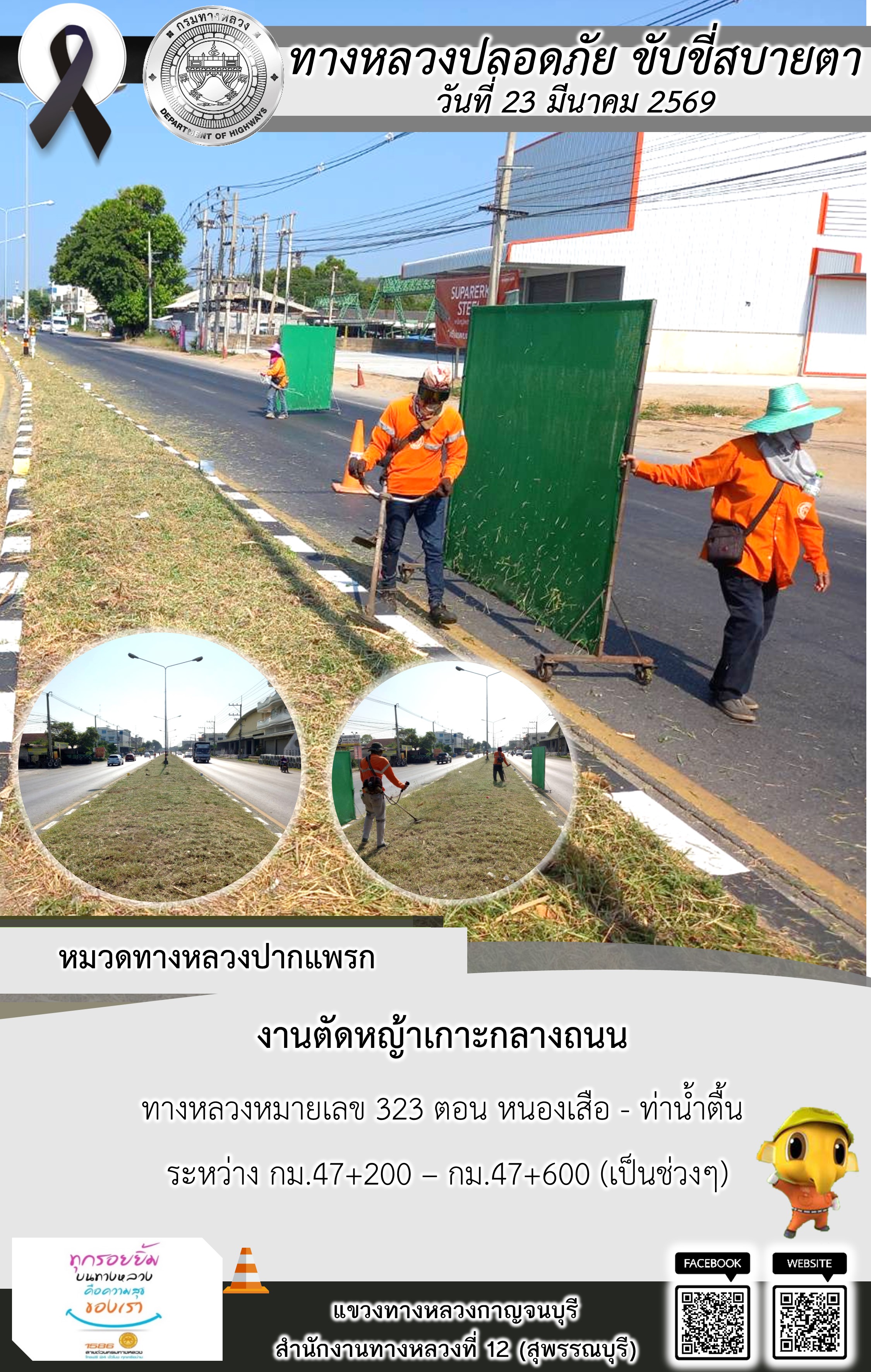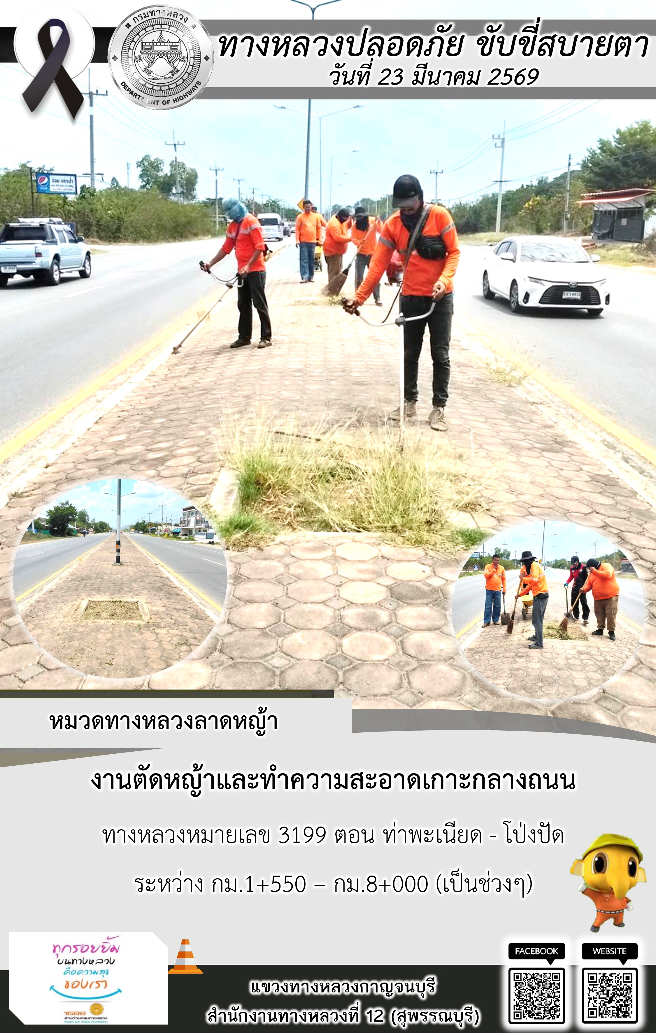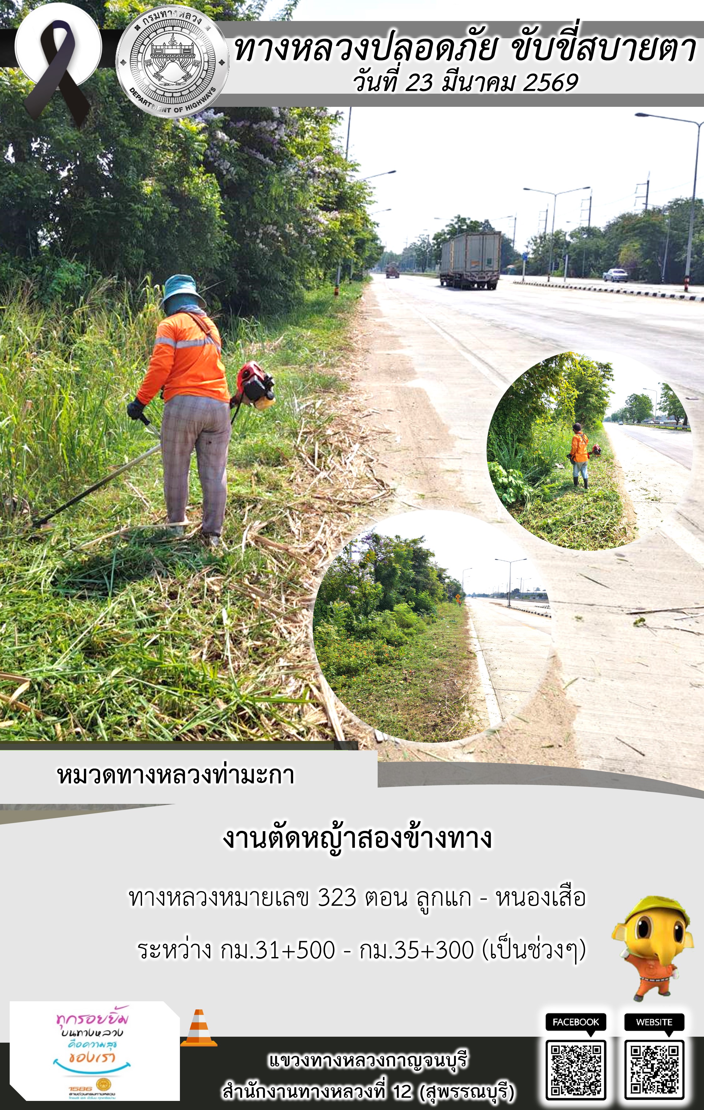 ข้อมูลภาพกิจกรรม : แขวงทางหลวงกาญจนบุรี โดยหมวดทางหลวงในสังกัด และงานอำนวยความปลอดภัยปฏิบัติงาน ประจำวันที่ 23 มี.ค. 69