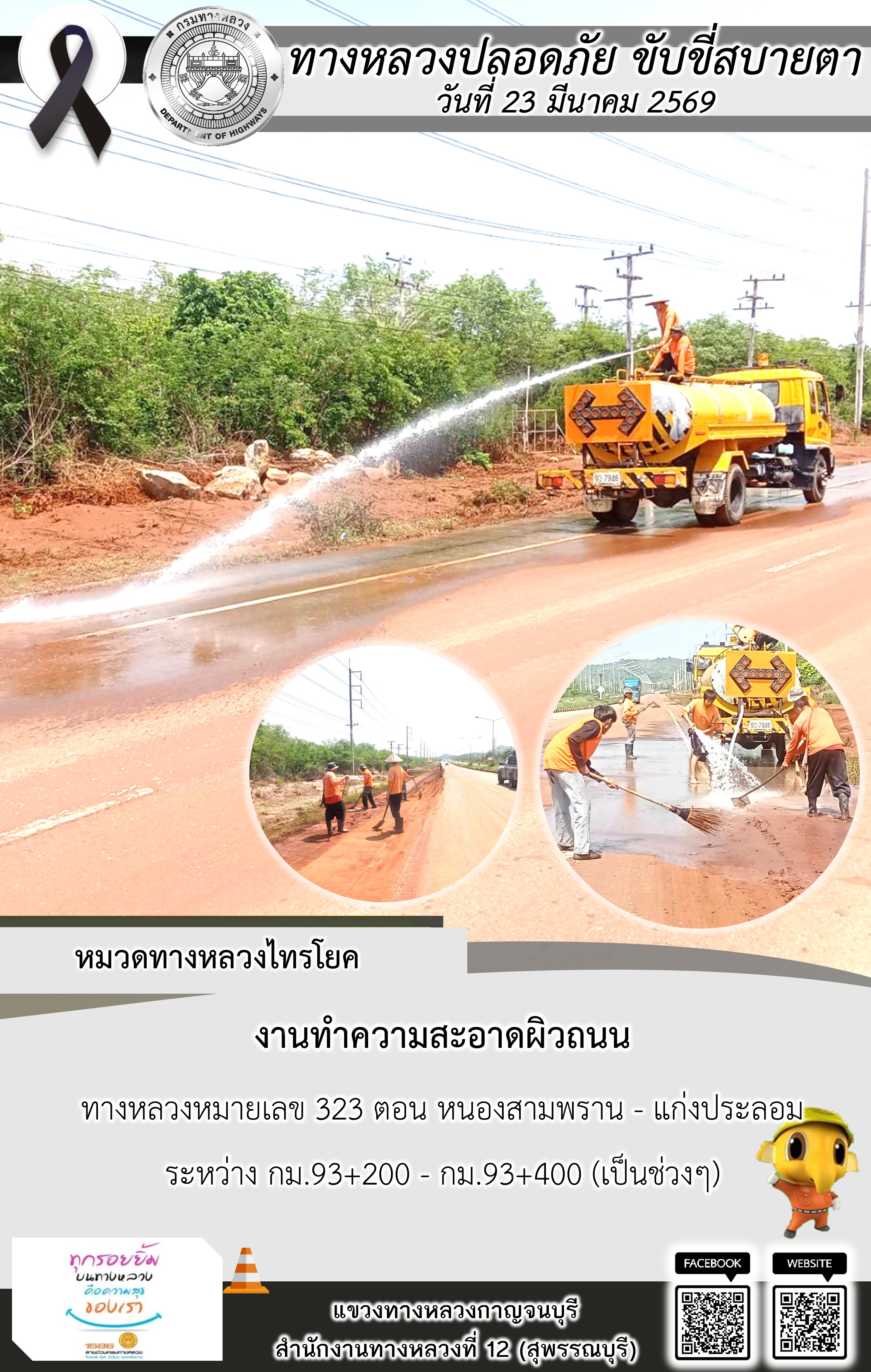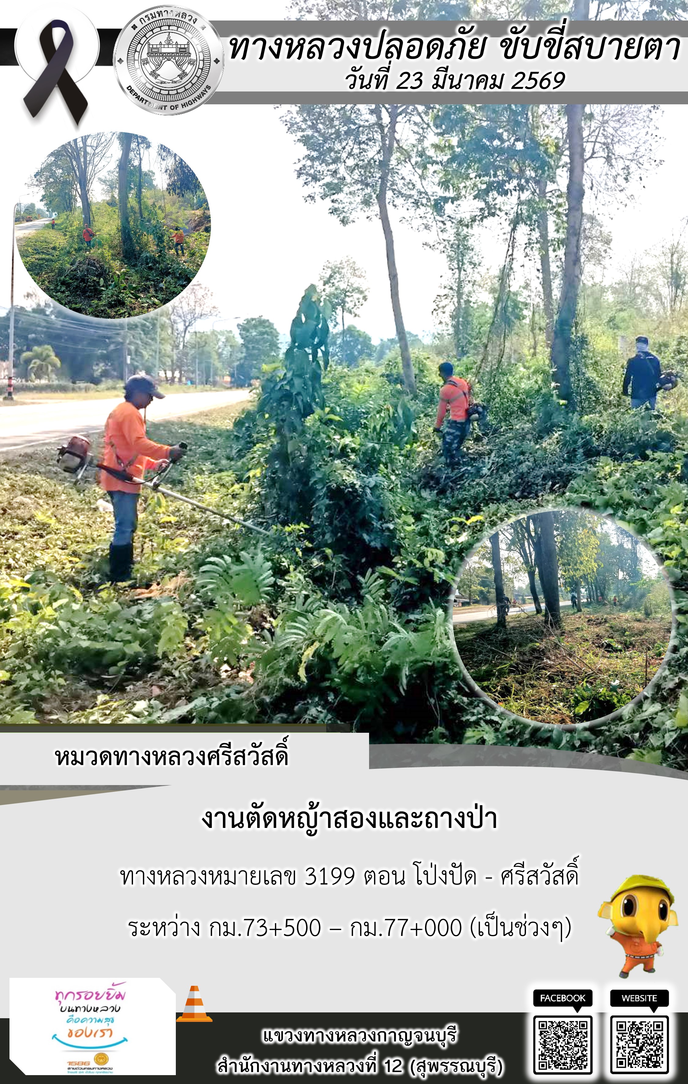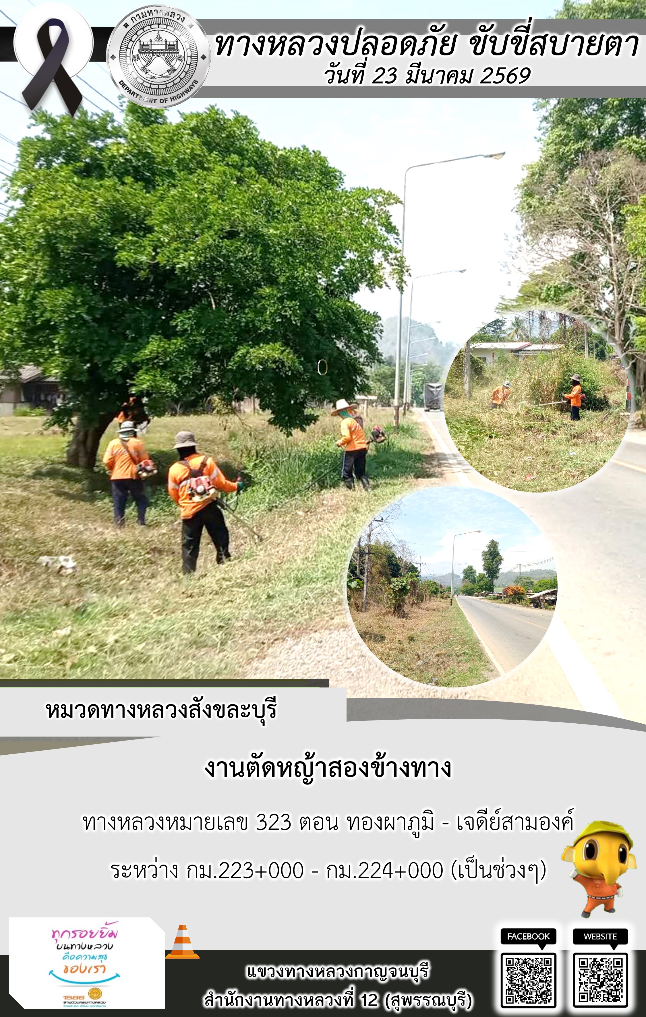 แขวงทางหลวงกาญจนบุรี โดยหมวดทางหลวงในสังกัด และงานอำนวยความปลอดภัยปฏิบัติงาน ประจำวันที่ 23 มี.ค. 69