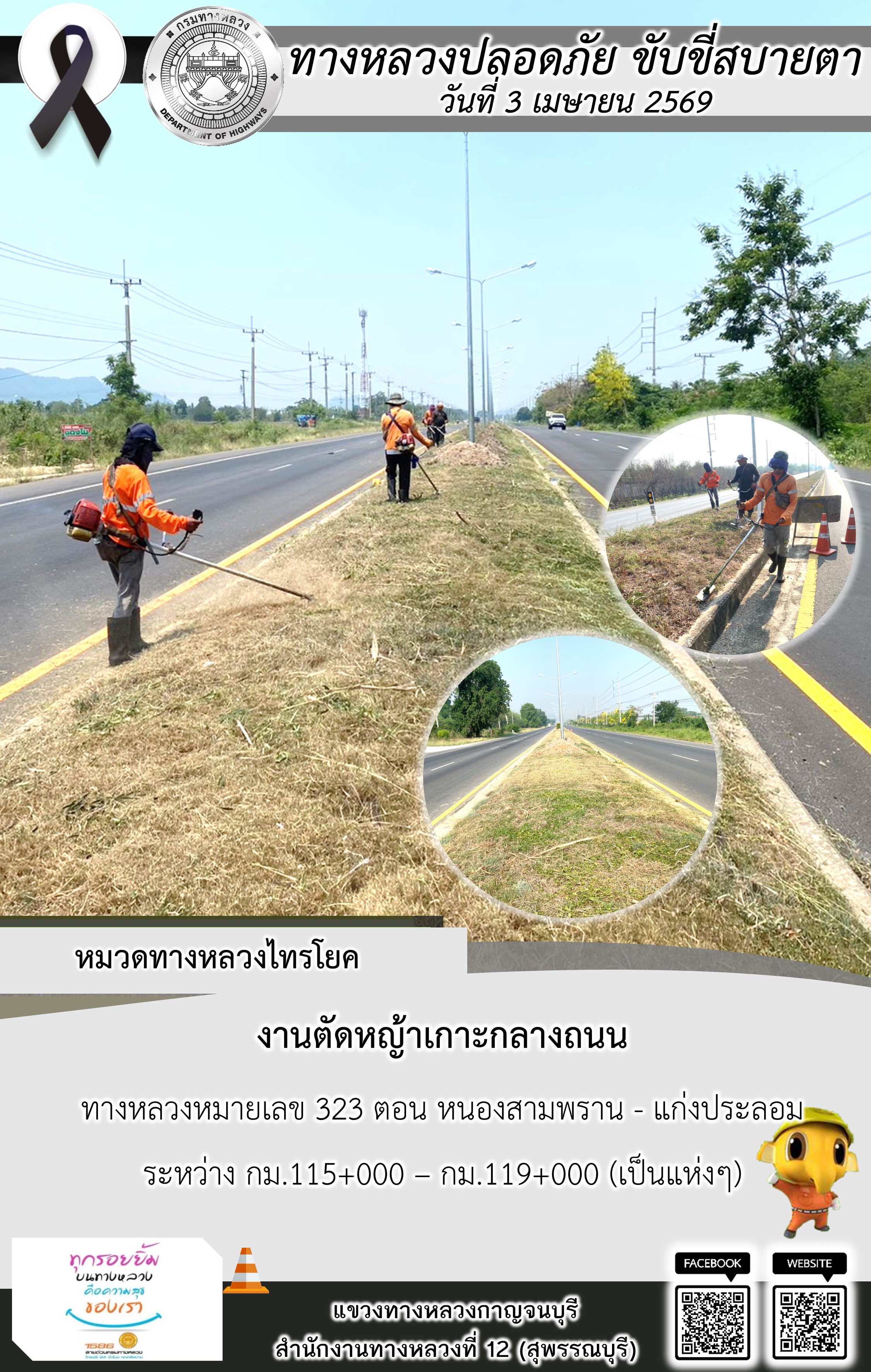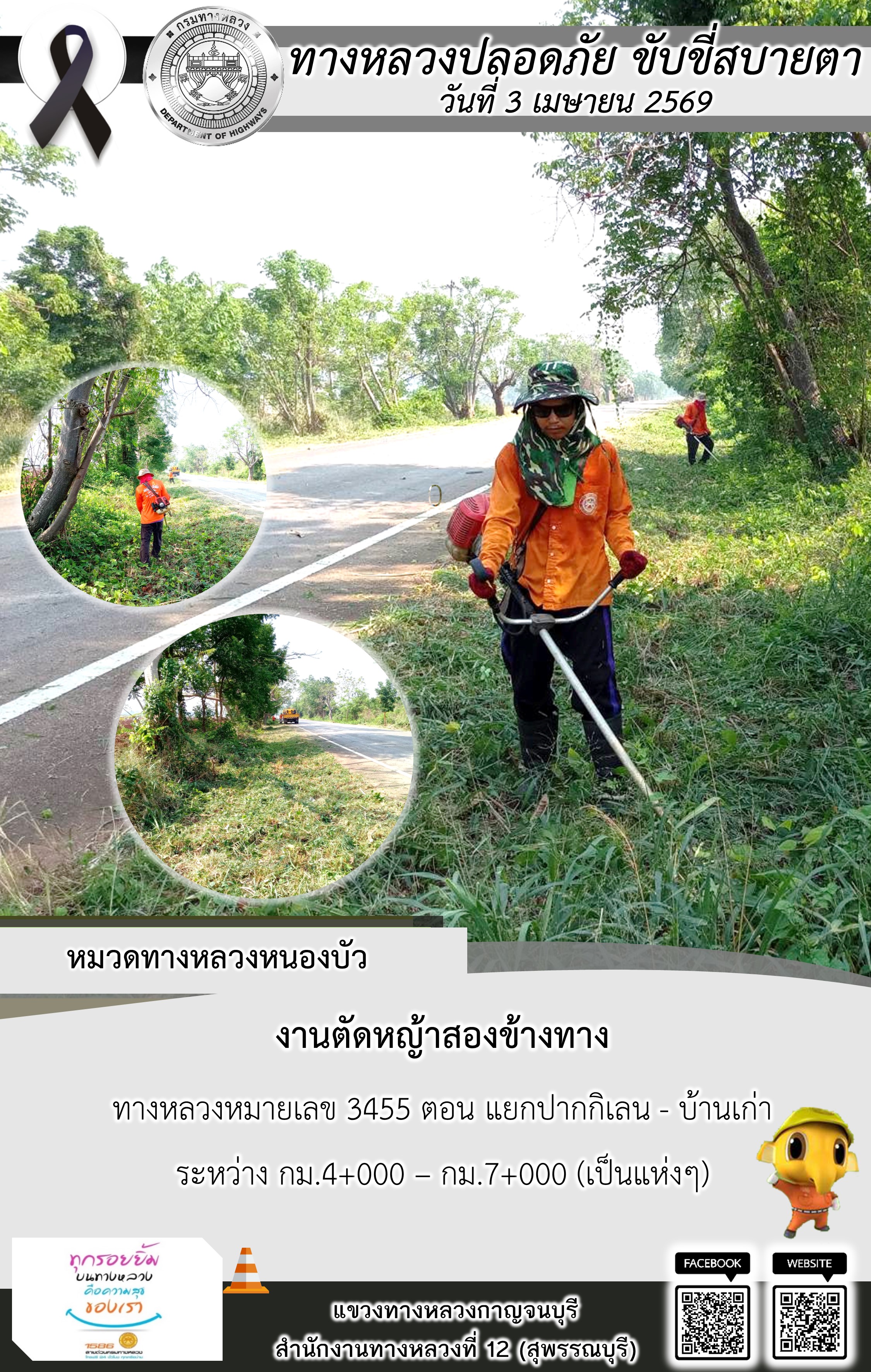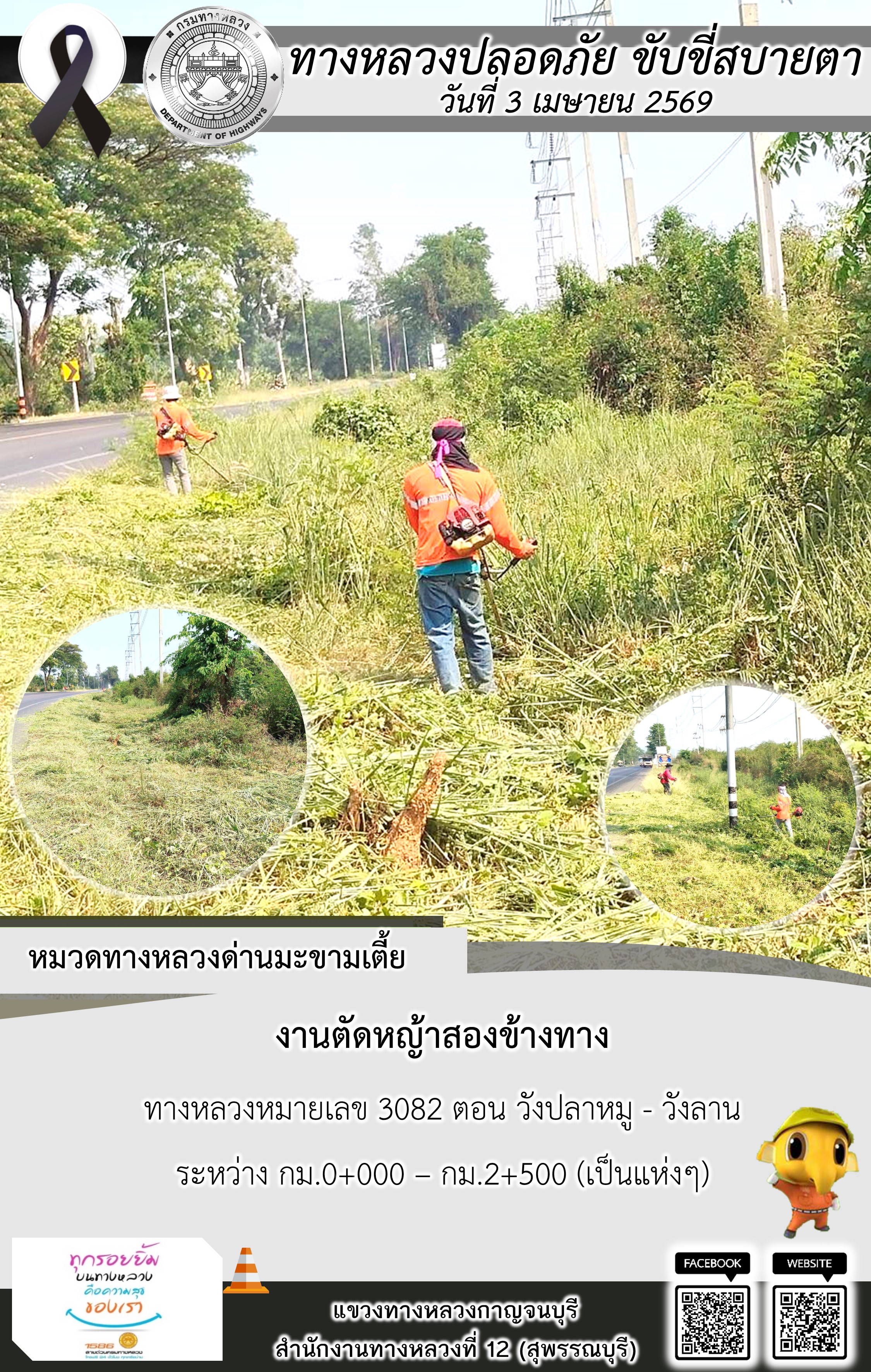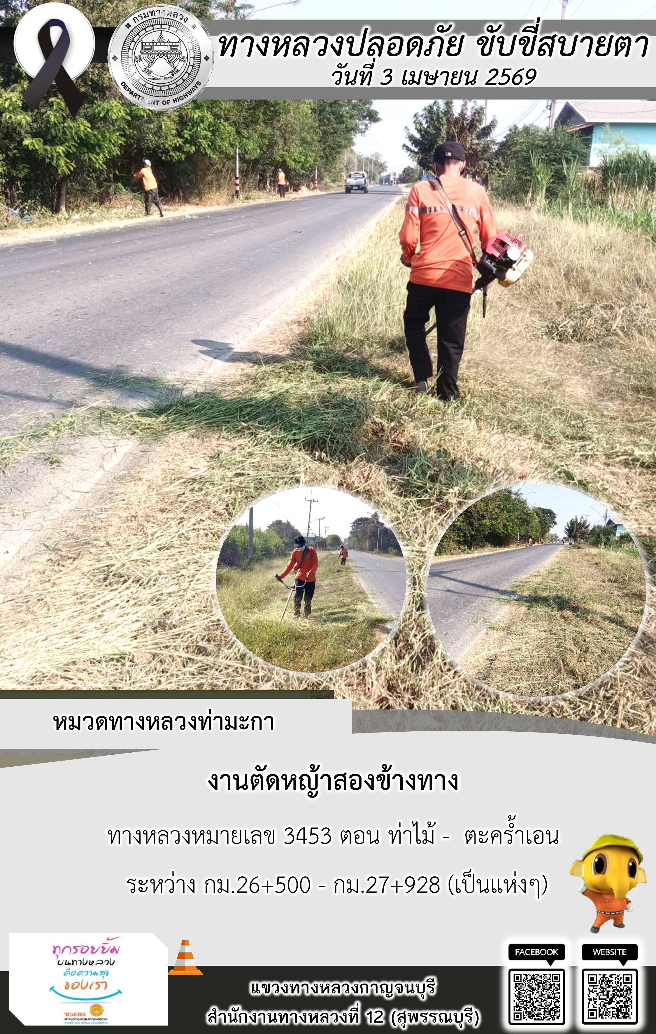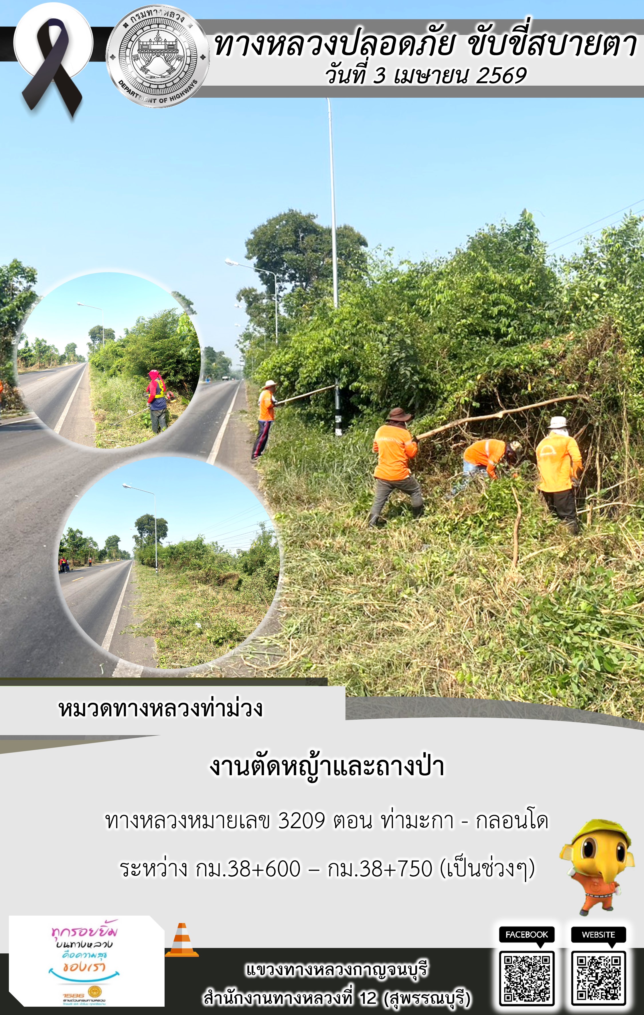 ข้อมูลภาพกิจกรรม : แขวงทางหลวงกาญจนบุรี โดยหมวดทางหลวงในสังกัด และงานอำนวยความปลอดภัยปฏิบัติงาน ประจำวันที่ 3 เม.ย. 69