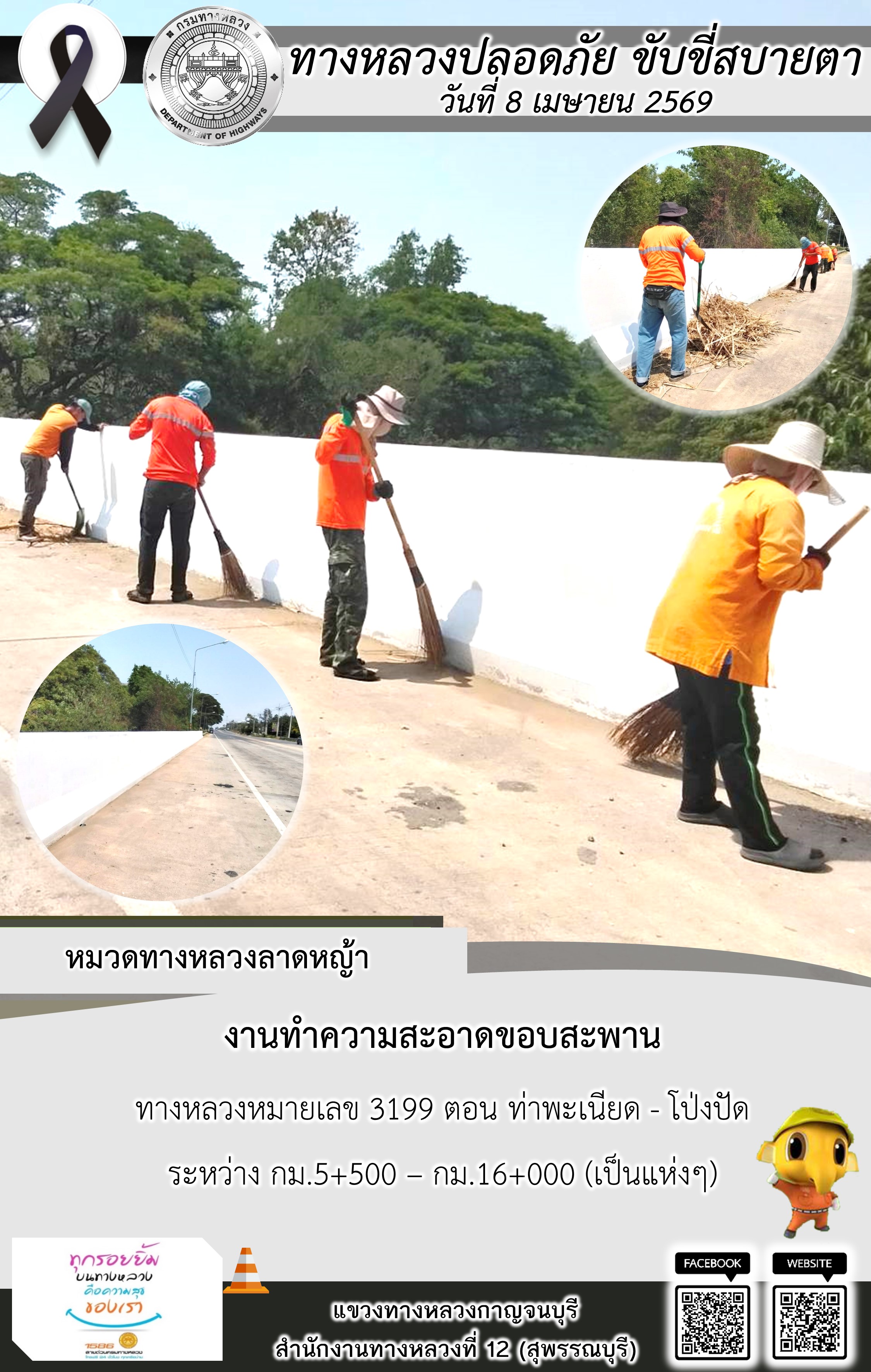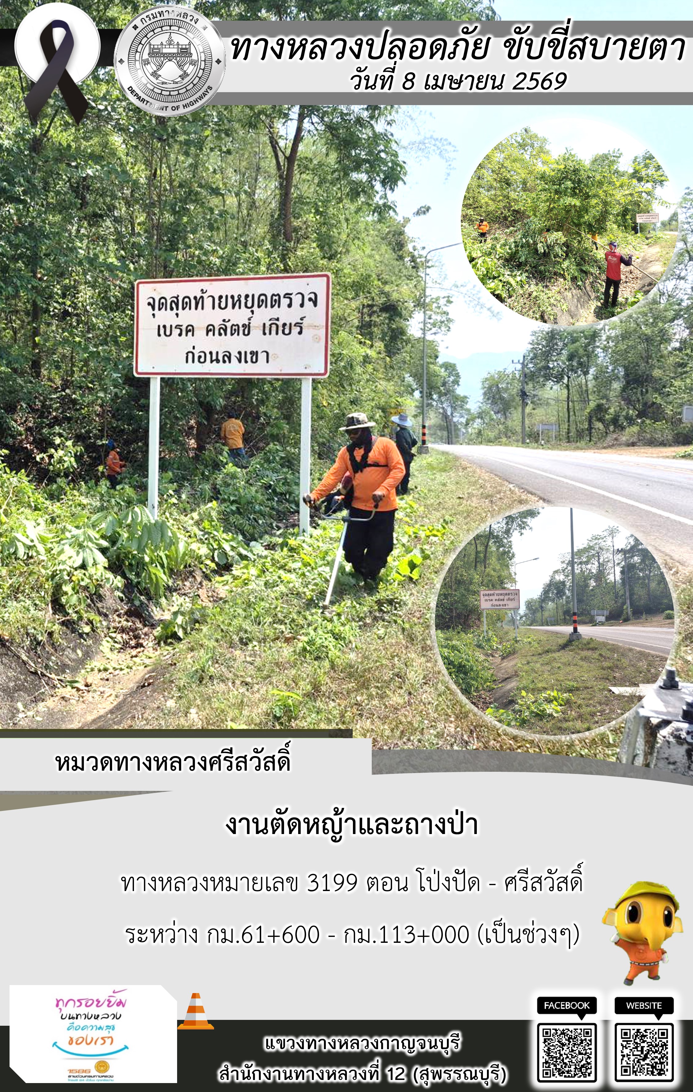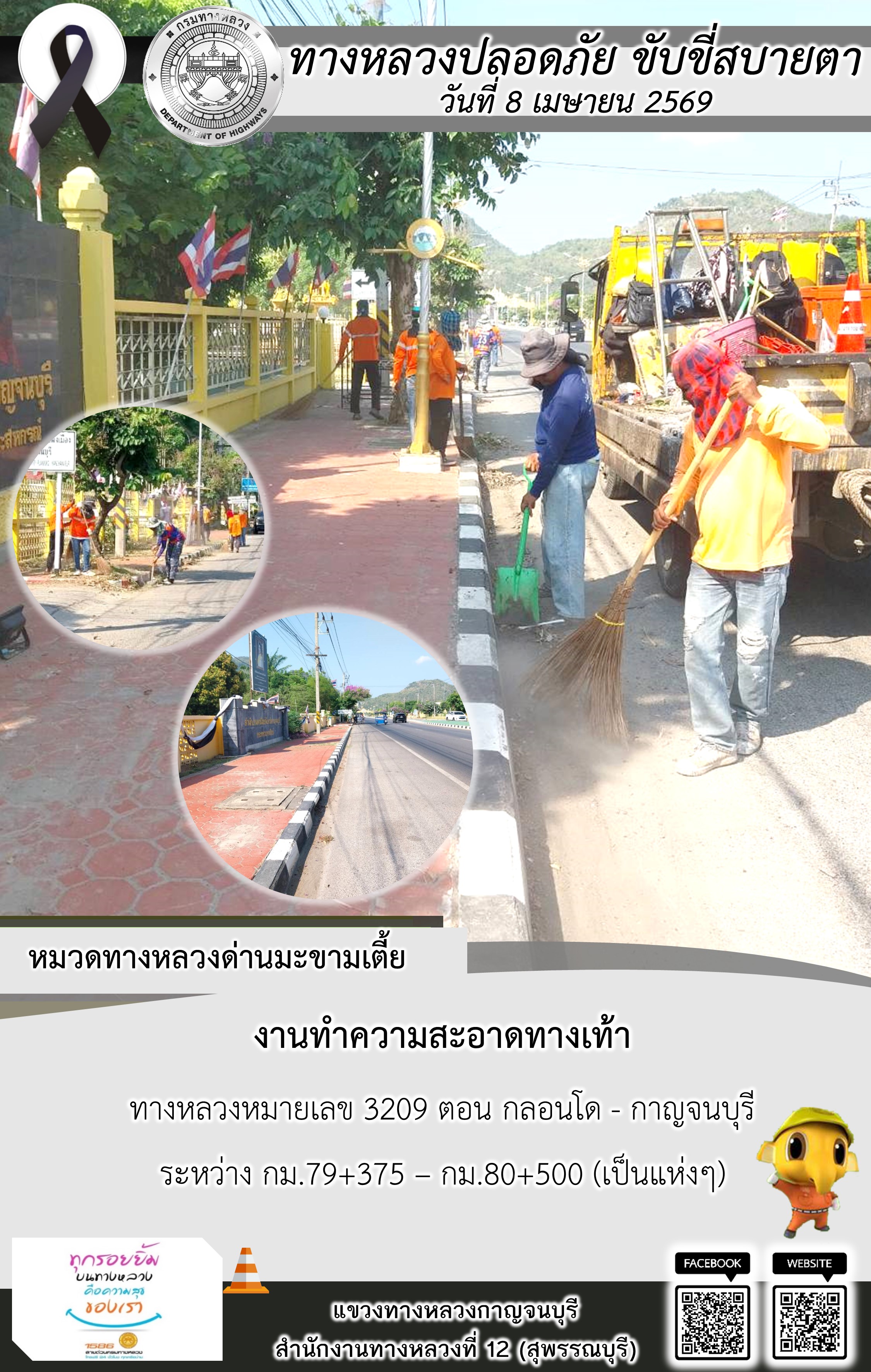 แขวงทางหลวงกาญจนบุรี โดยหมวดทางหลวงในสังกัด และงานอำนวยความปลอดภัยปฏิบัติงาน ประจำวันที่ 8 เม.ย. 69