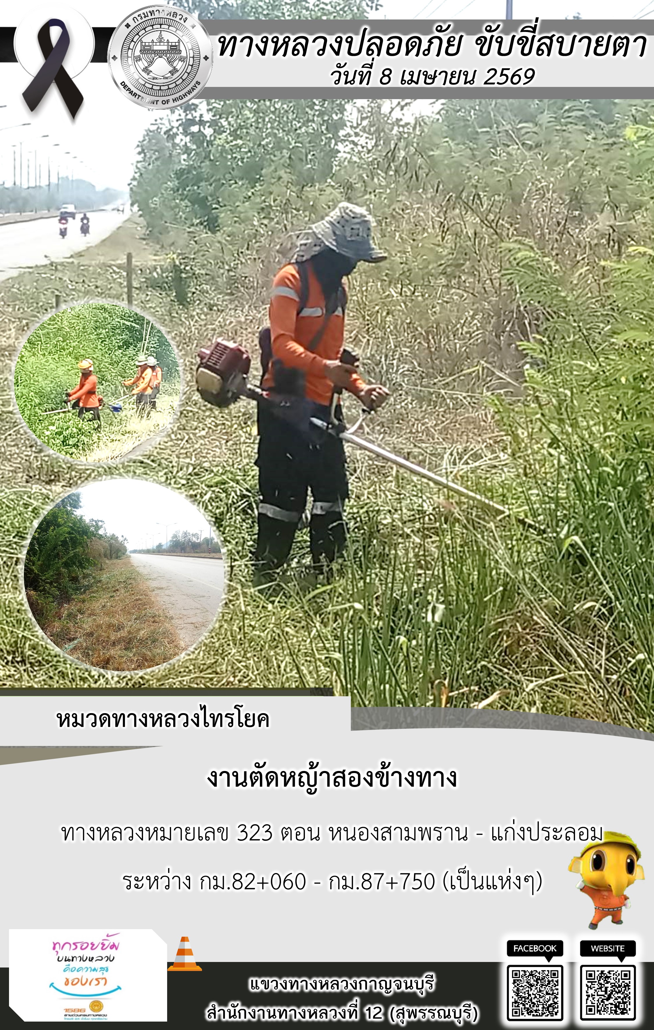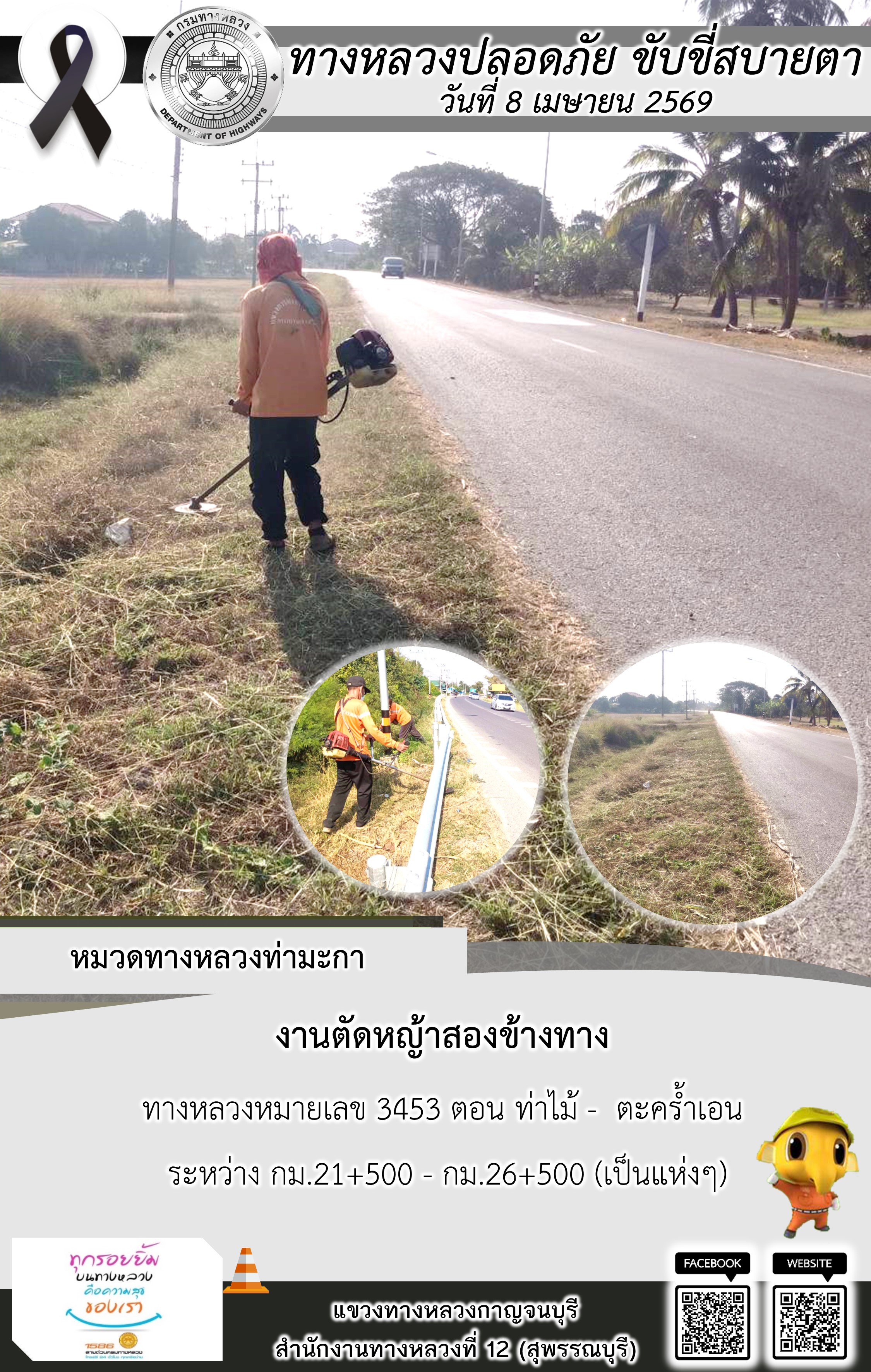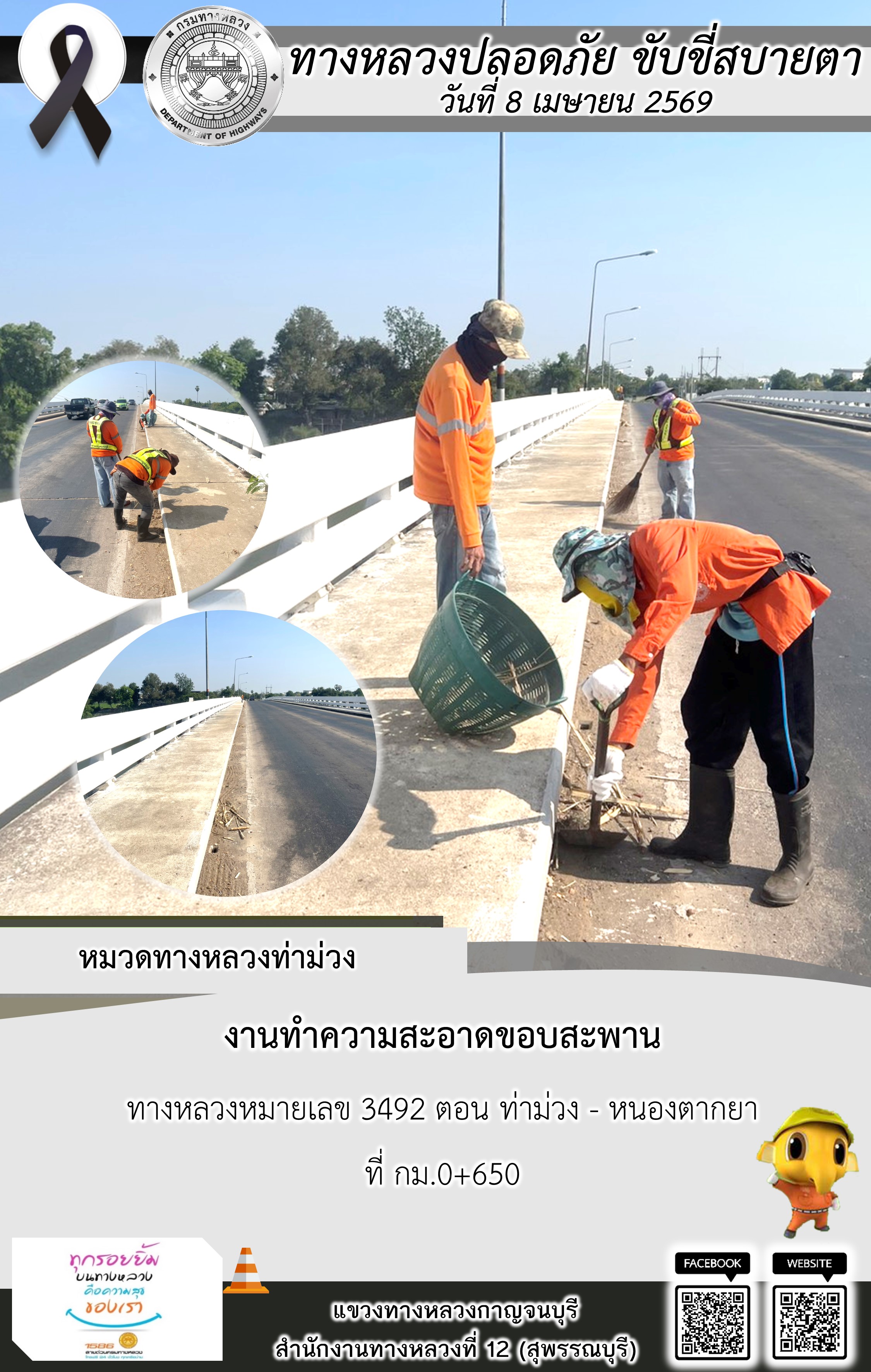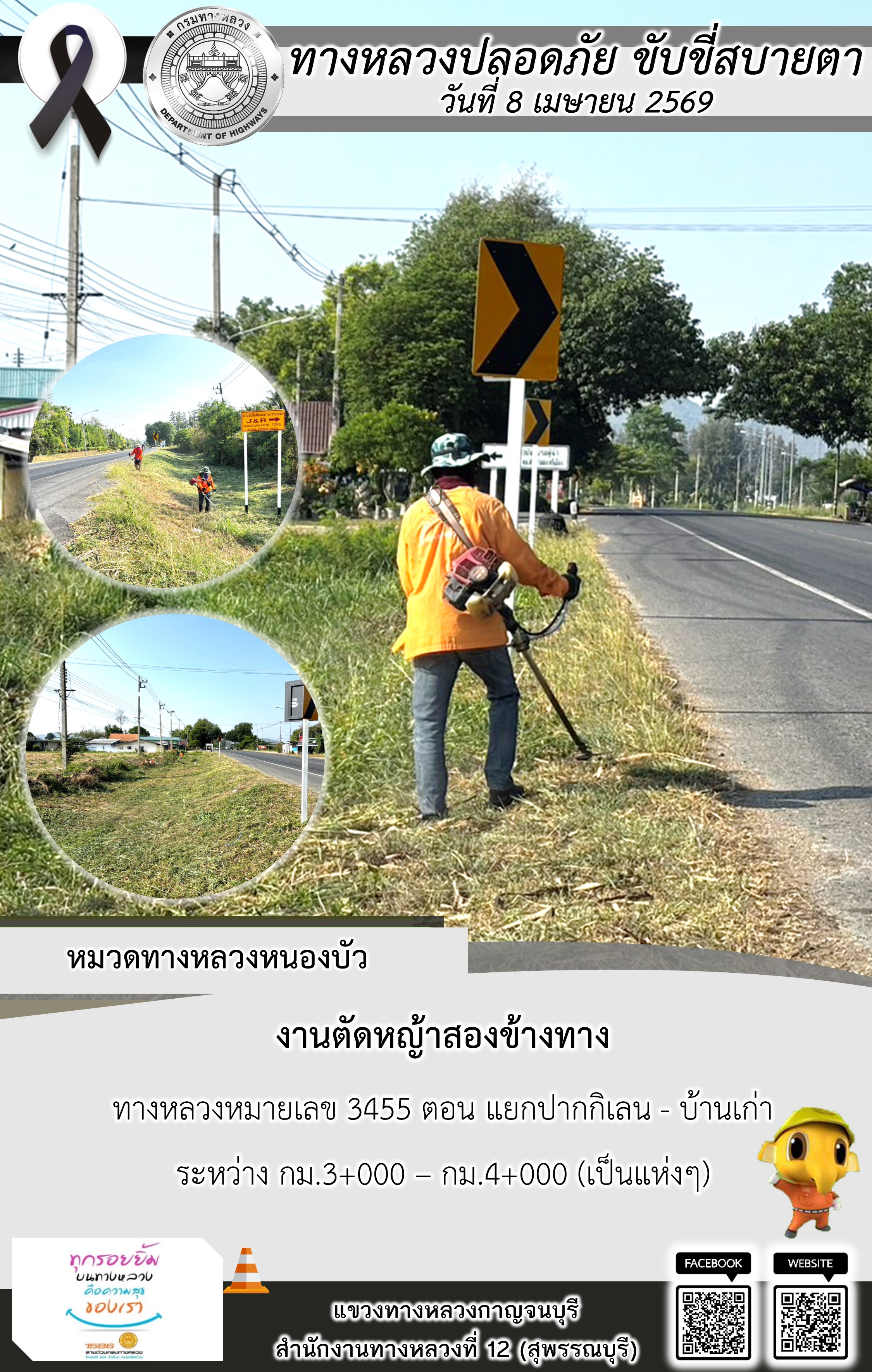 ข้อมูลภาพกิจกรรม : แขวงทางหลวงกาญจนบุรี โดยหมวดทางหลวงในสังกัด และงานอำนวยความปลอดภัยปฏิบัติงาน ประจำวันที่ 8 เม.ย. 69