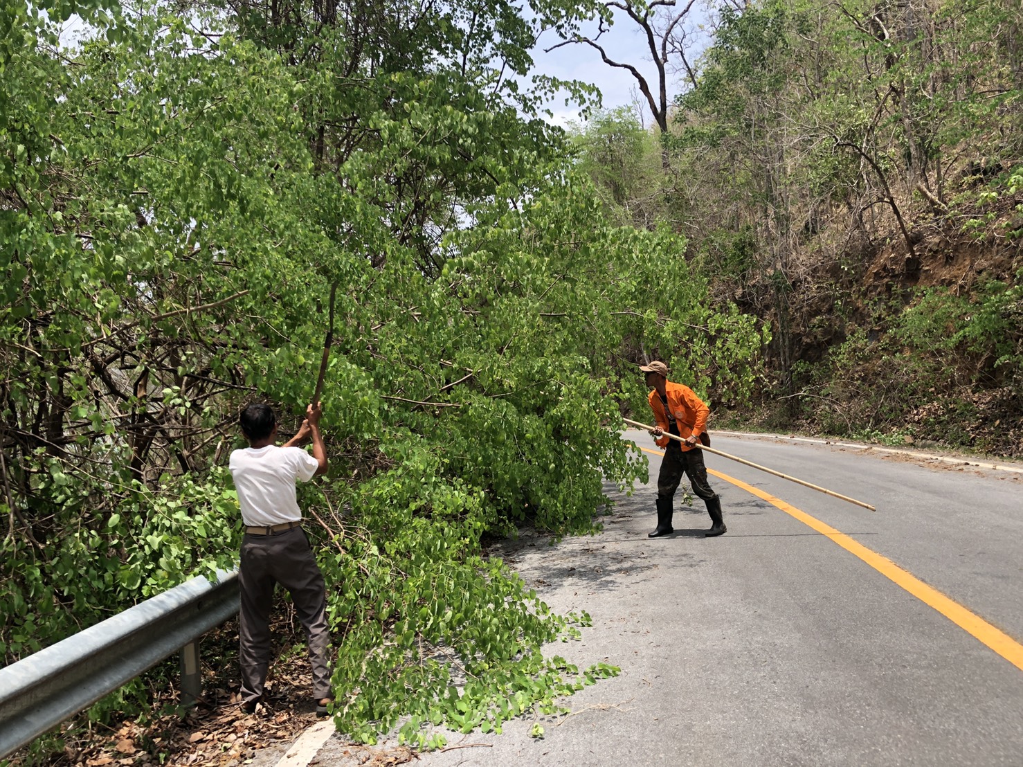 3.ดำเนินการตัดแต่งกิ่งไม้ที่ยื่นล้ำผิวจราจรใน ทล.31990103 ตอน ช่องสะเดา - ศรีสวัสดิ์ เป็นจุดๆ